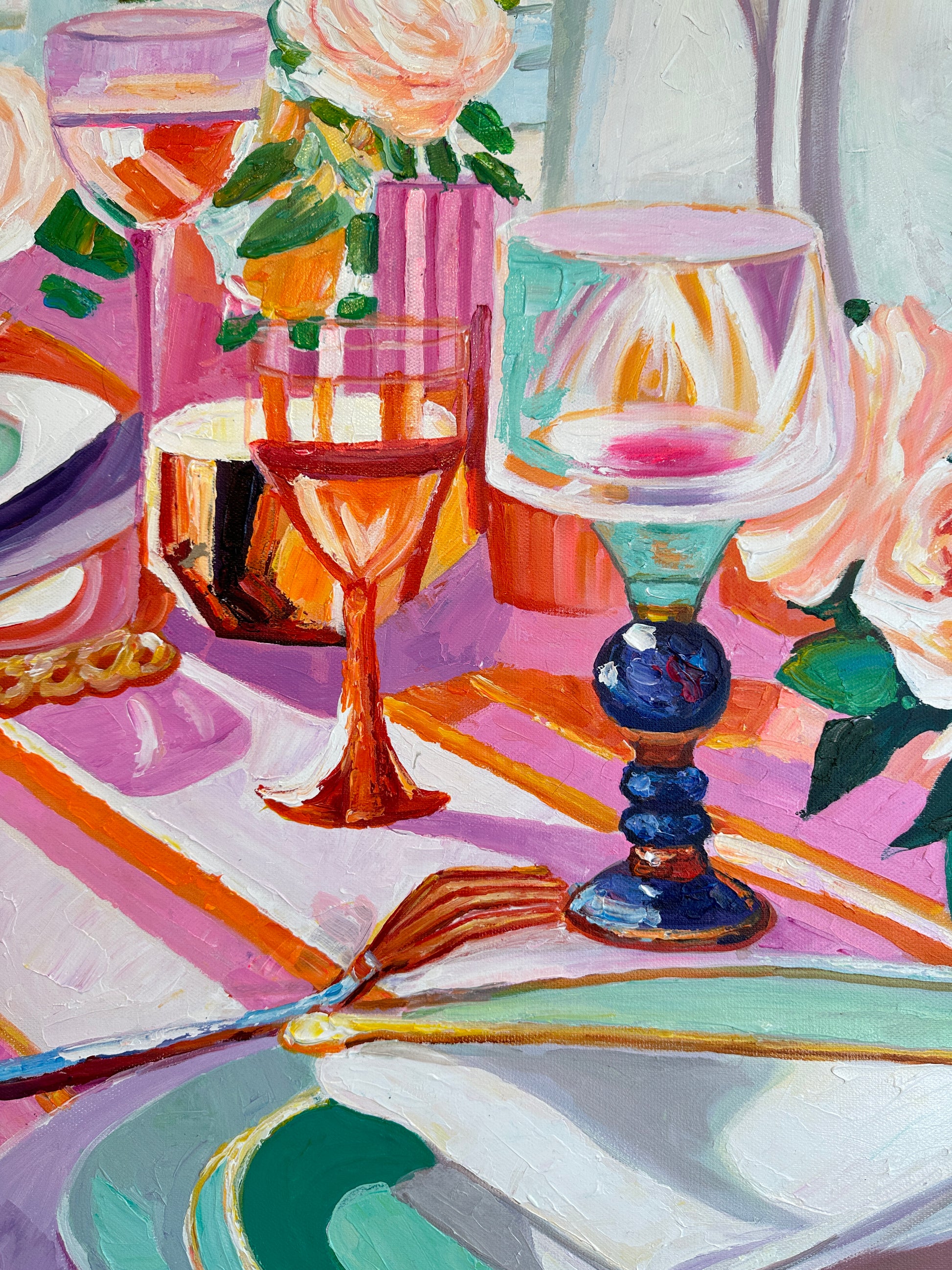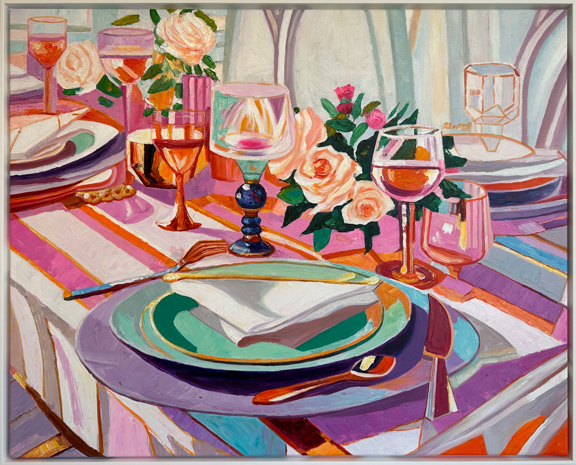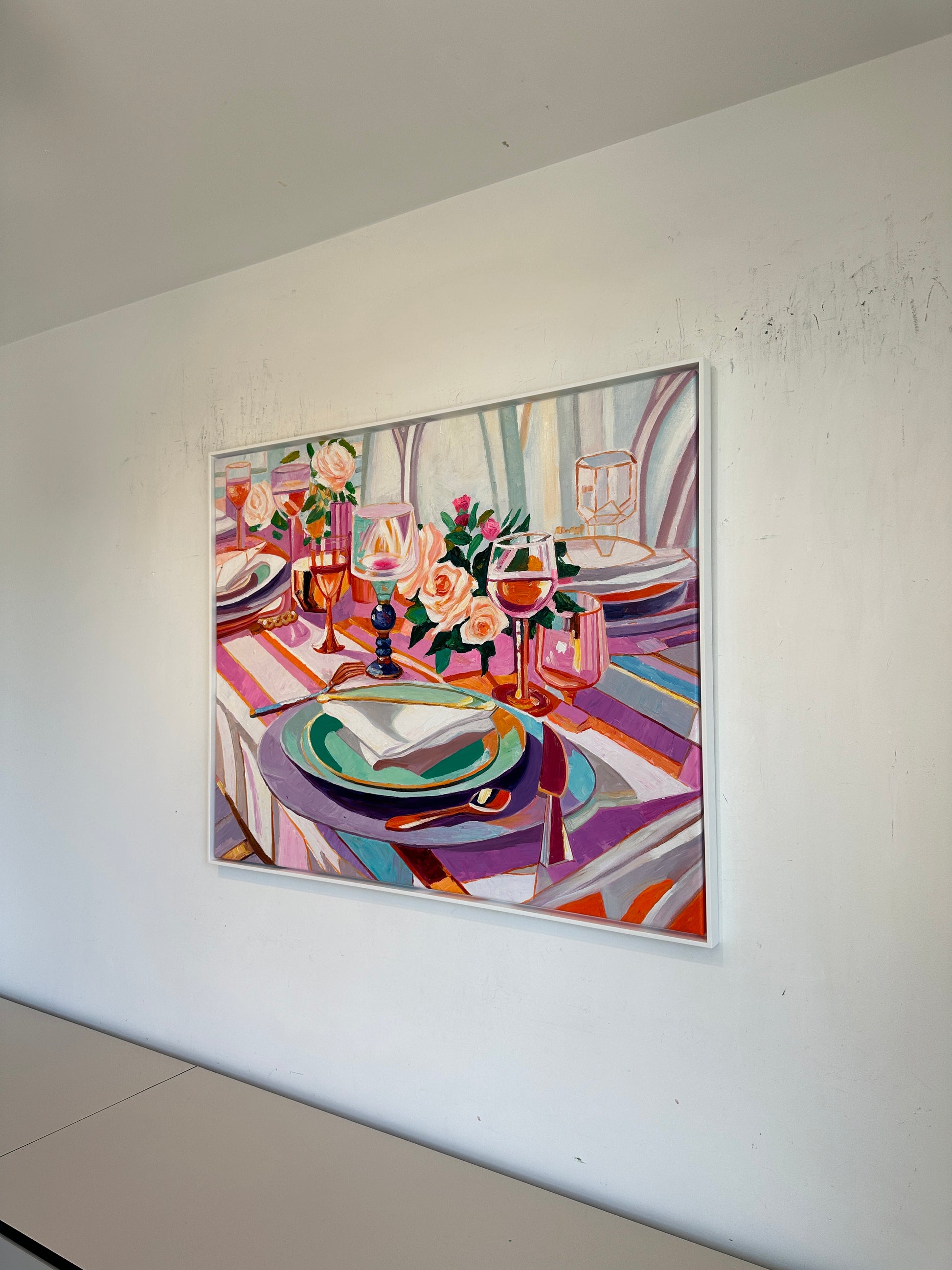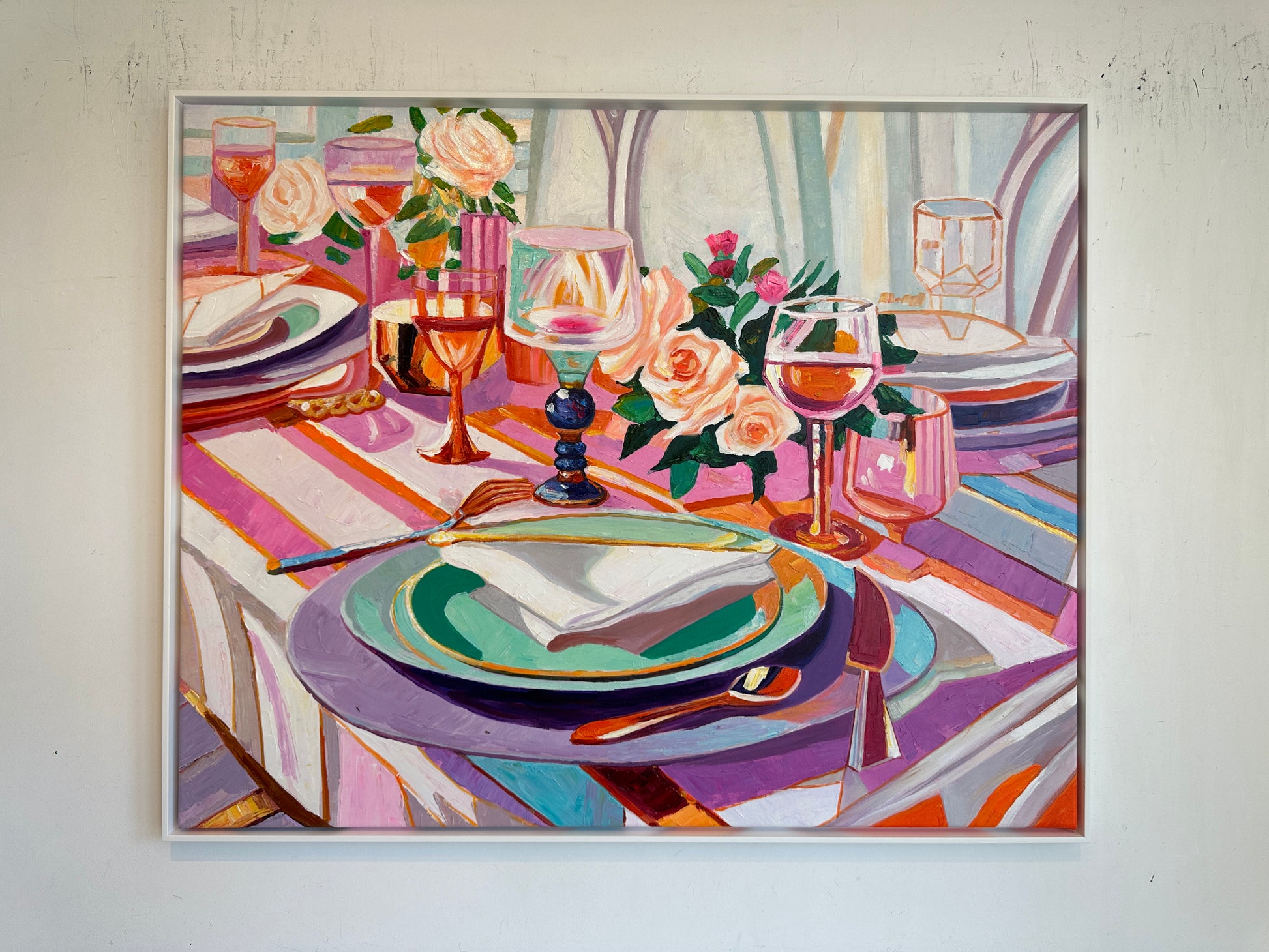 This series marks a departure from her more controlled floral still lifes, embracing a freer, more spontaneous energy inspired by real-life table settings and the emotional resonance of communal experiences.