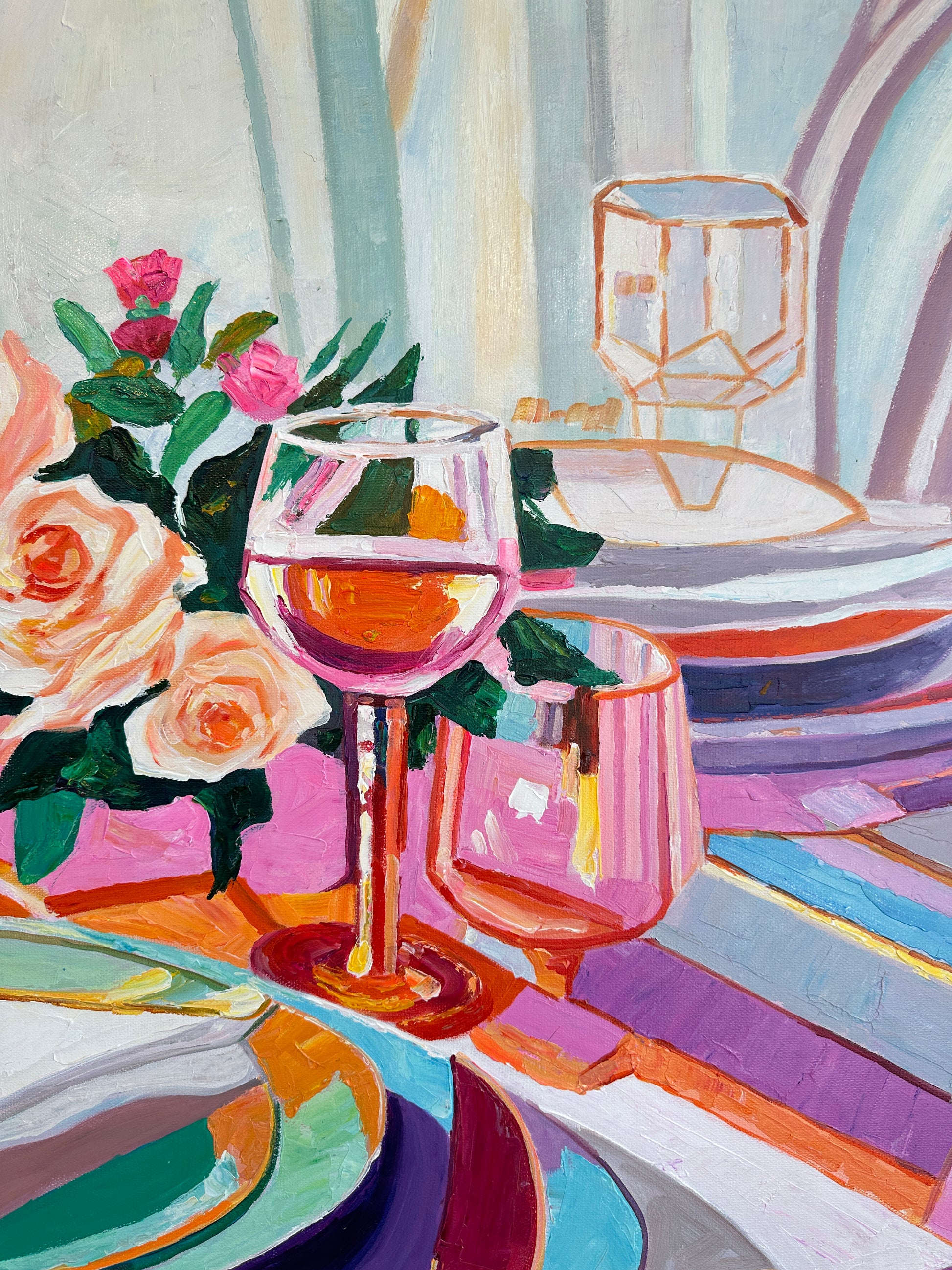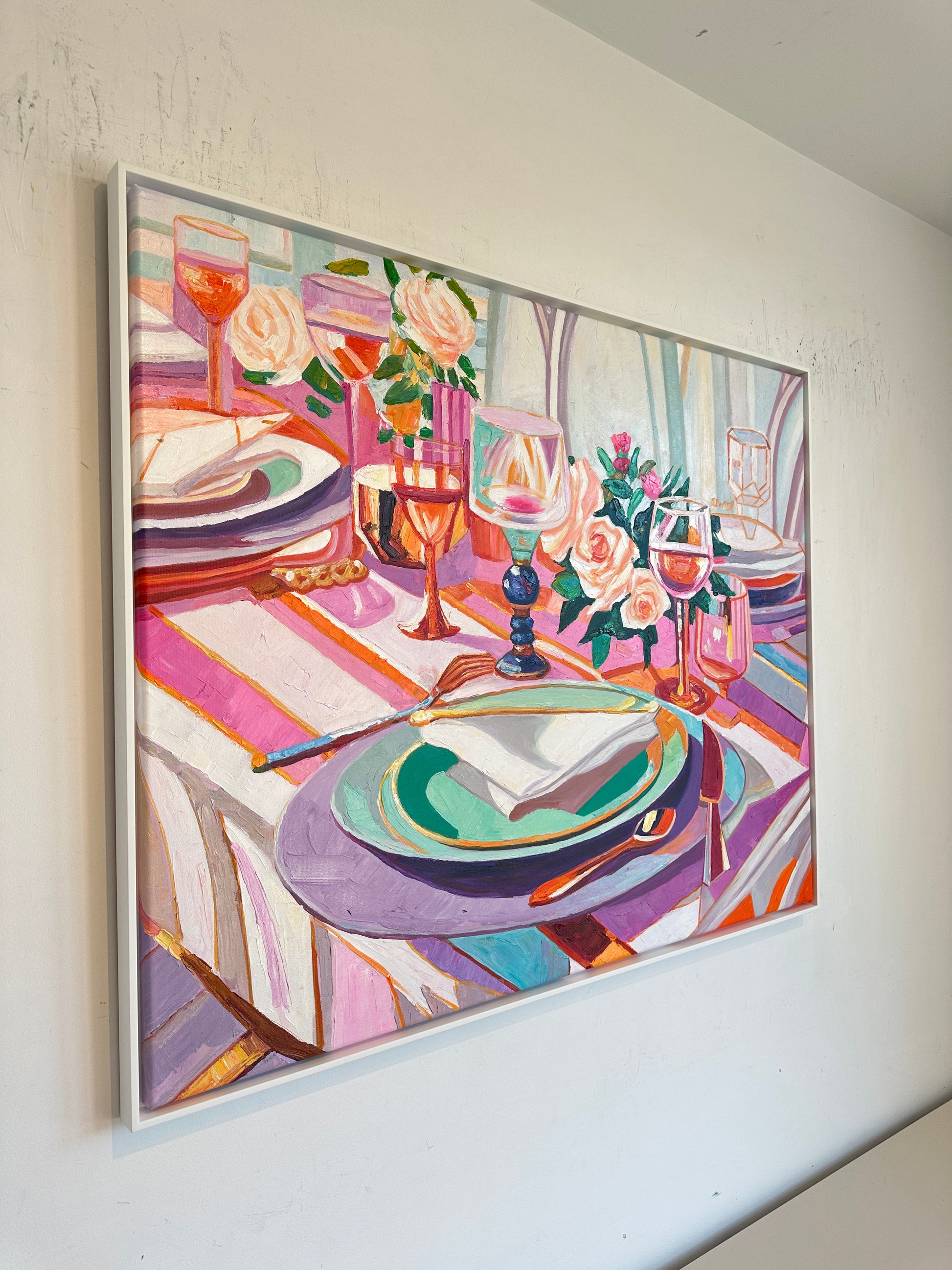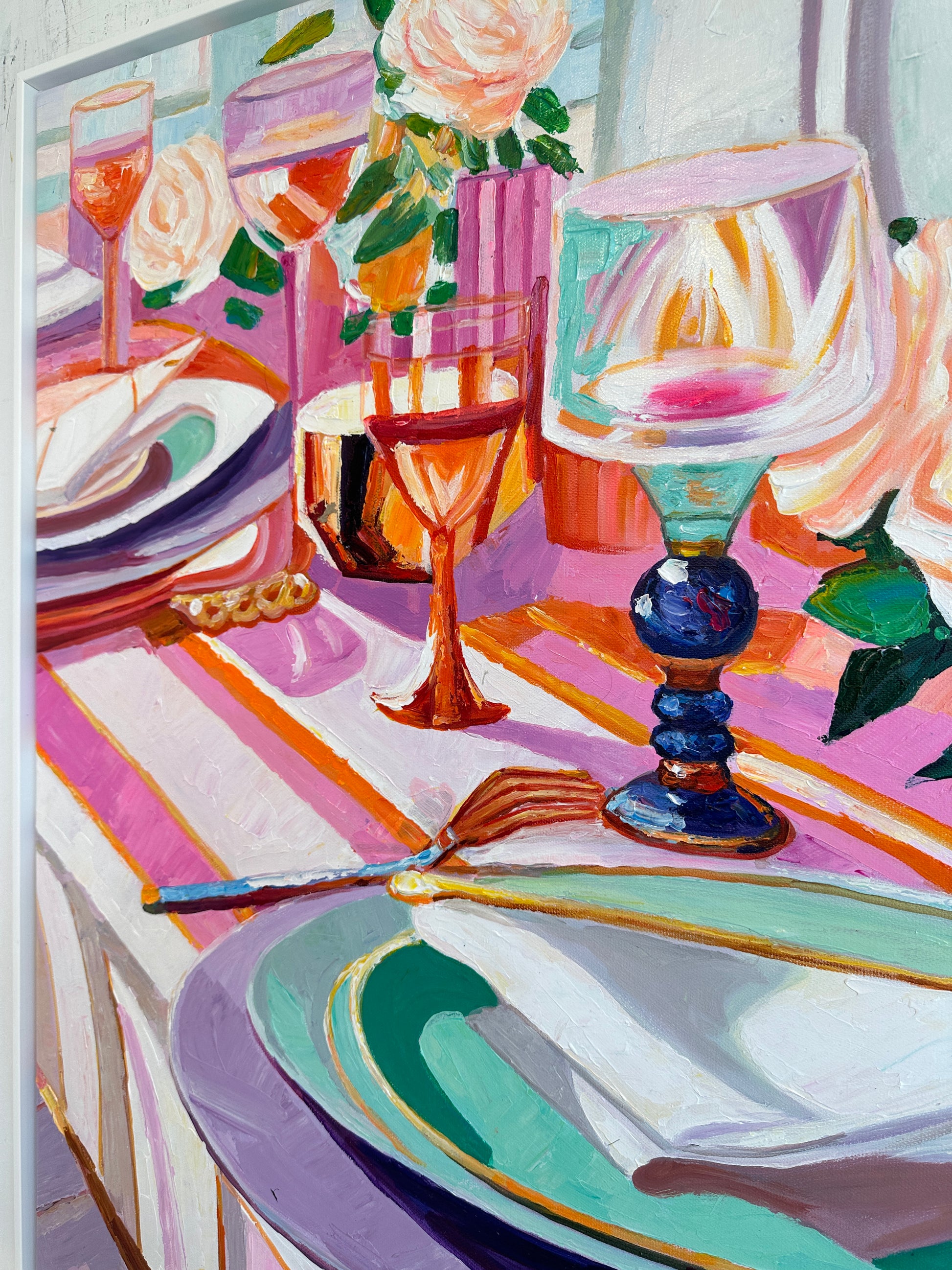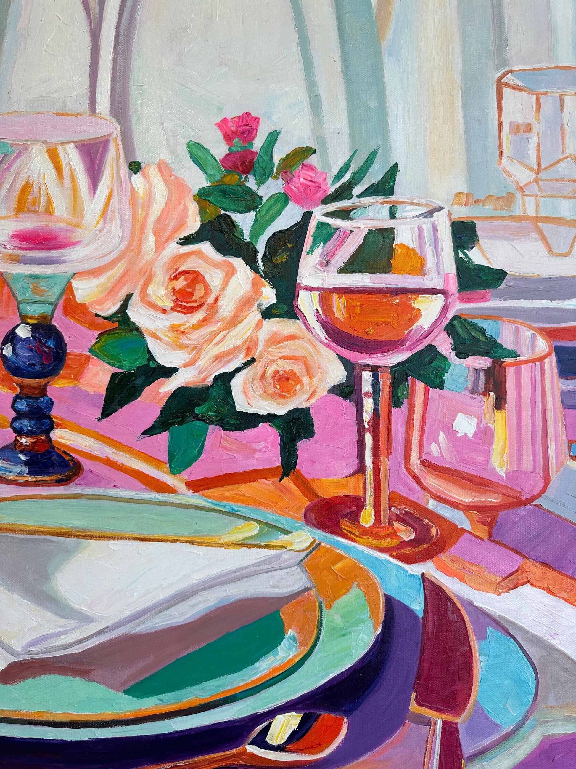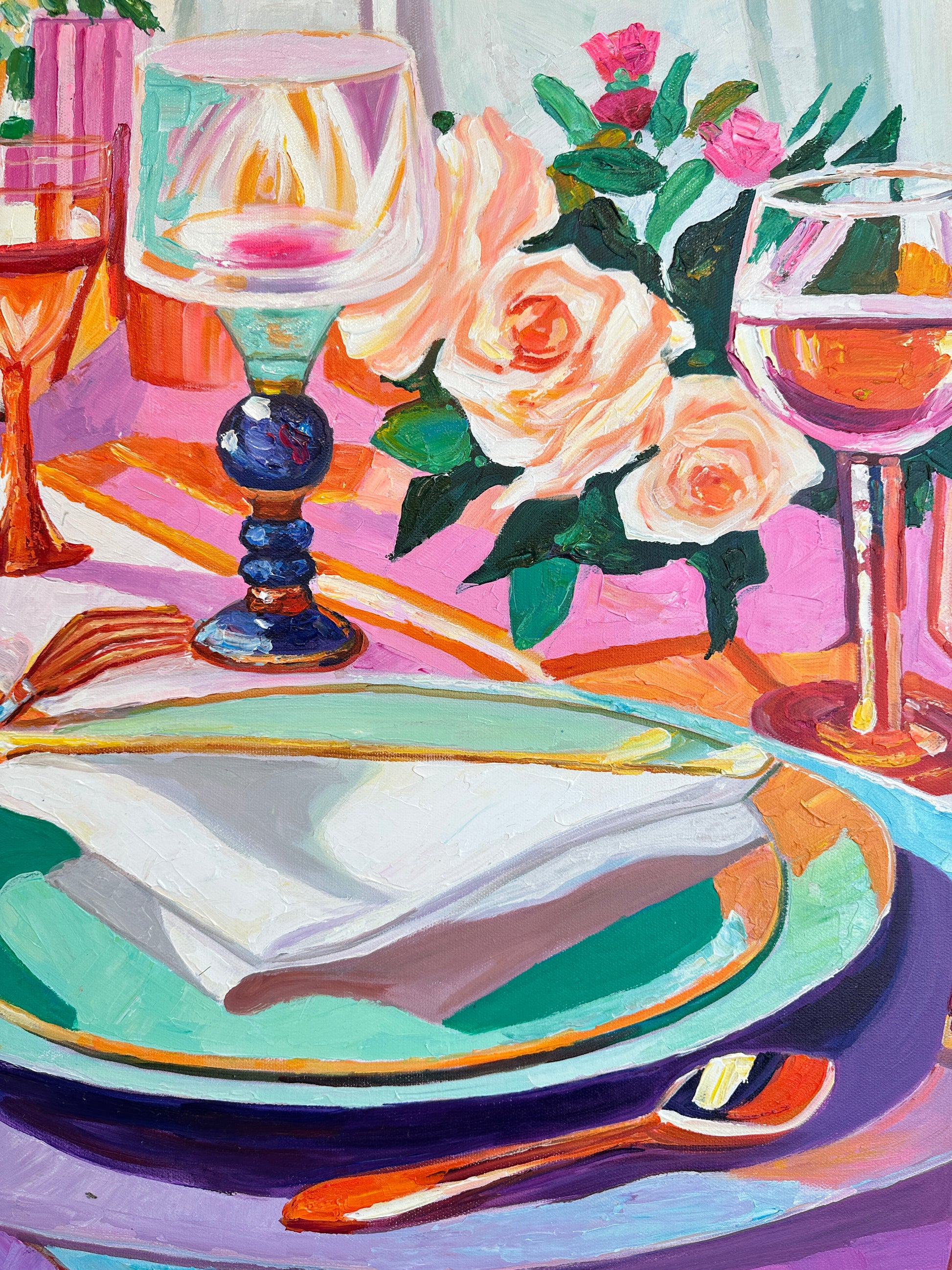 This series marks a departure from her more controlled floral still lifes, embracing a freer, more spontaneous energy inspired by real-life table settings and the emotional resonance of communal experiences.