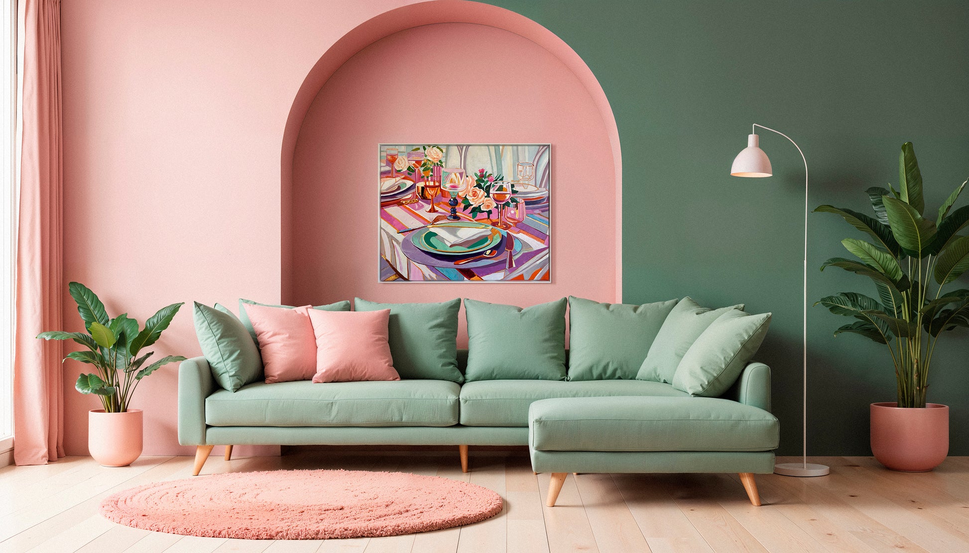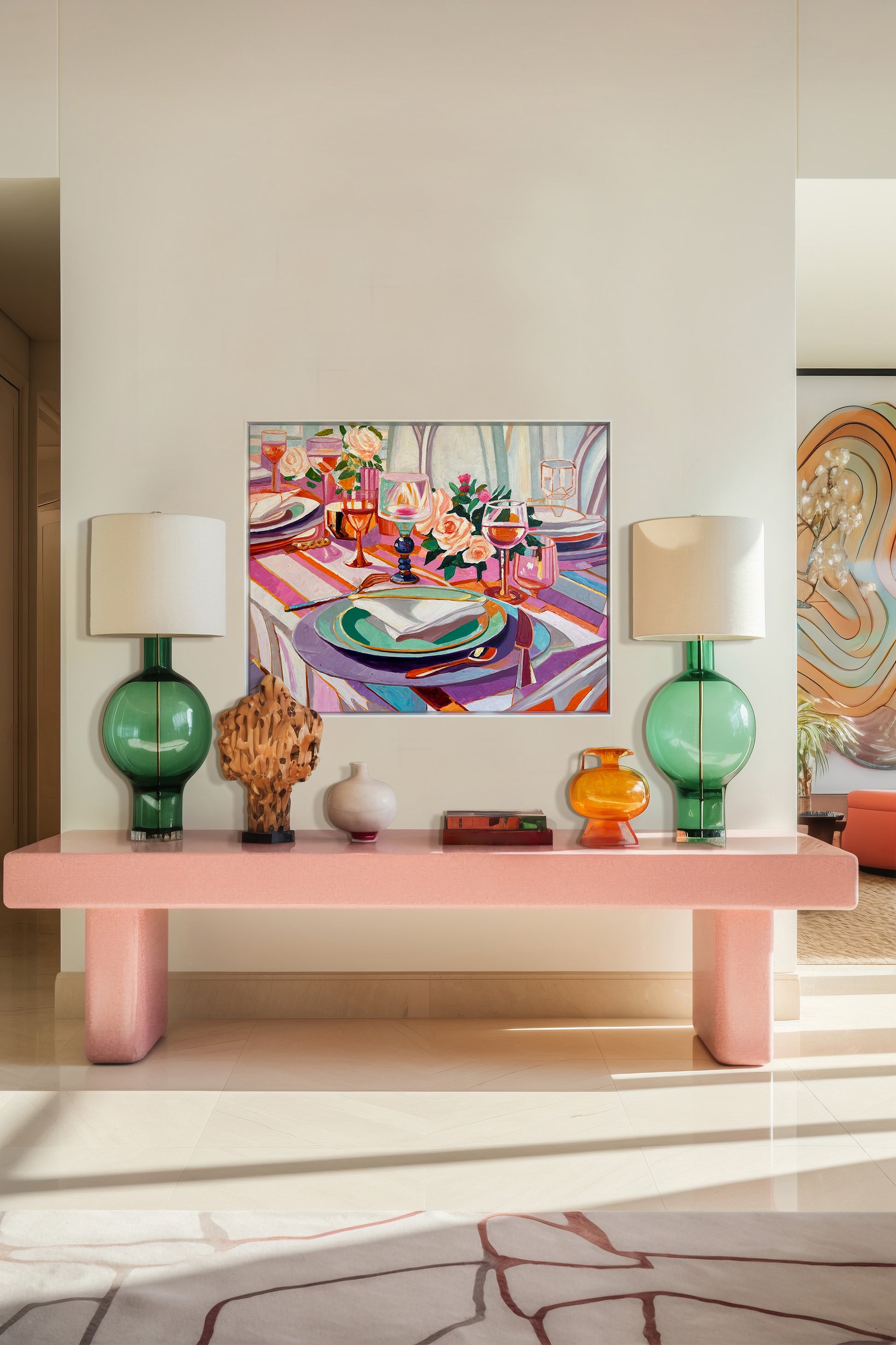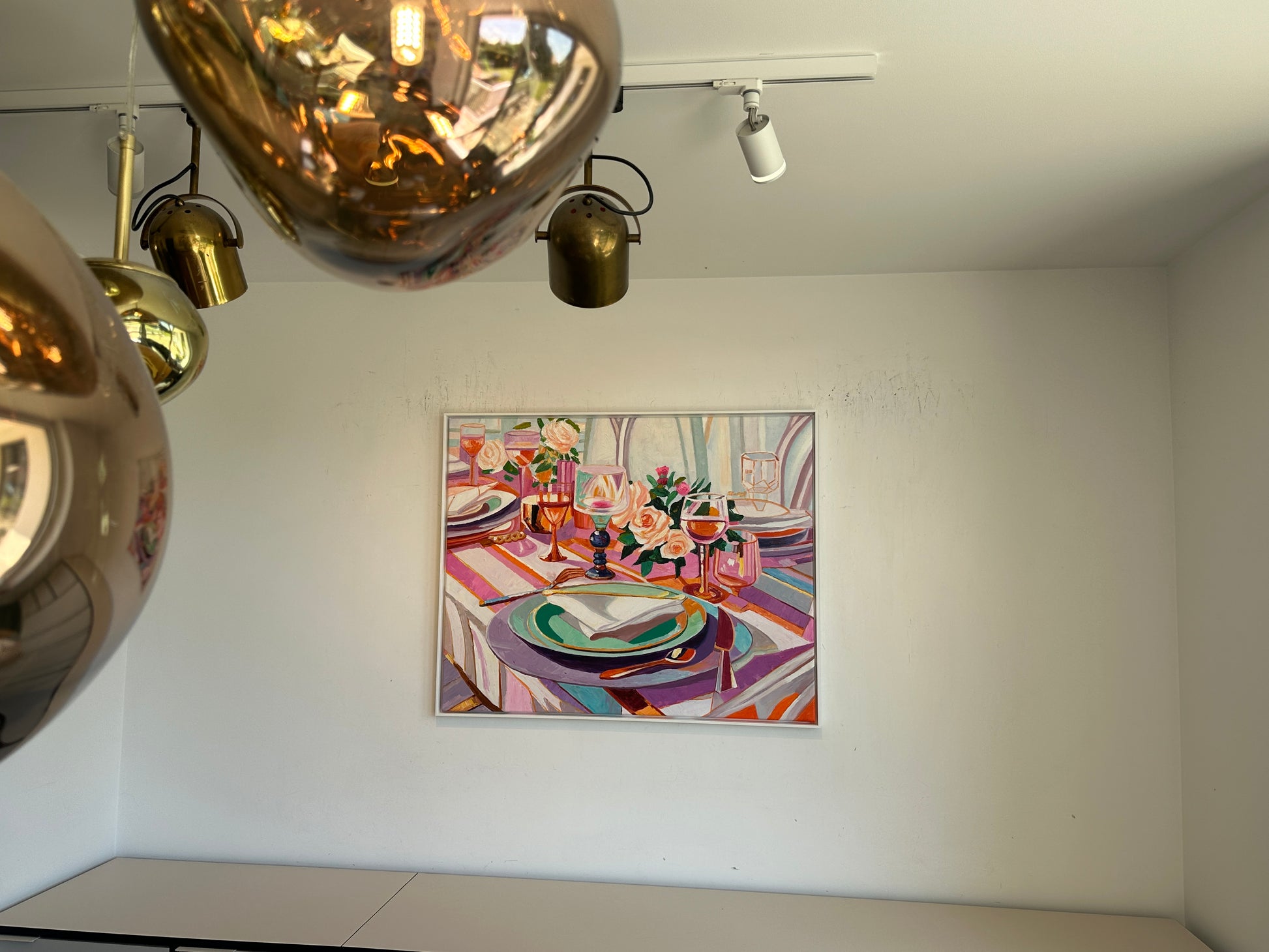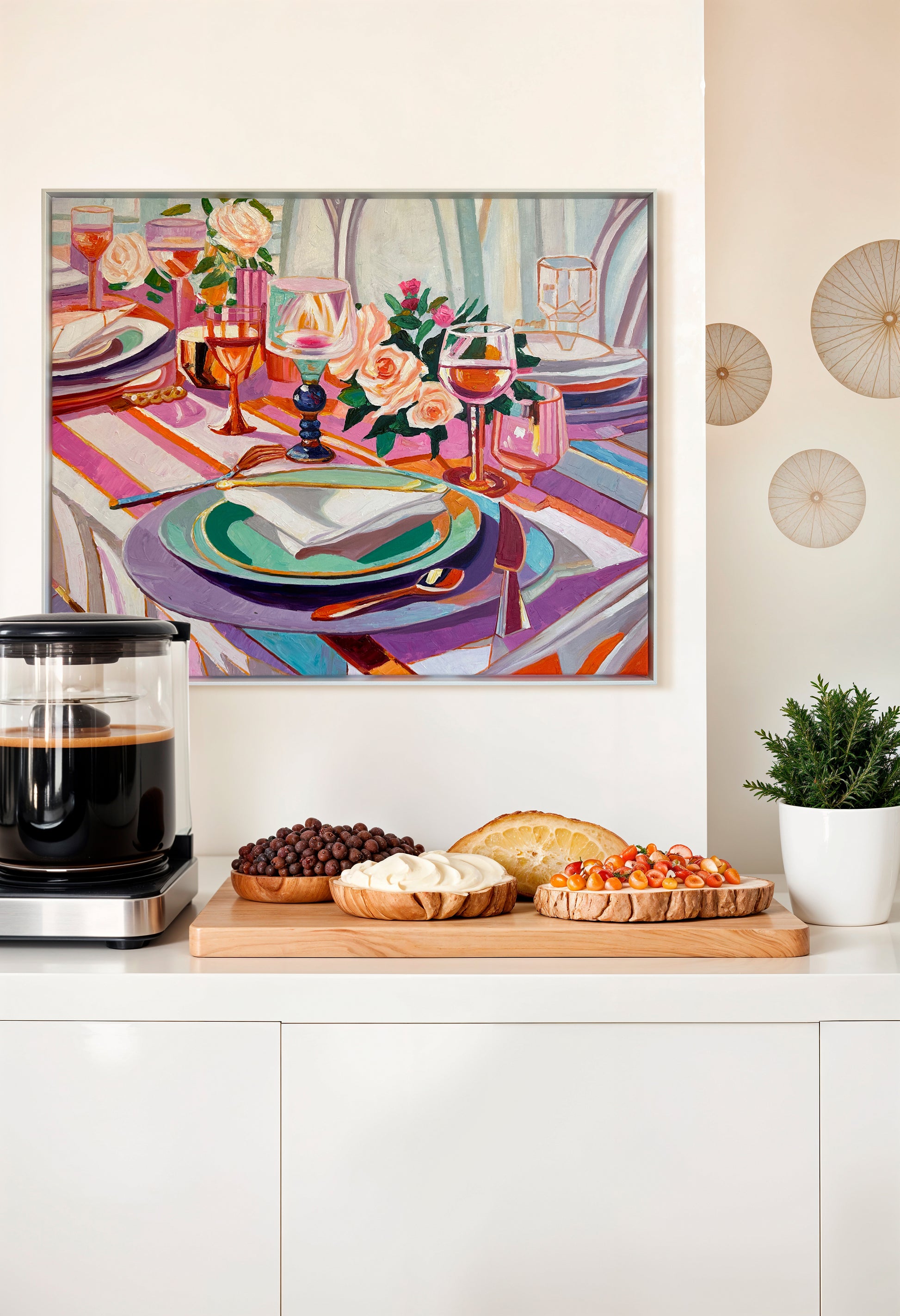 This series marks a departure from her more controlled floral still lifes, embracing a freer, more spontaneous energy inspired by real-life table settings and the emotional resonance of communal experiences.