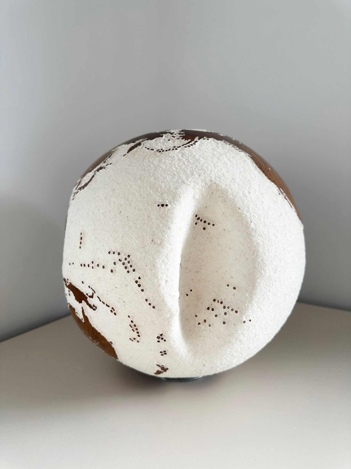 His work is favored by private collectors and commercial organizations, such as Louis Vuitton, around the world. Bruno Helgen’s design uses local wood from Bali like teak or walnut and the final shape of the globe is adjusted to the beauty and the imperfections of the piece of wood. These sculptures come to life with a variety of materials such as volcanic sand, lacquer and metals.