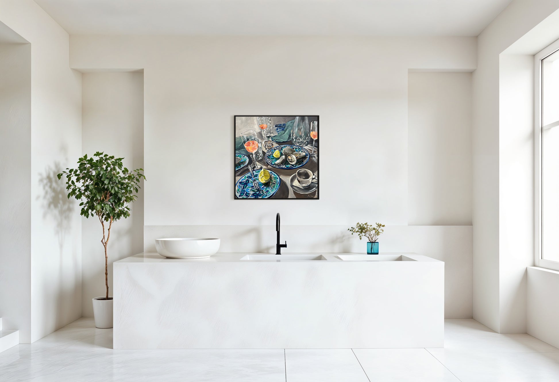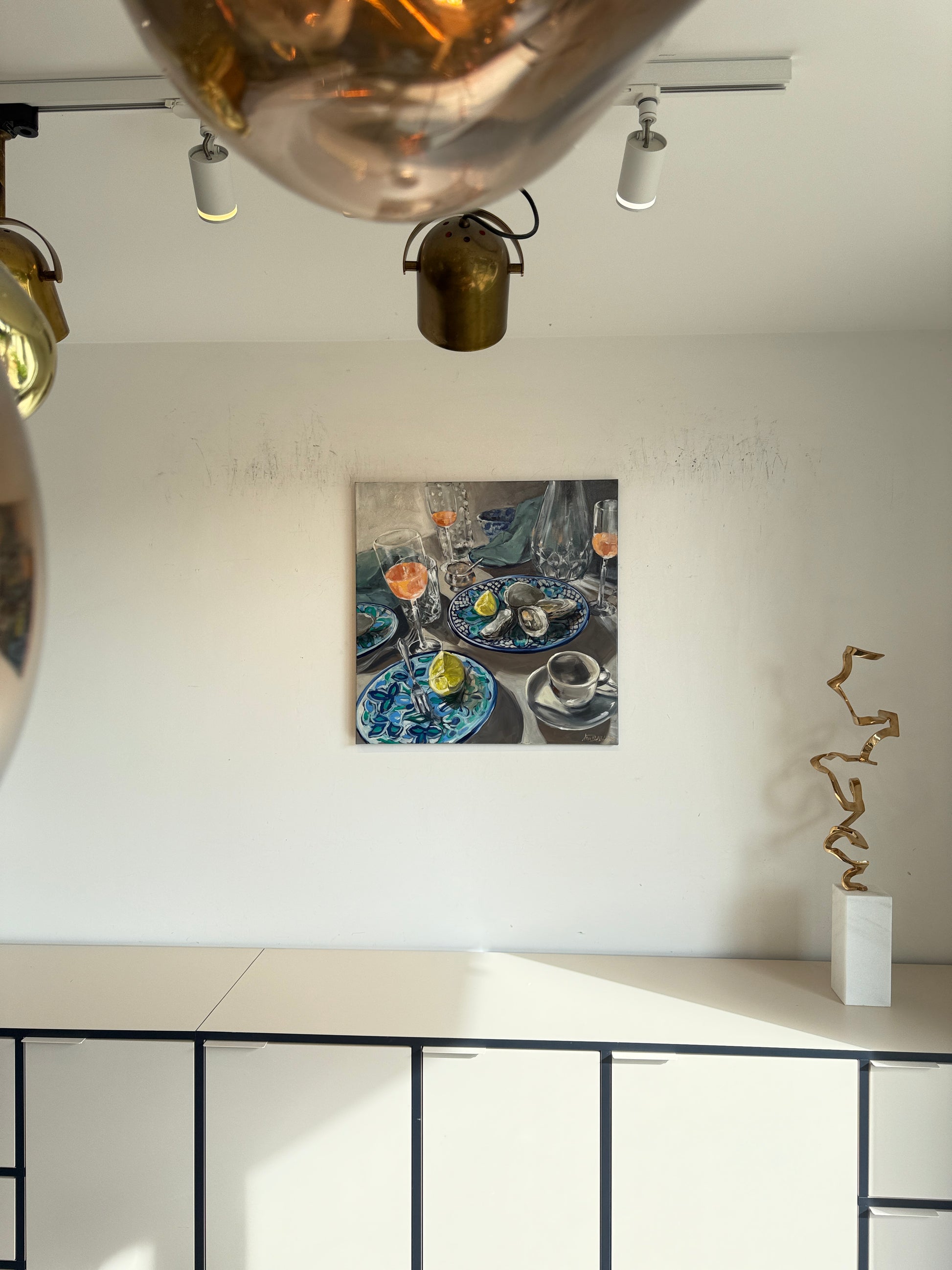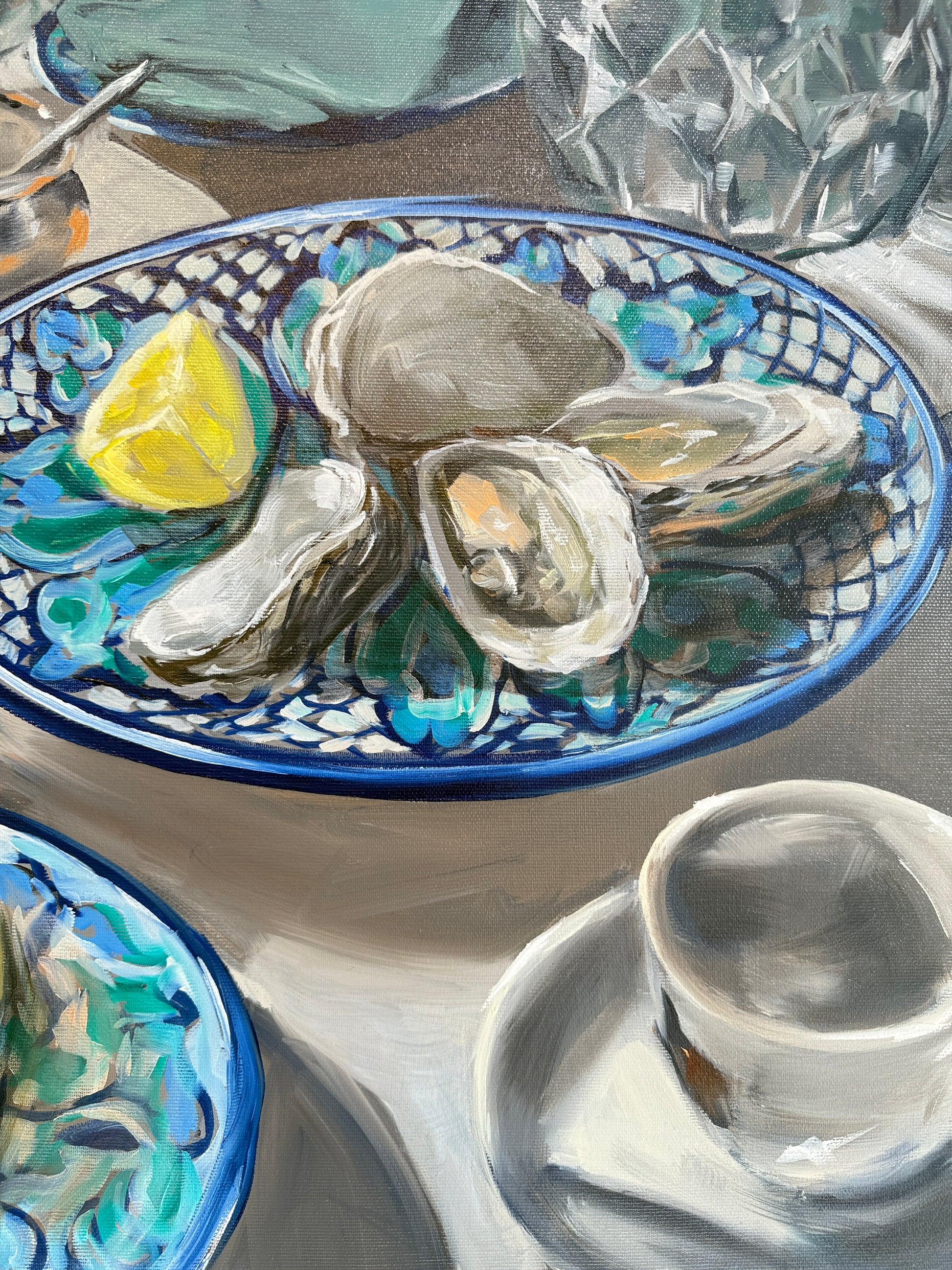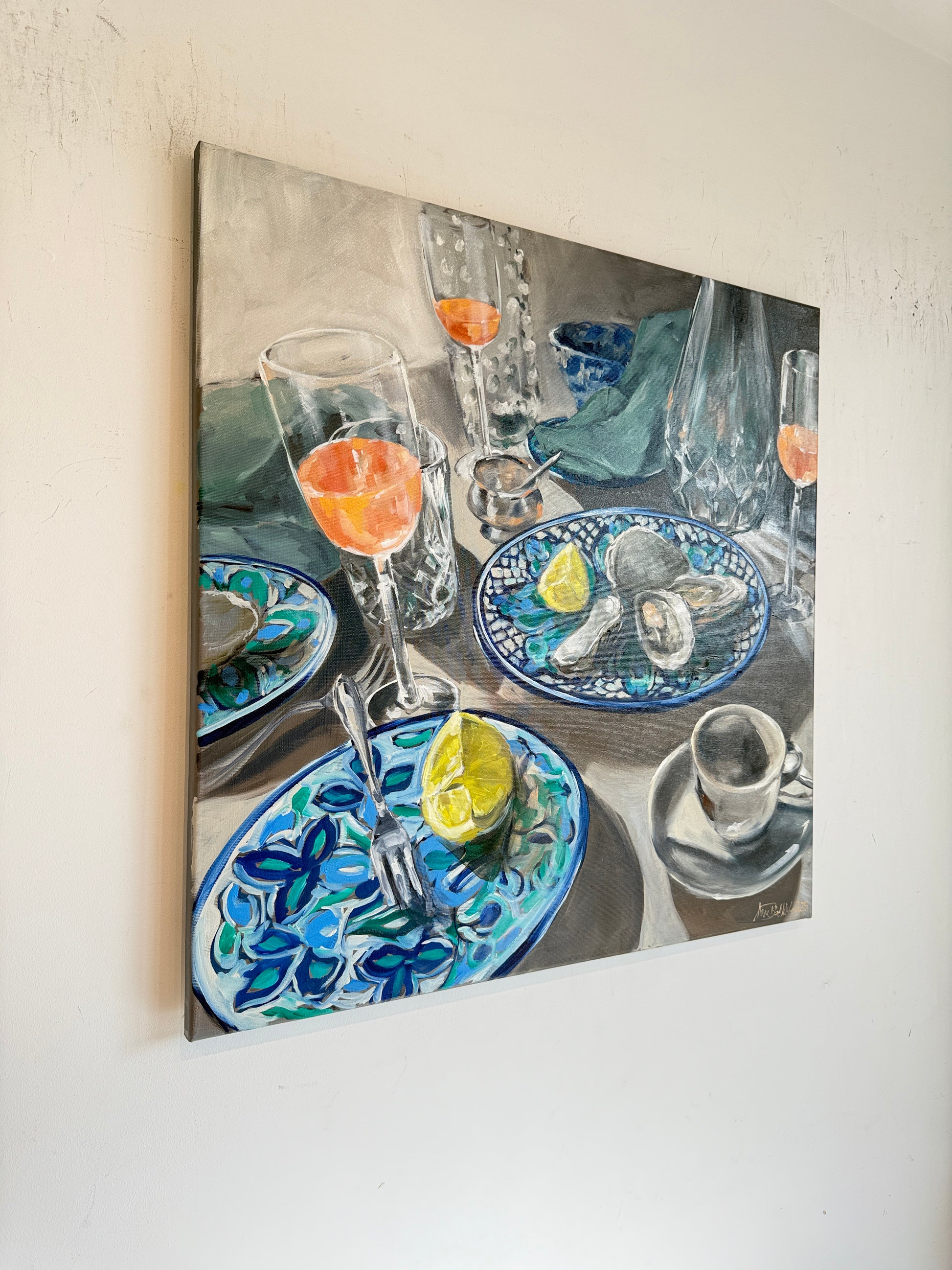 Her paintings are deeply influenced by her fascination with the ocean — its intensity, volatility, and the fragile line between beauty and menace. She explores themes of transience, fleeting moments, and the way people mirror themselves in the shifting face of nature.