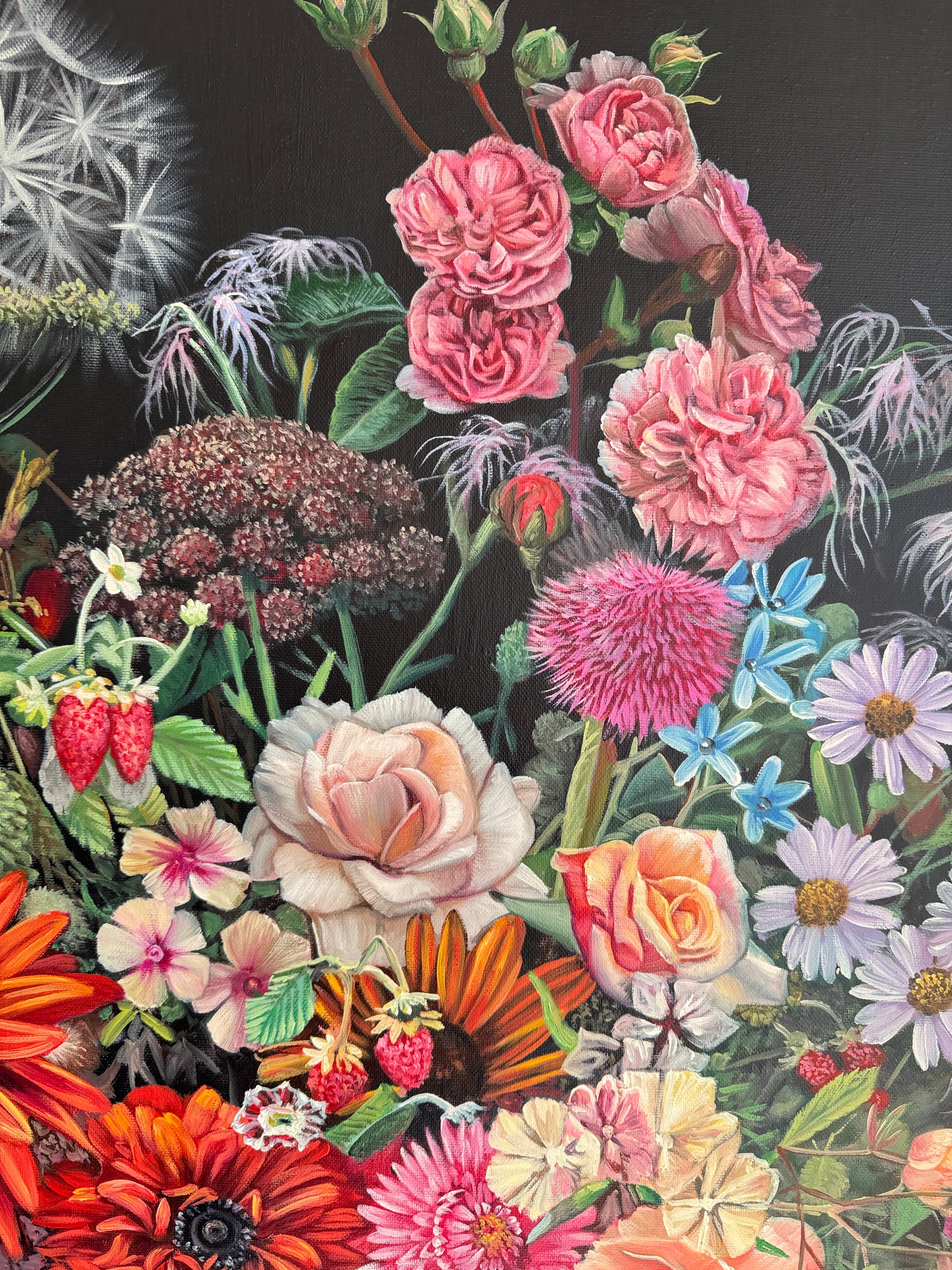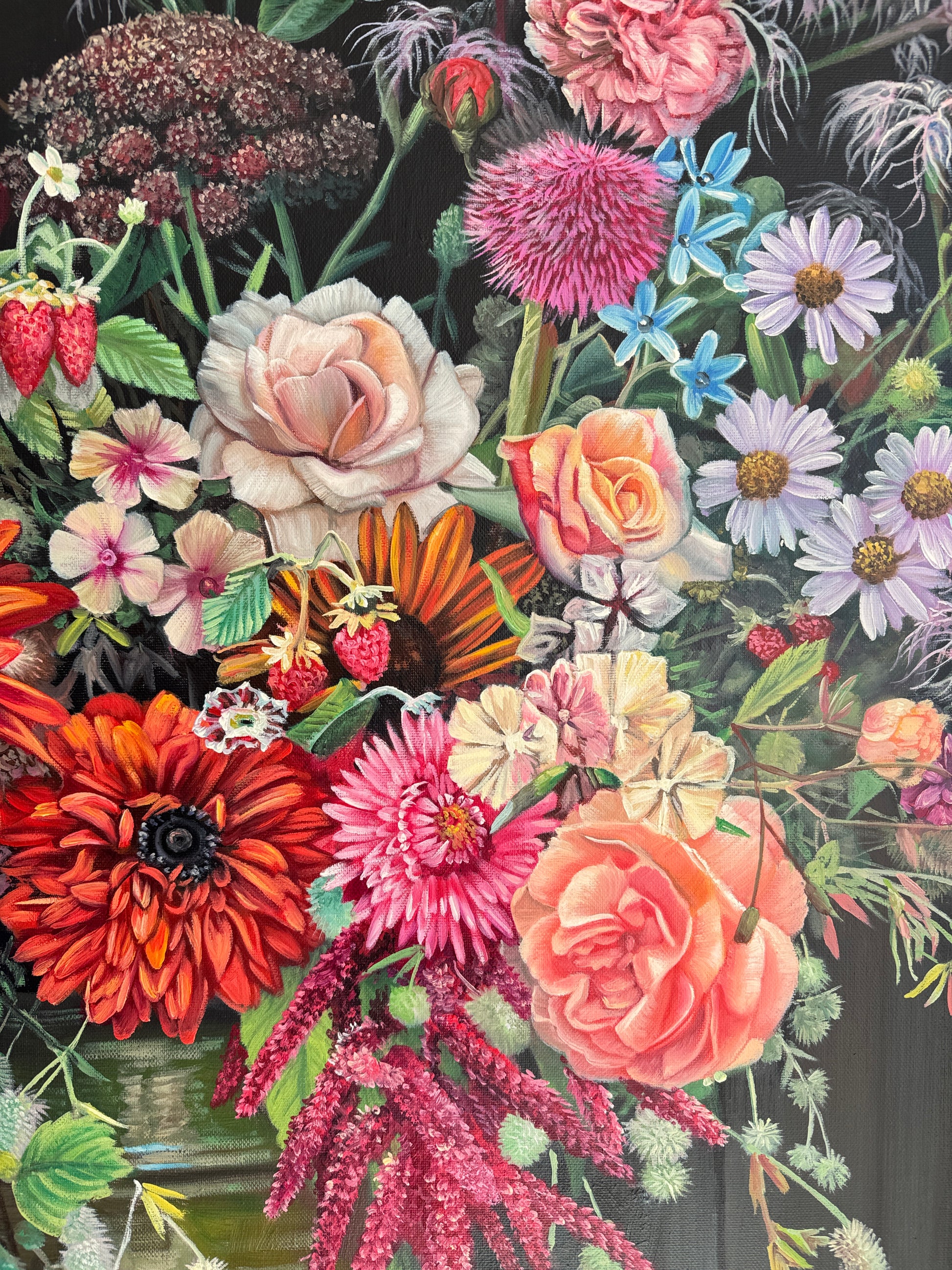 This is a beautiful oil painting of an array of flowers. Contemporary painting full of details and colors, vibrant roses , tulips, peonies and an arrangement of other flowers. Reminding us of old master paintings, this is a brand new painting full elegance and timeless elegance.