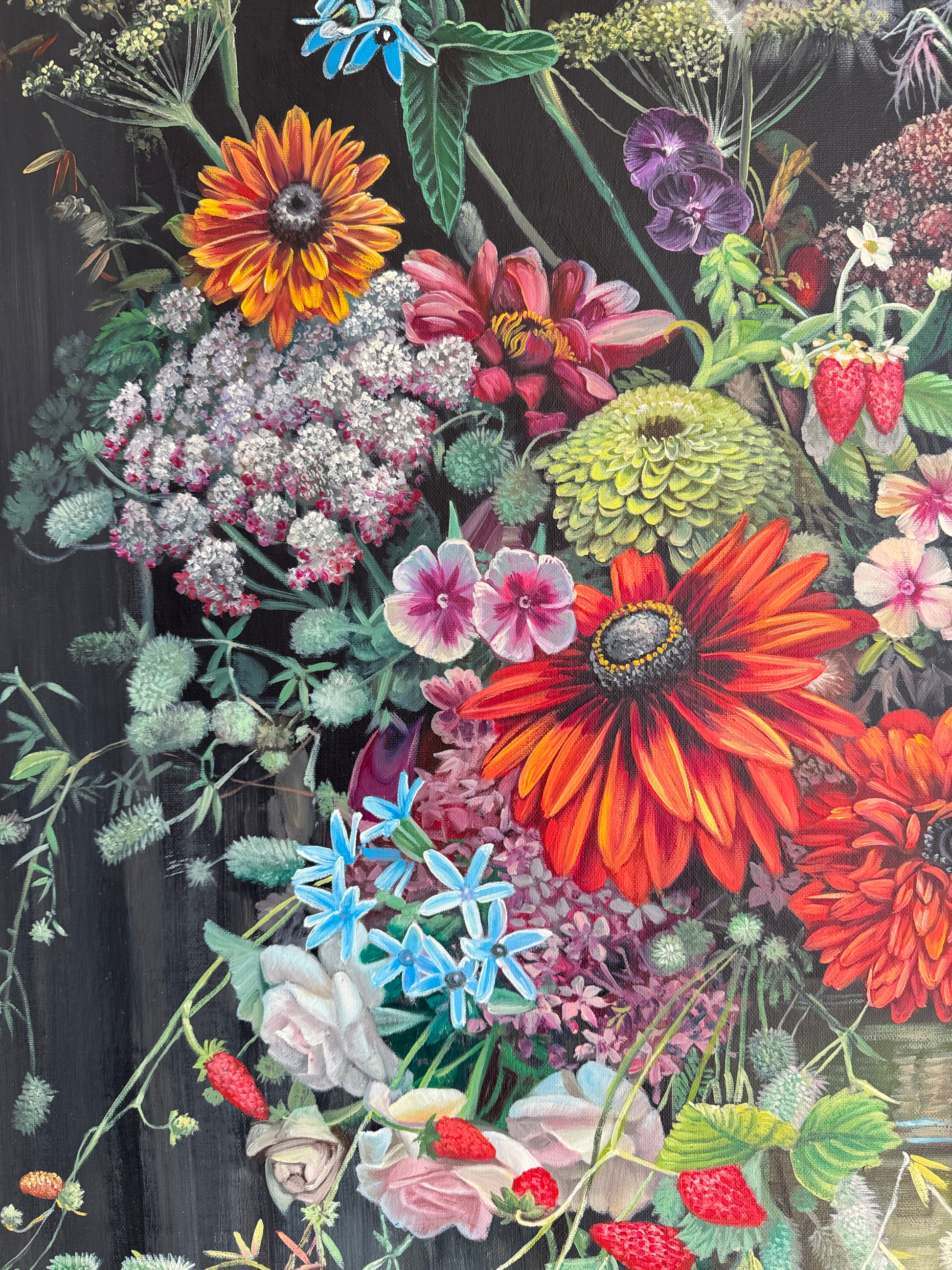 Husslein's artistic philosophy marries a reverence for classical masterpieces with the immersive allure of contemporary still life and botany. Her signature style is characterized by meticulous hyperrealism, particularly evident in her still-life floral compositions. Central to her creations are the visual and tactile attributes of flowers, intertwined with their symbolism evoking themes of love, femininity, and the natural world. These elements coalesce to fashion Husslein's vivacious and captivating compositions.