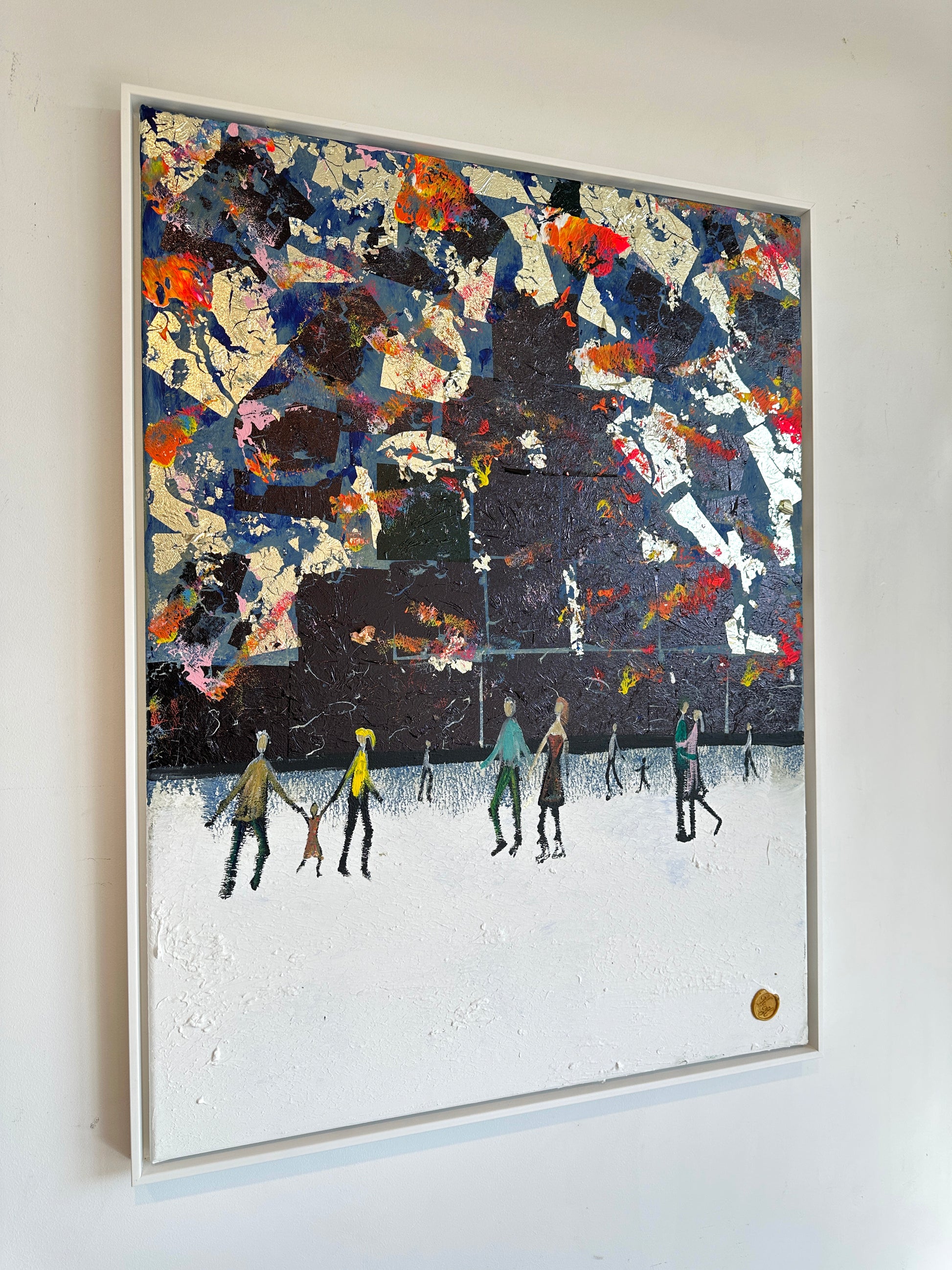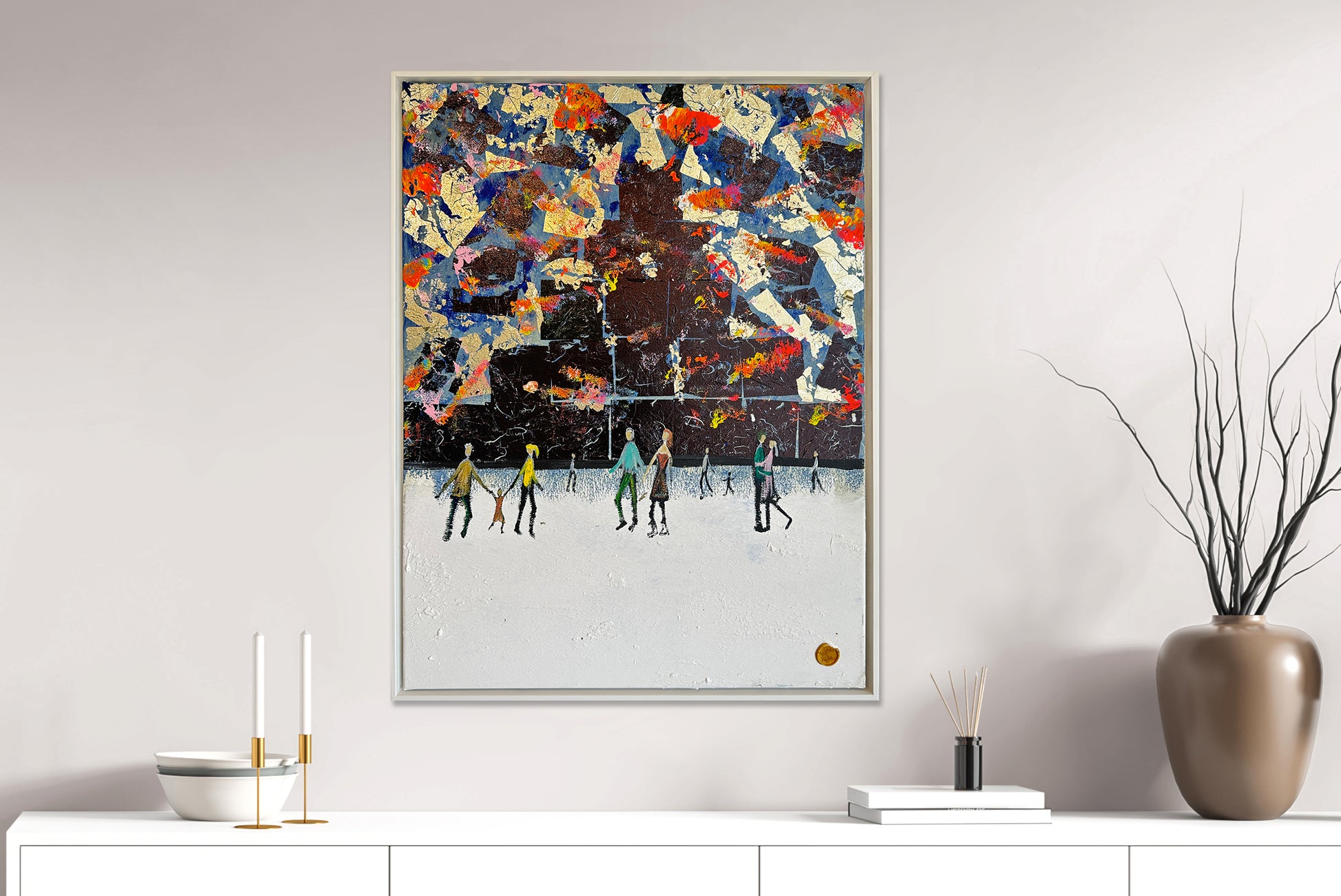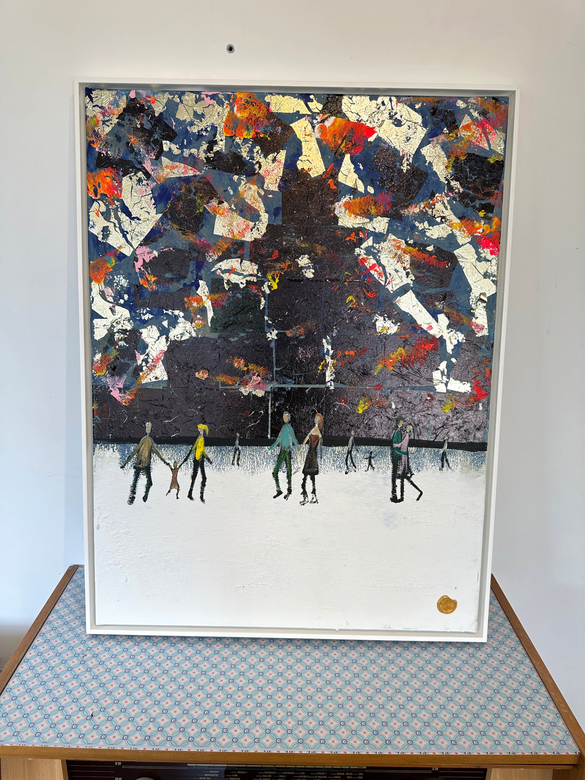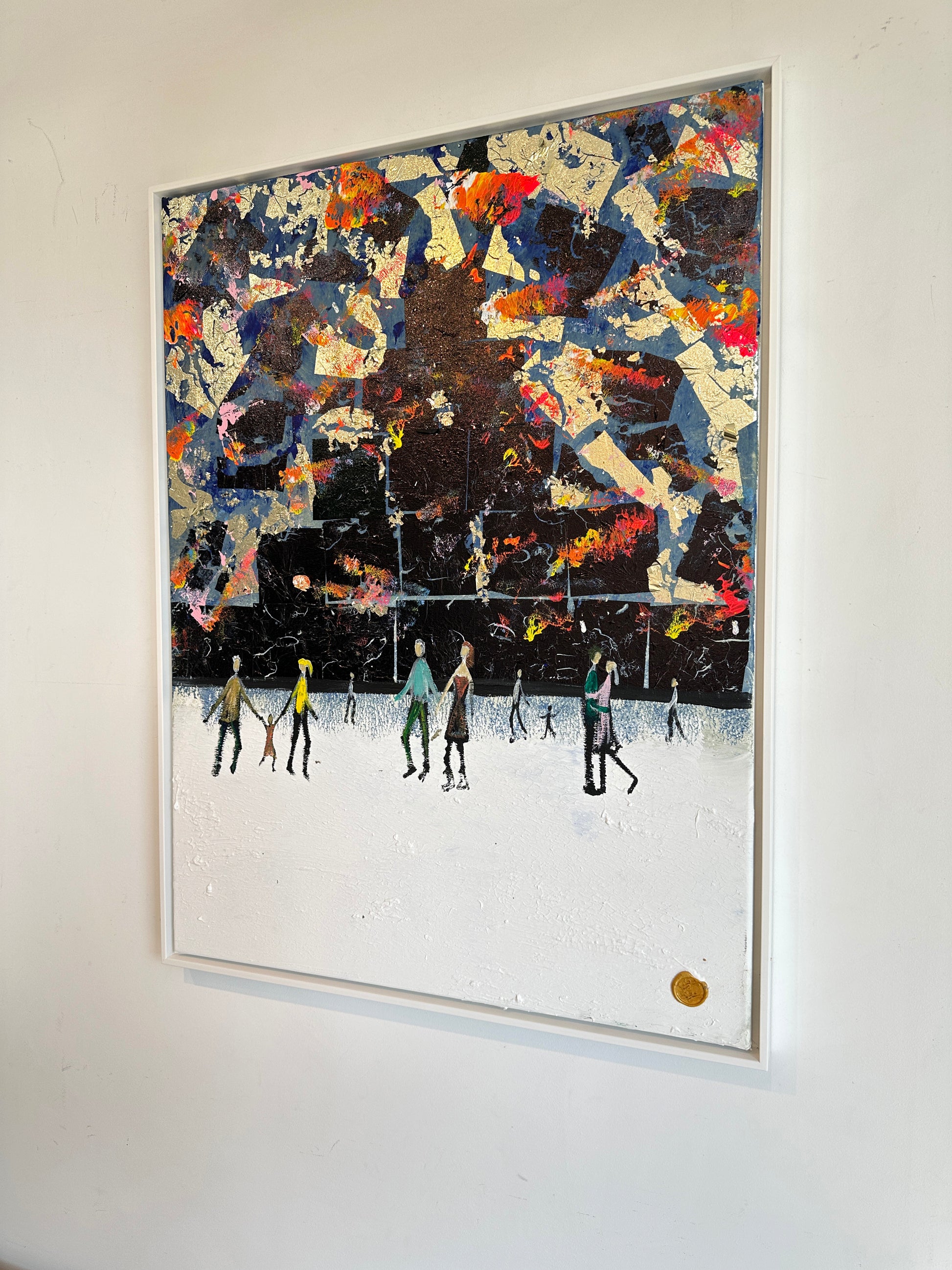 Medium: Acrylics, Waterbased Oil, Spraypaint on Linen Canvas in white wood shadow box frame