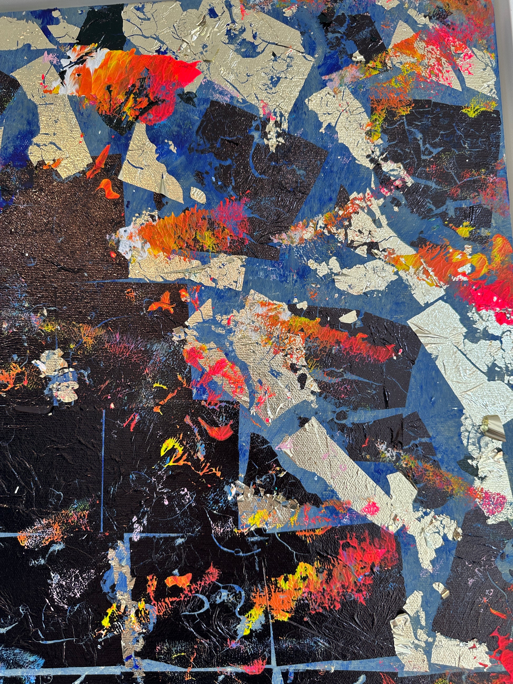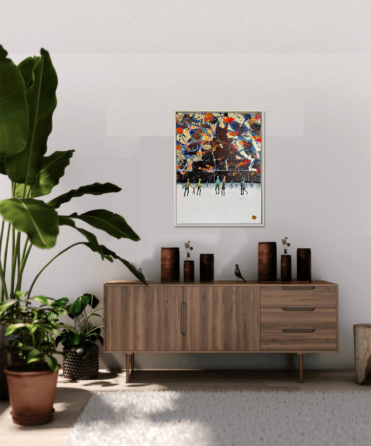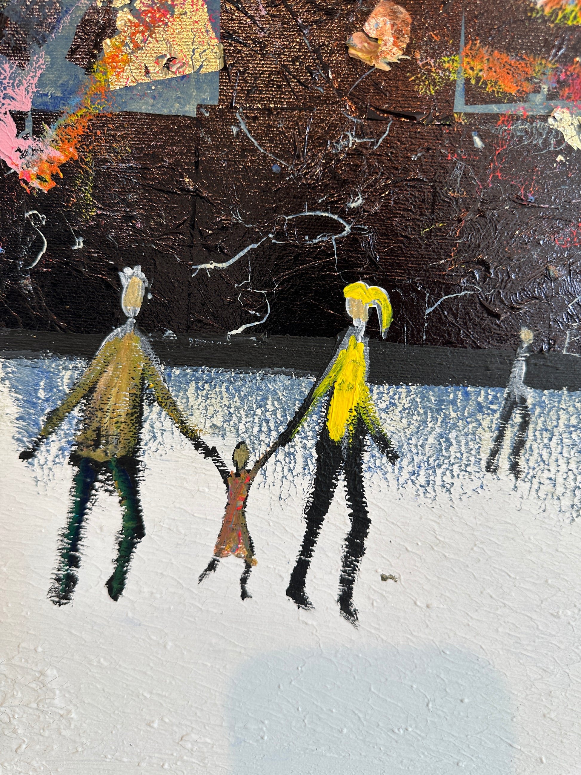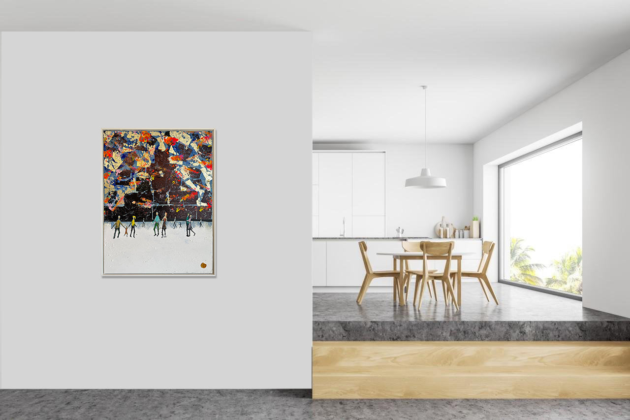 Medium: Acrylics, Waterbased Oil, Spraypaint on Linen Canvas in white wood shadow box frame