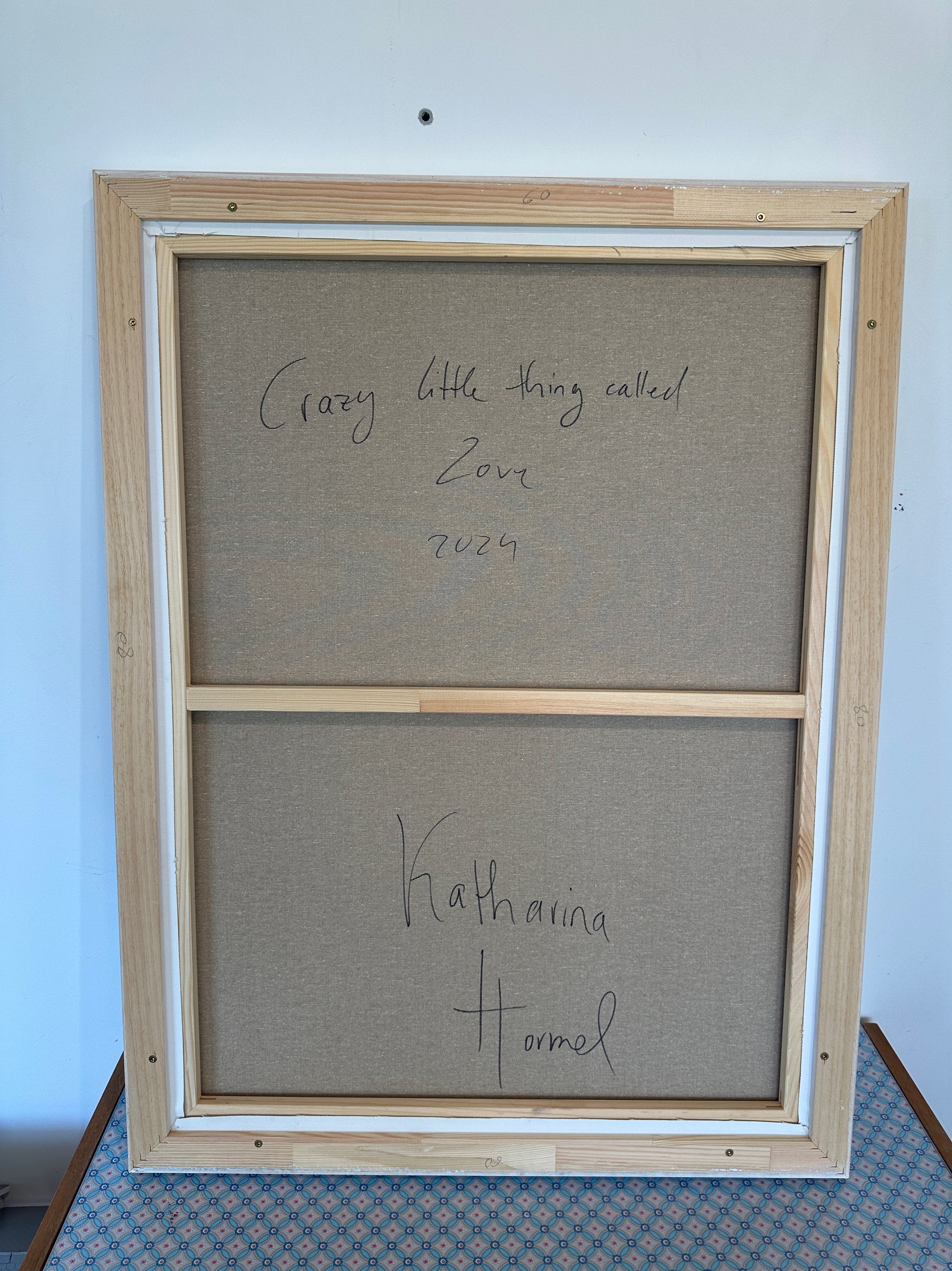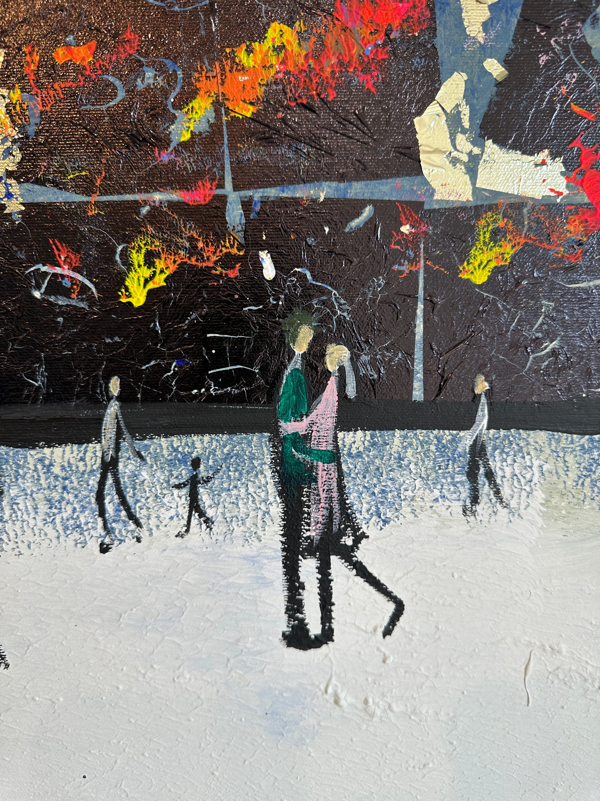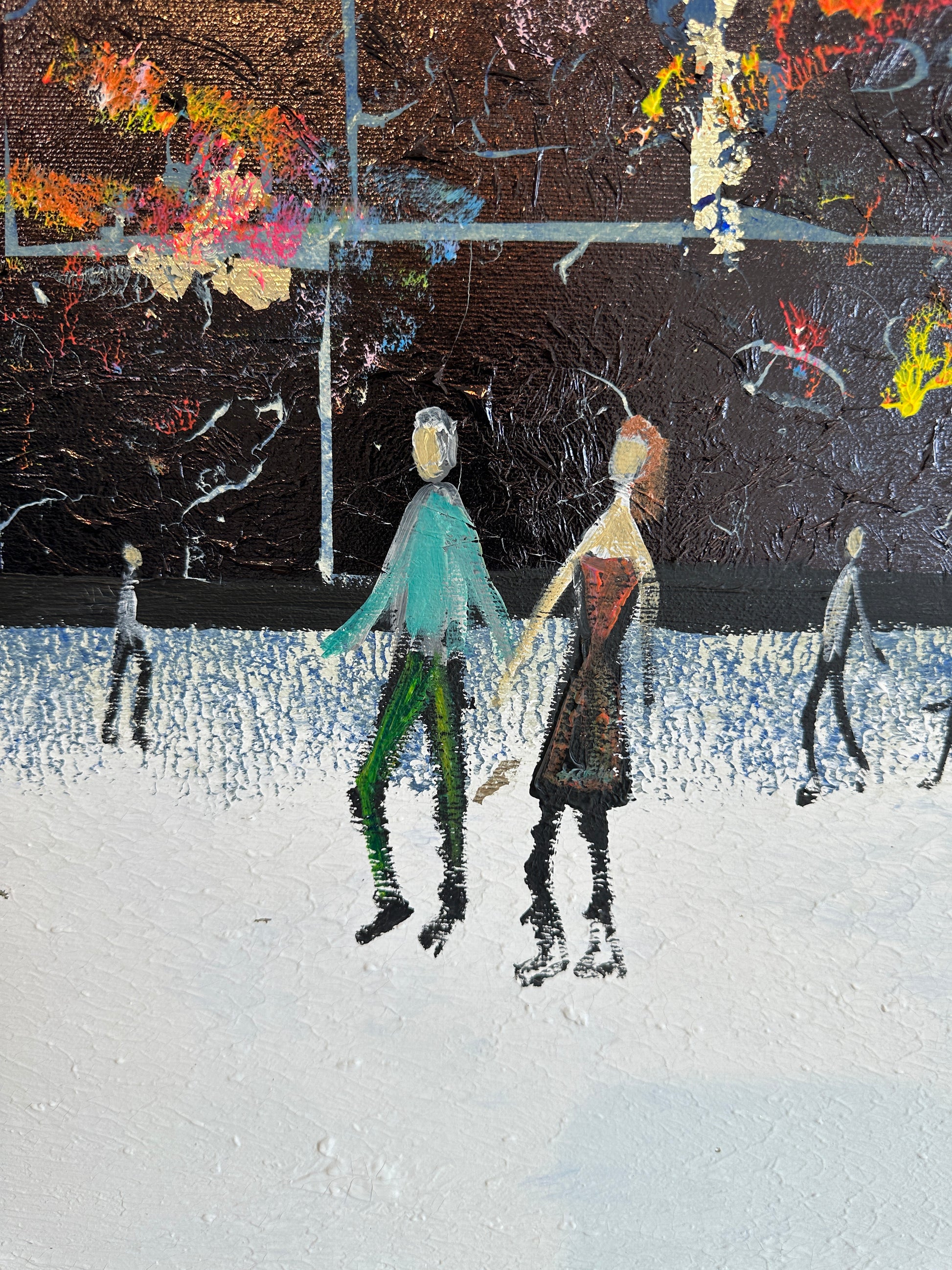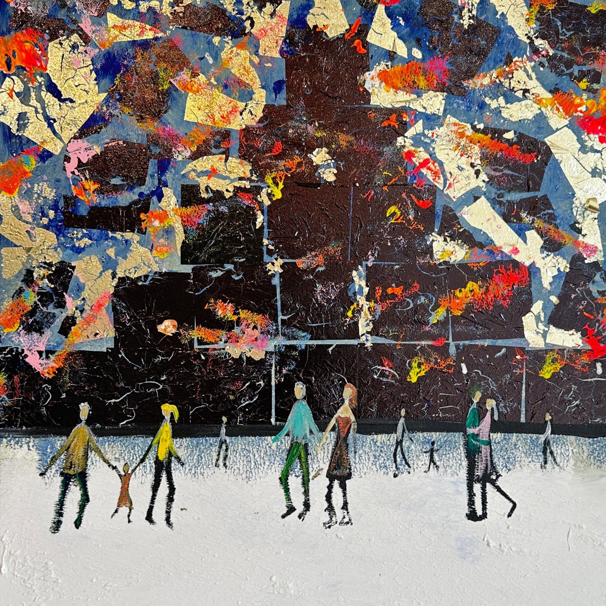 Medium: Acrylics, Waterbased Oil, Spraypaint on Linen Canvas in white wood shadow box frame