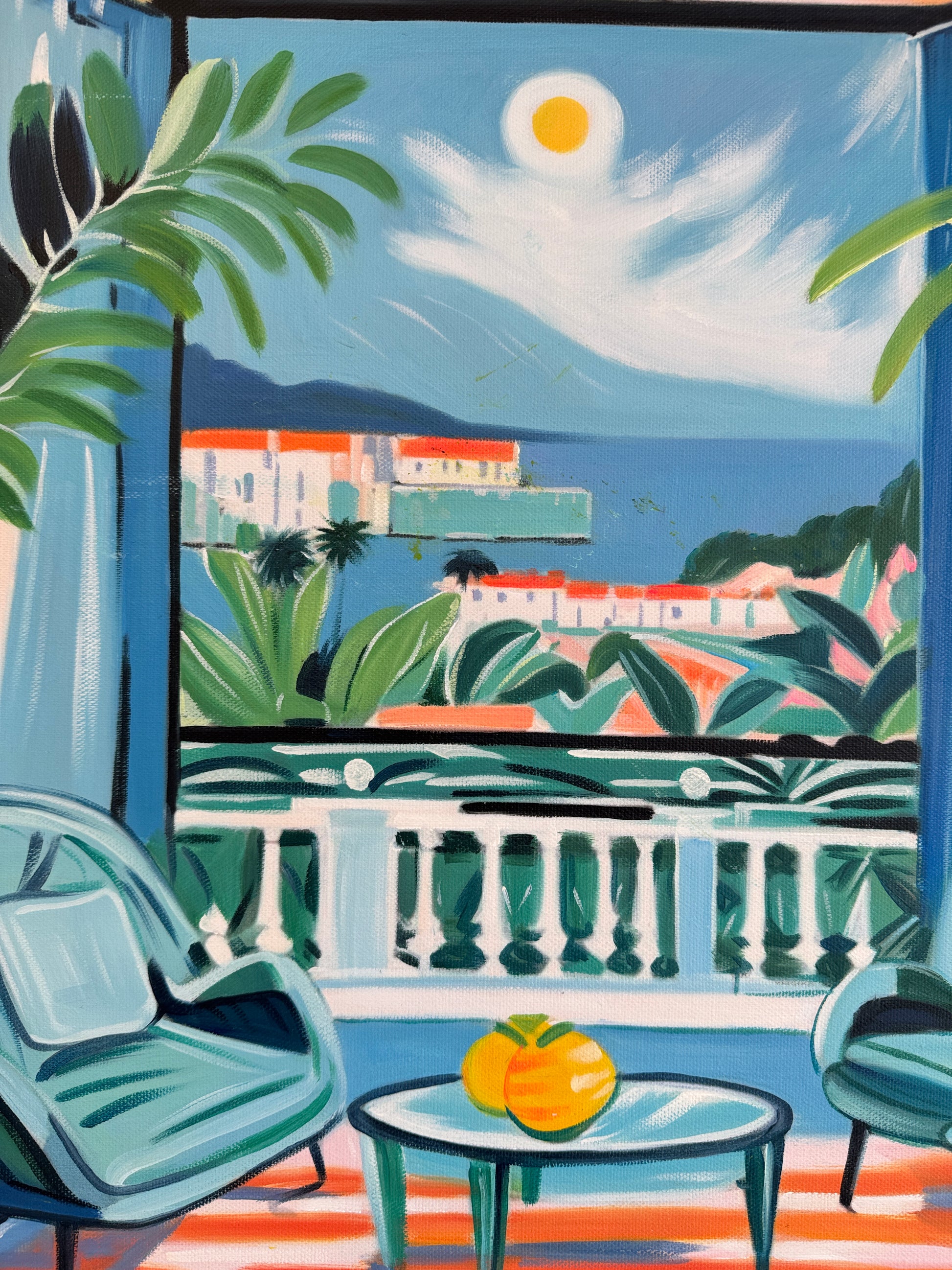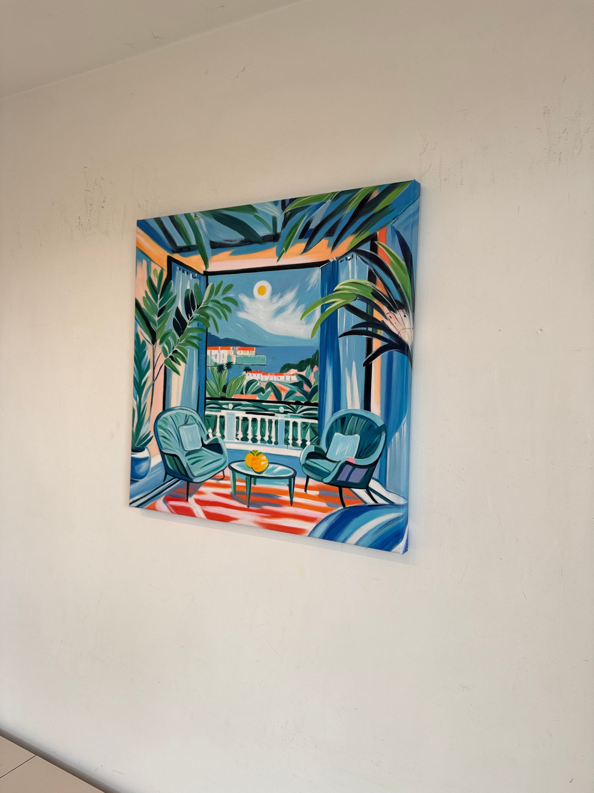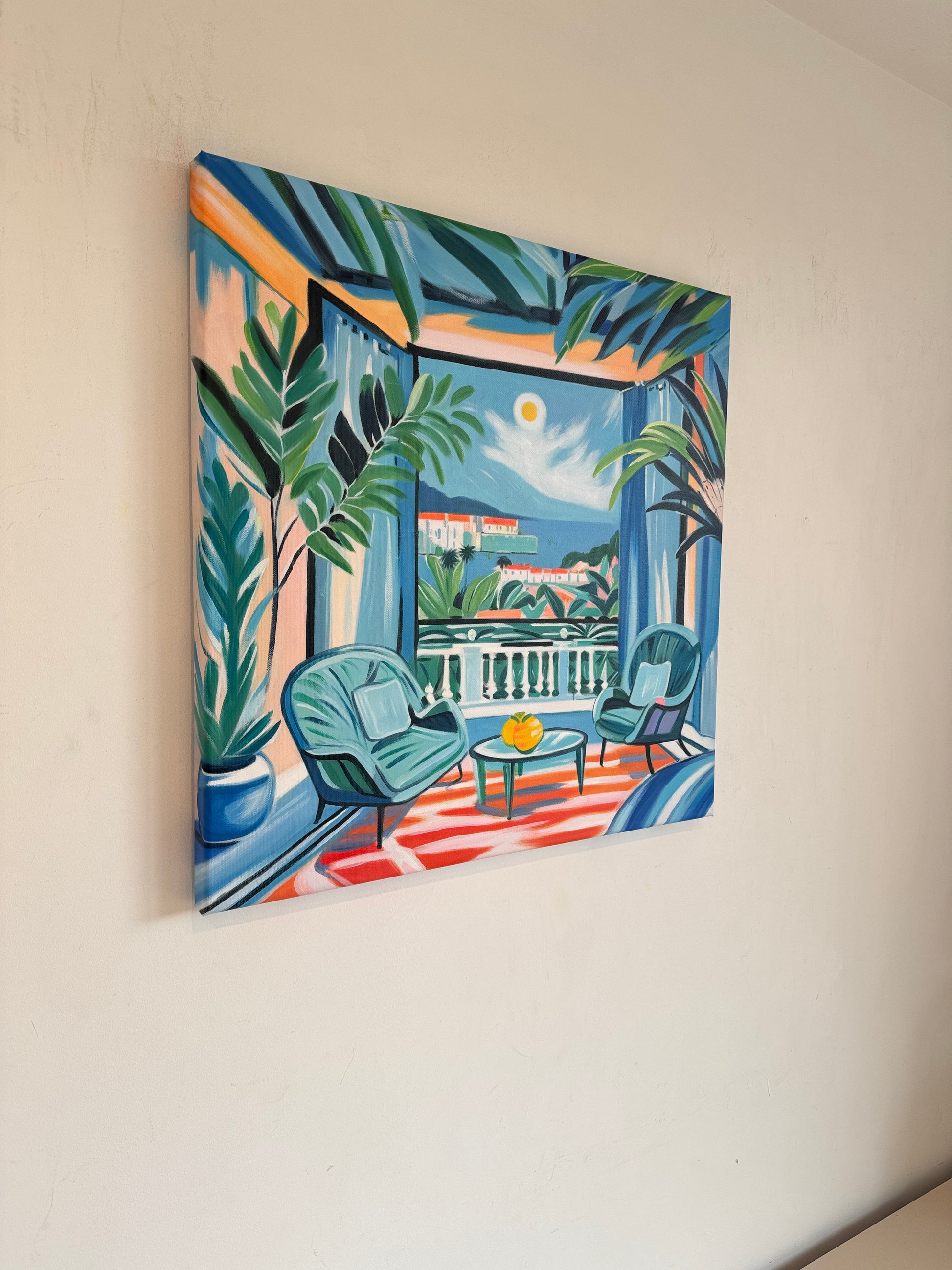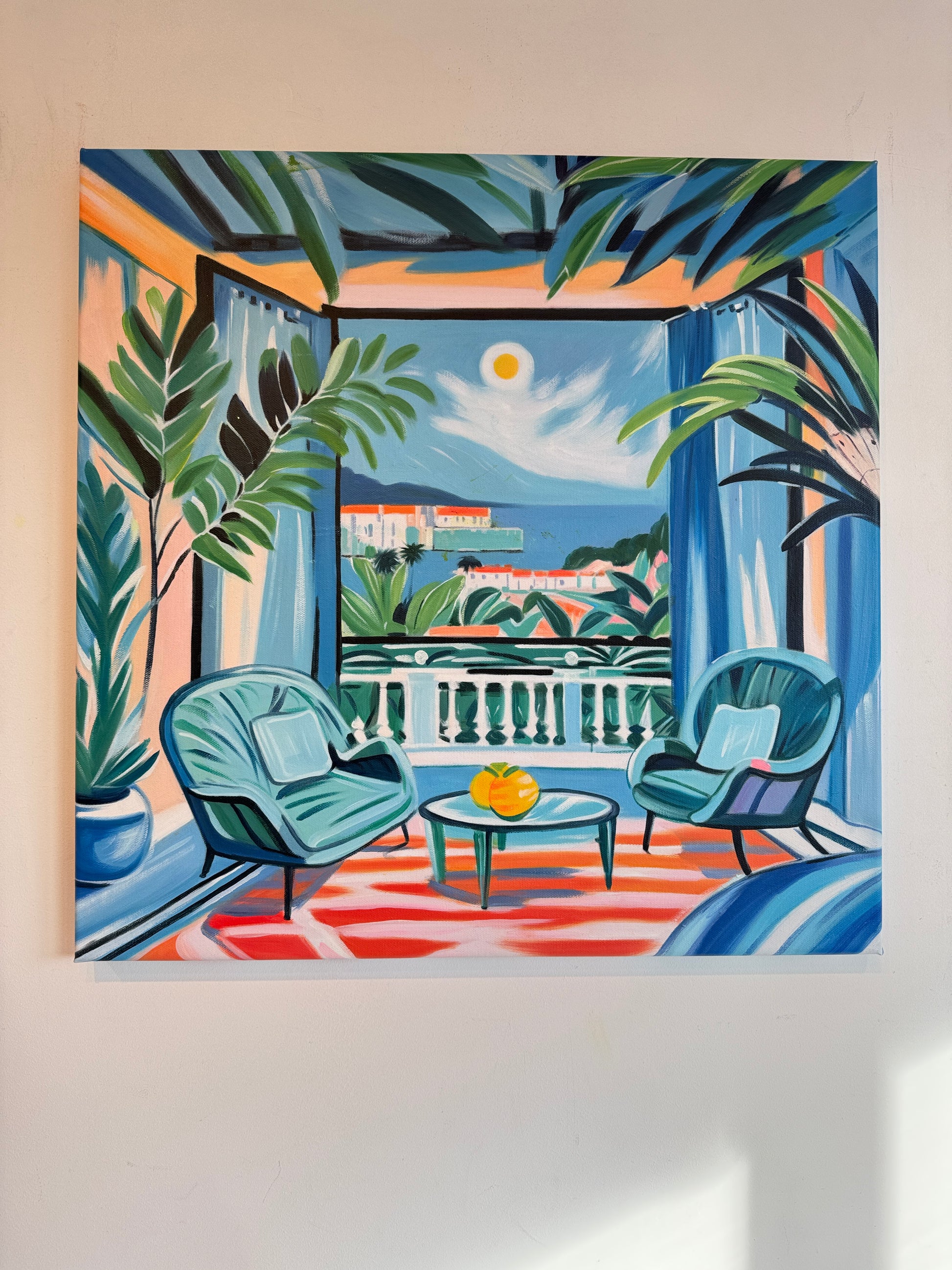 With bold colours, soft light, and breezy compositions, the paintings capture the laid-back rhythm of holiday life. Added thread details, carefully stitched into the canvas, highlight small elements and bring a subtle, tactile layer to the work — adding intimacy and depth without overpowering the calm, open feel of each piece.