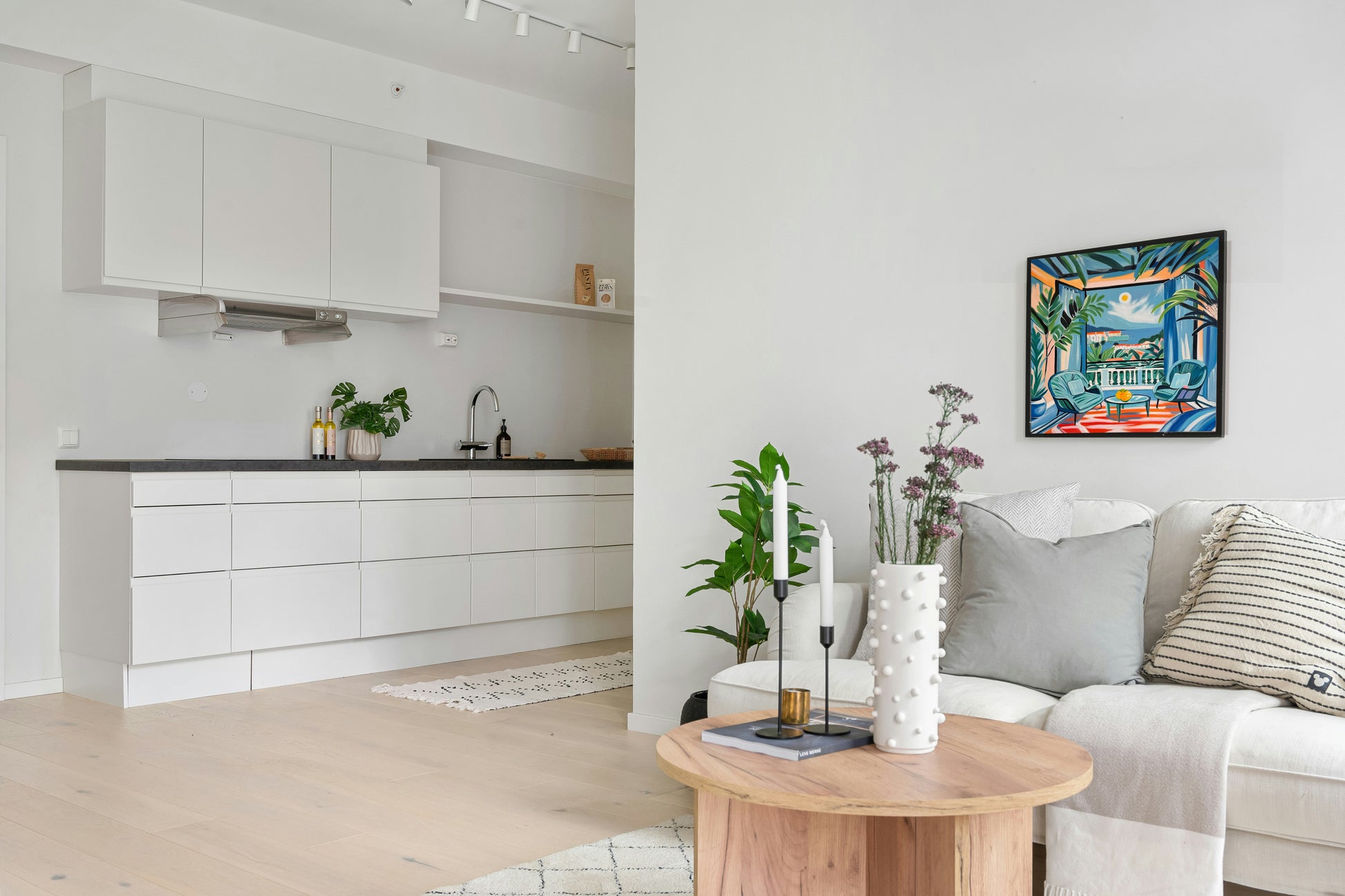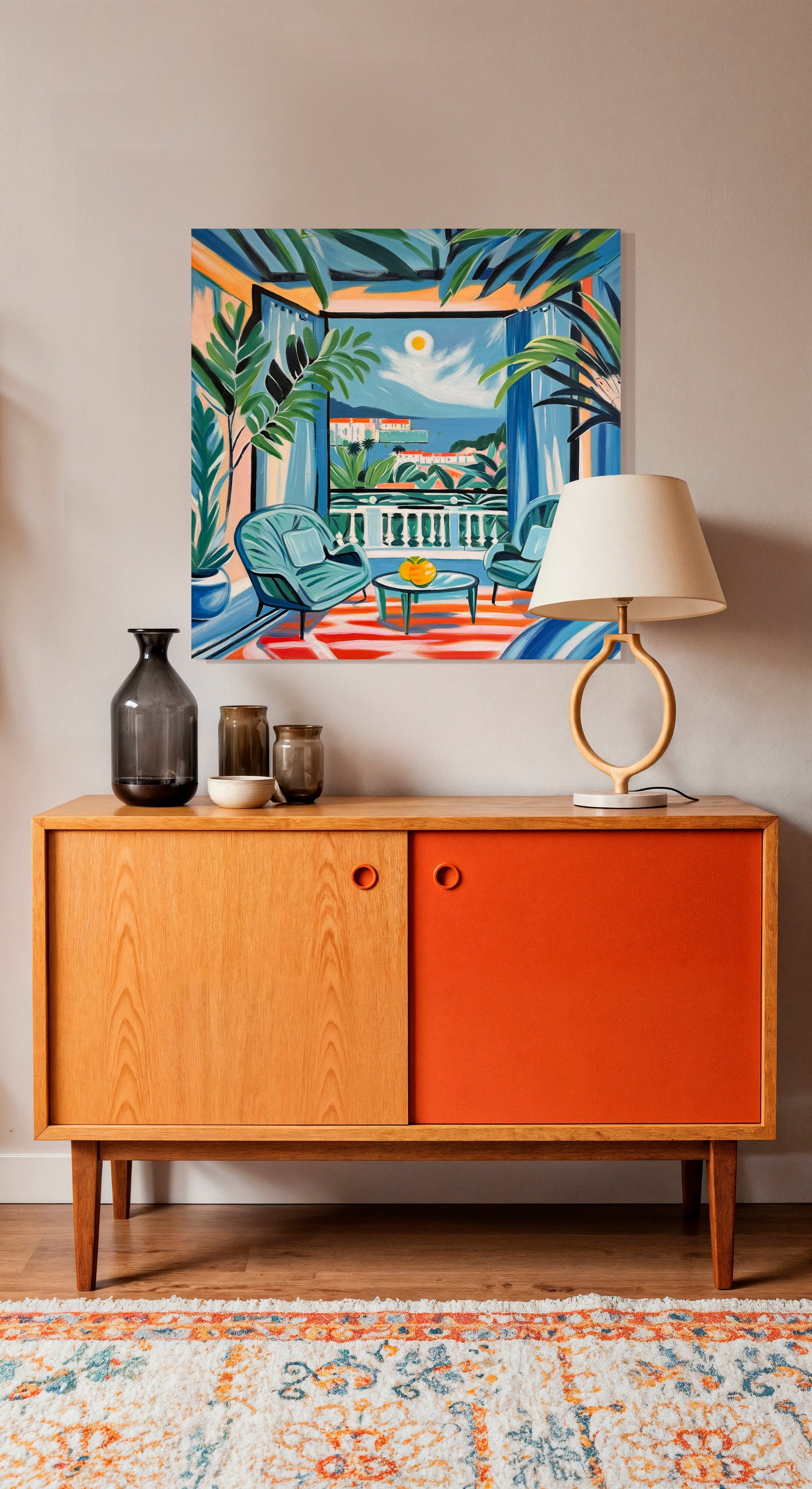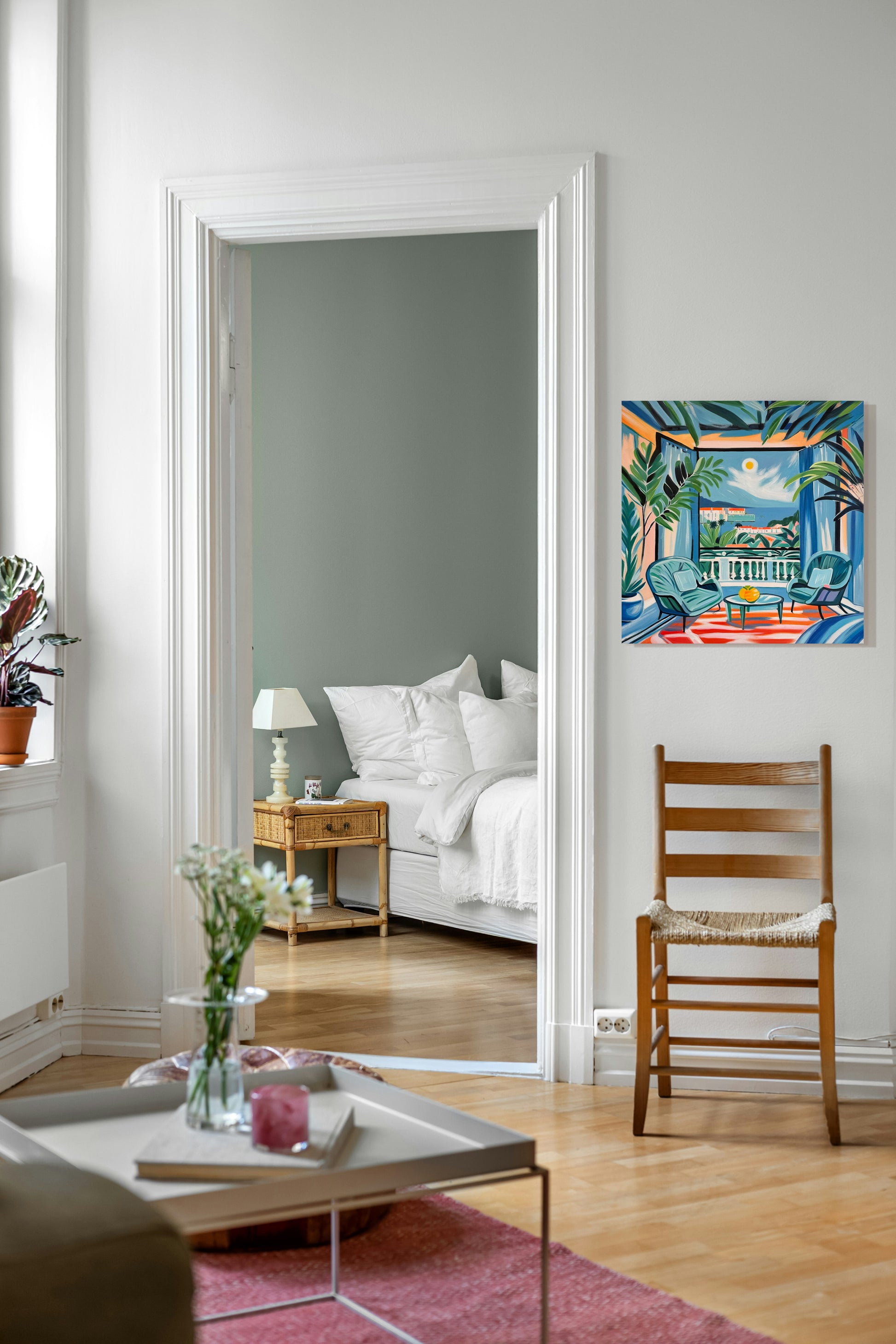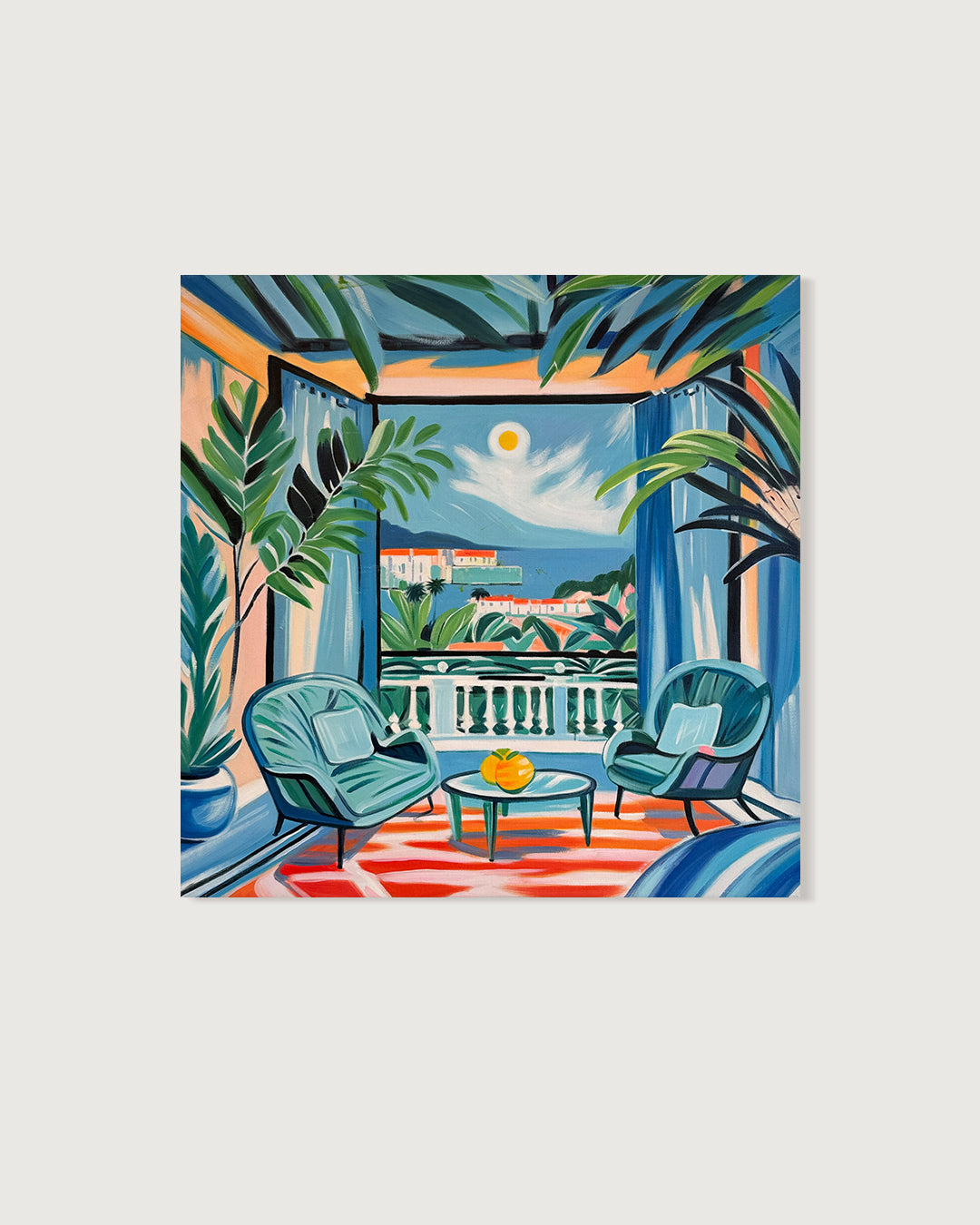 With bold colours, soft light, and breezy compositions, the paintings capture the laid-back rhythm of holiday life. Added thread details, carefully stitched into the canvas, highlight small elements and bring a subtle, tactile layer to the work — adding intimacy and depth without overpowering the calm, open feel of each piece.