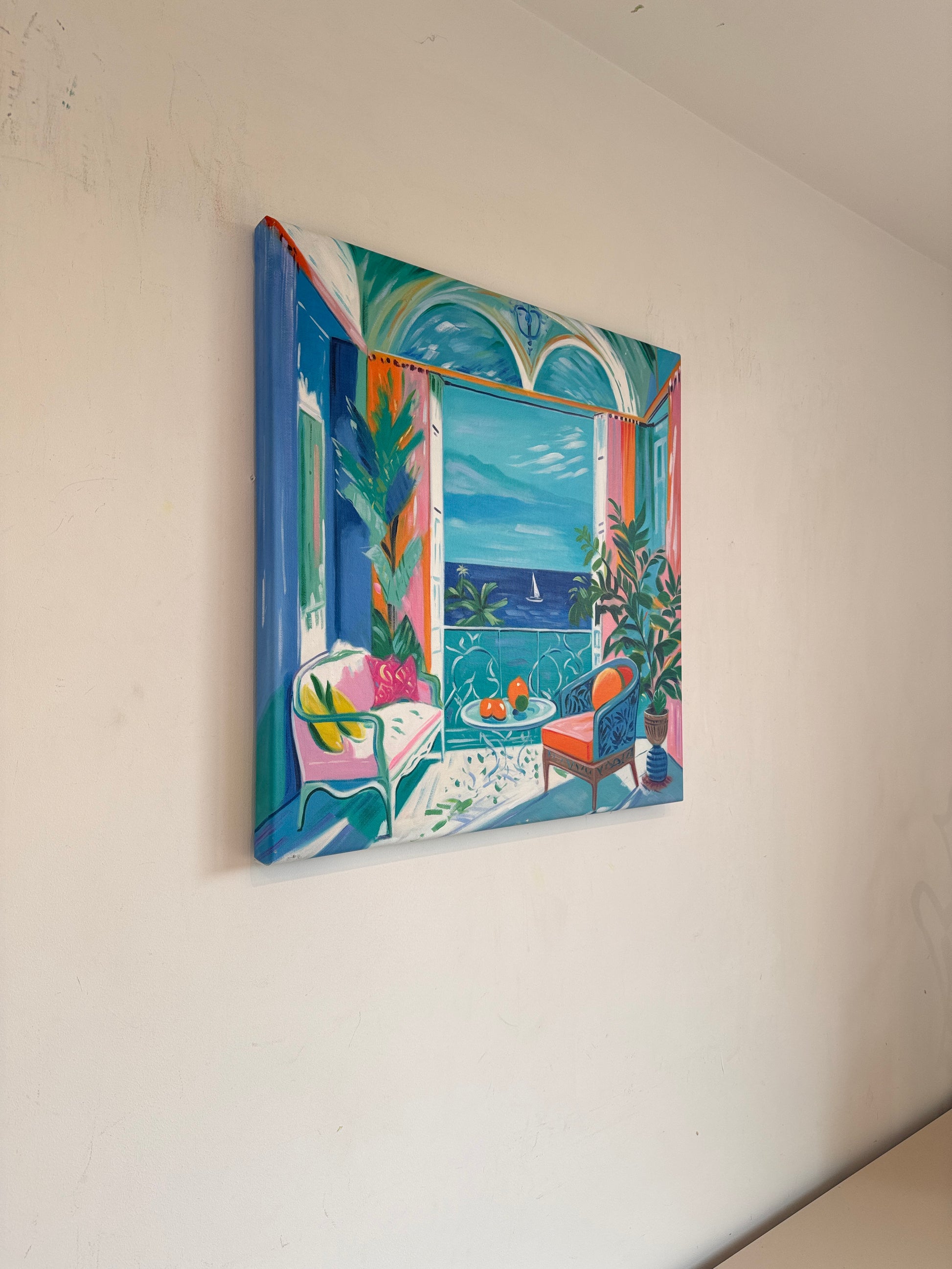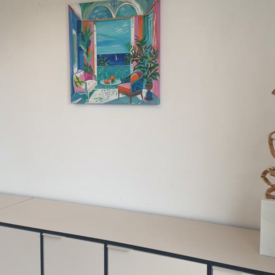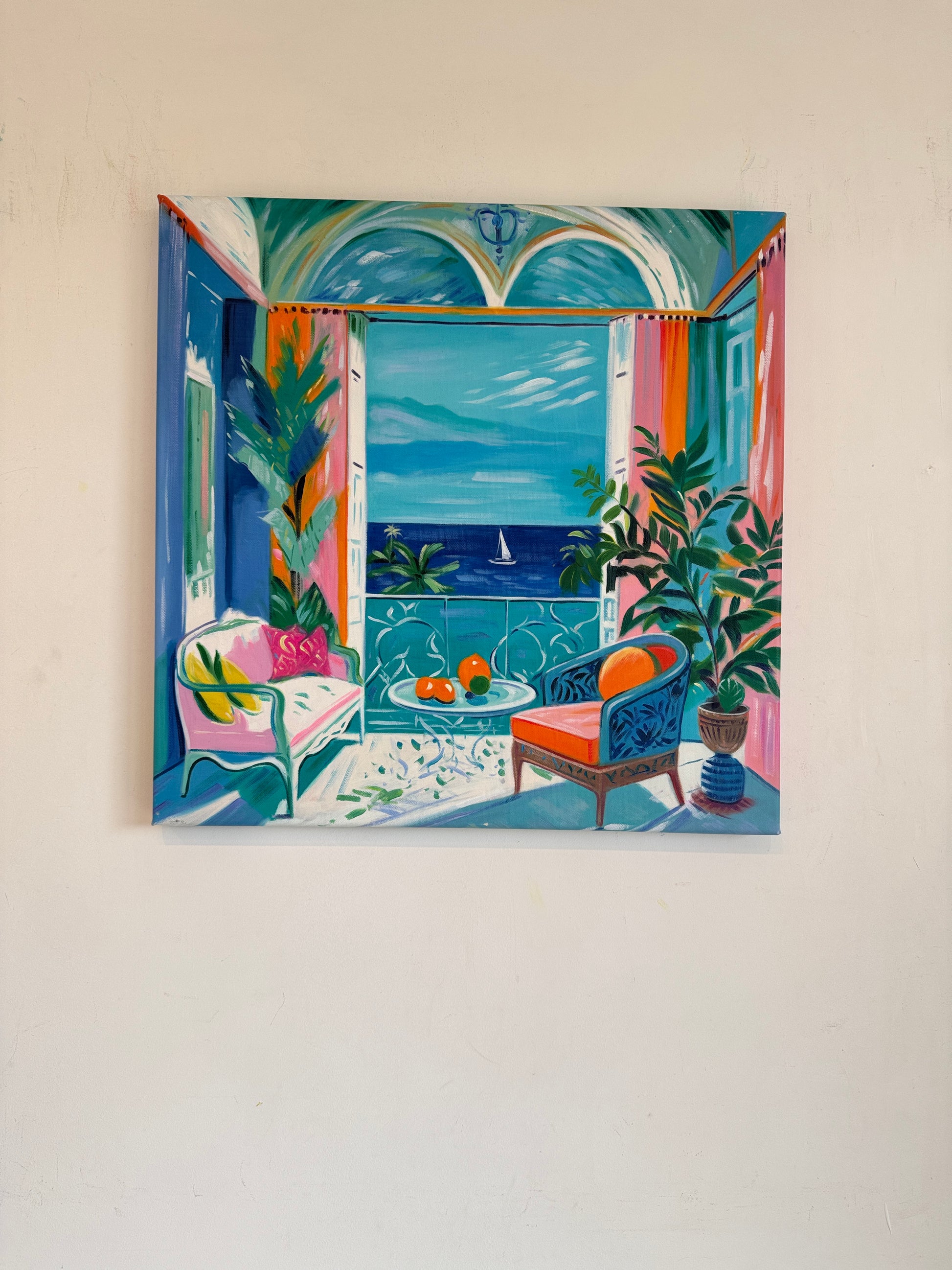 With bold colours, soft light, and breezy compositions, the paintings capture the laid-back rhythm of holiday life. Added thread details, carefully stitched into the canvas, highlight small elements and bring a subtle, tactile layer to the work — adding intimacy and depth without overpowering the calm, open feel of each piece.