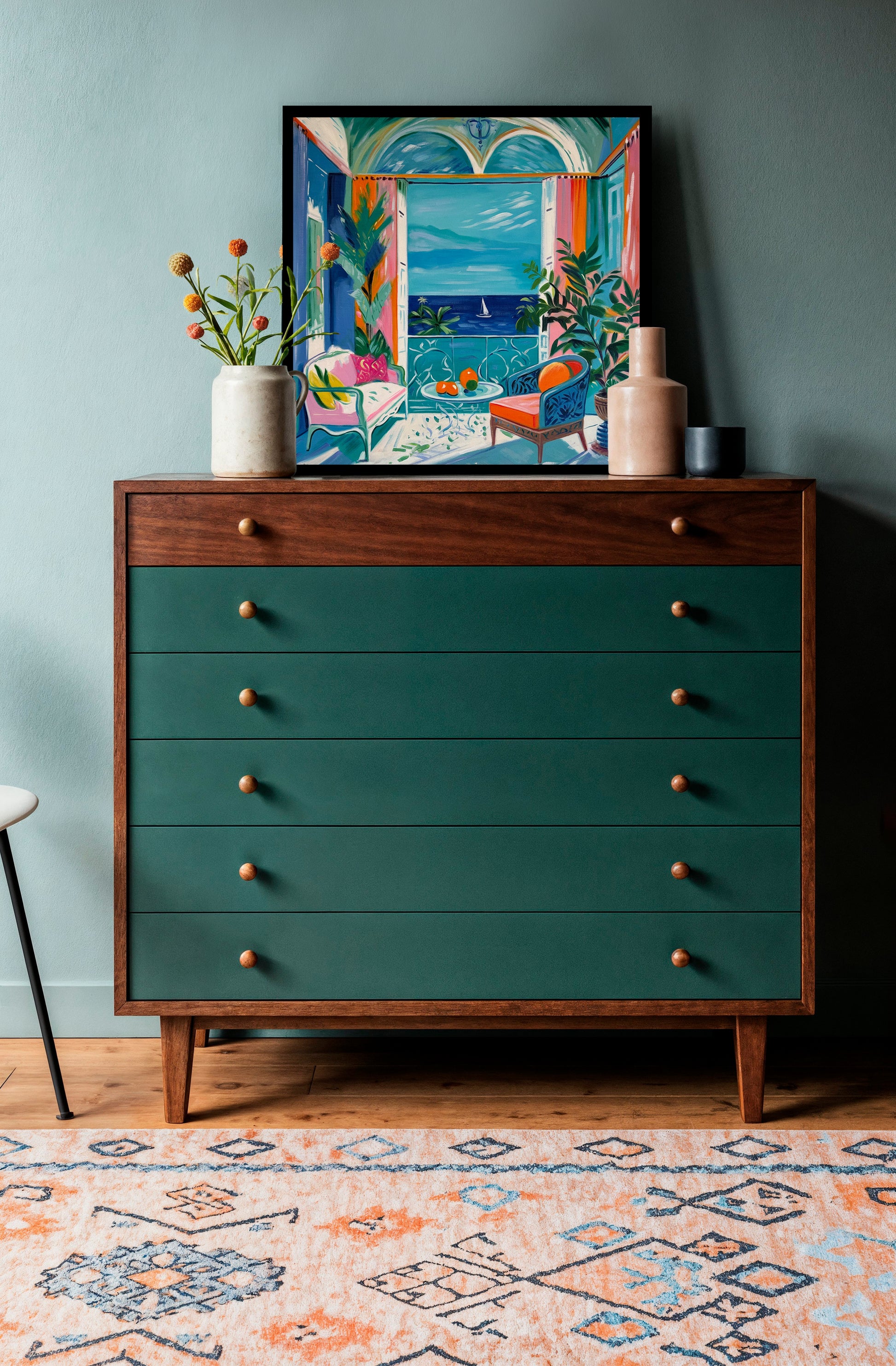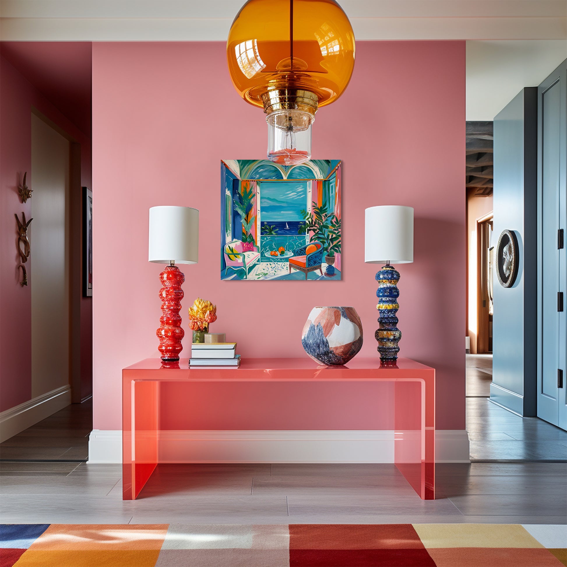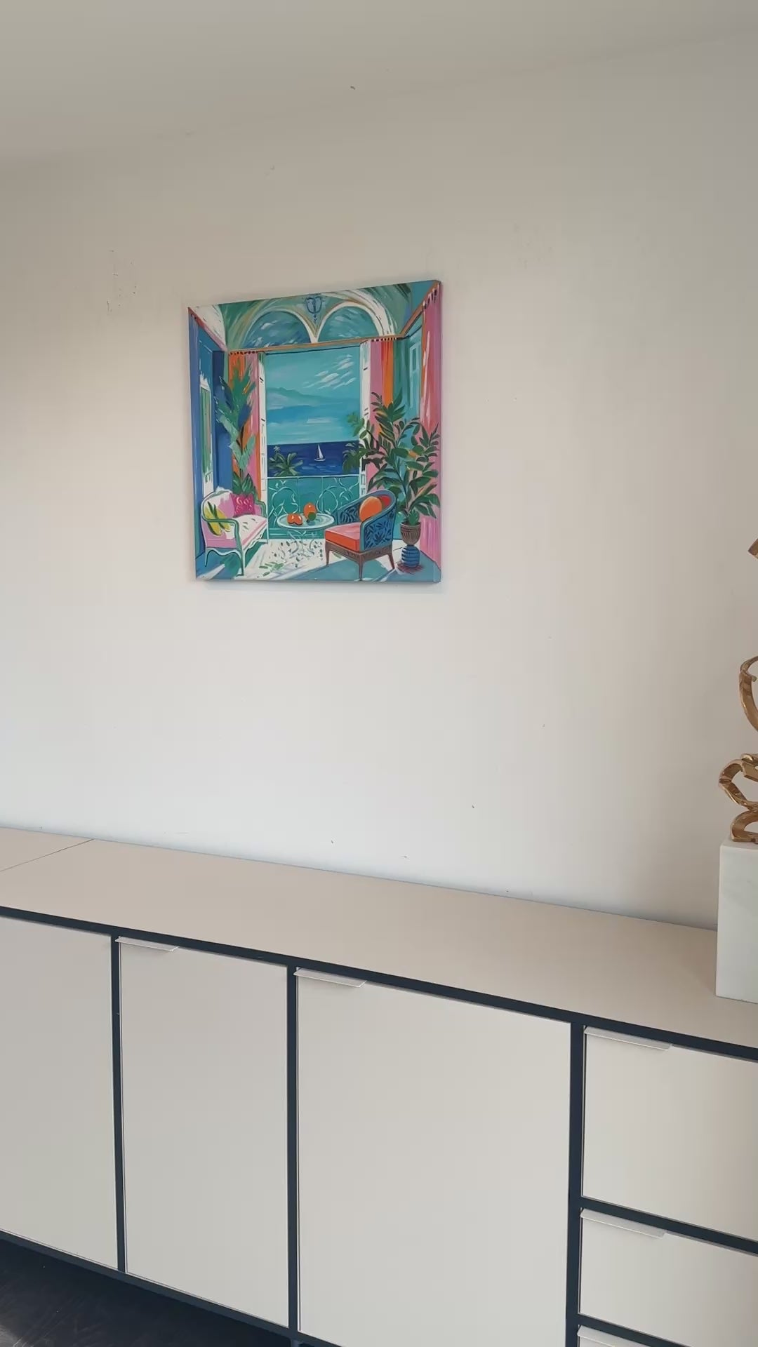 With bold colours, soft light, and breezy compositions, the paintings capture the laid-back rhythm of holiday life. Added thread details, carefully stitched into the canvas, highlight small elements and bring a subtle, tactile layer to the work — adding intimacy and depth without overpowering the calm, open feel of each piece.