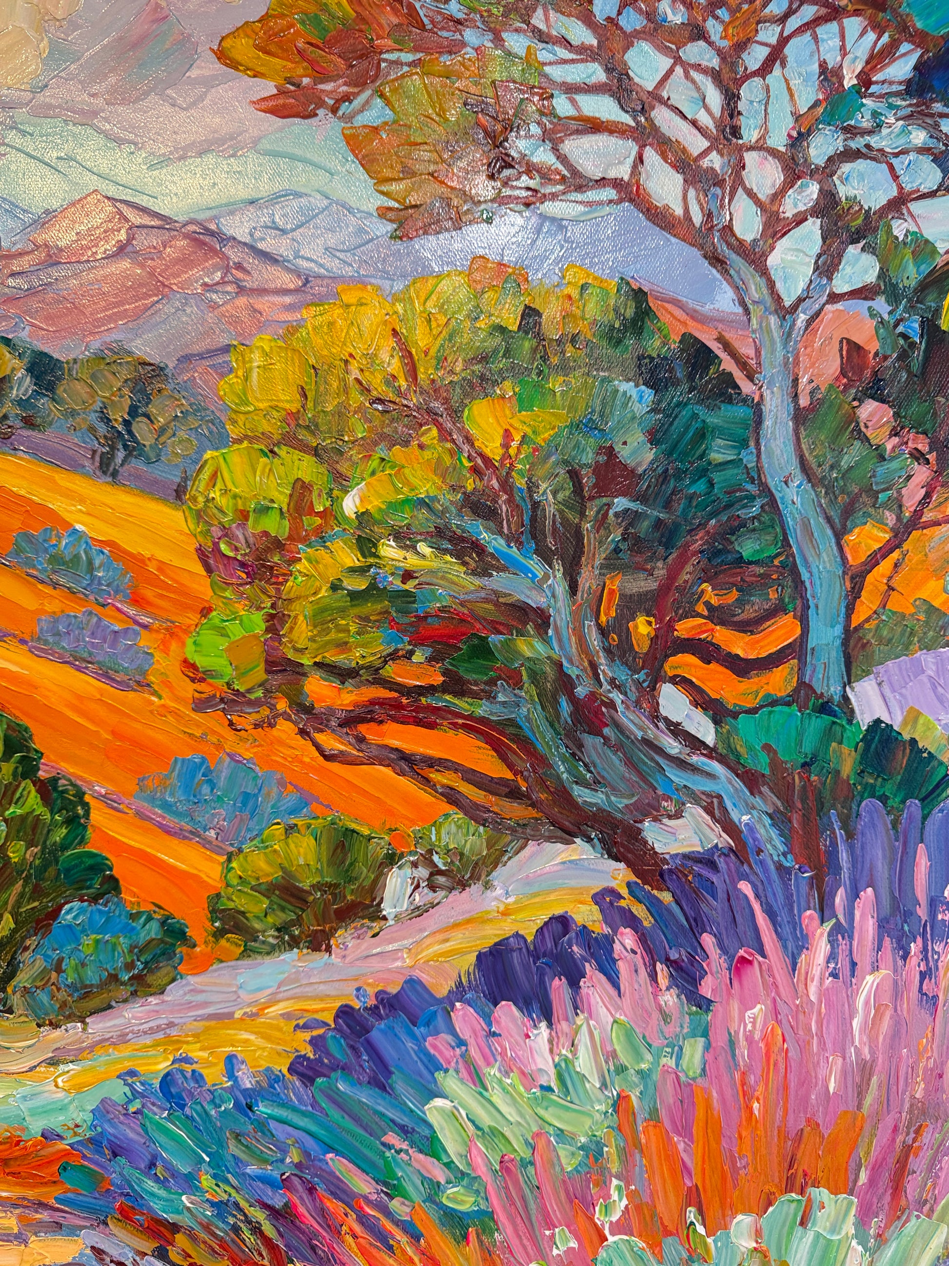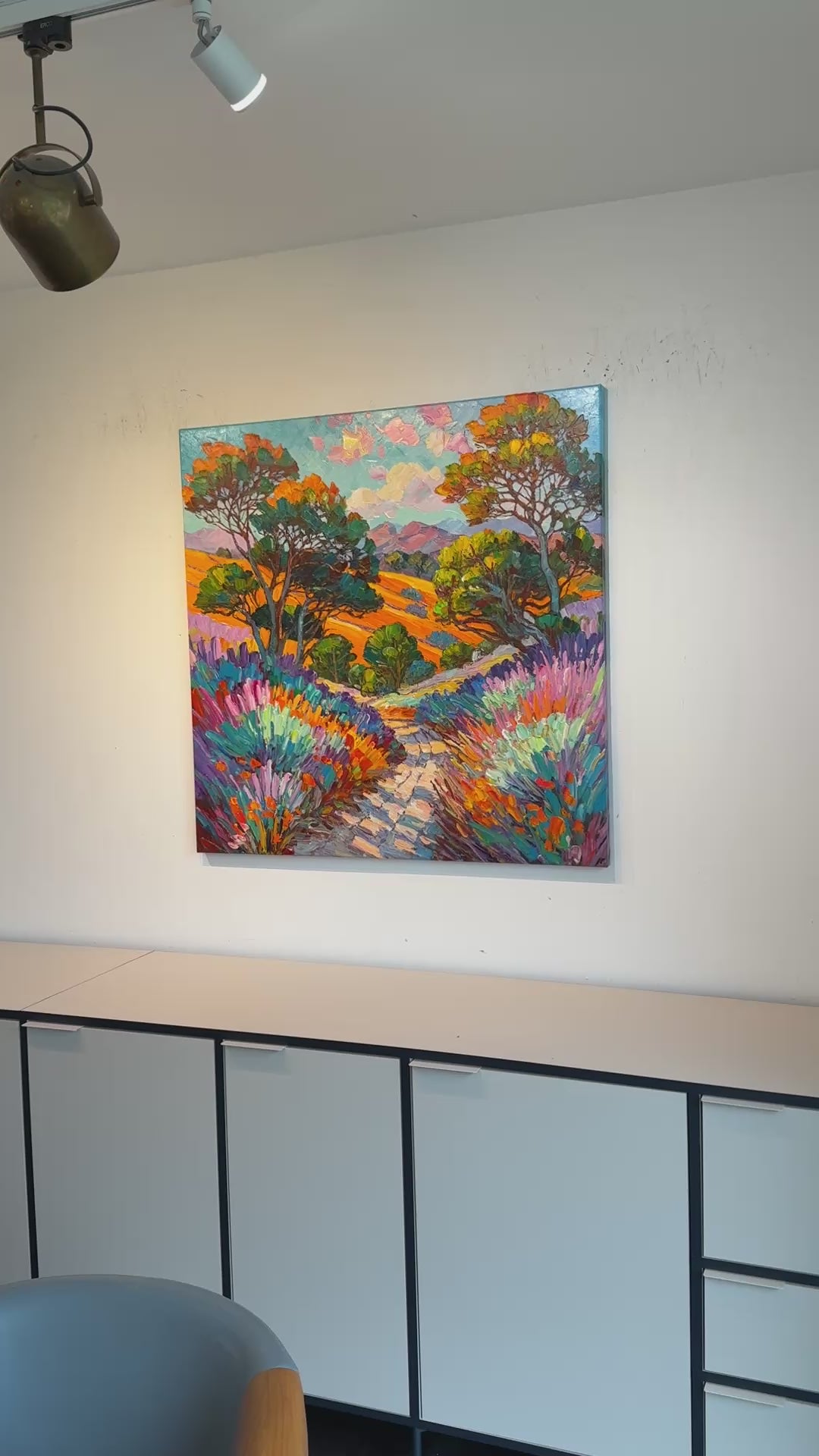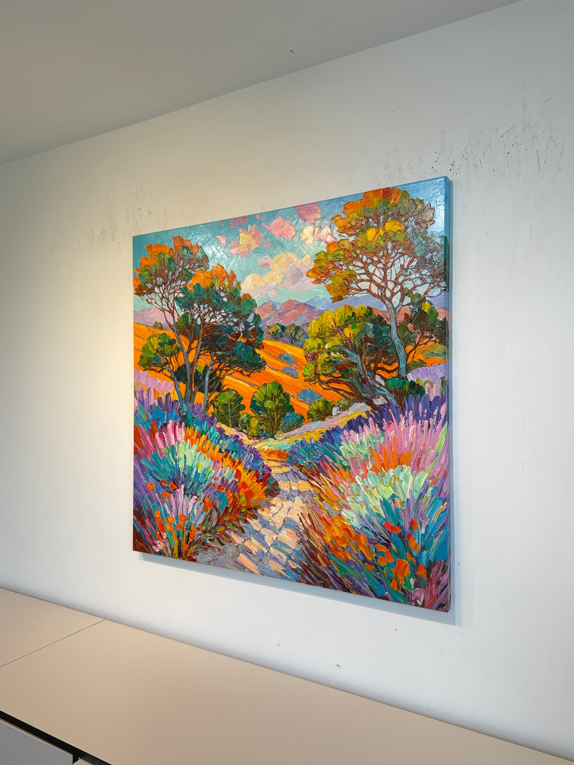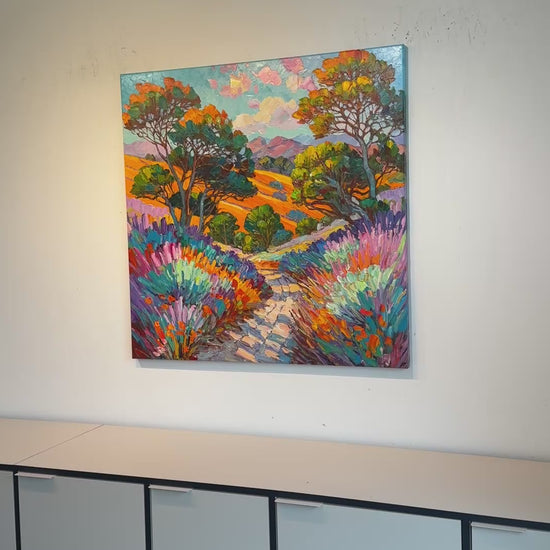 This one-of-a-kind oil painting is signed by Husslein on the back. The painting is ready to hang and includes professional wiring for easy installation. The sides are painted as a continuation of the front and it does not require framing.