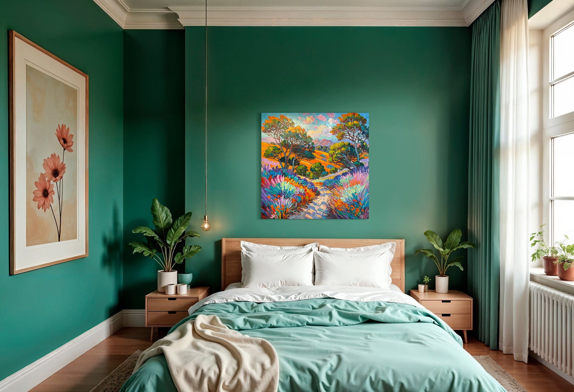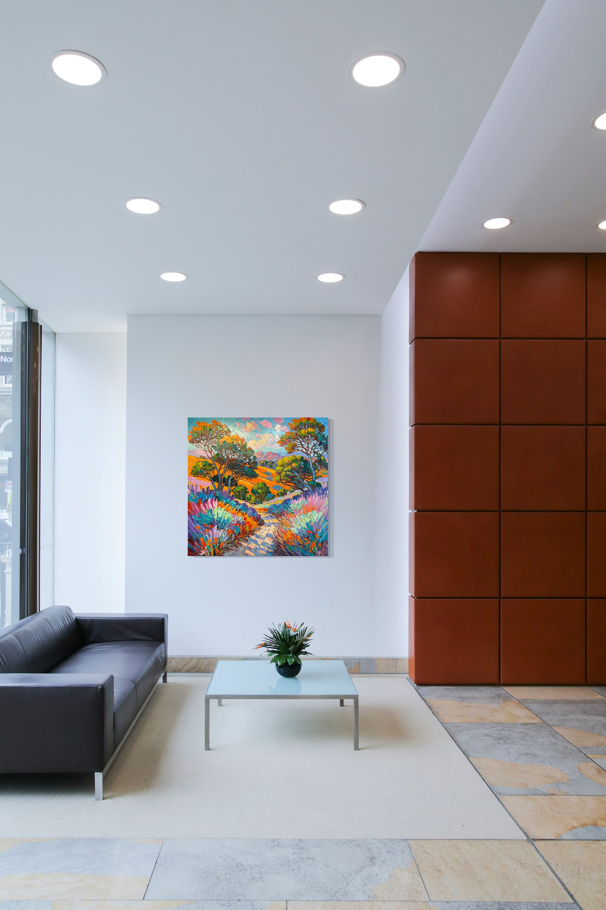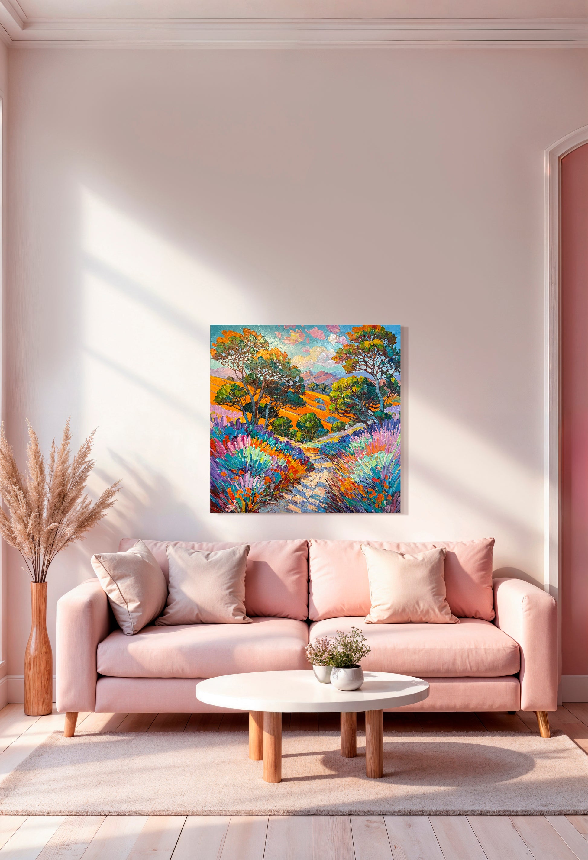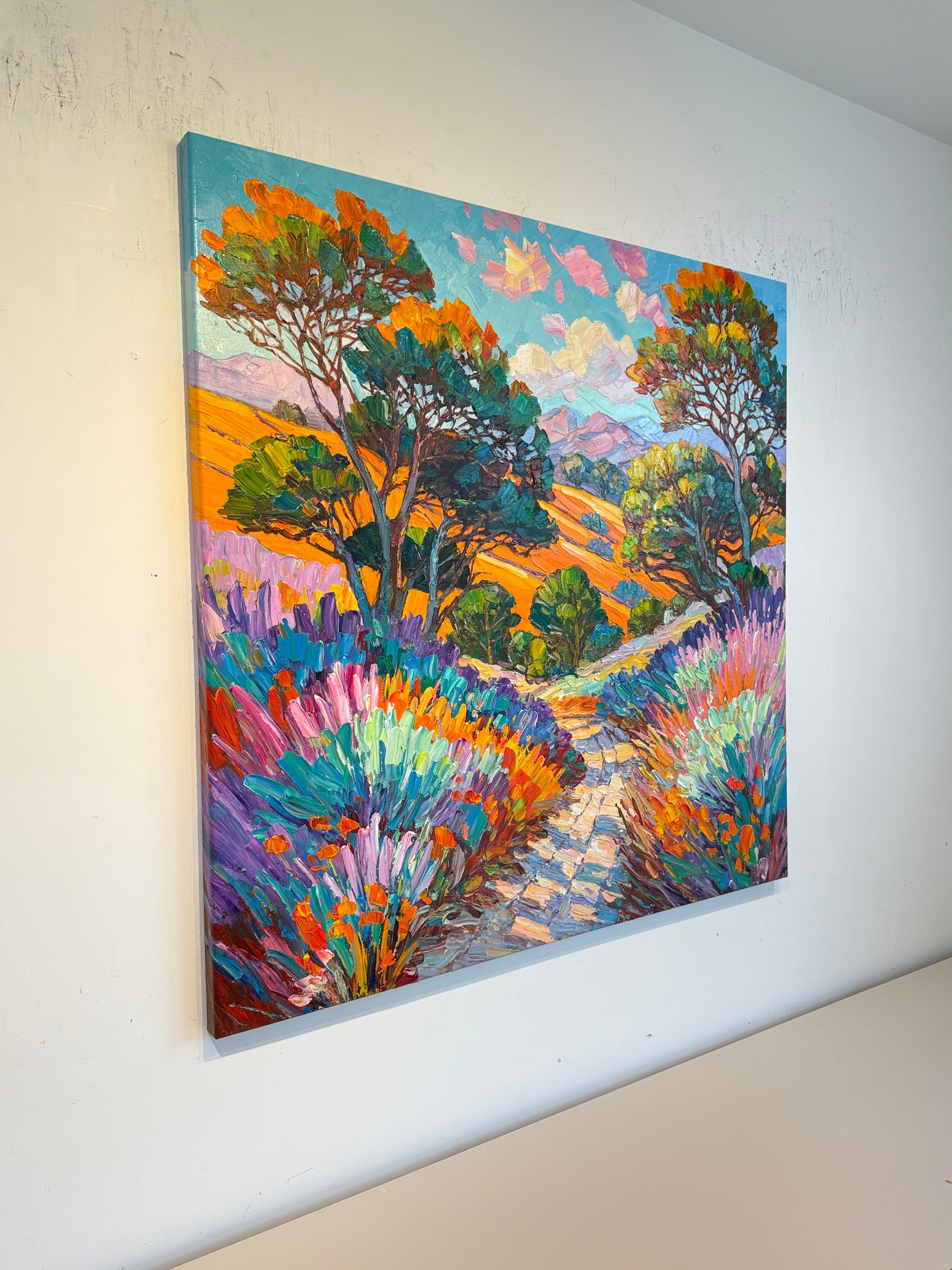 This one-of-a-kind oil painting is signed by Husslein on the back. The painting is ready to hang and includes professional wiring for easy installation. The sides are painted as a continuation of the front and it does not require framing.