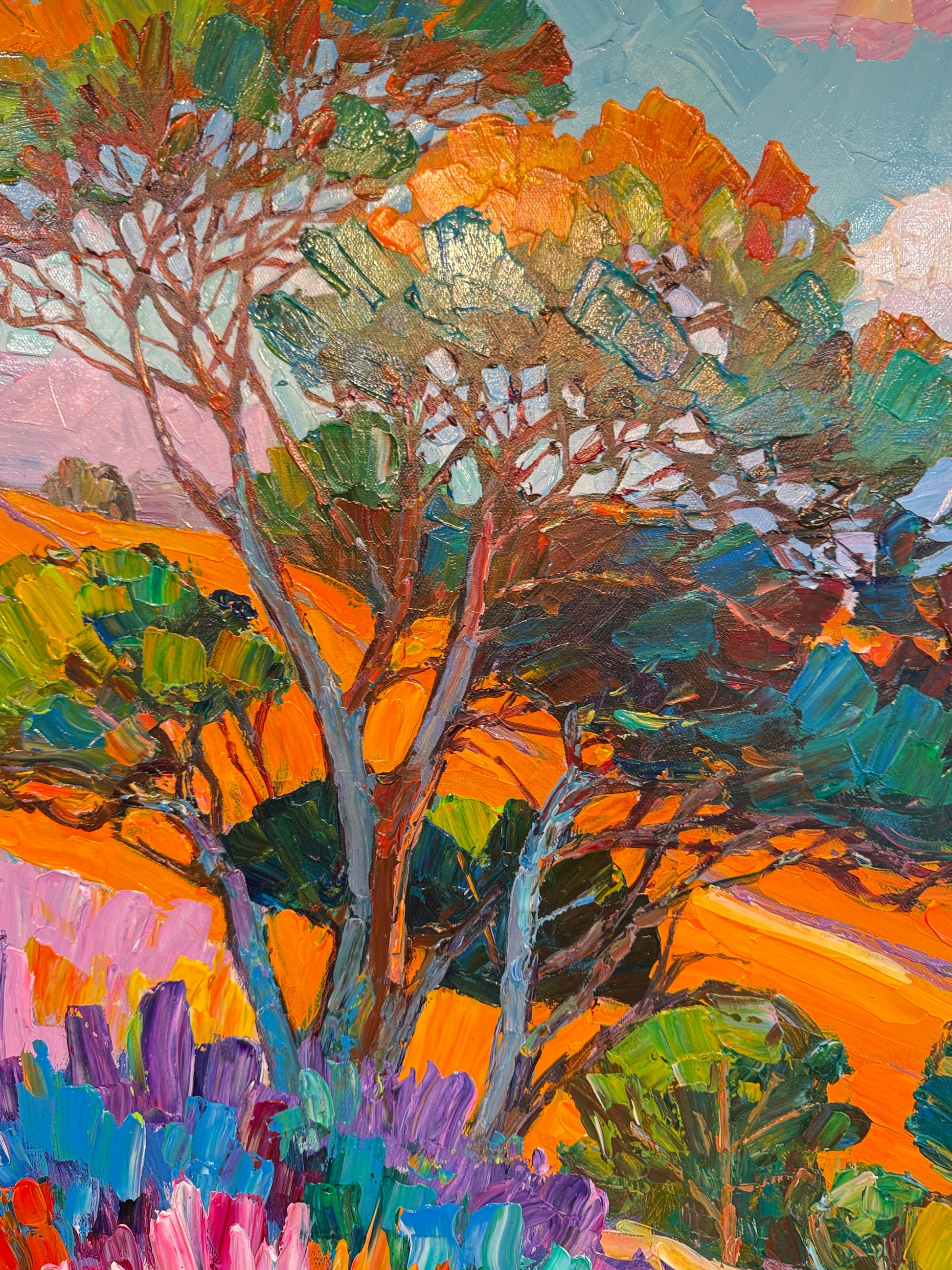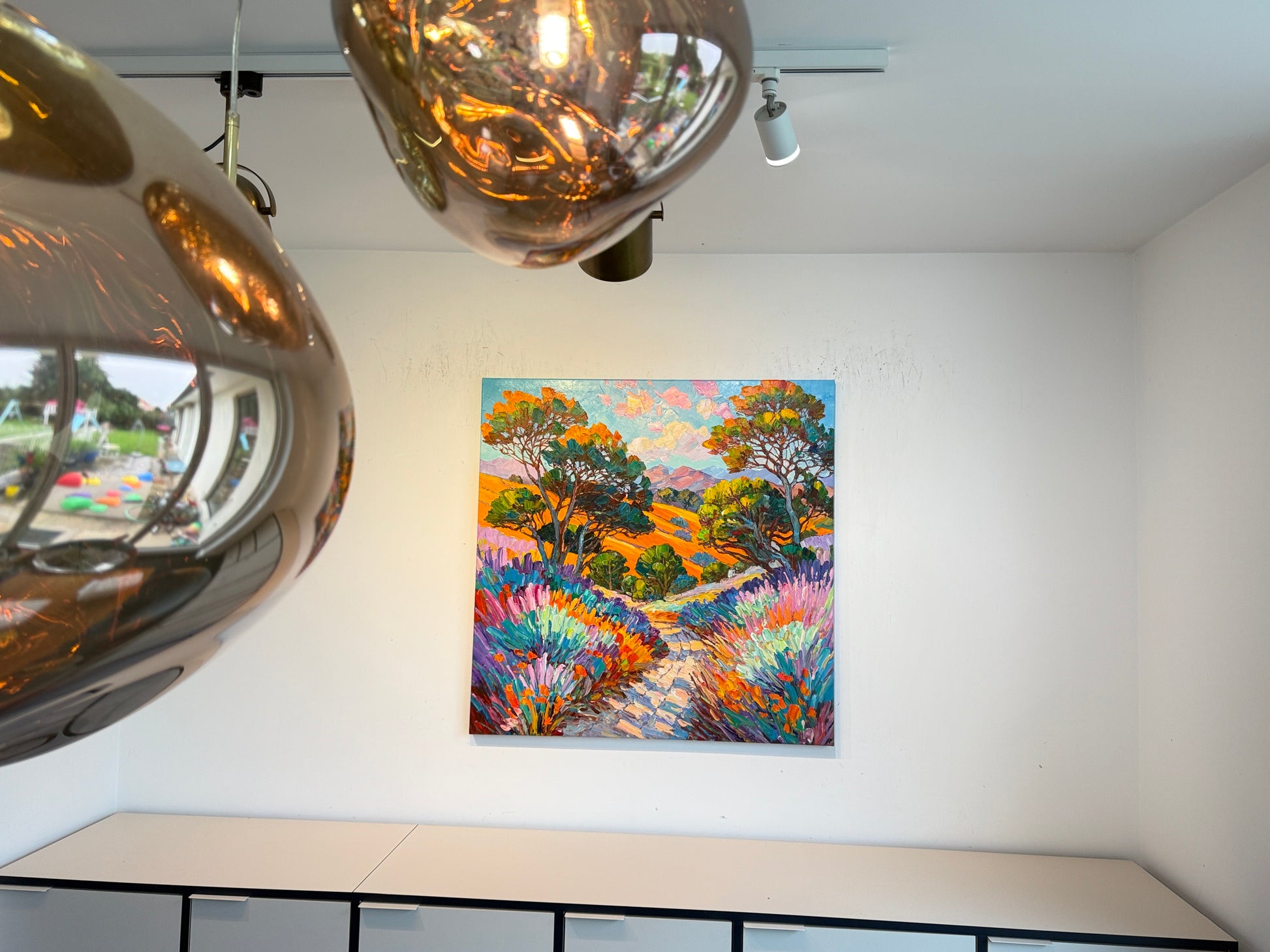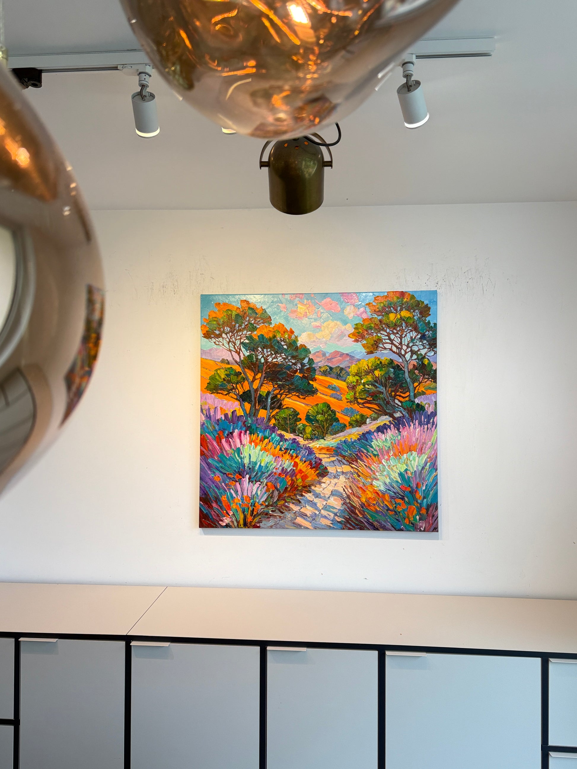 Within her impressionist landscape paintings, Katharina Husslein's experiences abroad truly come to light. These textural and abstract paintings perfectly capture the vibrancy and movement included in a coastal sunset. This series differs from Husslein’s more controlled and smoother still life floral series which derives a more direct inspiration from art history and flower photography.