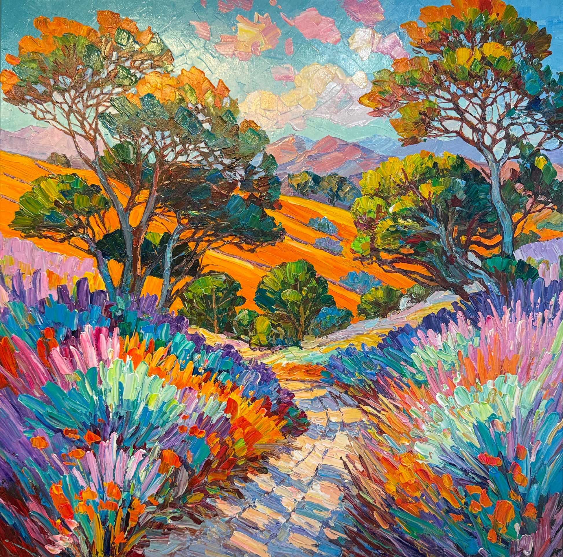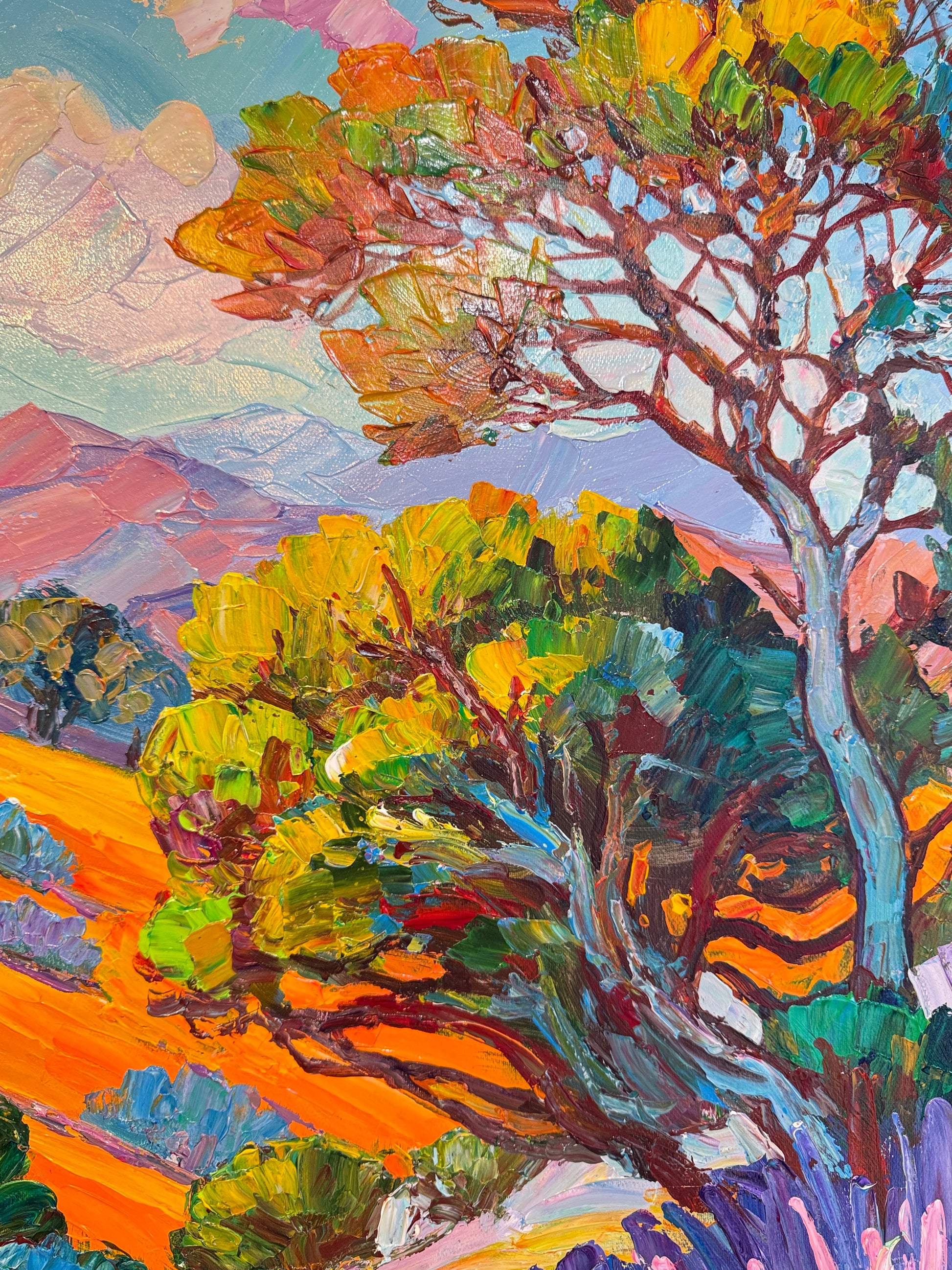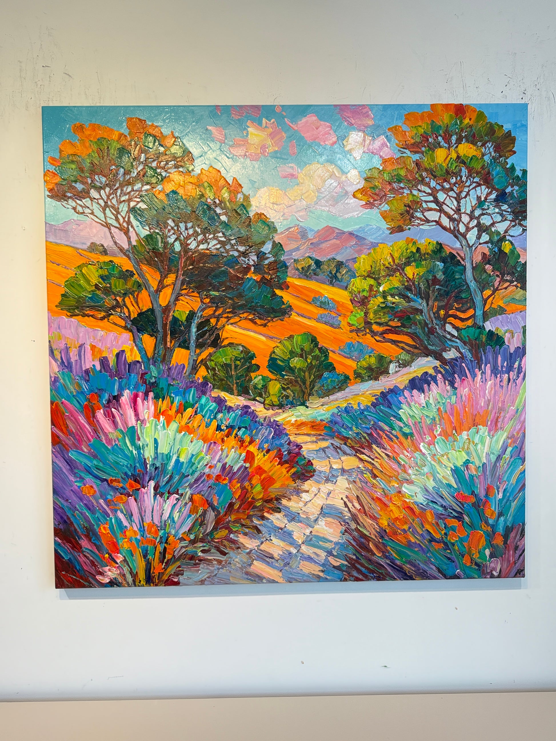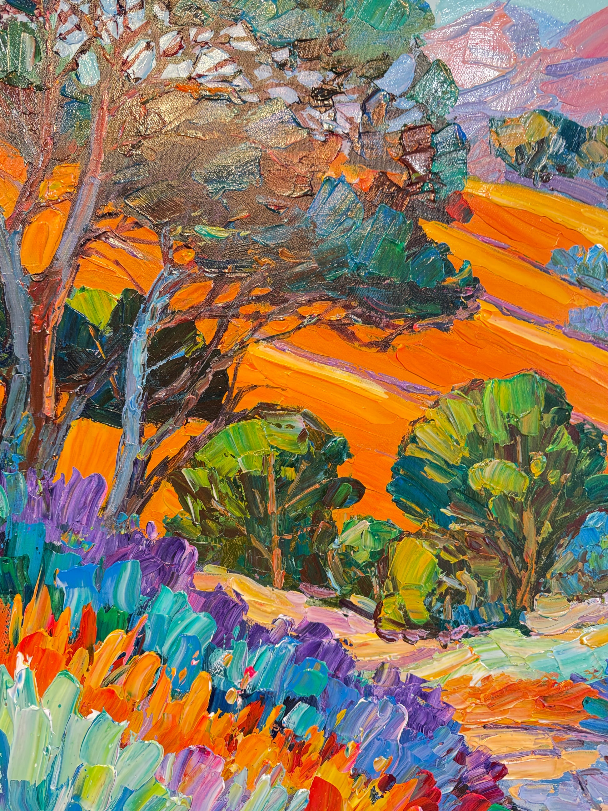 Within her impressionist landscape paintings, Katharina Husslein's experiences abroad truly come to light. These textural and abstract paintings perfectly capture the vibrancy and movement included in a coastal sunset. This series differs from Husslein’s more controlled and smoother still life floral series which derives a more direct inspiration from art history and flower photography.