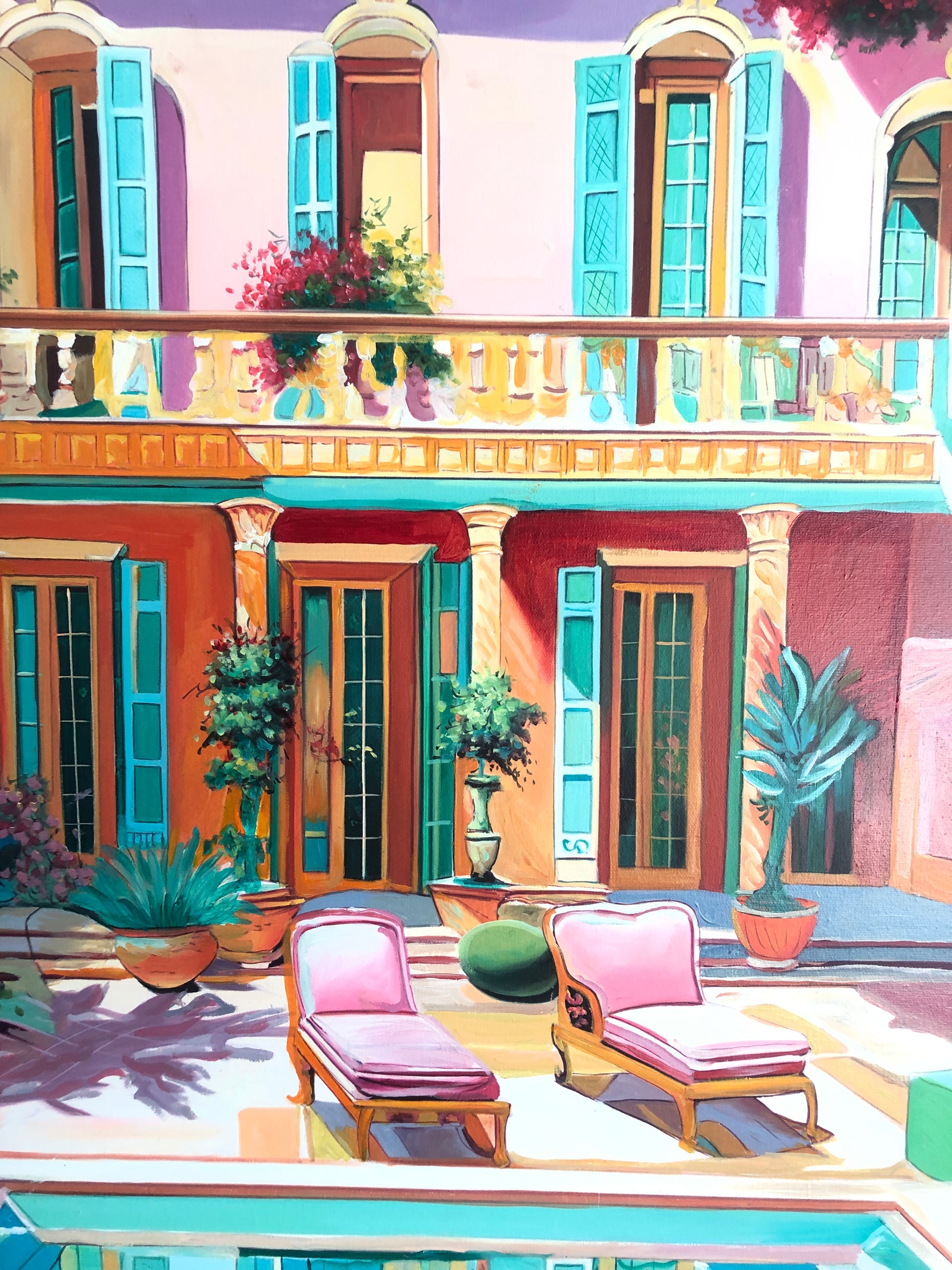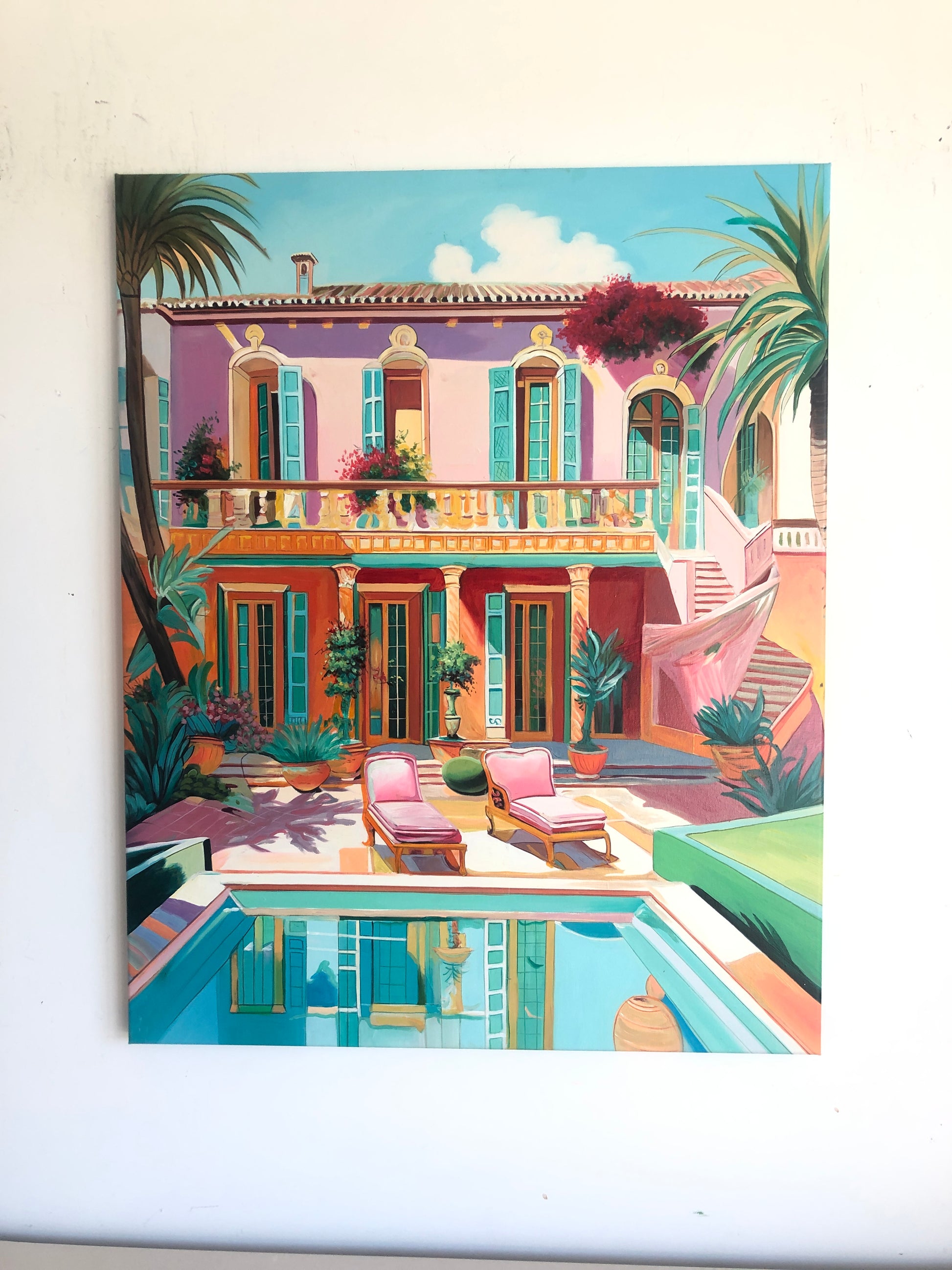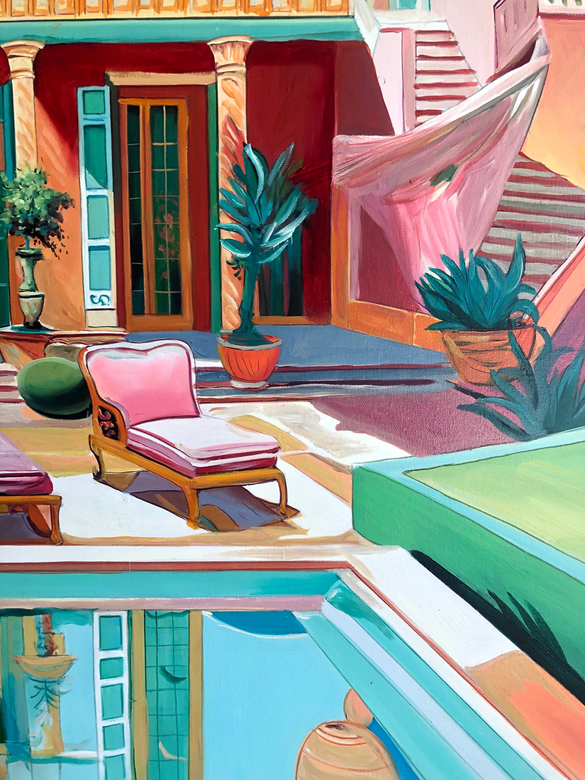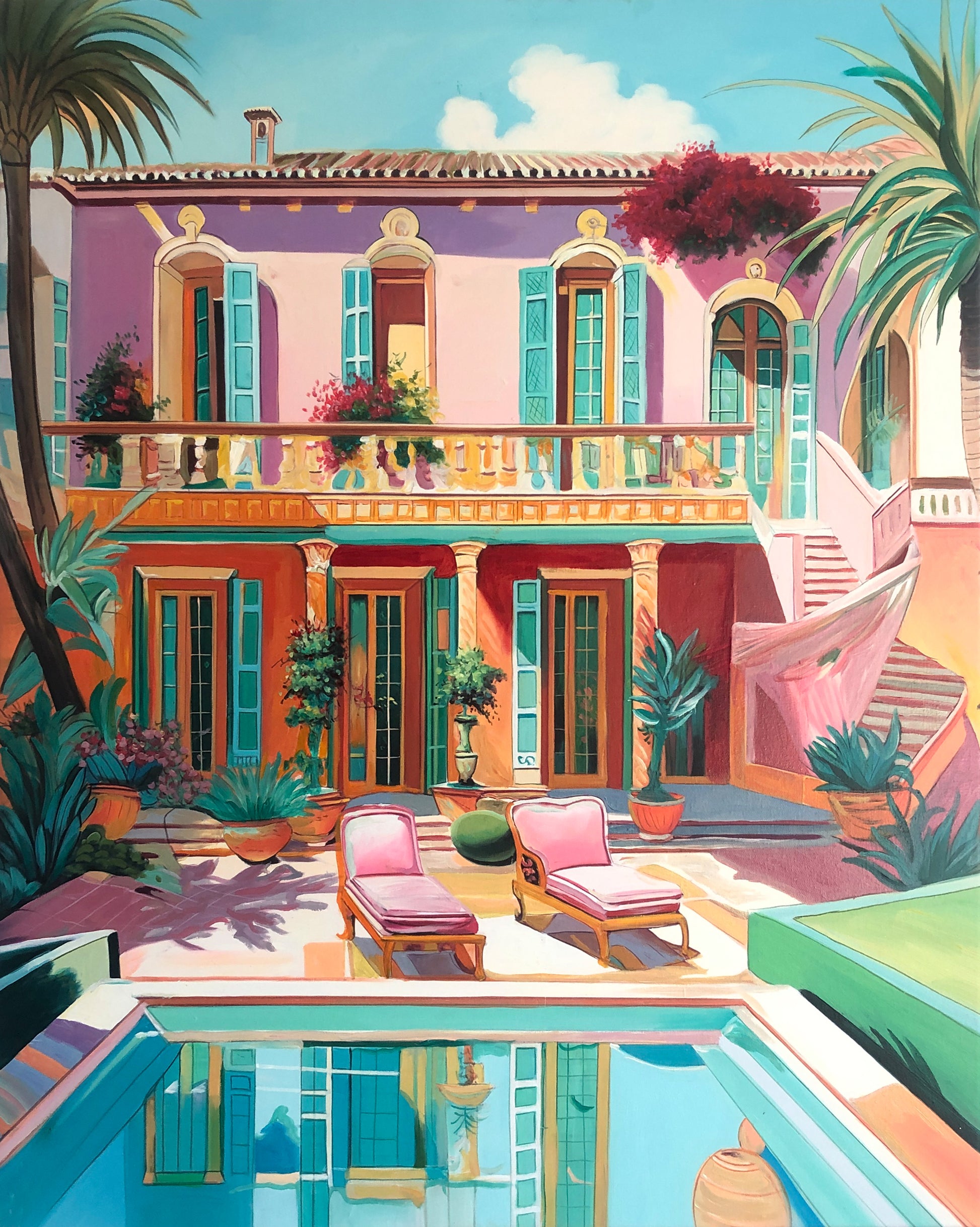 In essence, Lilly Muth's paintings beckon us to venture into a different world—one where architecture, pools, geometry, nature, and a kaleidoscope of colors converge to create a captivating dreamscape that transcends the ordinary and invites us to explore the boundless realms of artistic fantasy.