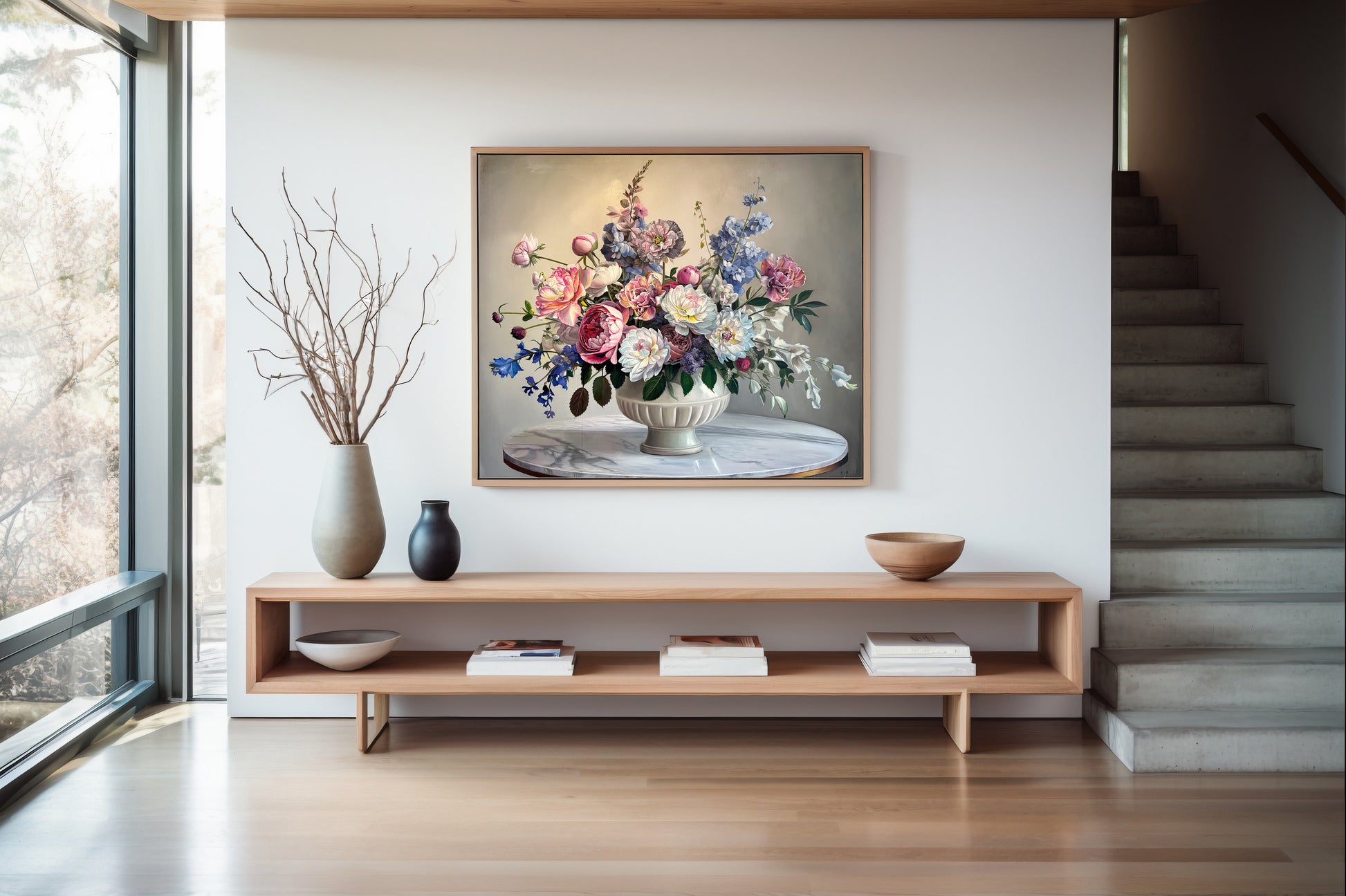 This is a beautiful oil painting of an array of flowers in a vase. Contemporary painting full of details and colors, vibrant roses , tulips, peonies and an arrangement of other flowers. Reminding us of old master paintings, this is a brand new painting full elegance and timeless elegance.