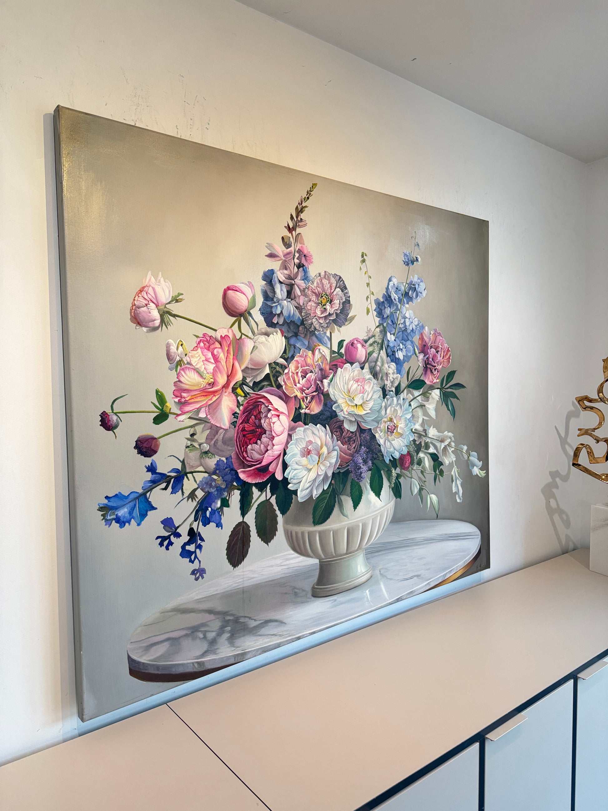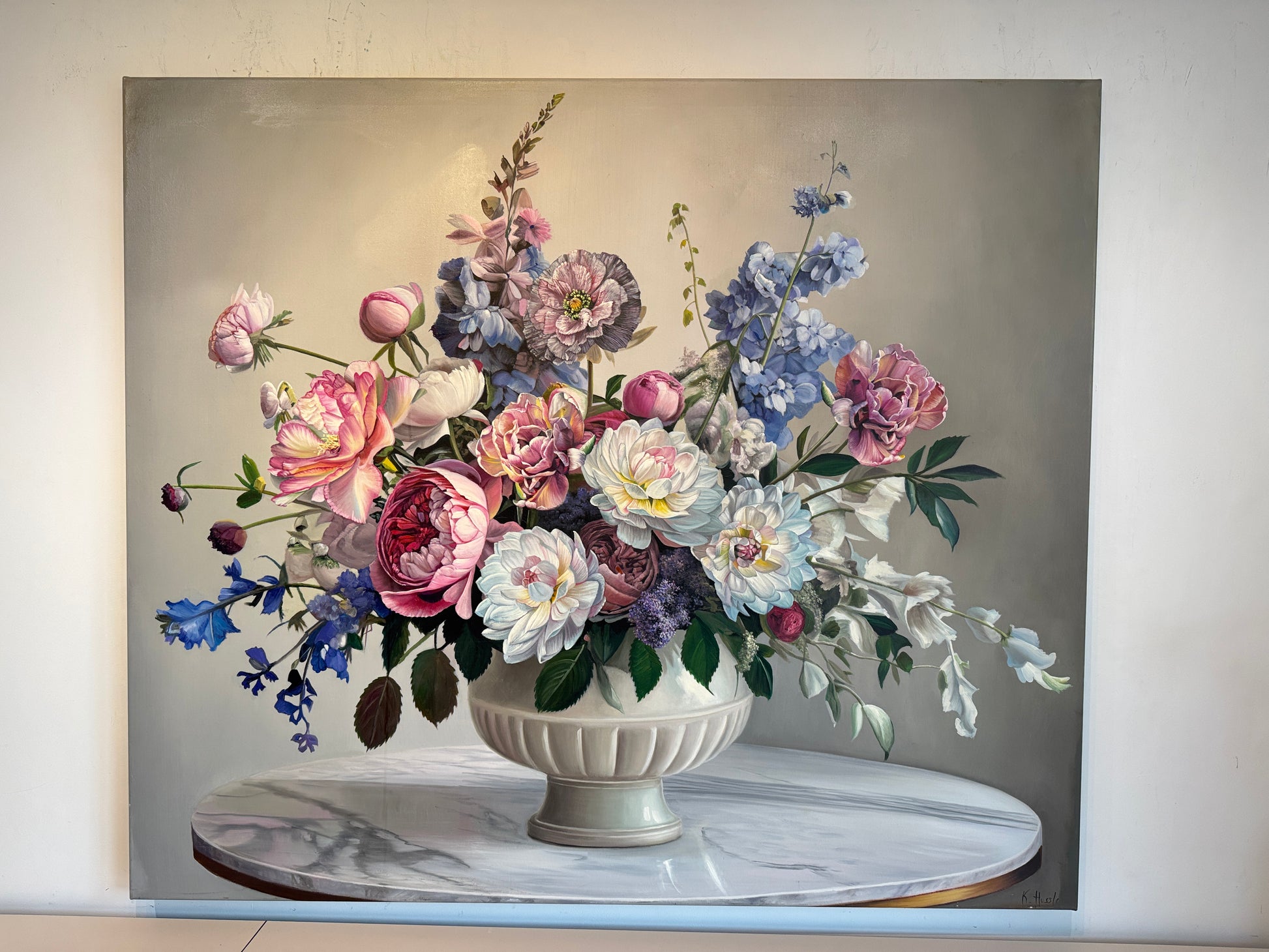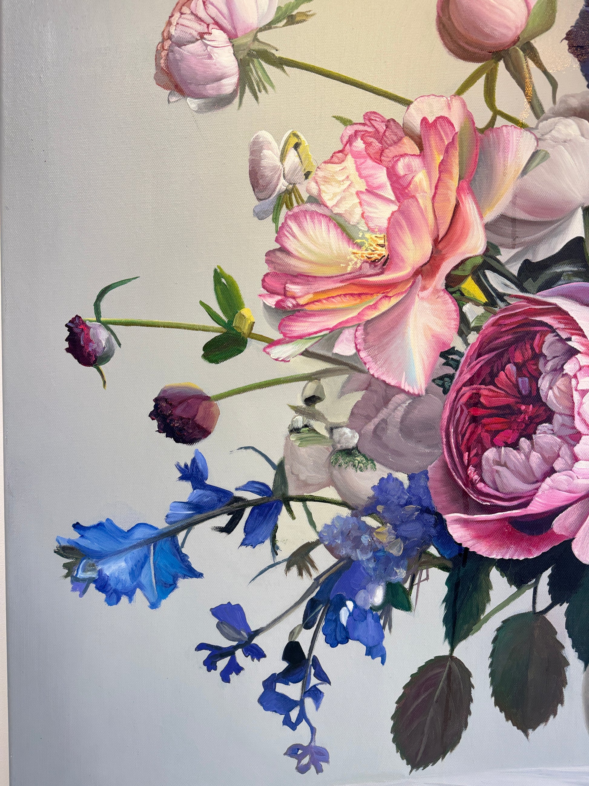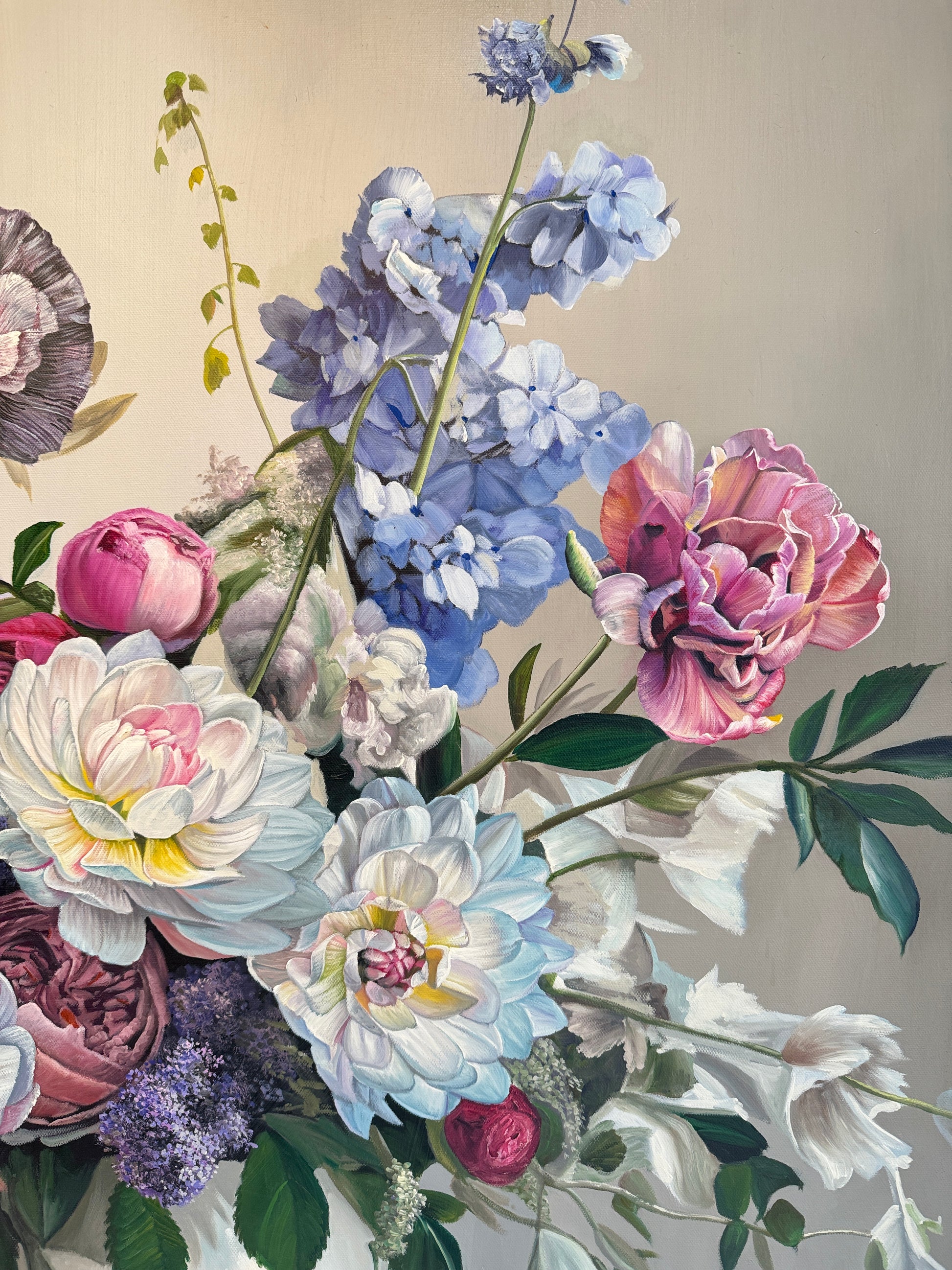 Husslein's artistic philosophy marries a reverence for classical masterpieces with the immersive allure of contemporary still life and botany. Her signature style is characterized by meticulous hyperrealism, particularly evident in her still-life floral compositions. Central to her creations are the visual and tactile attributes of flowers, intertwined with their symbolism evoking themes of love, femininity, and the natural world. These elements coalesce to fashion Husslein's vivacious and captivating compositions.