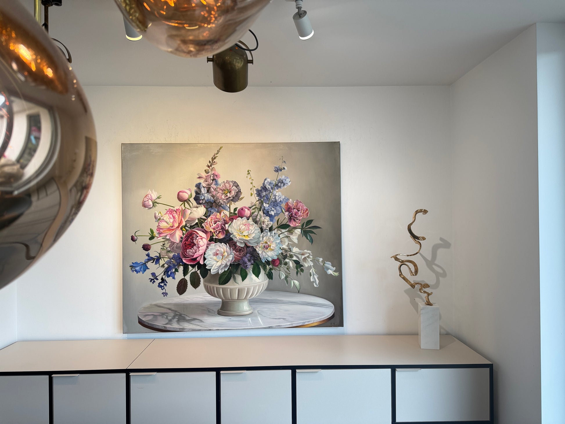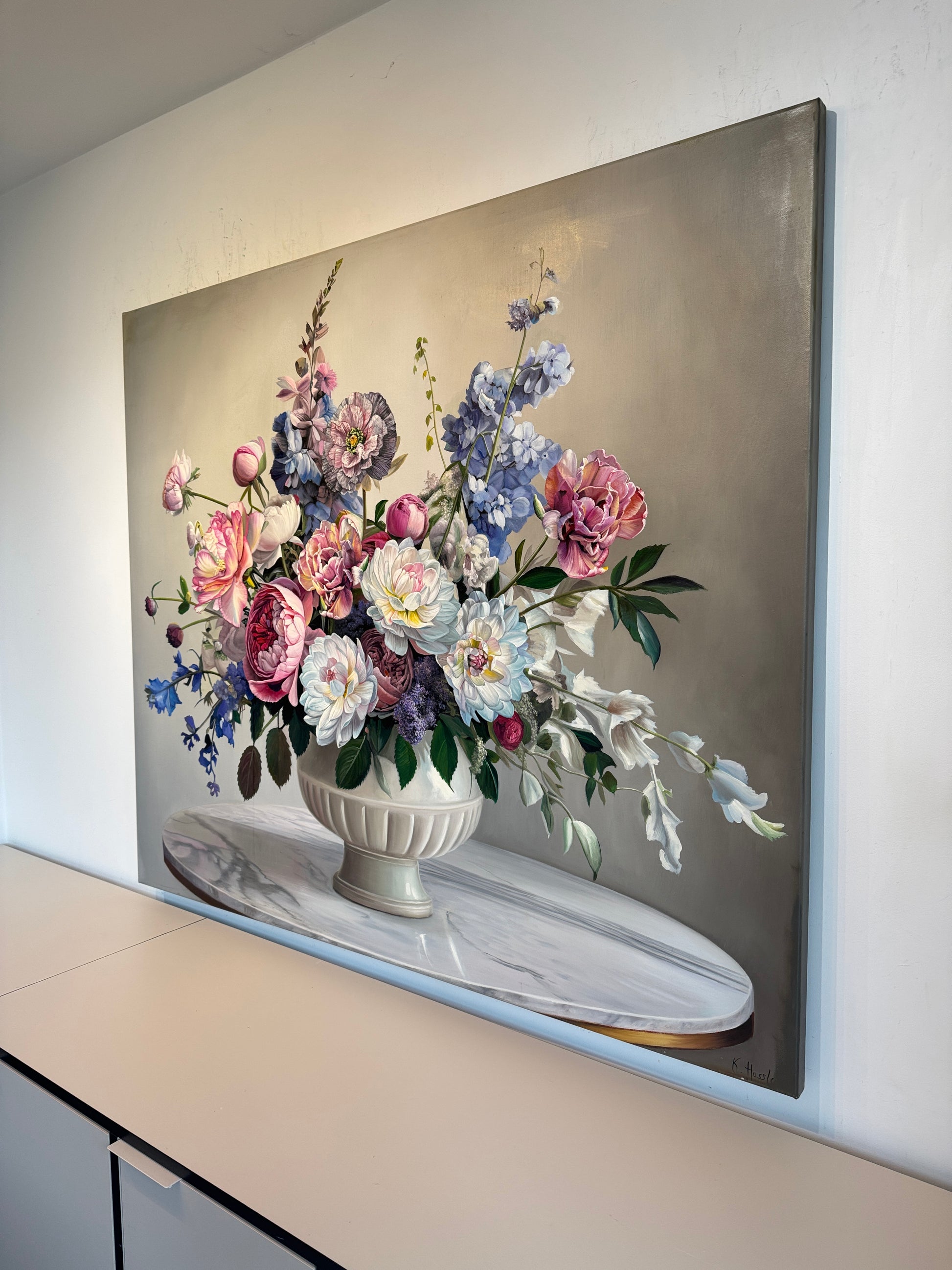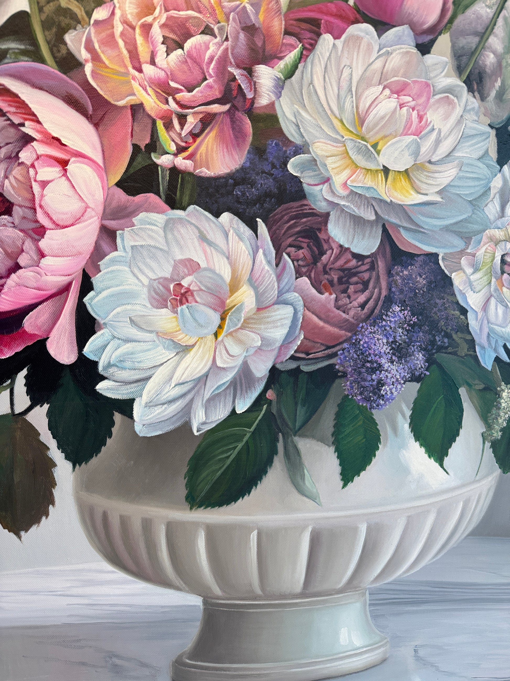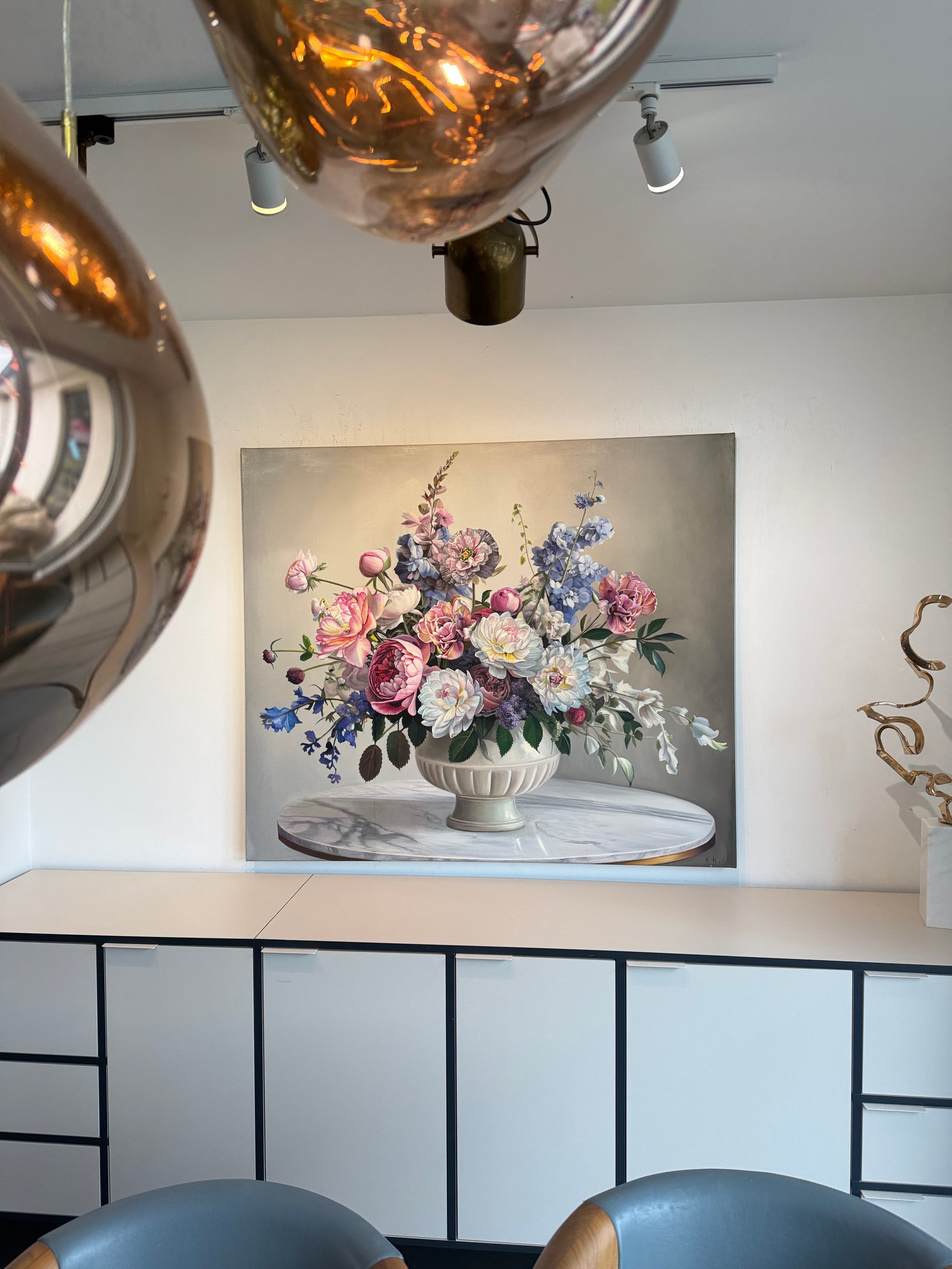 Husslein's artistic philosophy marries a reverence for classical masterpieces with the immersive allure of contemporary still life and botany. Her signature style is characterized by meticulous hyperrealism, particularly evident in her still-life floral compositions. Central to her creations are the visual and tactile attributes of flowers, intertwined with their symbolism evoking themes of love, femininity, and the natural world. These elements coalesce to fashion Husslein's vivacious and captivating compositions.