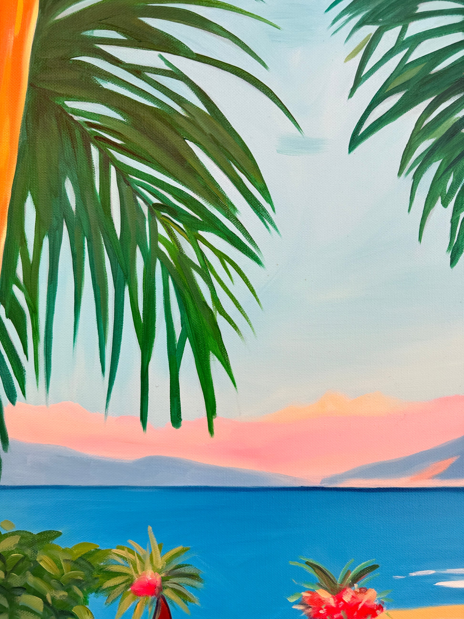 With bold colours, soft light, and breezy compositions, the paintings capture the laid-back rhythm of holiday life. Added thread details, carefully stitched into the canvas, highlight small elements and bring a subtle, tactile layer to the work — adding intimacy and depth without overpowering the calm, open feel of each piece.