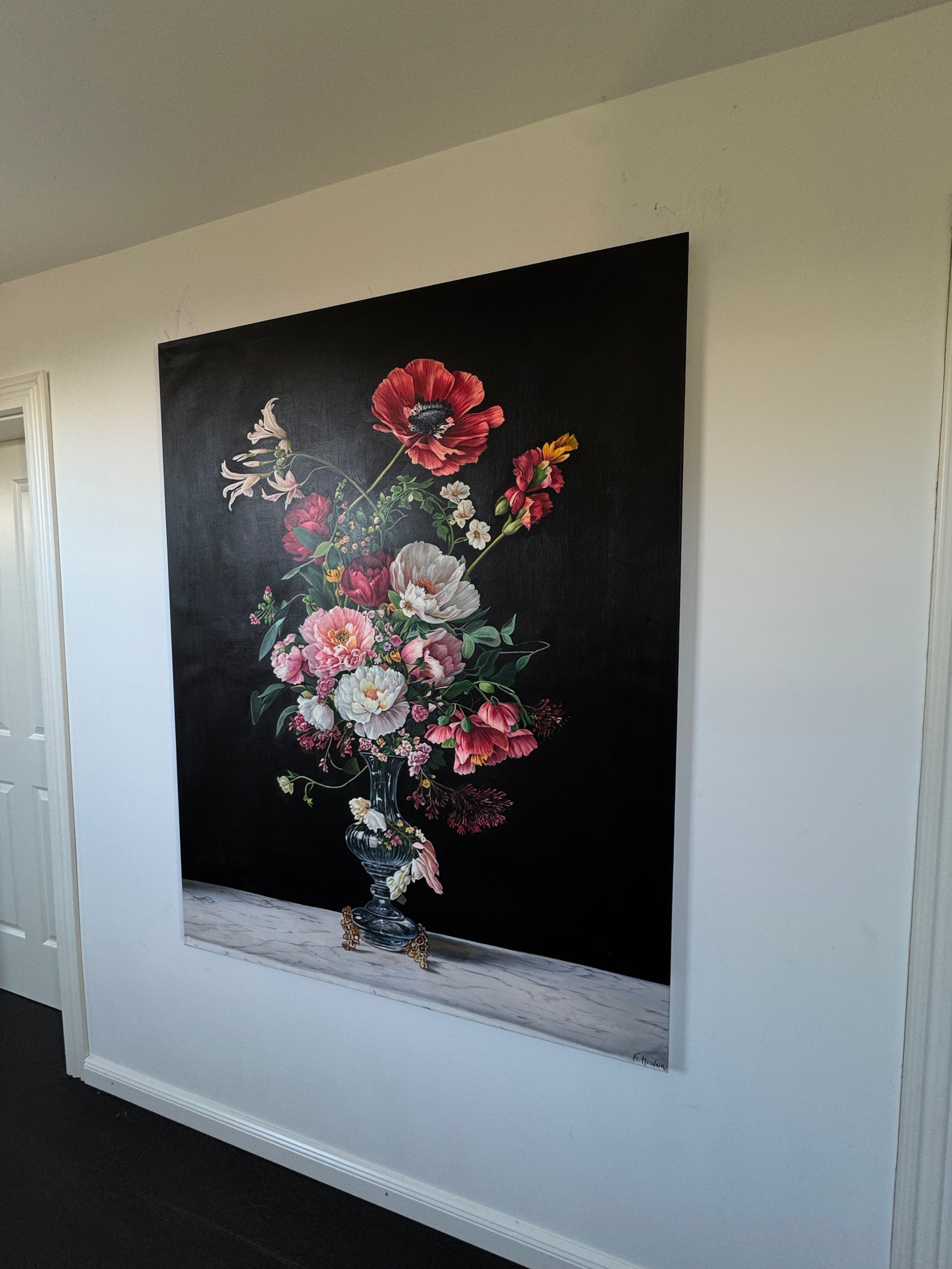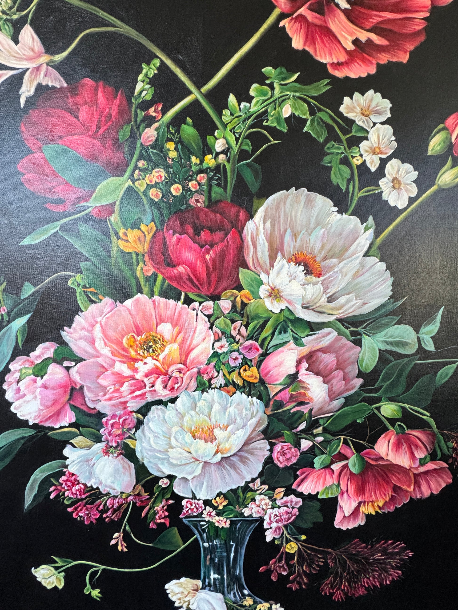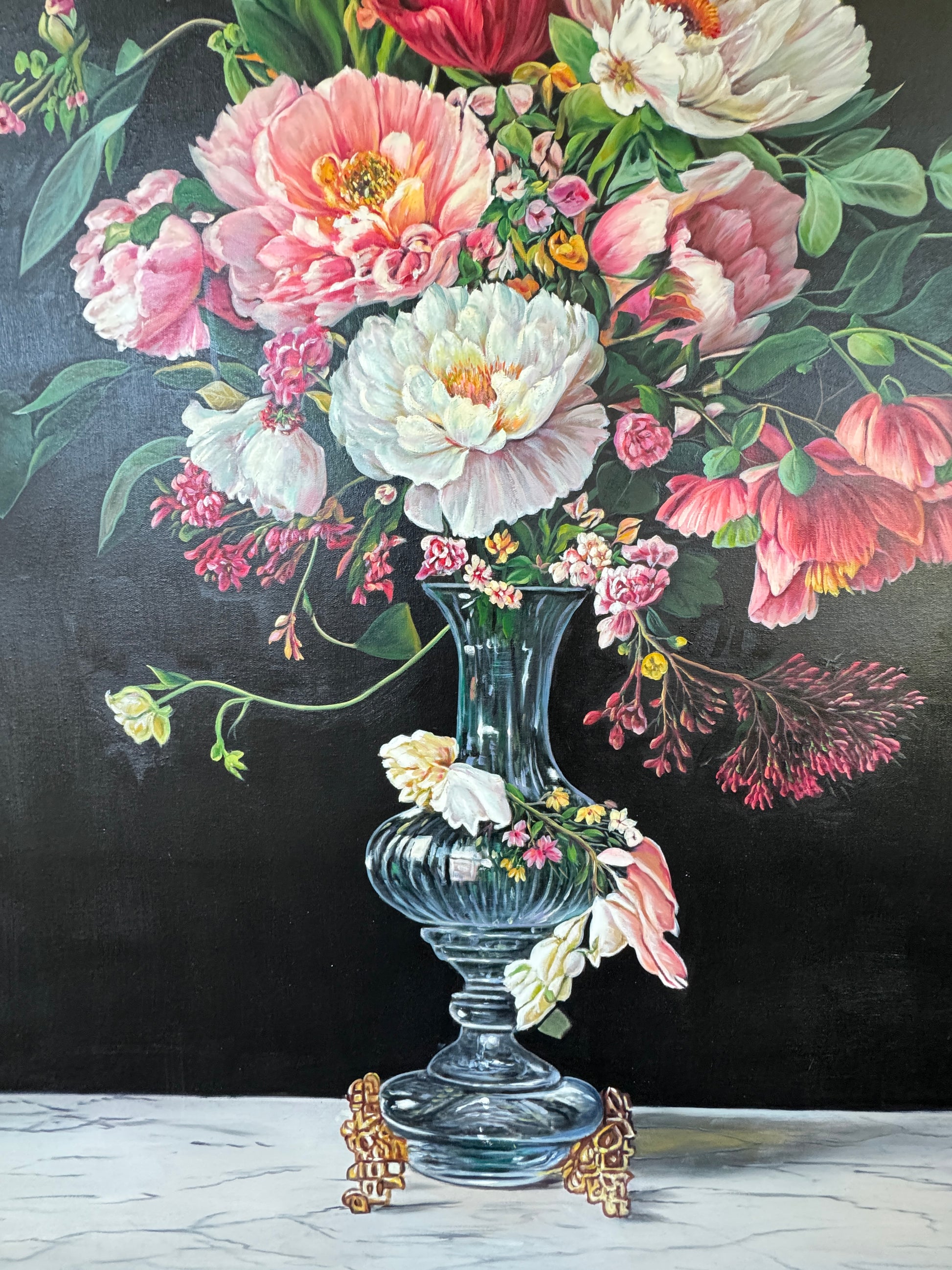 Husslein's artistic philosophy marries a reverence for classical masterpieces with the immersive allure of contemporary still life and botany. Her signature style is characterized by meticulous hyperrealism, particularly evident in her still-life floral compositions. Central to her creations are the visual and tactile attributes of flowers, intertwined with their symbolism evoking themes of love, femininity, and the natural world. These elements coalesce to fashion Husslein's vivacious and captivating compositions.
