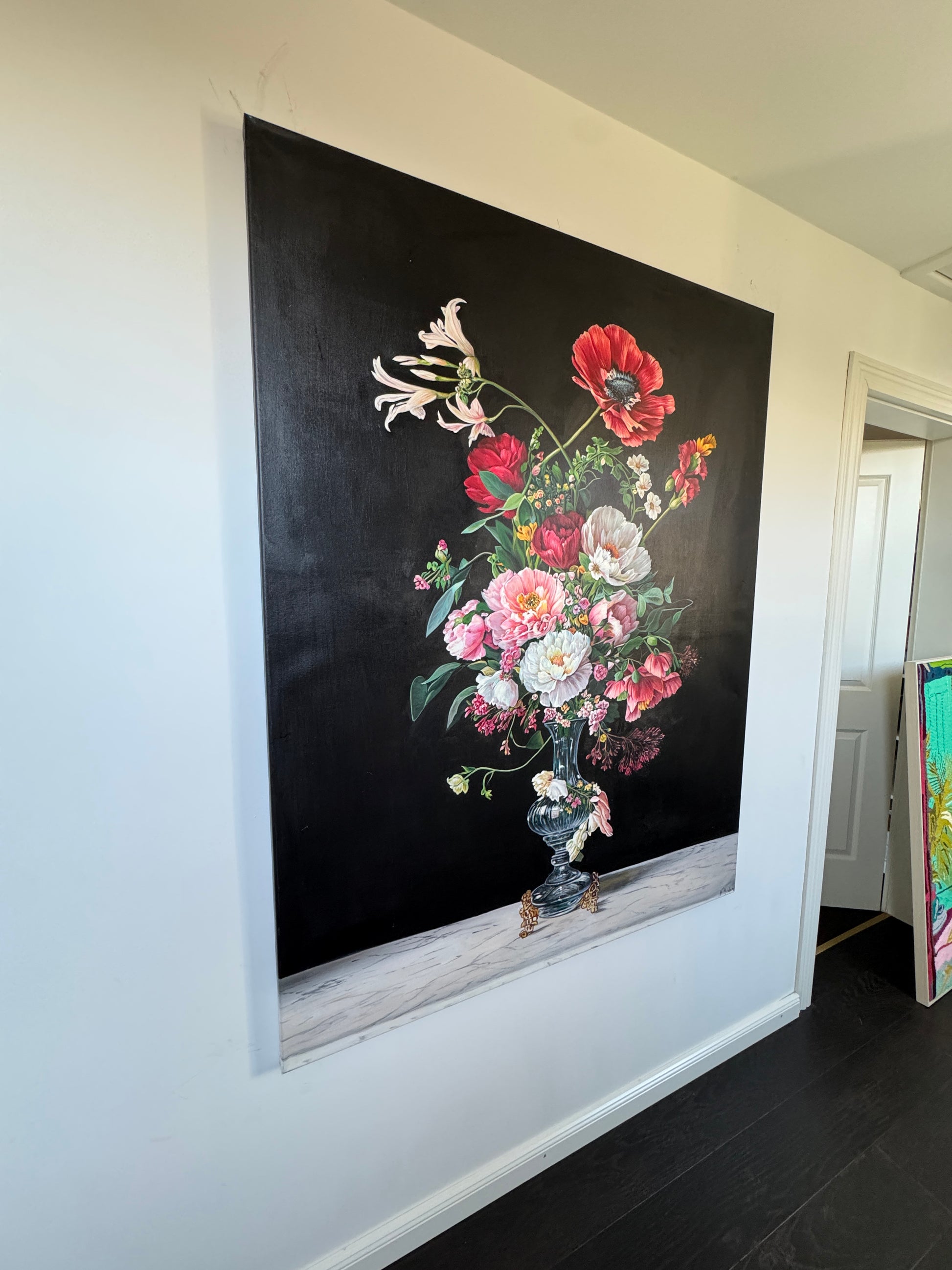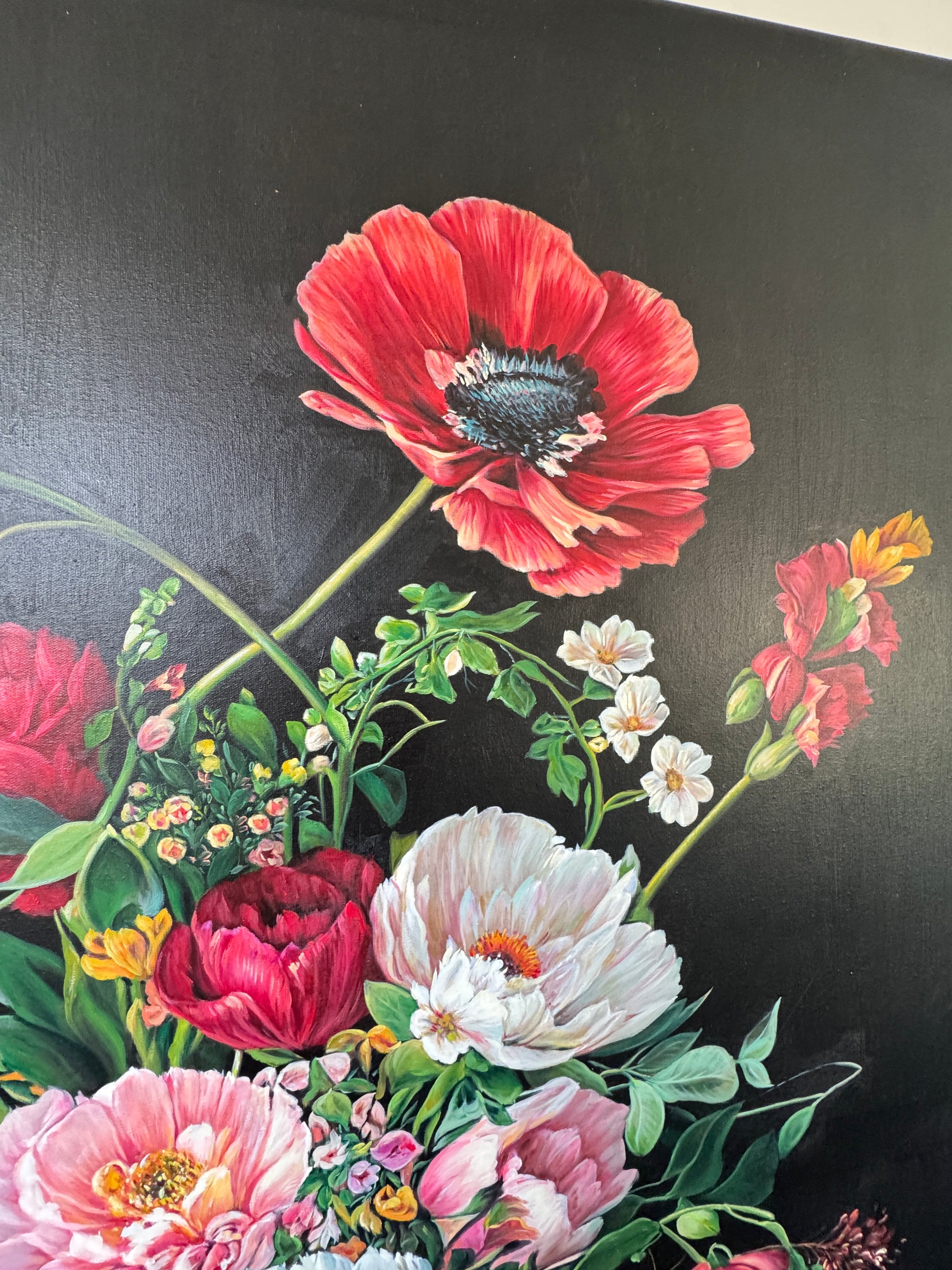 This is a beautiful oil painting of an array of flowers in a vase. Contemporary painting full of details and colors, vibrant roses , tulips, peonies and an arrangement of other flowers. Reminding us of old master paintings, this is a brand new painting full elegance and timeless elegance.