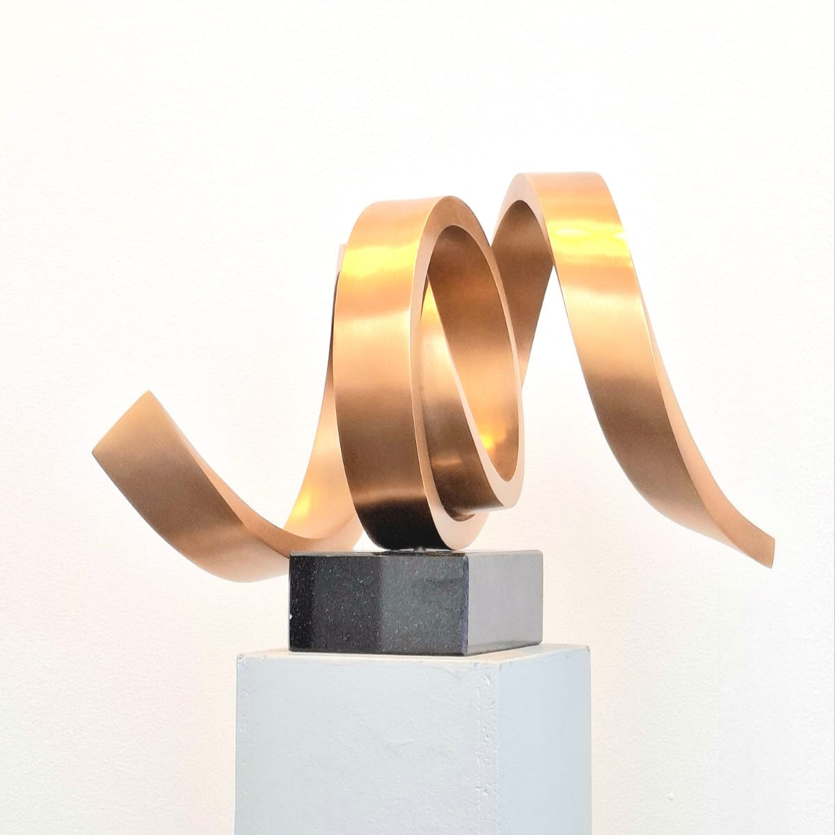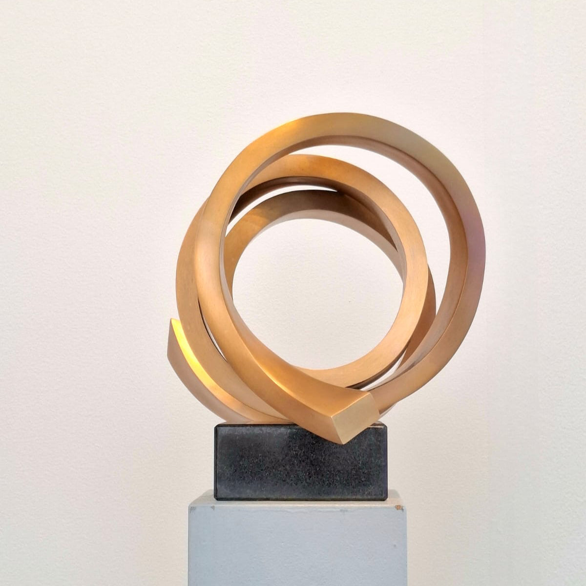 This elegant original cast bronze sculpture by German artist Kuno Vollet brings energy into any art collection. It is cast from three different length lines of pure bronze polished to a glowing gold.