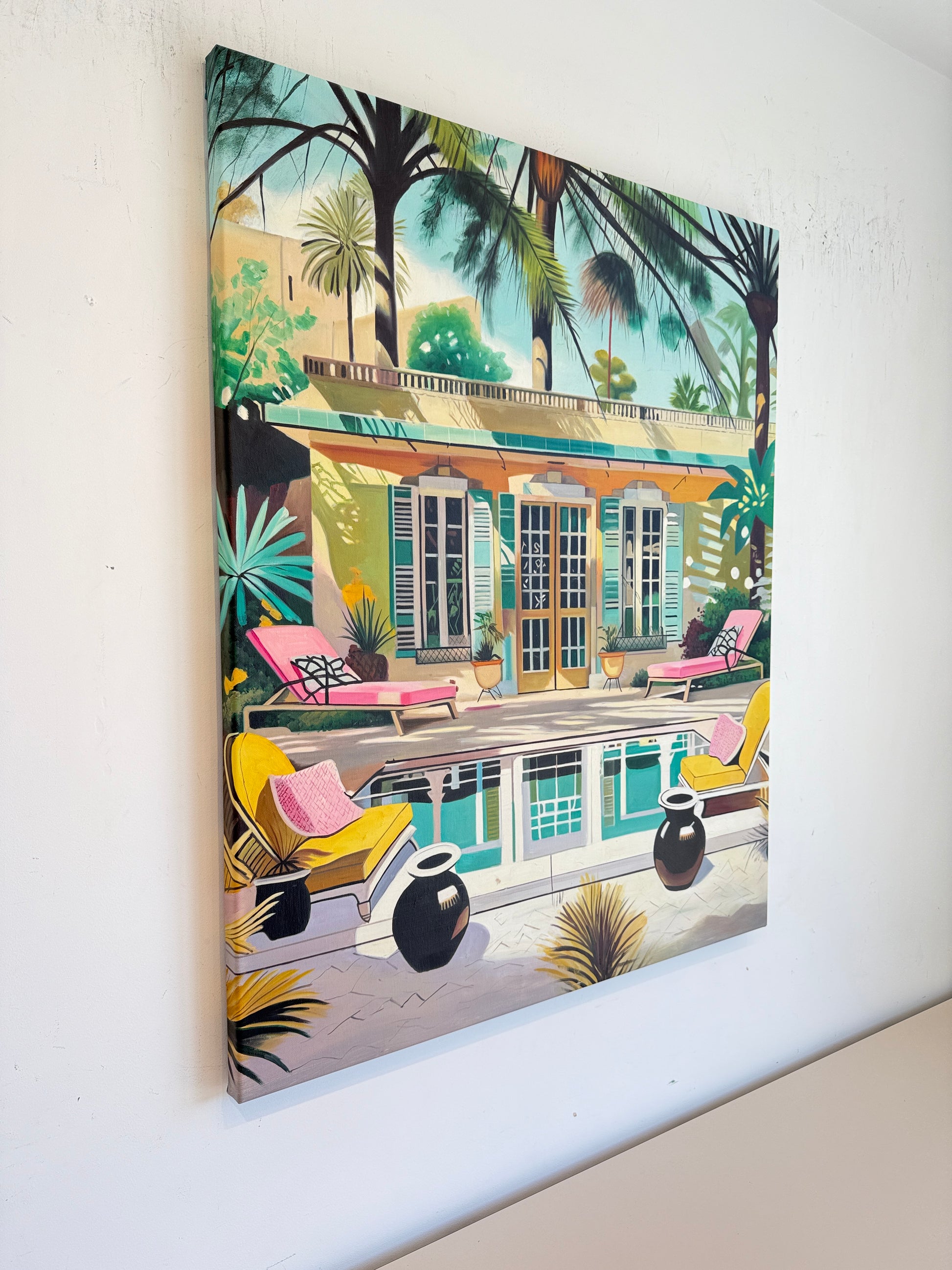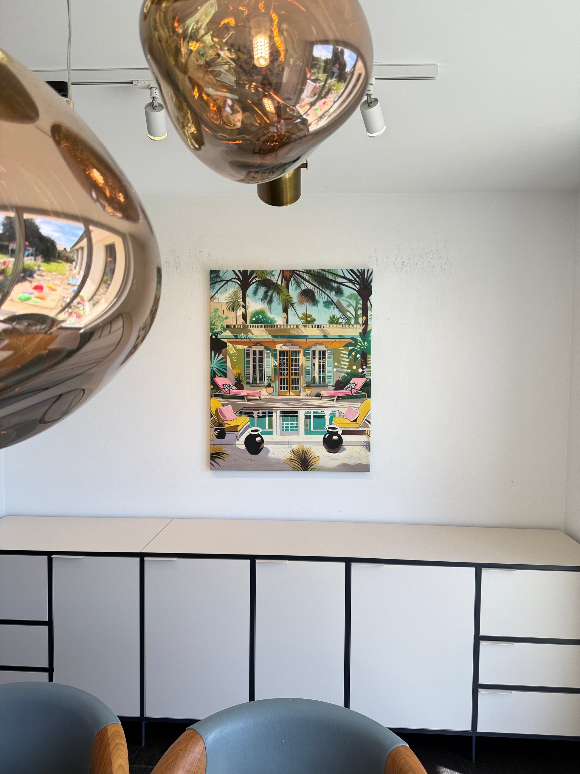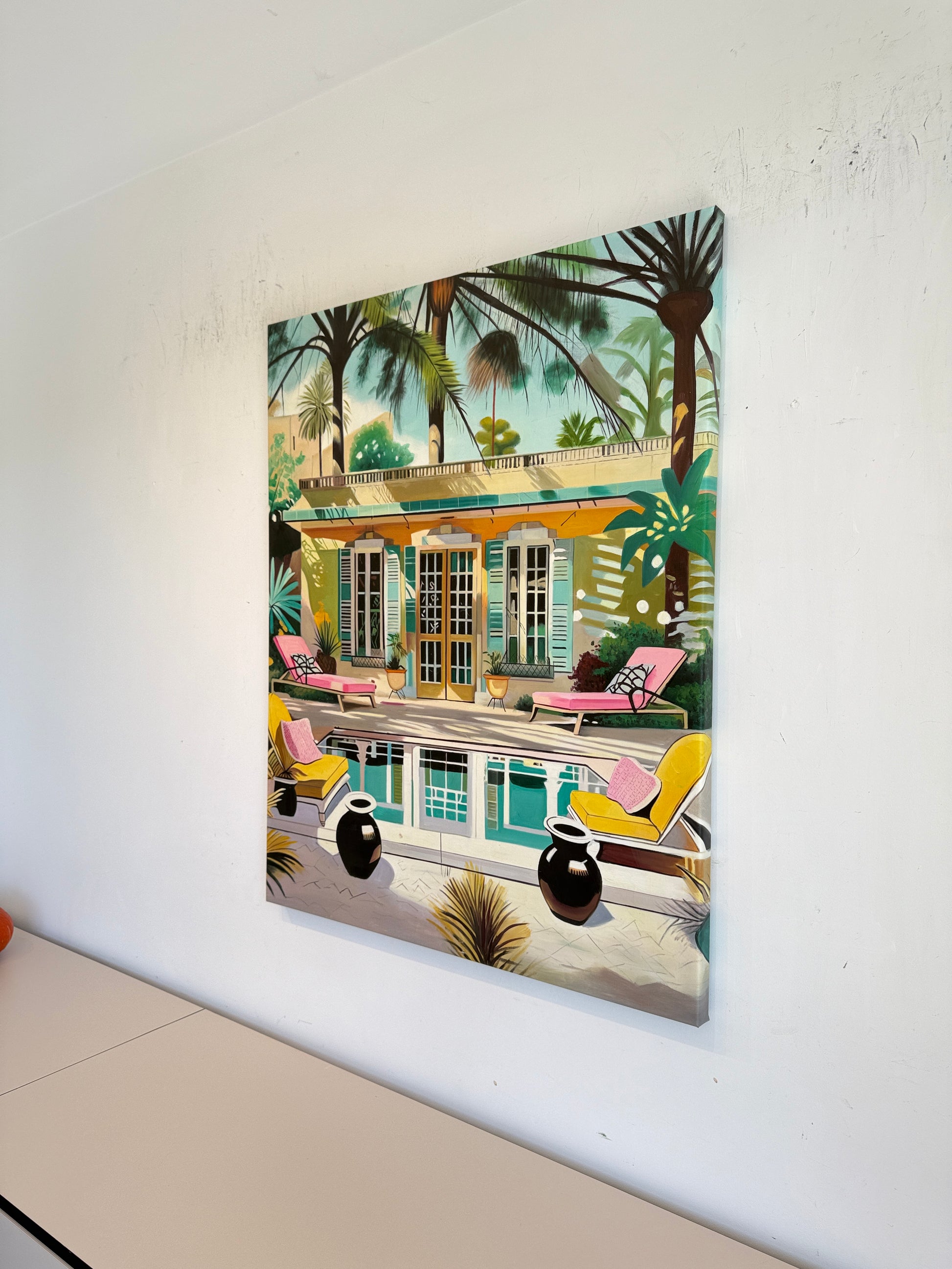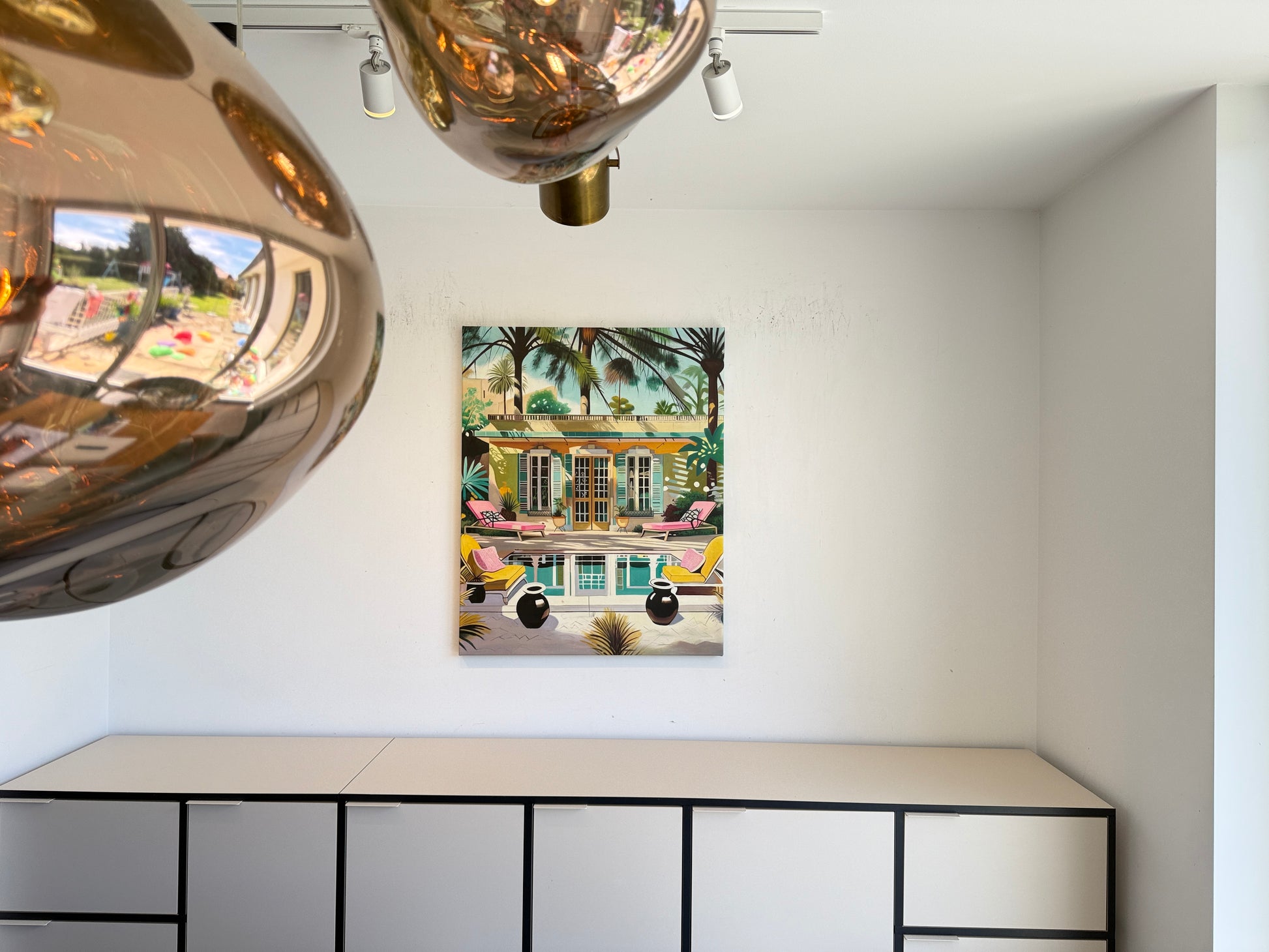 In essence, Lilly Muth's paintings beckon us to venture into a different world—one where architecture, pools, geometry, nature, and a kaleidoscope of colors converge to create a captivating dreamscape that transcends the ordinary and invites us to explore the boundless realms of artistic fantasy.