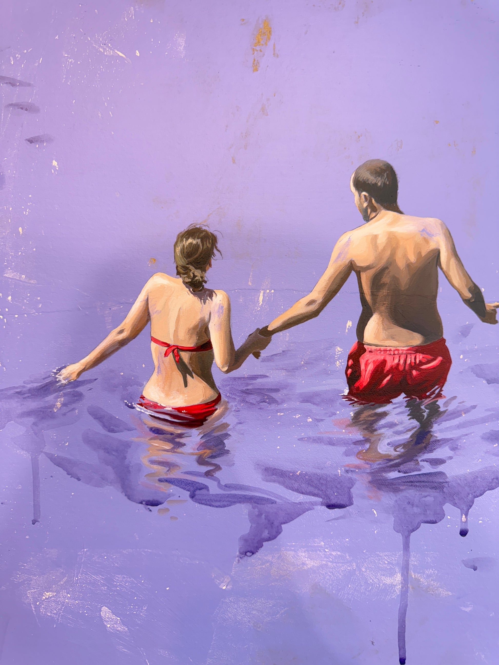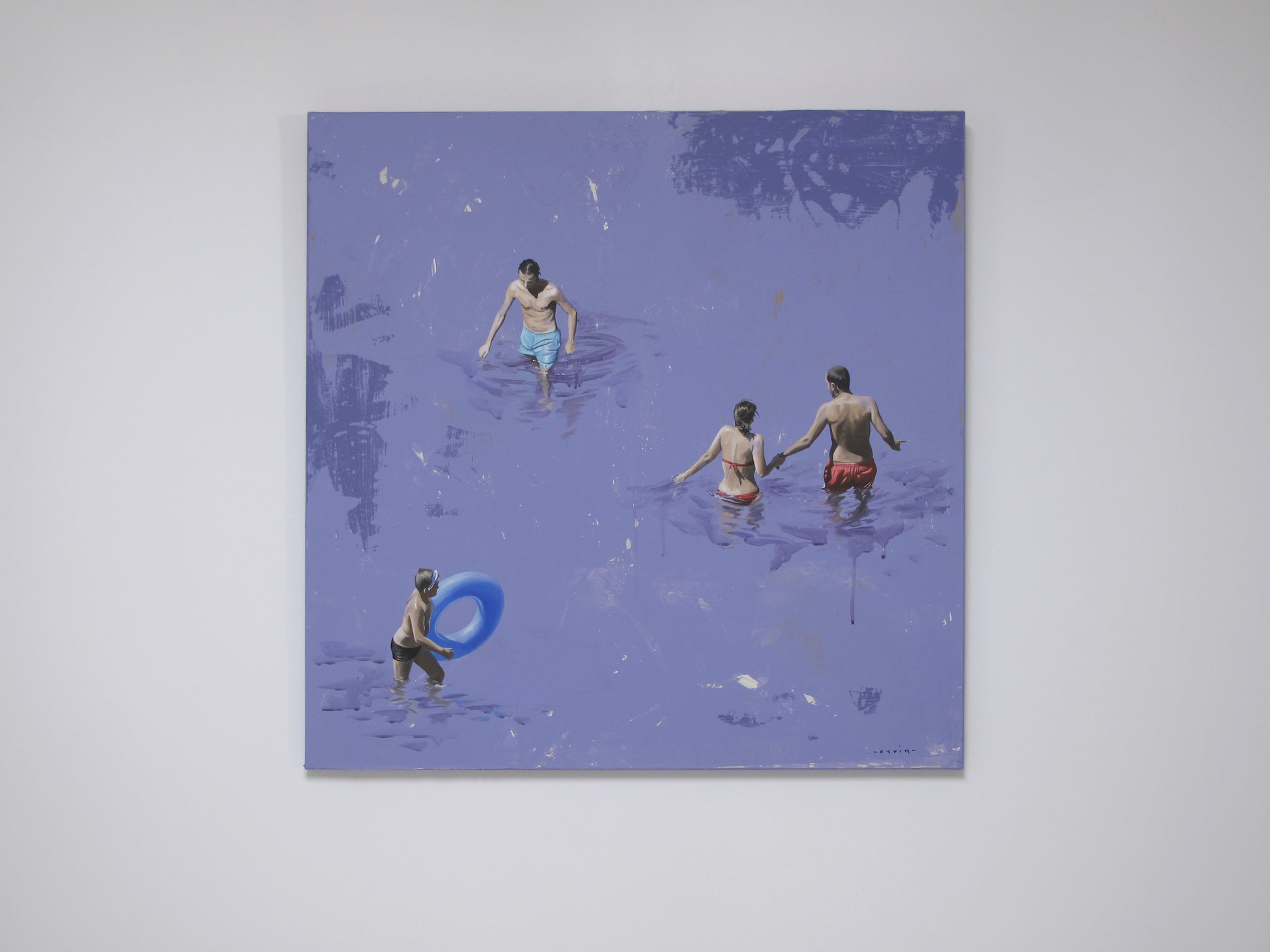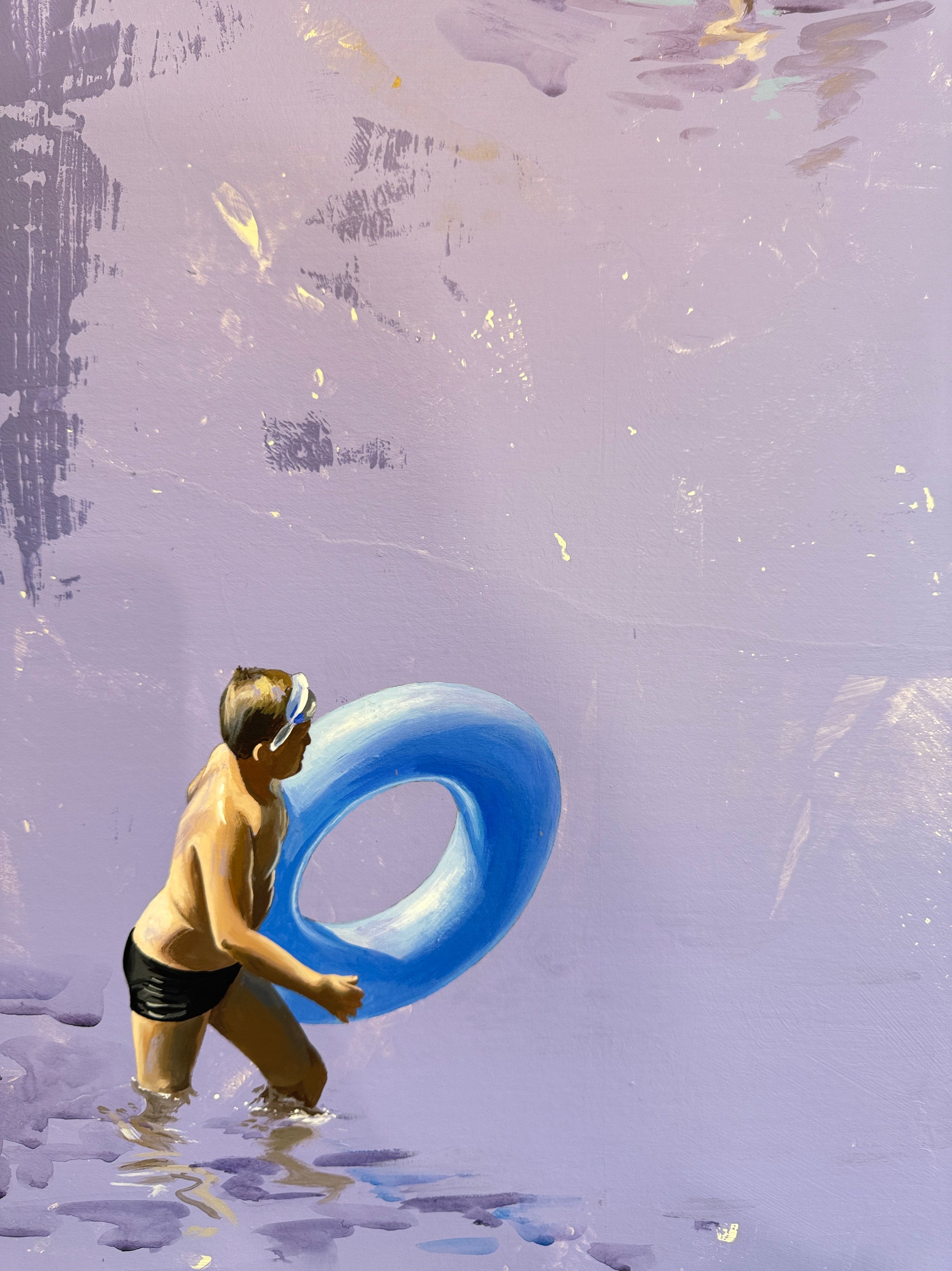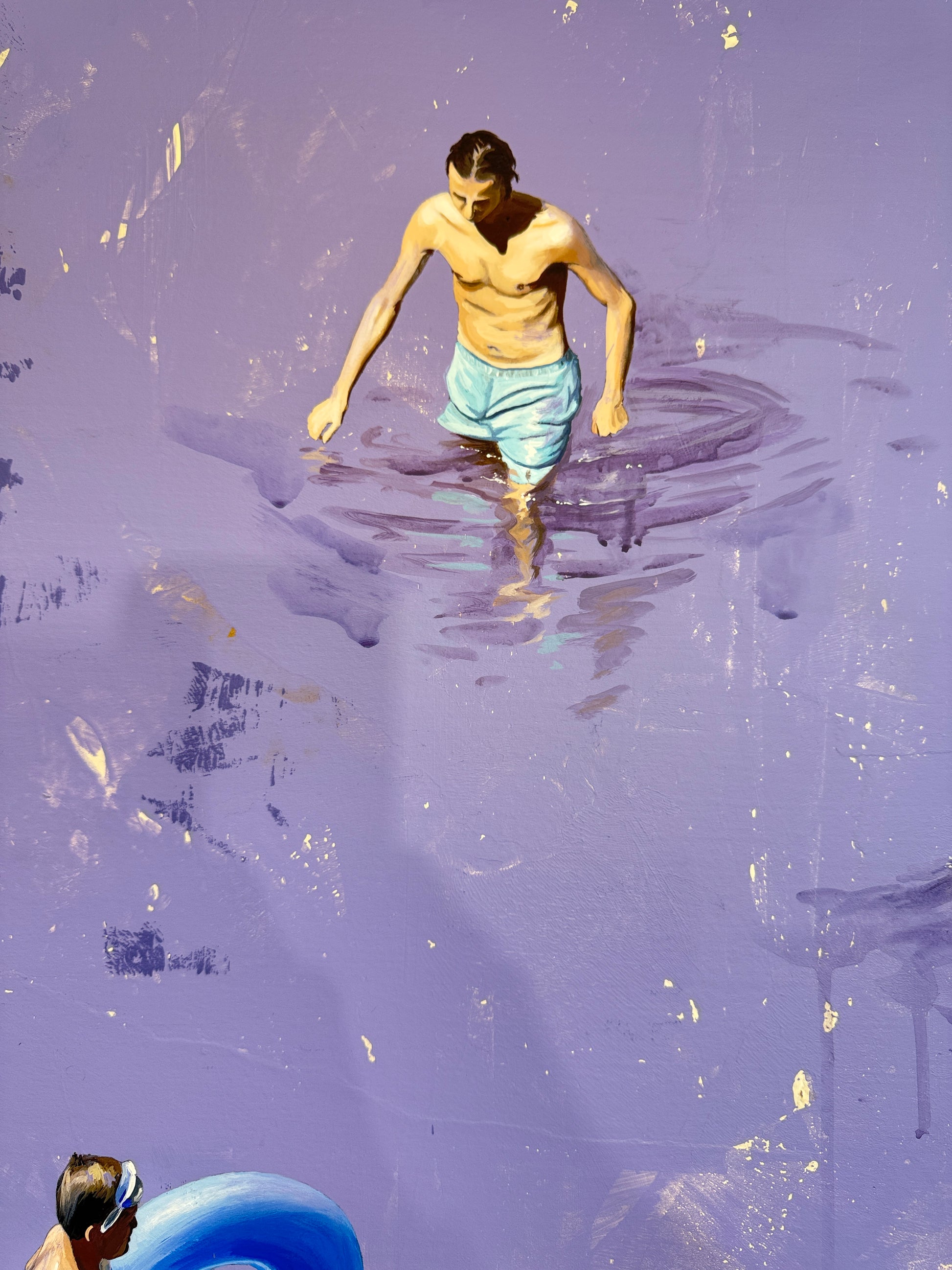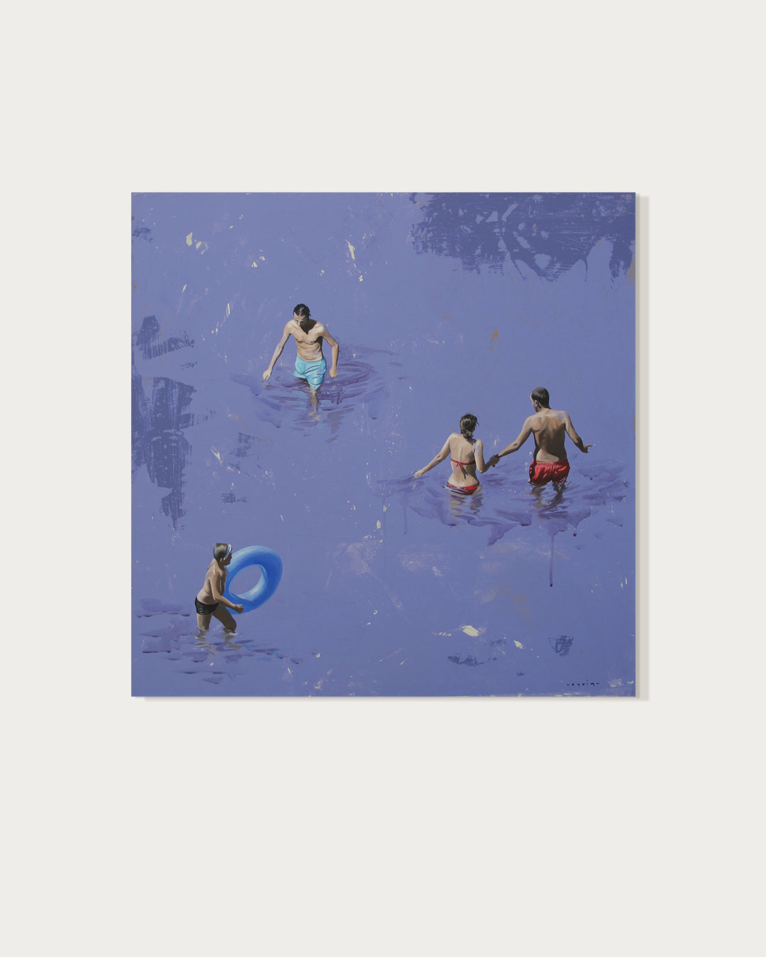Drawing inspiration from her surroundings, loved ones, and public spaces, she captures photographs that serve as the foundation for composing and creating her paintings. Her recent works depict men, women, and sometimes children, often alone in a clear, abstract environment, placed in situations that reflect the contemporary world. However, her intention is not to tell a specific story. "Everything is open, possible," she says. "Each person can interpret these scenes as they wish. The canvas shows nothing beyond what we see. These people are simply there. We observe them, but in reality, it is a reflection of ourselves, the canvas is a mirror. What matters to me is capturing a moment of stillness, one that can reveal something in each of us."