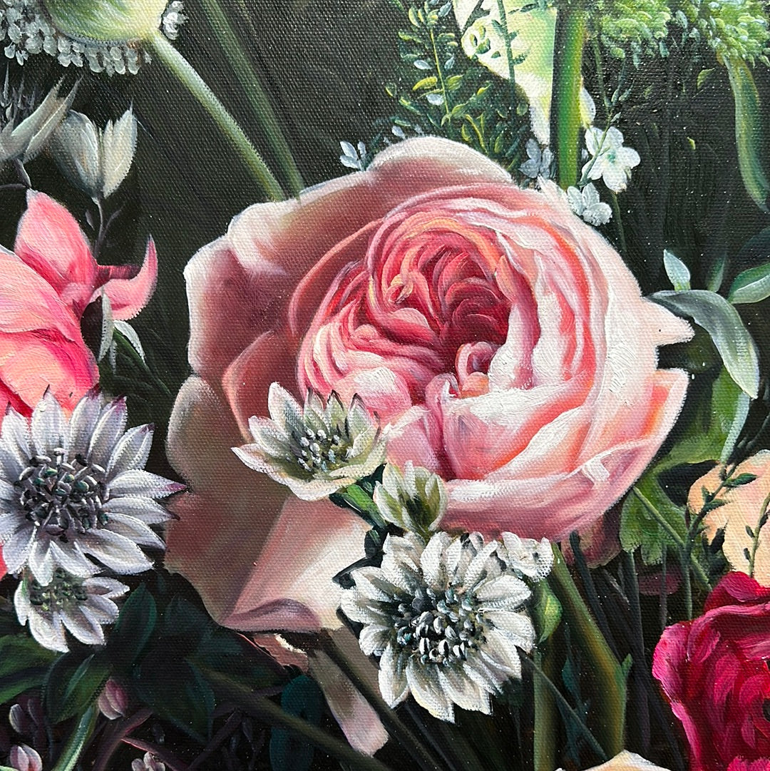 This is a beautiful oil painting of an array of flowers in a vase. Contemporary painting full of details and colors, vibrant roses , tulips, peonies and an arrangement of other flowers. Reminding us of old master paintings, this is a brand new painting full elegance and timeless elegance.