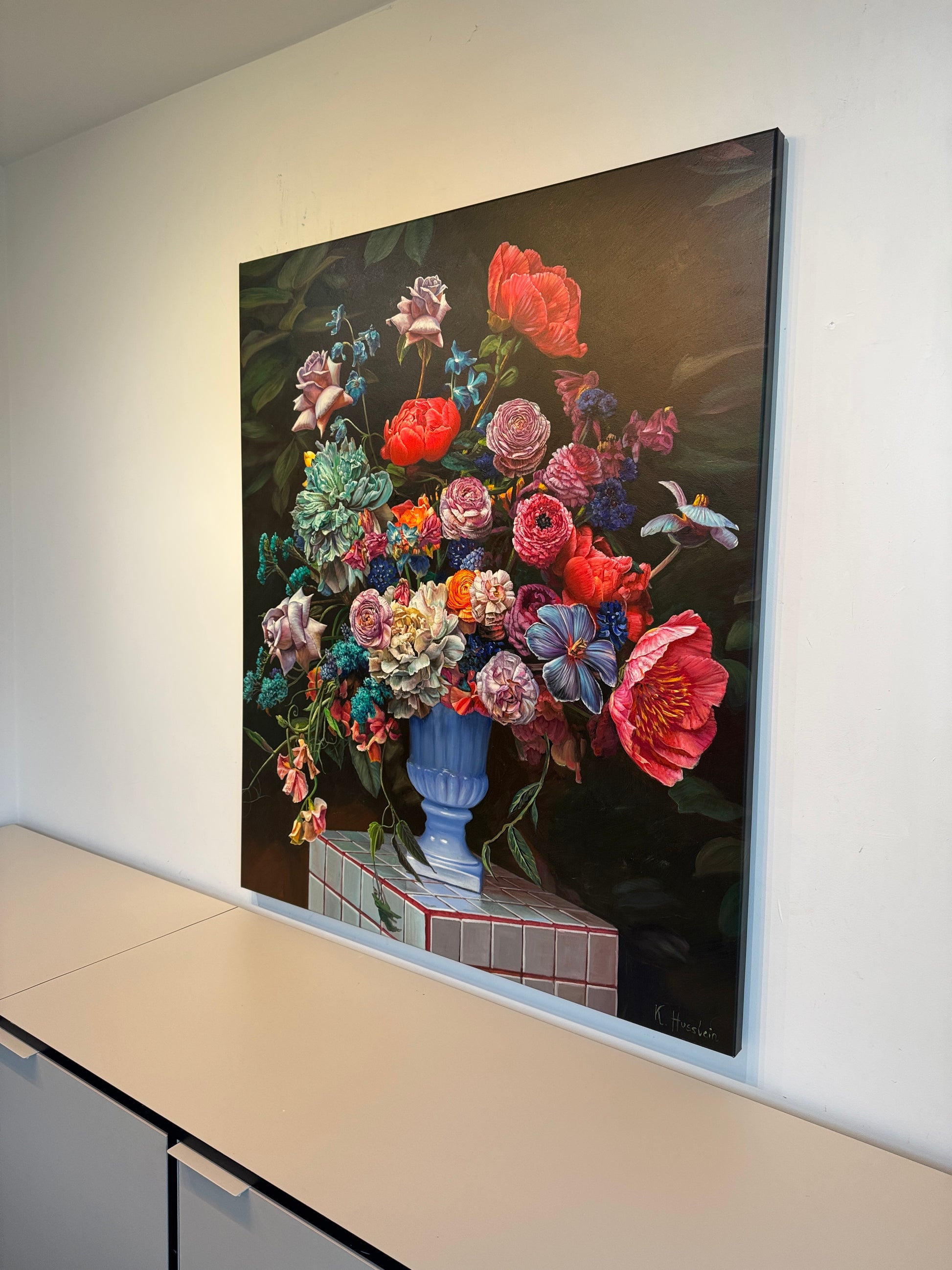 In her artistic process, Husslein encapsulates the transient ecstasy of a fleeting moment, often when flowers are resplendent in full bloom. Her canvases frequently orchestrate an array of botanical species, harmoniously coexisting within a vase, transcending the boundaries of temporal accuracy. Rather than fixating on botanical fidelity, her oeuvres spotlight the interplay of colors, illumination, textures, and intricate minutiae, which collectively imbue her works with an enigmatic allure, captivating the observer.