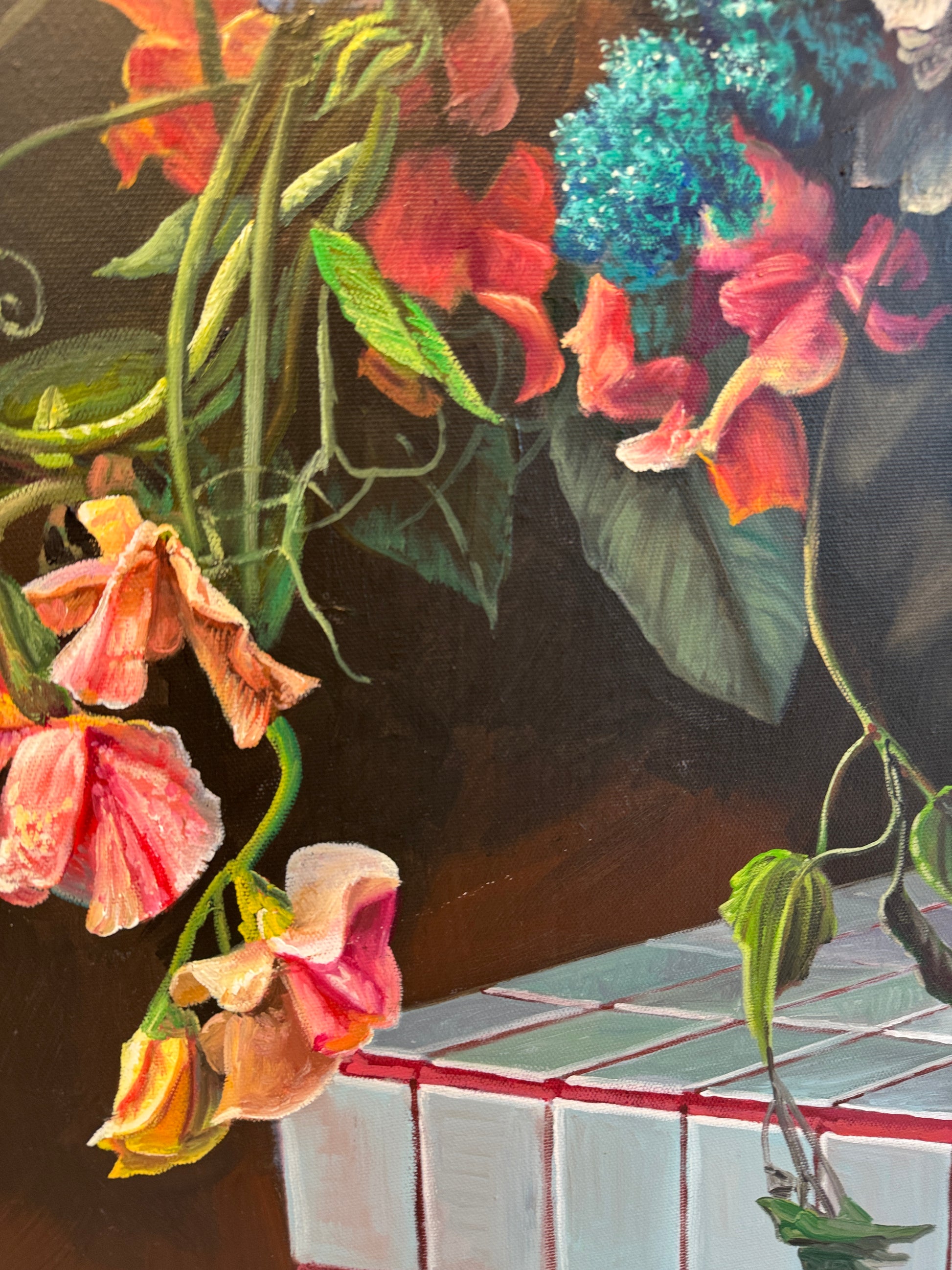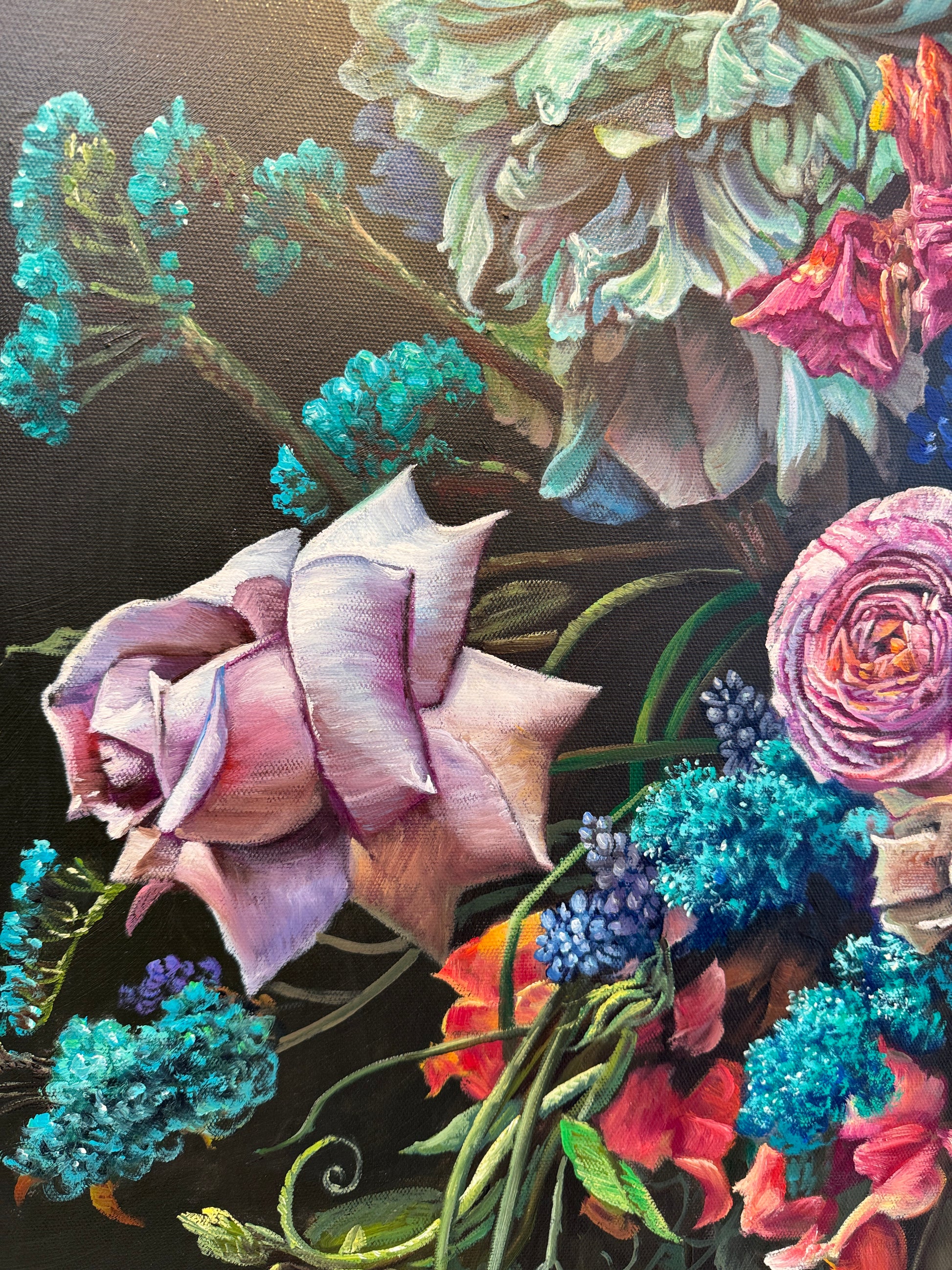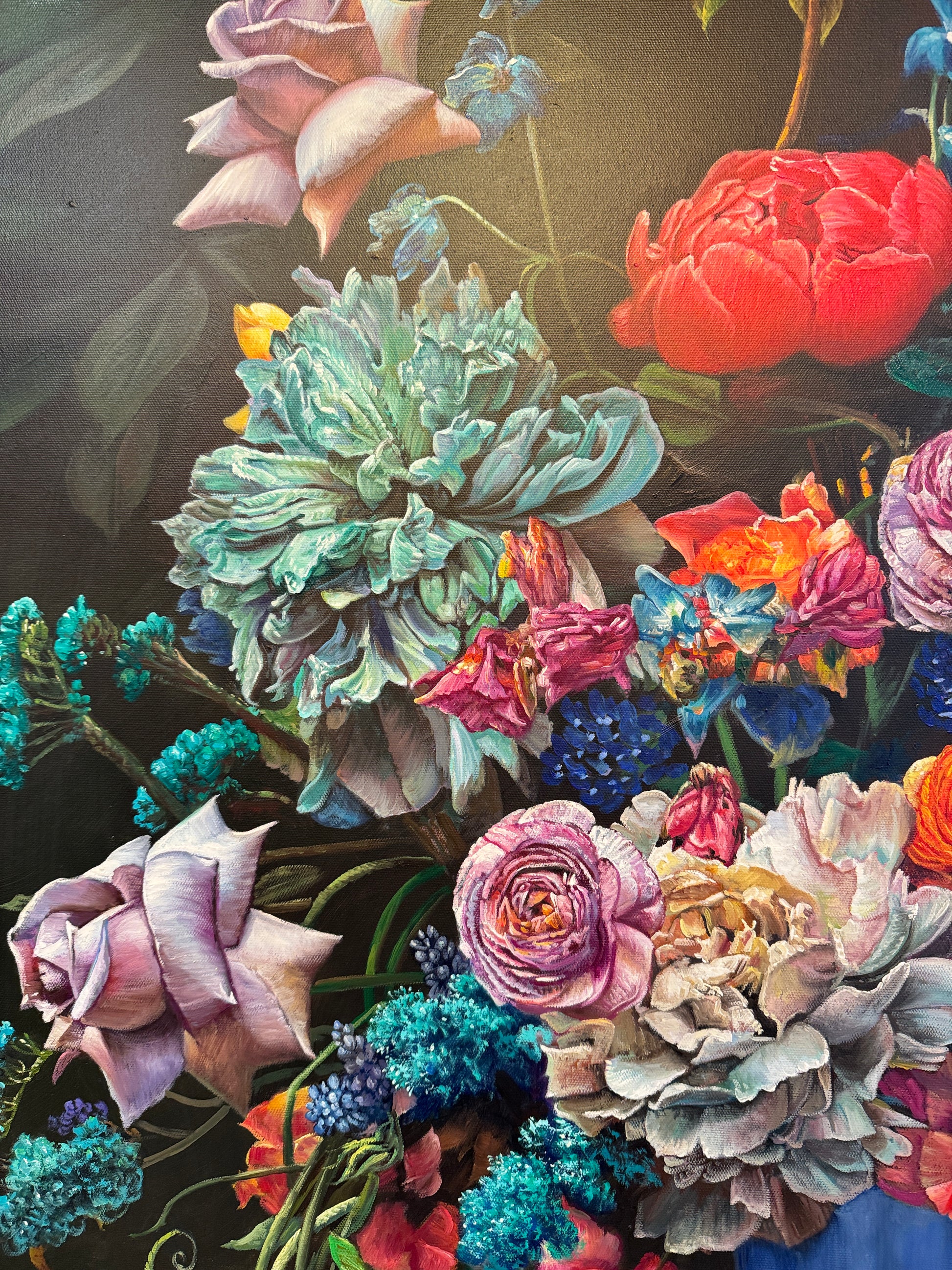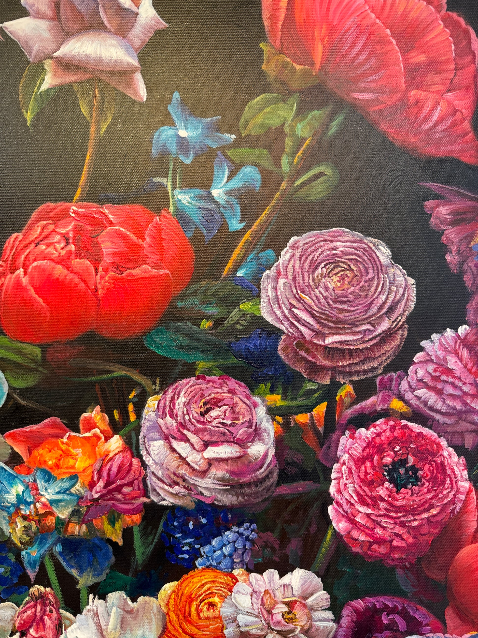 This is a beautiful oil painting of an array of flowers in a vase. Contemporary painting full of details and colors, vibrant roses , tulips, peonies and an arrangement of other flowers. Reminding us of old master paintings, this is a brand new painting full elegance and timeless elegance.