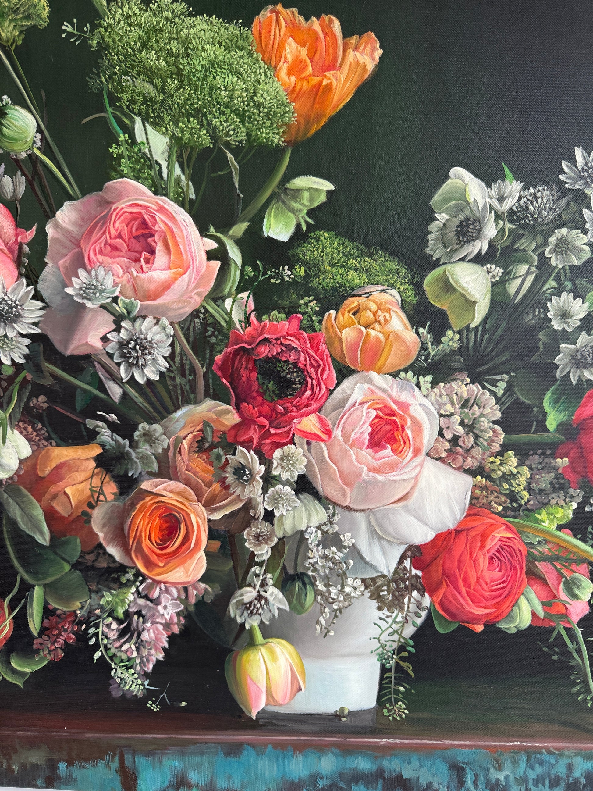This is a beautiful oil painting of an array of flowers in a vase. Contemporary painting full of details and colors, vibrant roses , tulips, peonies and an arrangement of other flowers. Reminding us of old master paintings, this is a brand new painting full elegance and timeless elegance.