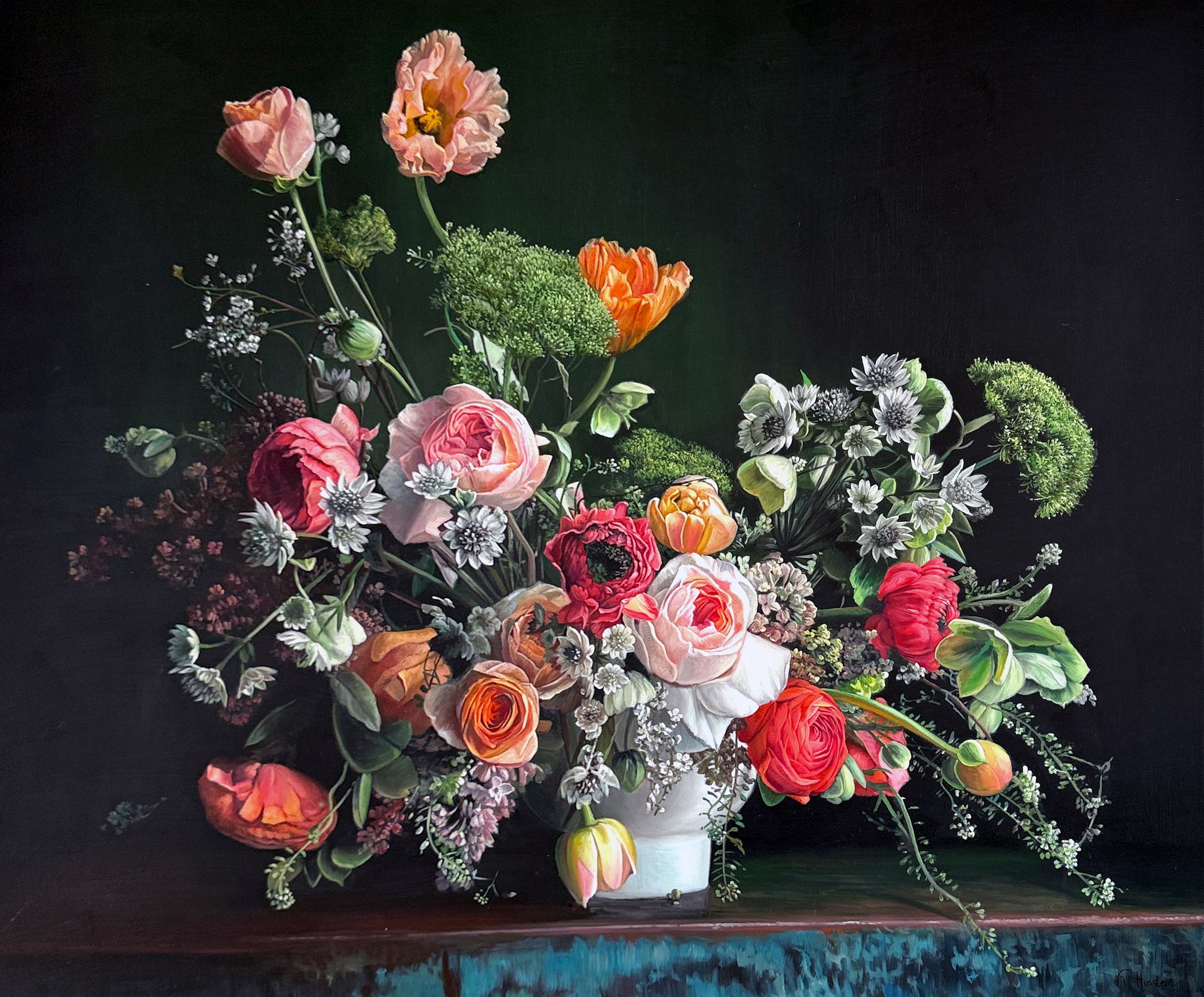 Husslein's artistic philosophy marries a reverence for classical masterpieces with the immersive allure of contemporary still life and botany. Her signature style is characterized by meticulous hyperrealism, particularly evident in her still-life floral compositions. Central to her creations are the visual and tactile attributes of flowers, intertwined with their symbolism evoking themes of love, femininity, and the natural world. These elements coalesce to fashion Husslein's vivacious and captivating compositions.