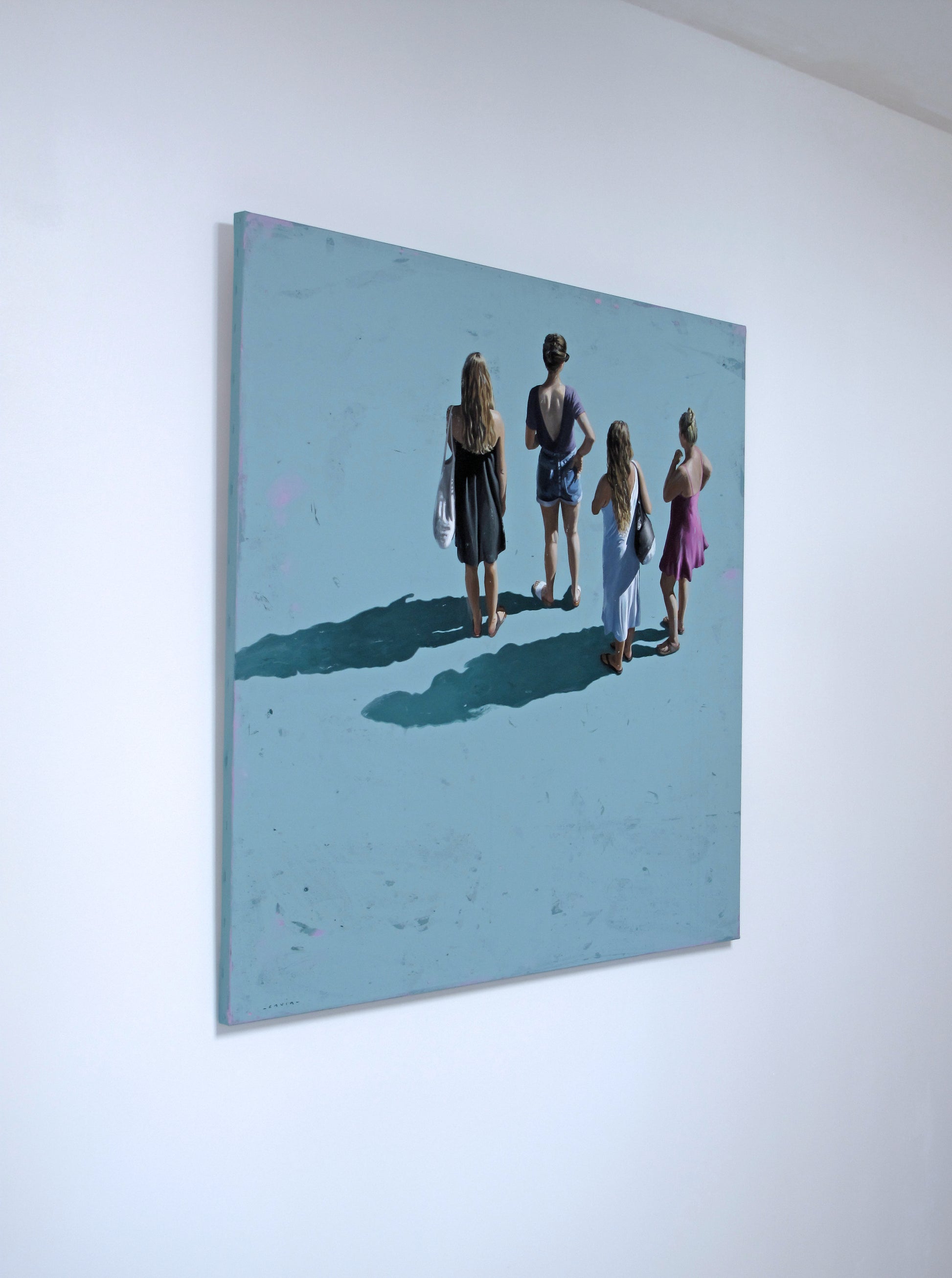 Drawing inspiration from her surroundings, loved ones, and public spaces, she captures photographs that serve as the foundation for composing and creating her paintings. Her recent works depict men, women, and sometimes children, often alone in a clear, abstract environment, placed in situations that reflect the contemporary world. However, her intention is not to tell a specific story. "Everything is open, possible," she says. "Each person can interpret these scenes as they wish. The canvas shows nothing beyond what we see. These people are simply there. We observe them, but in reality, it is a reflection of ourselves, the canvas is a mirror. What matters to me is capturing a moment of stillness, one that can reveal something in each of us."