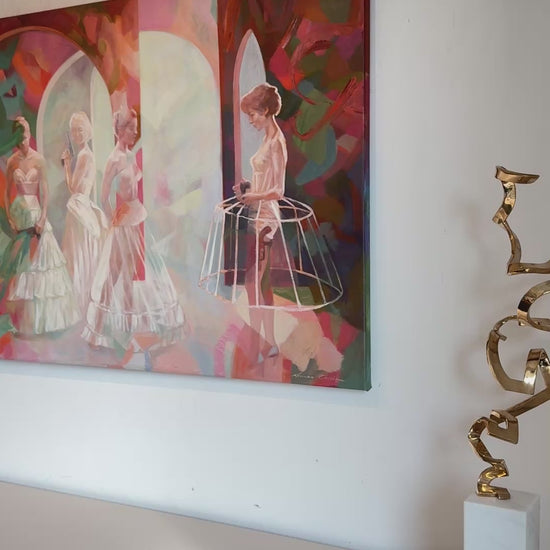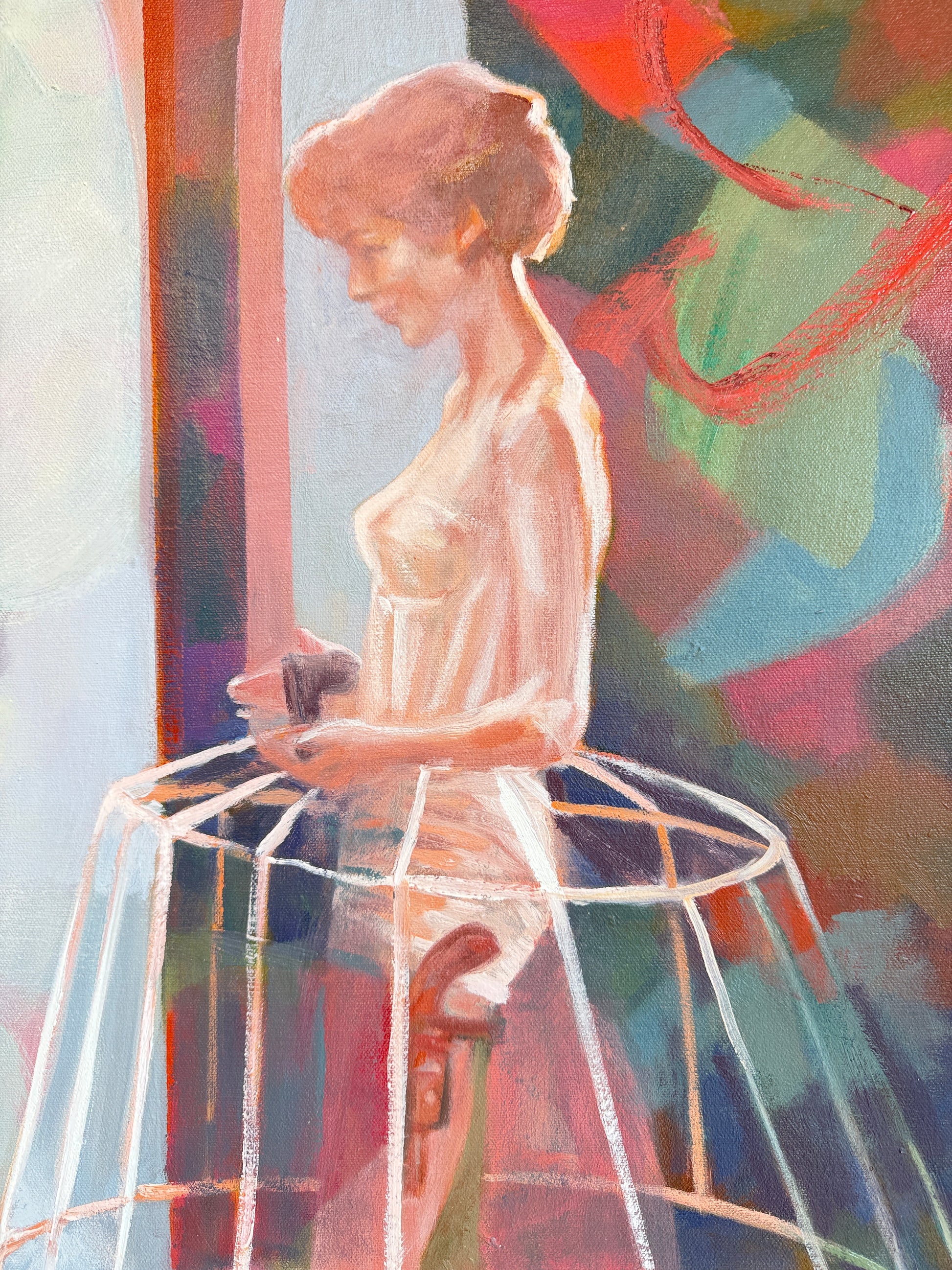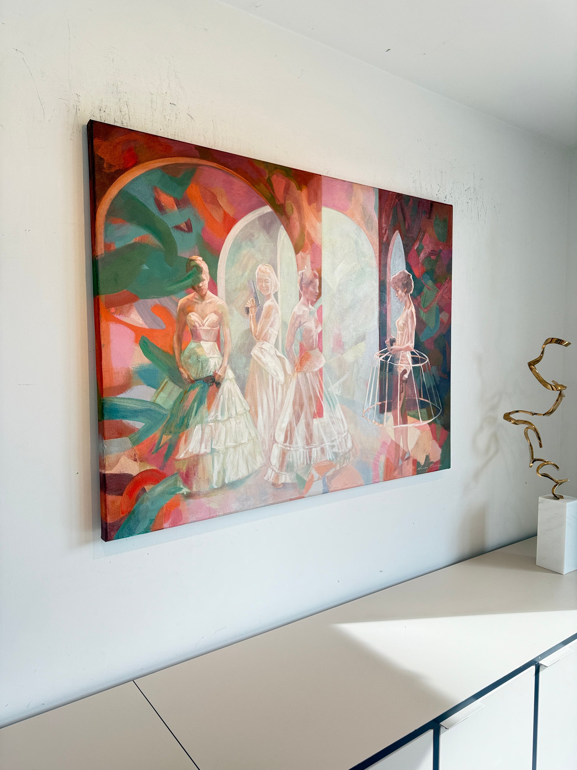 The women in this painting stand in varying degrees of dress, each framed by archways as if