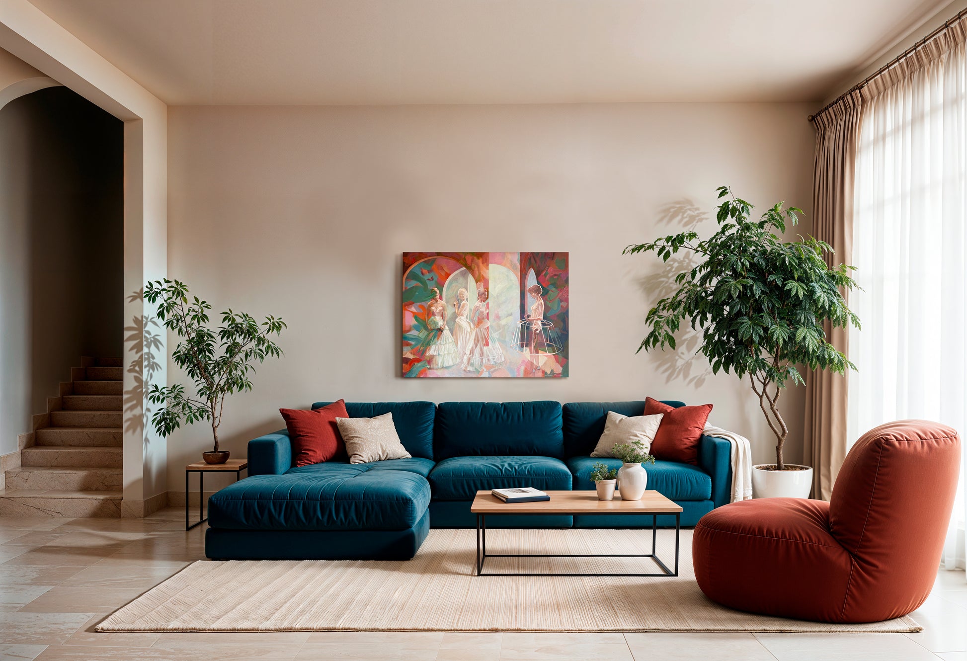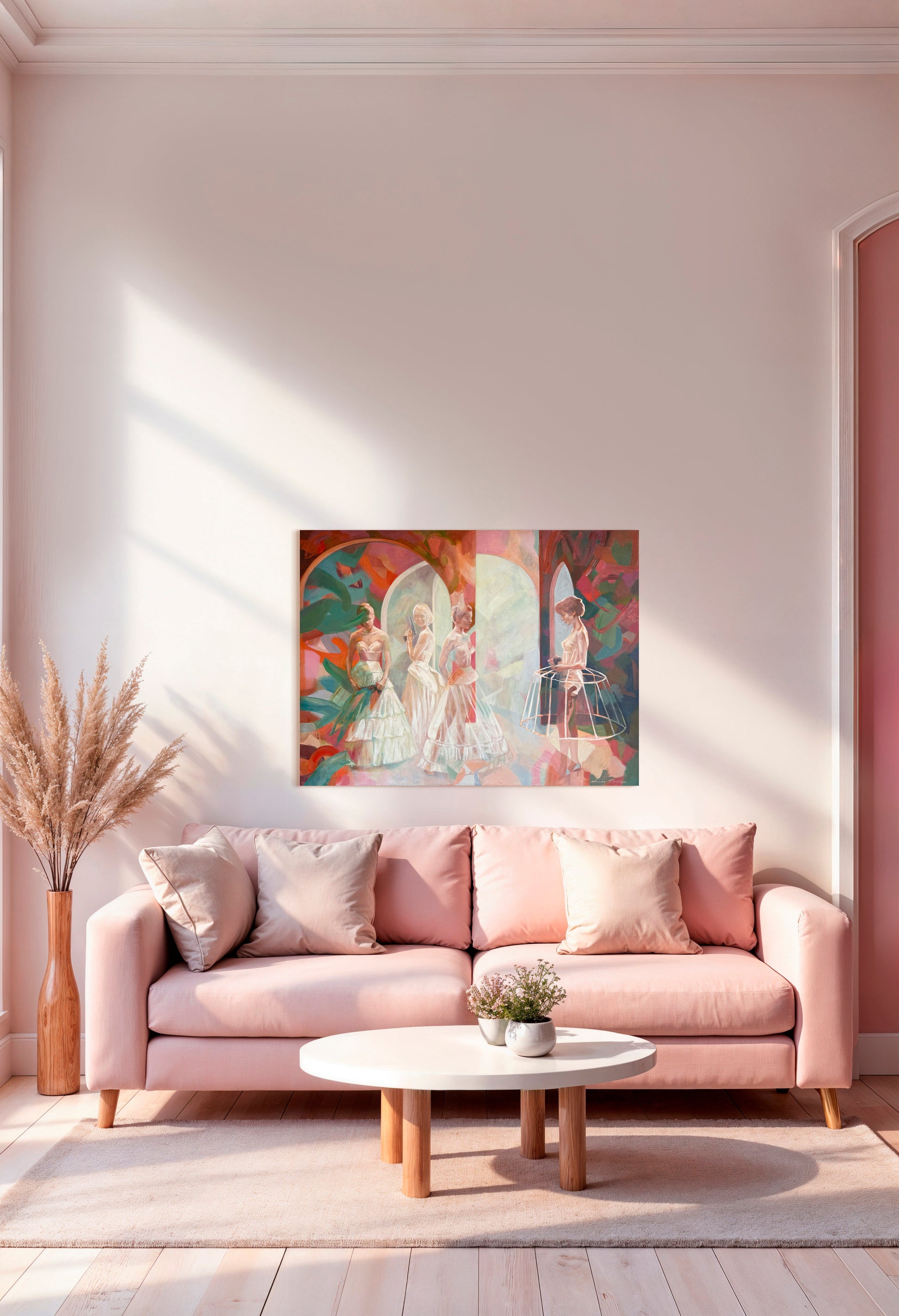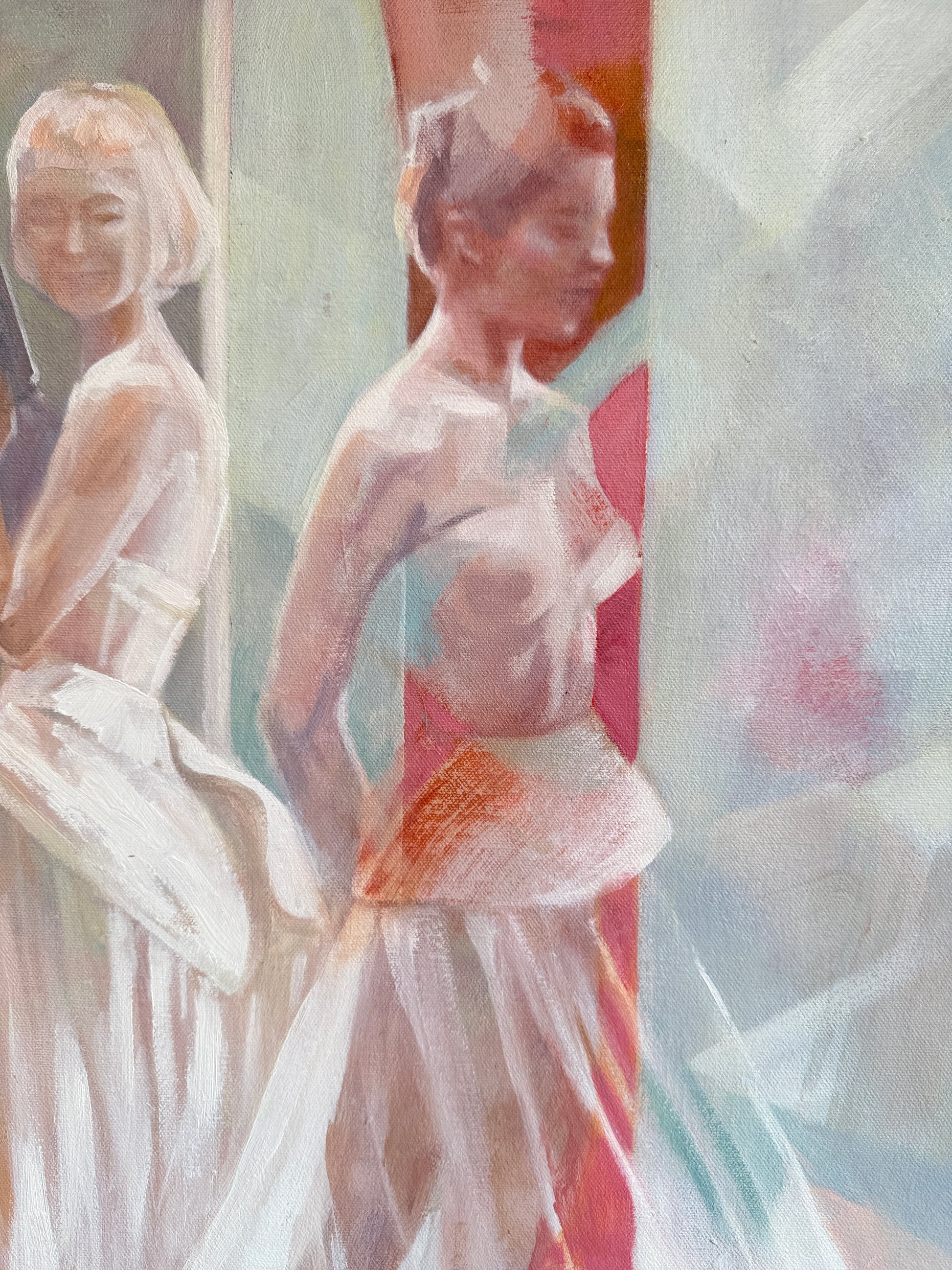 The women in this painting stand in varying degrees of dress, each framed by archways as if