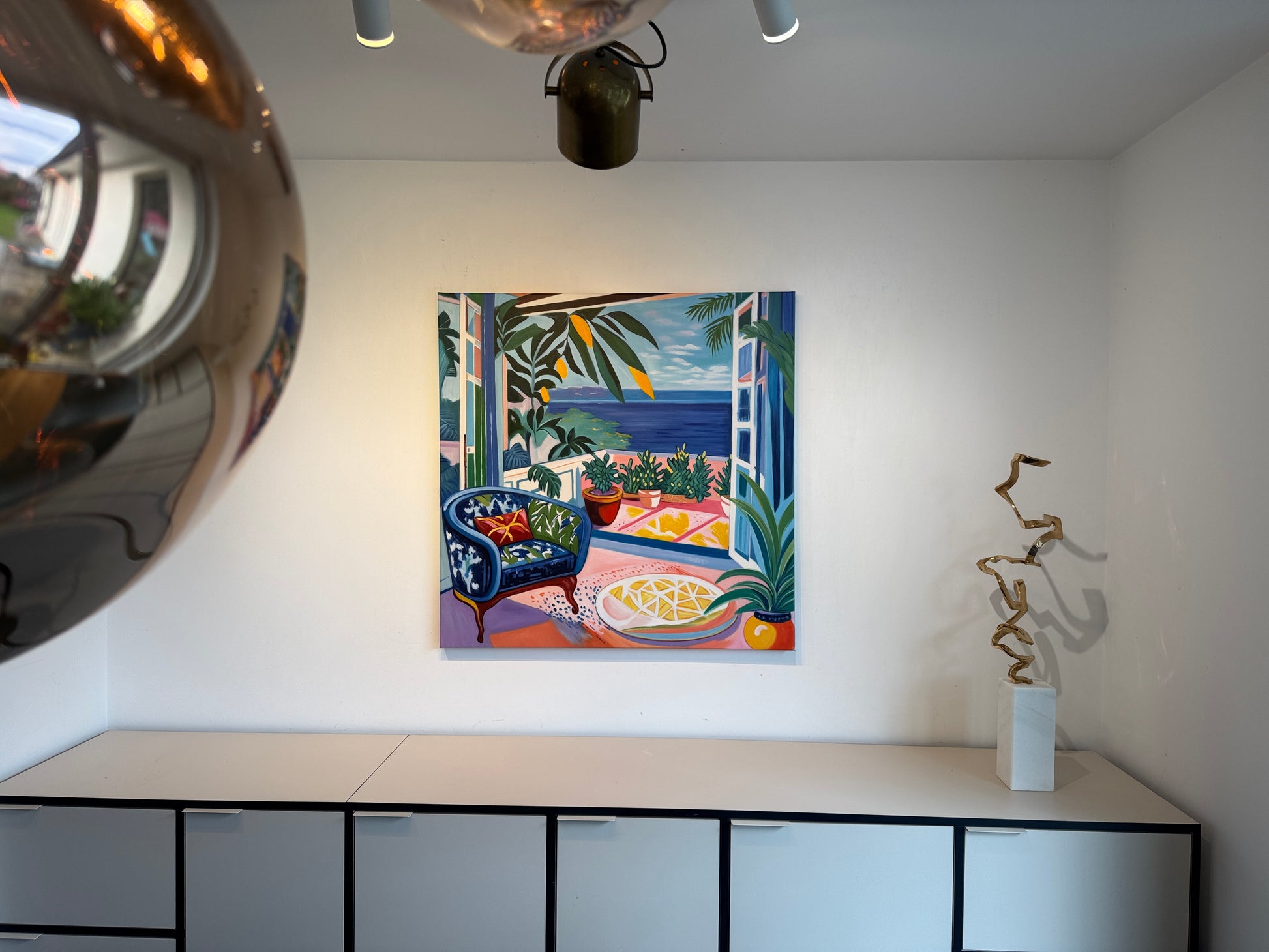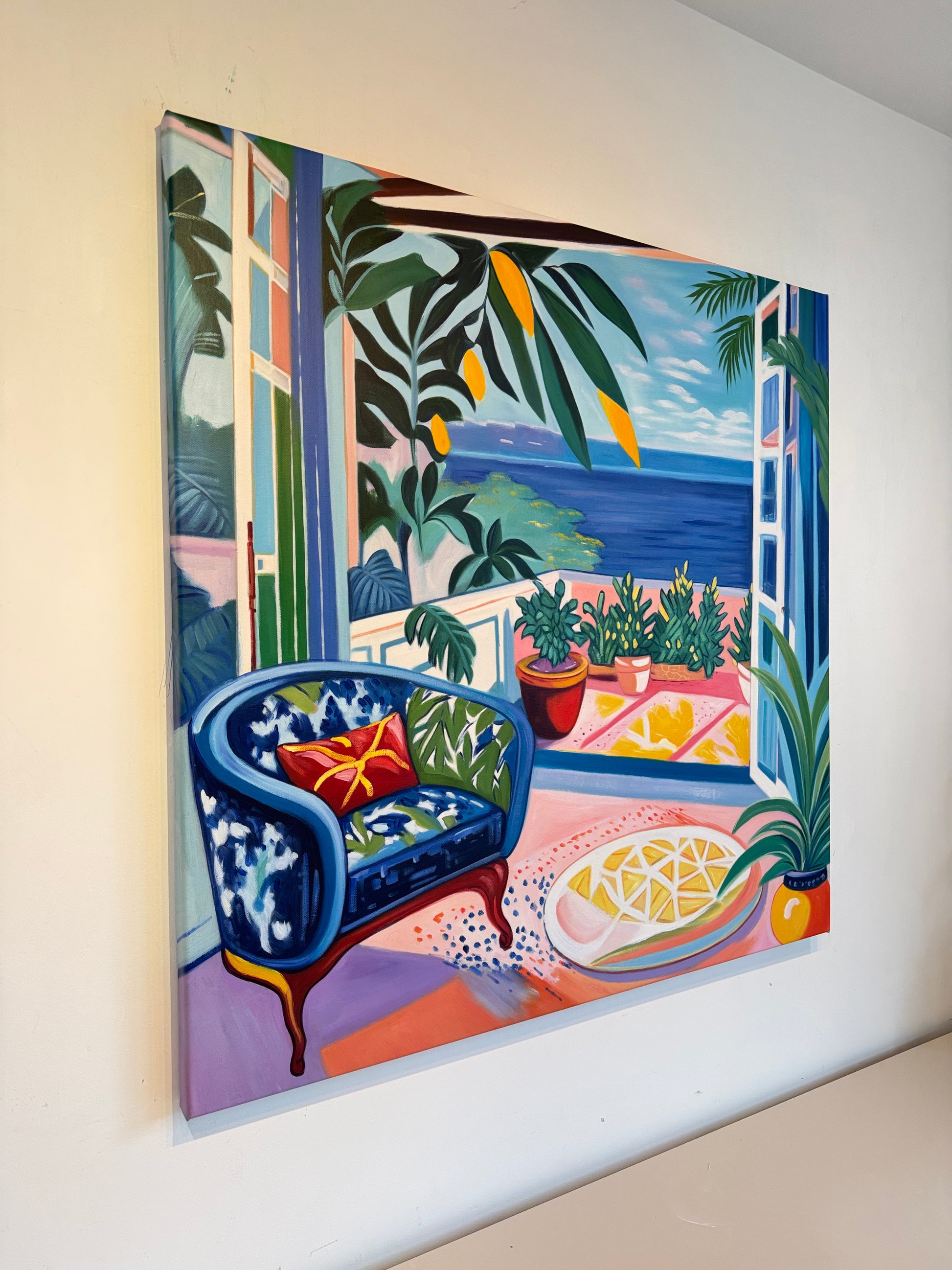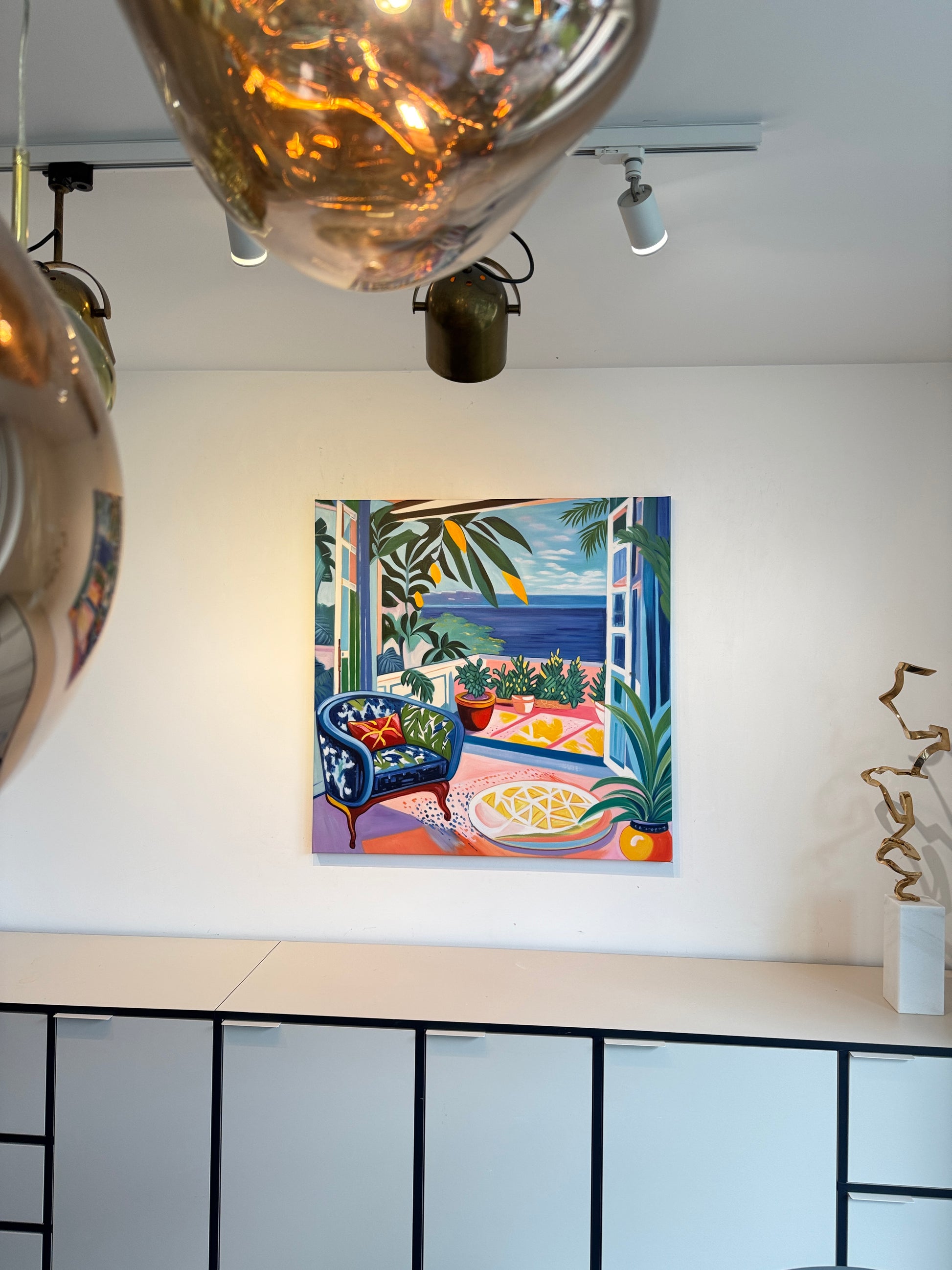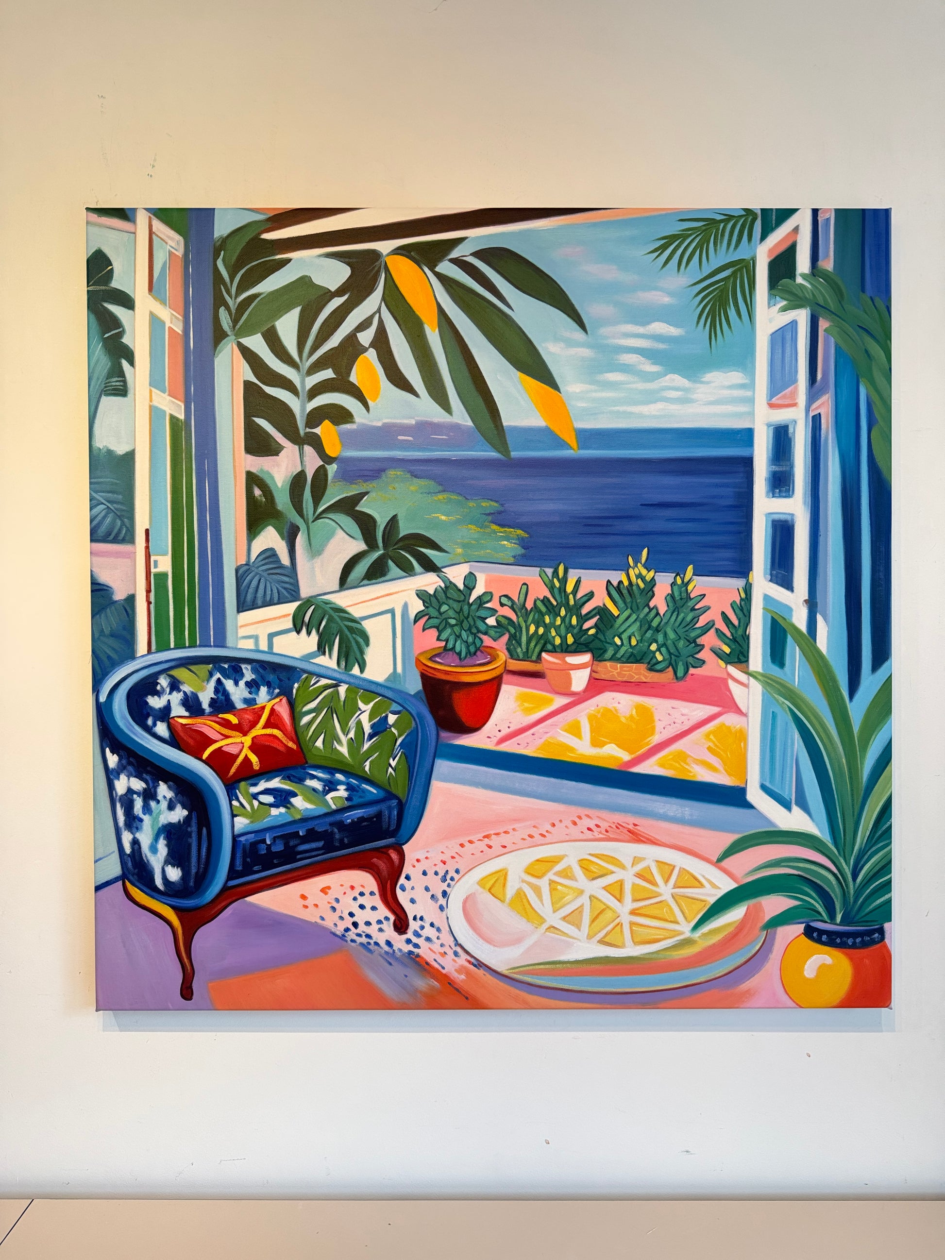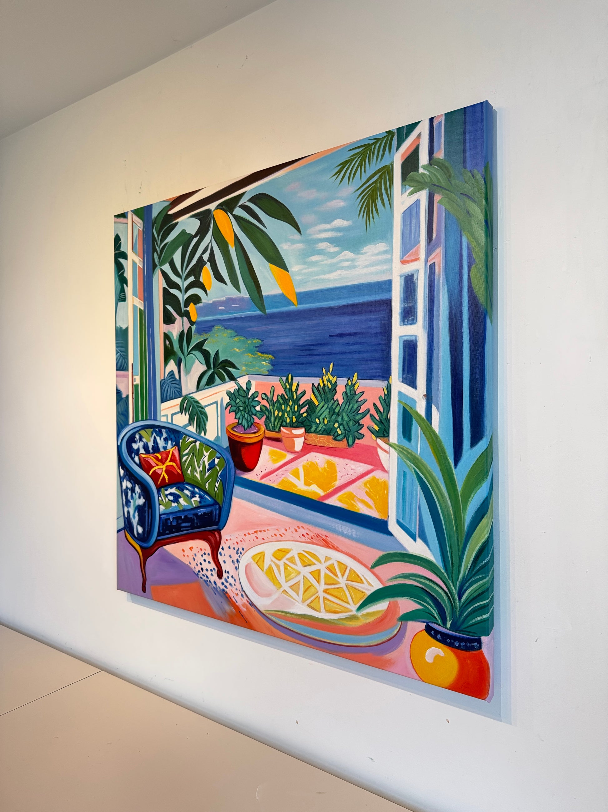 With bold colours, soft light, and breezy compositions, the paintings capture the laid-back rhythm of holiday life. Added thread details, carefully stitched into the canvas, highlight small elements and bring a subtle, tactile layer to the work — adding intimacy and depth without overpowering the calm, open feel of each piece.