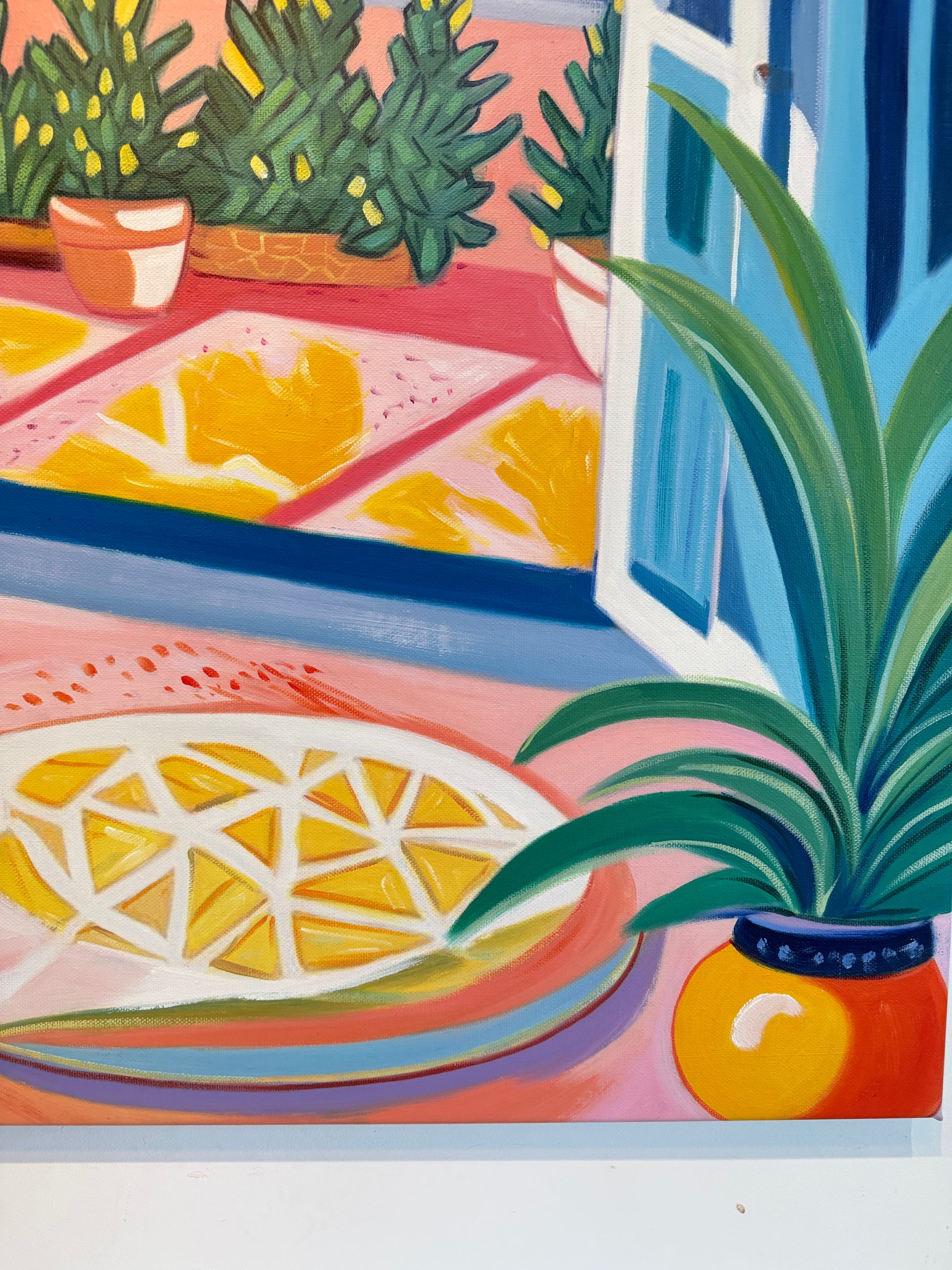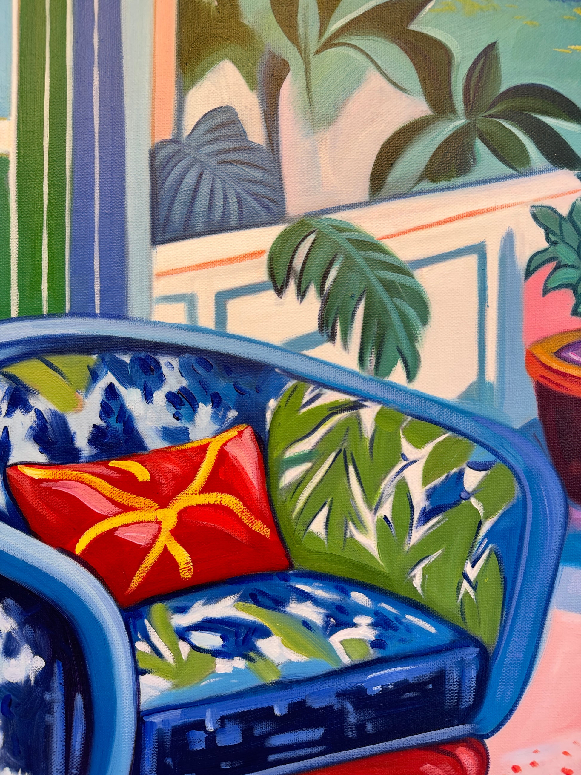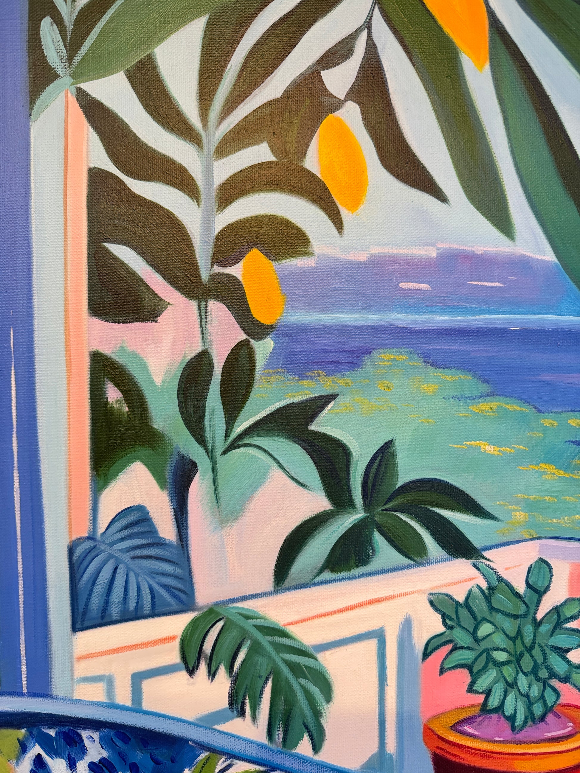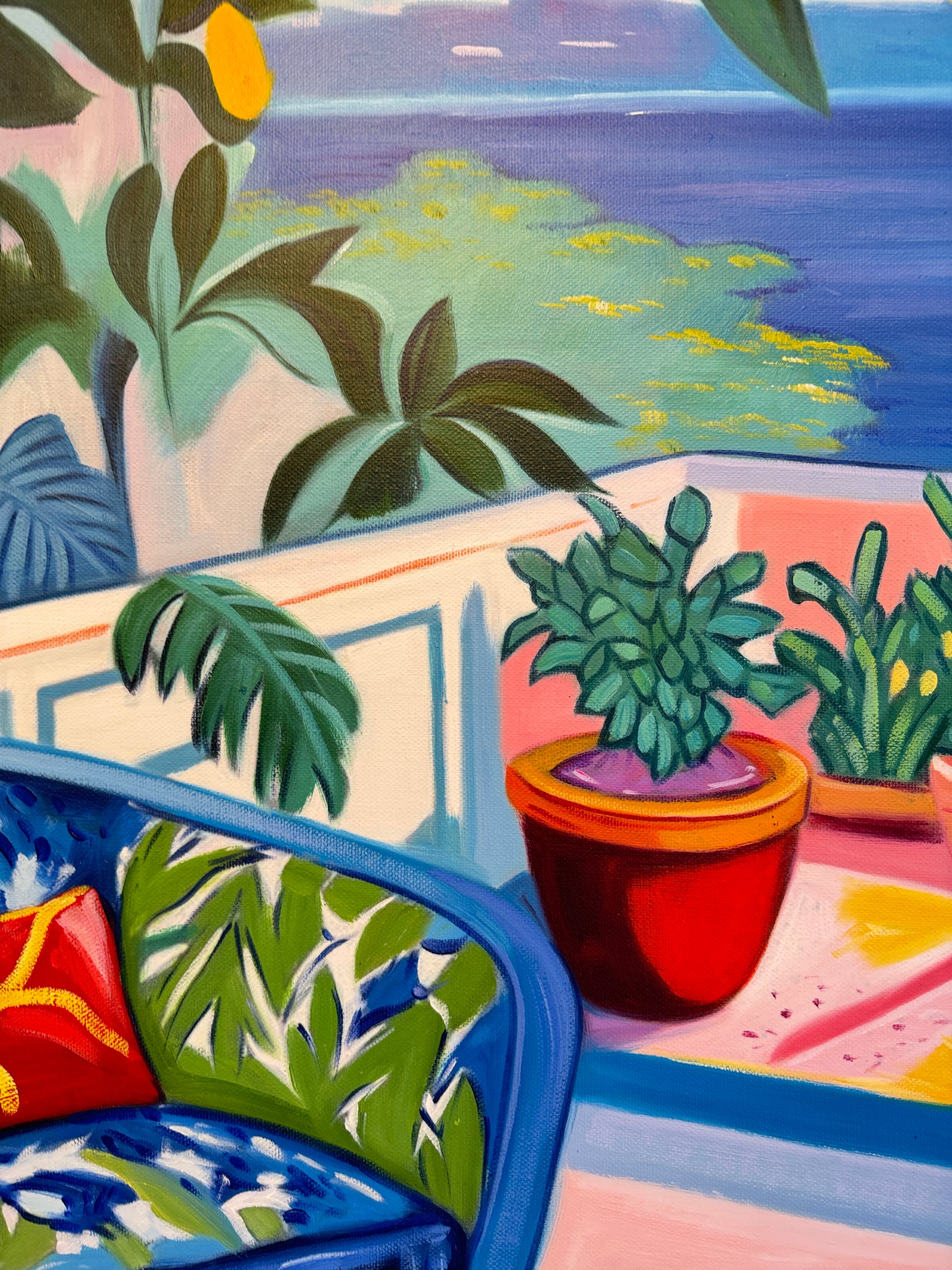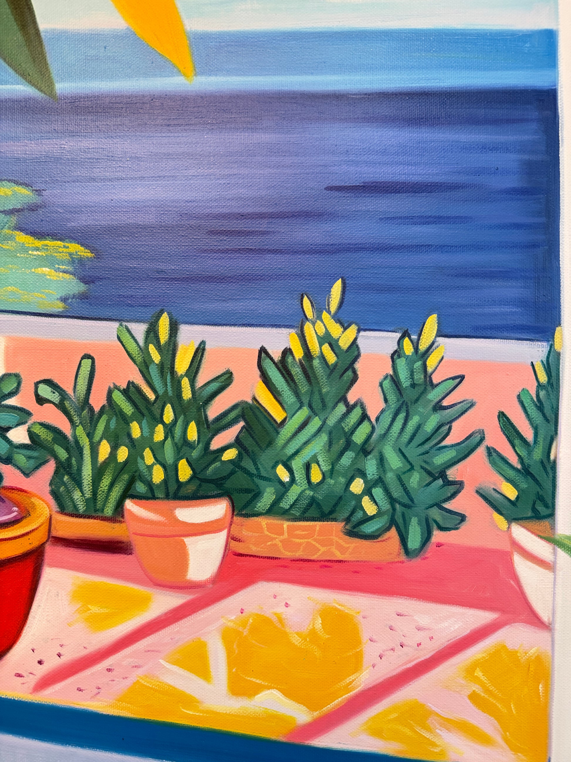 With bold colours, soft light, and breezy compositions, the paintings capture the laid-back rhythm of holiday life. Added thread details, carefully stitched into the canvas, highlight small elements and bring a subtle, tactile layer to the work — adding intimacy and depth without overpowering the calm, open feel of each piece.