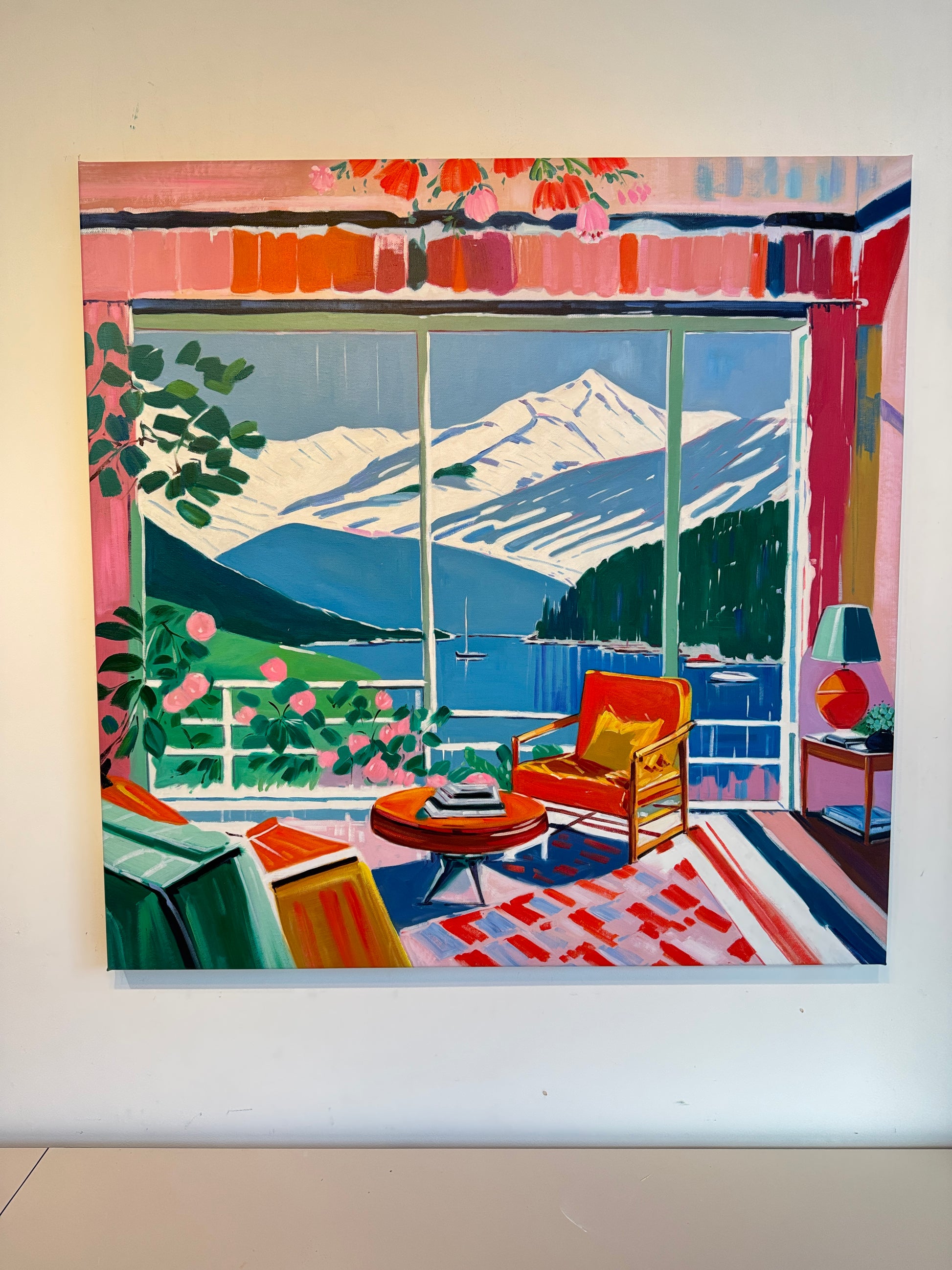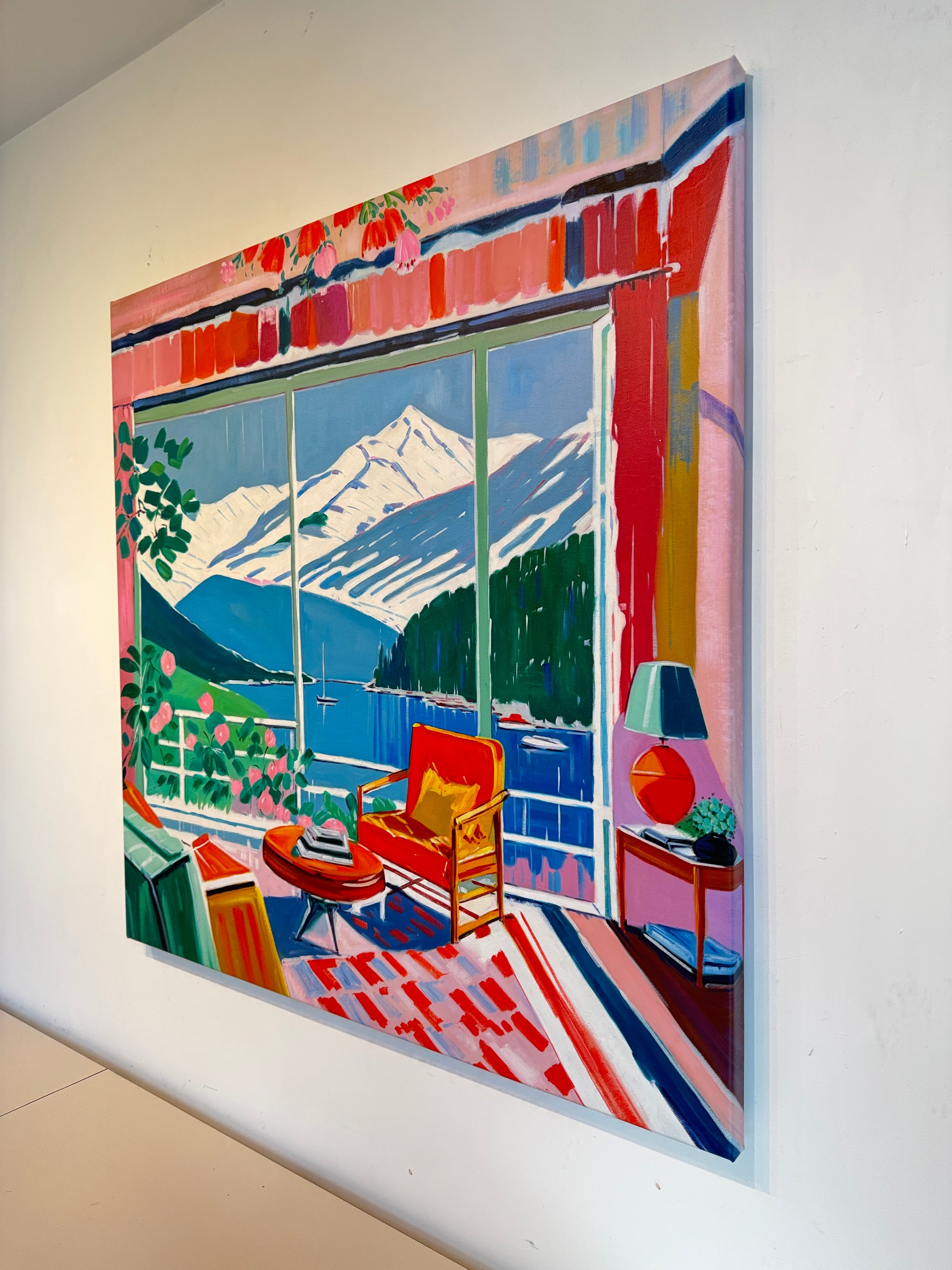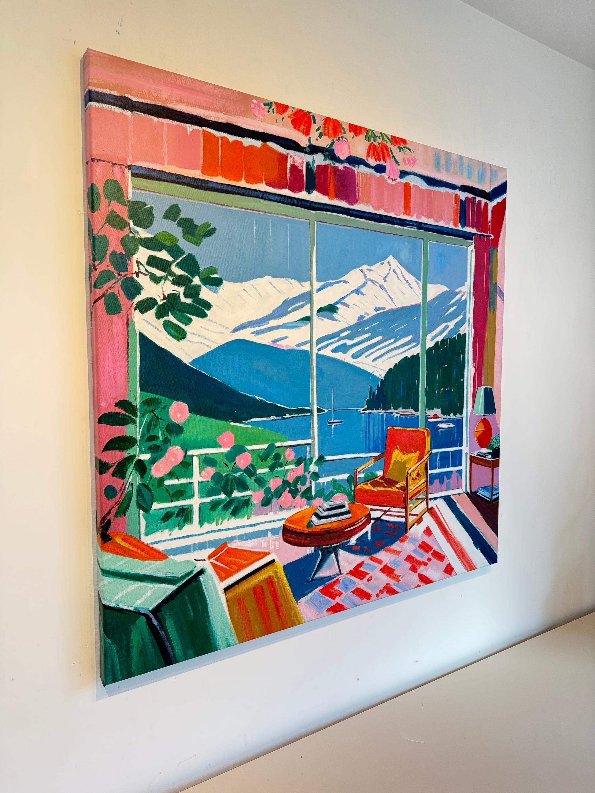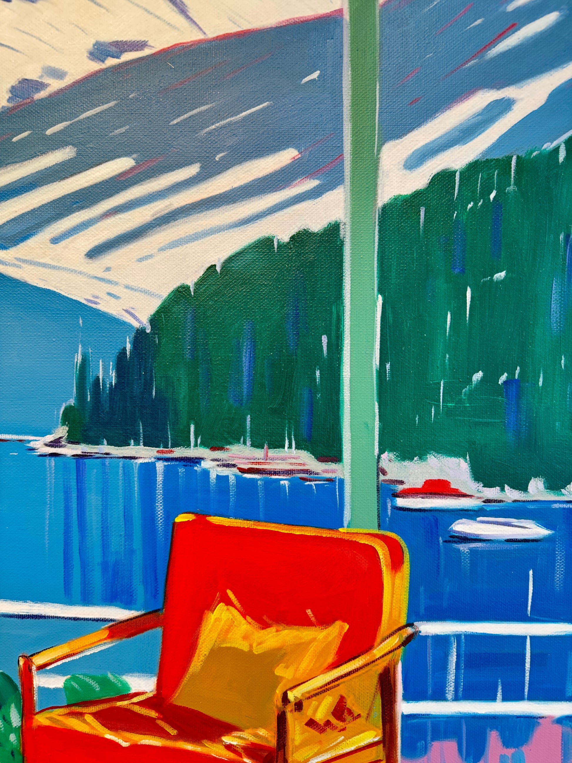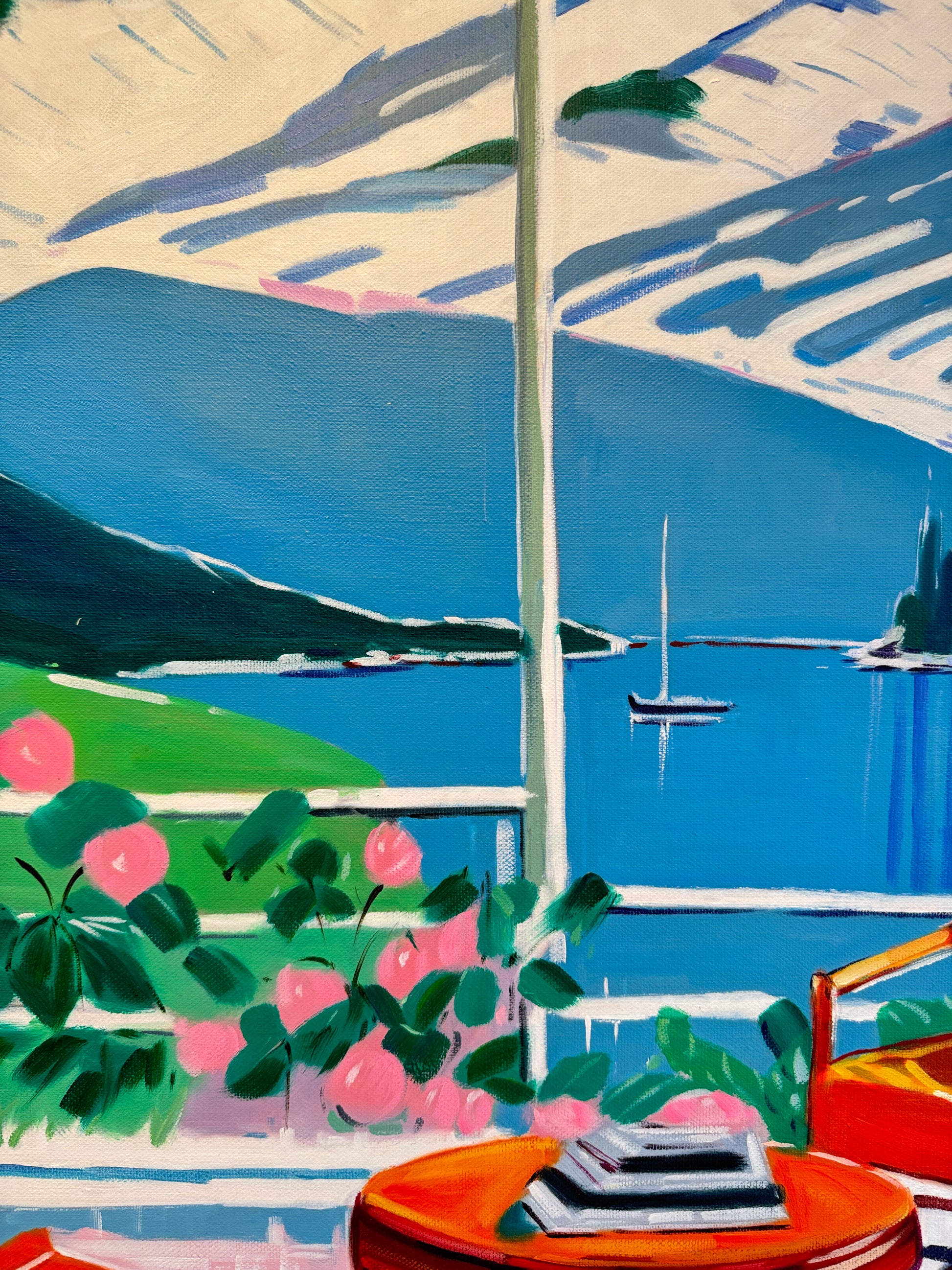 With bold colours, soft light, and breezy compositions, the paintings capture the laid-back rhythm of holiday life. Added thread details, carefully stitched into the canvas, highlight small elements and bring a subtle, tactile layer to the work — adding intimacy and depth without overpowering the calm, open feel of each piece.