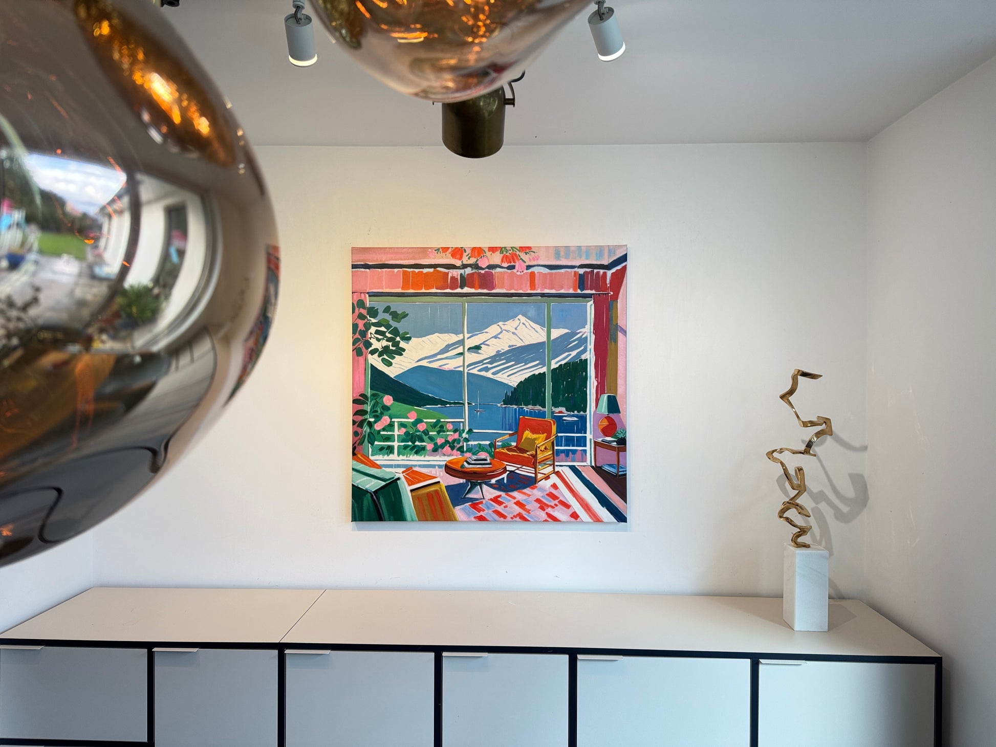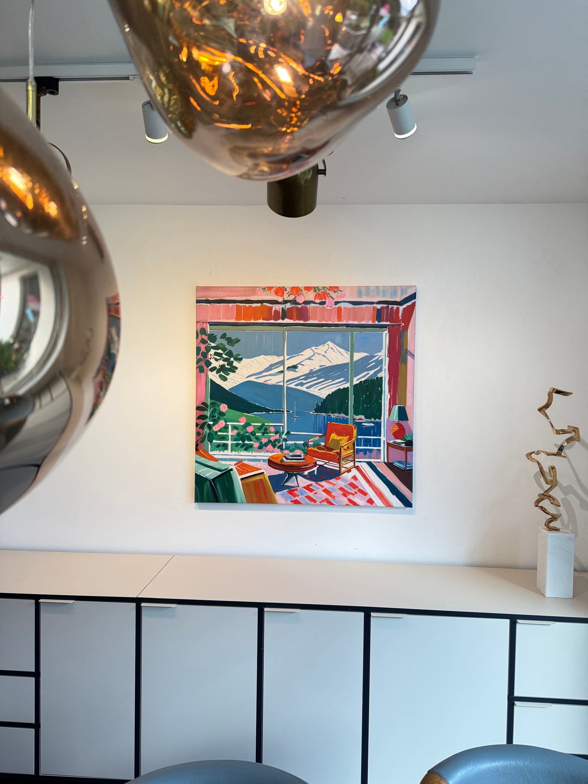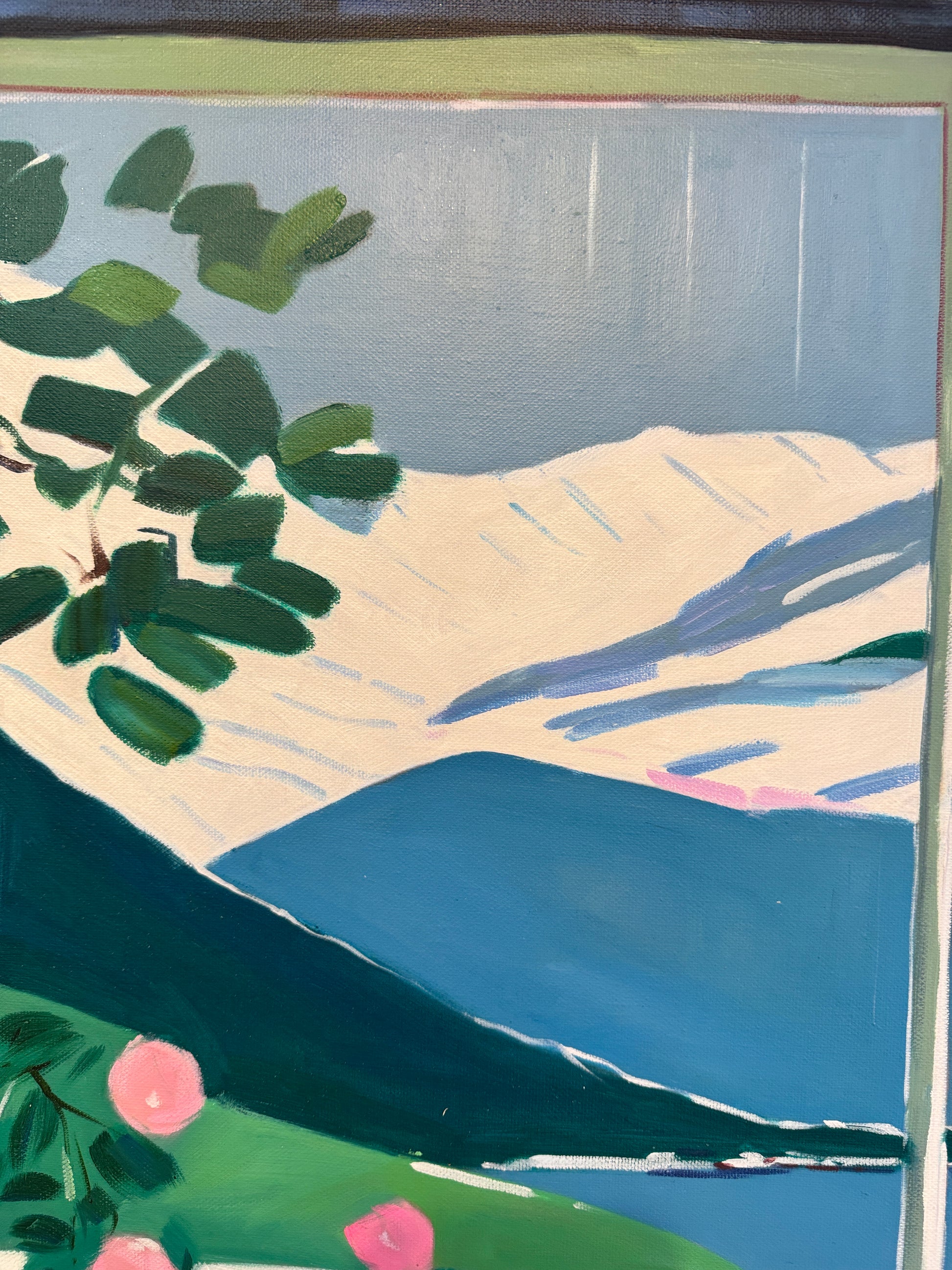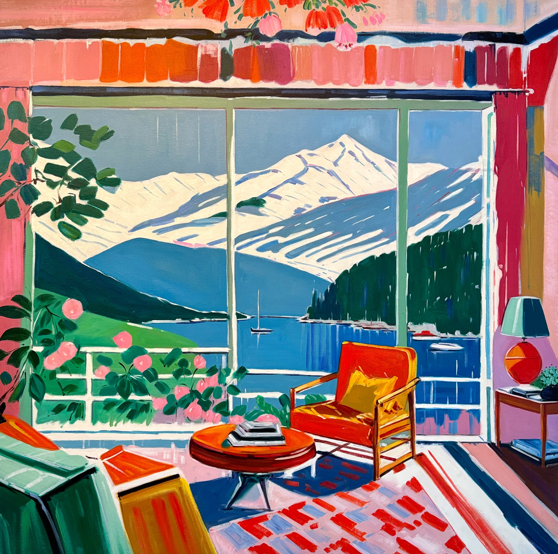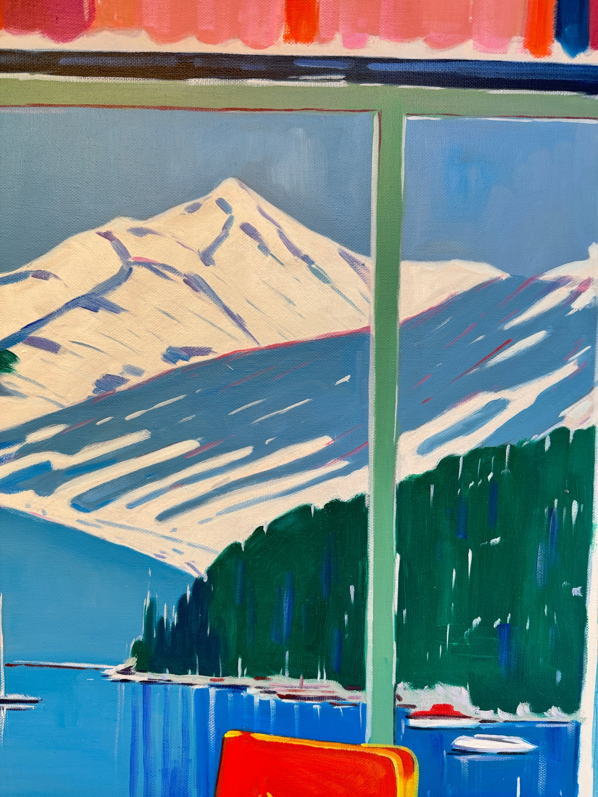 With bold colours, soft light, and breezy compositions, the paintings capture the laid-back rhythm of holiday life. Added thread details, carefully stitched into the canvas, highlight small elements and bring a subtle, tactile layer to the work — adding intimacy and depth without overpowering the calm, open feel of each piece.