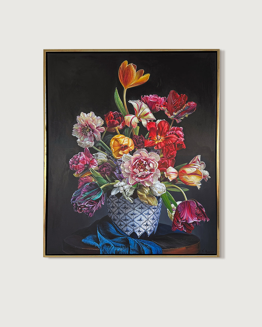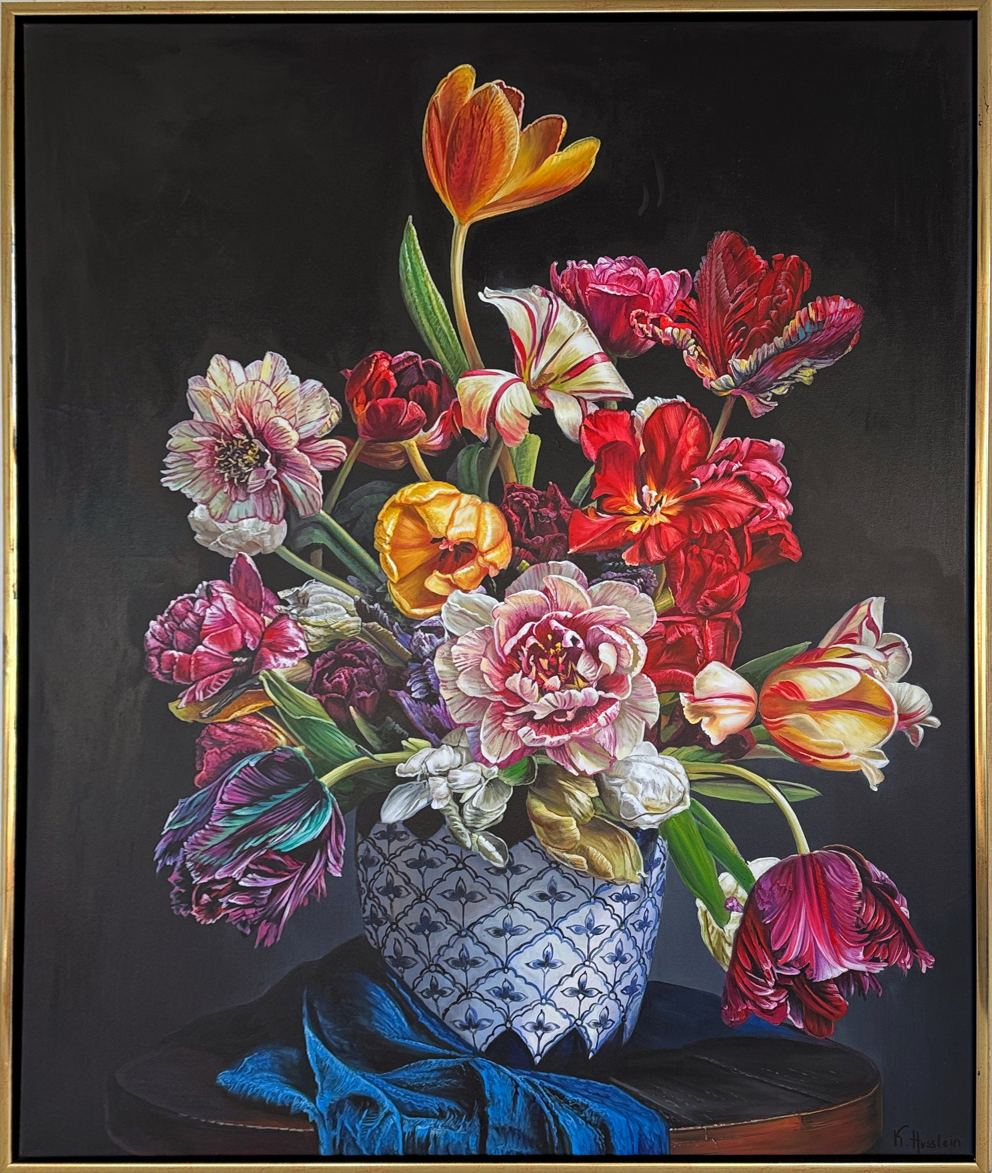 Husslein's artistic philosophy marries a reverence for classical masterpieces with the immersive allure of contemporary still life and botany. Her signature style is characterized by meticulous hyperrealism, particularly evident in her still-life floral compositions. Central to her creations are the visual and tactile attributes of flowers, intertwined with their symbolism evoking themes of love, femininity, and the natural world. These elements coalesce to fashion Husslein's vivacious and captivating compositions.