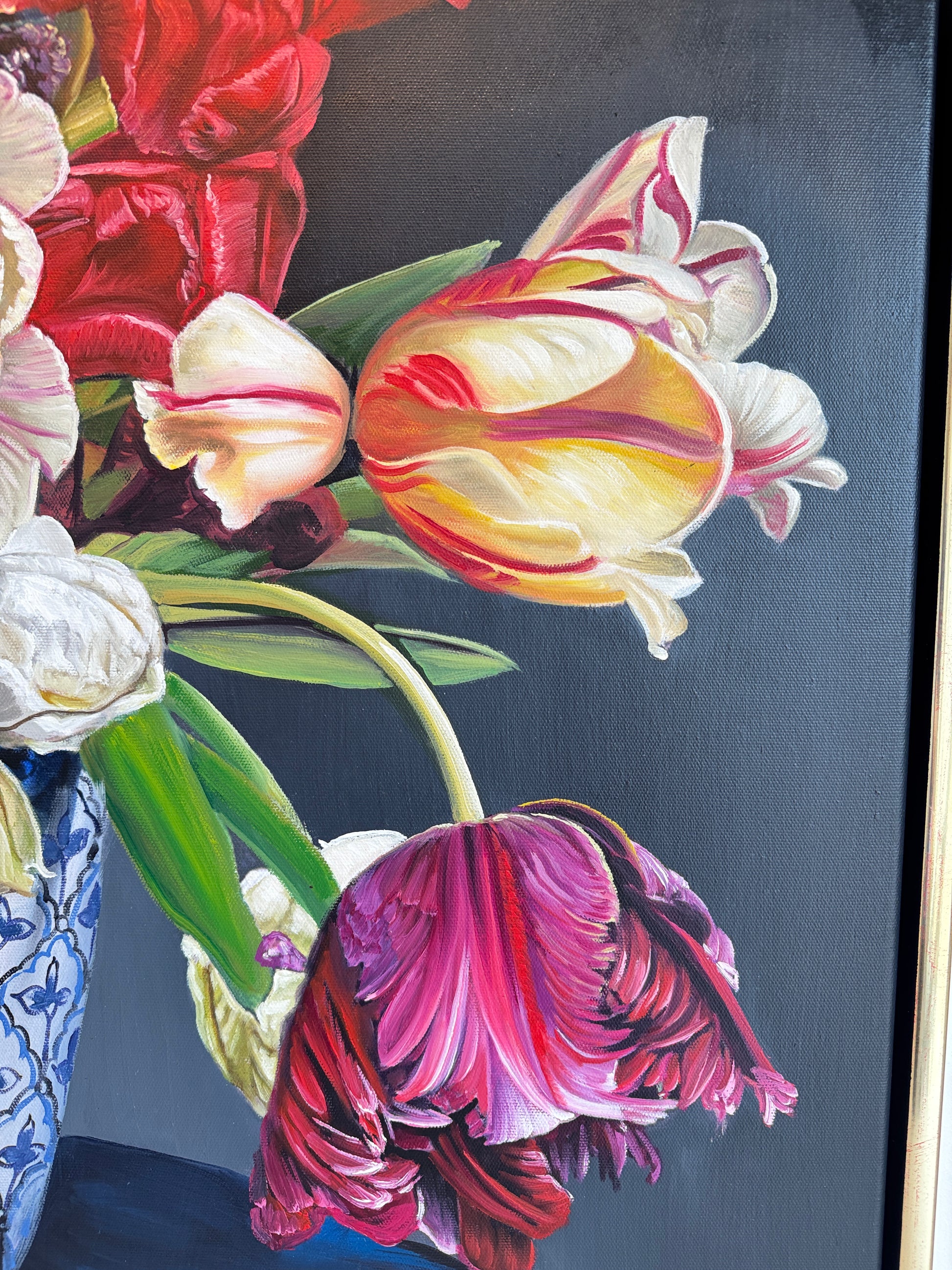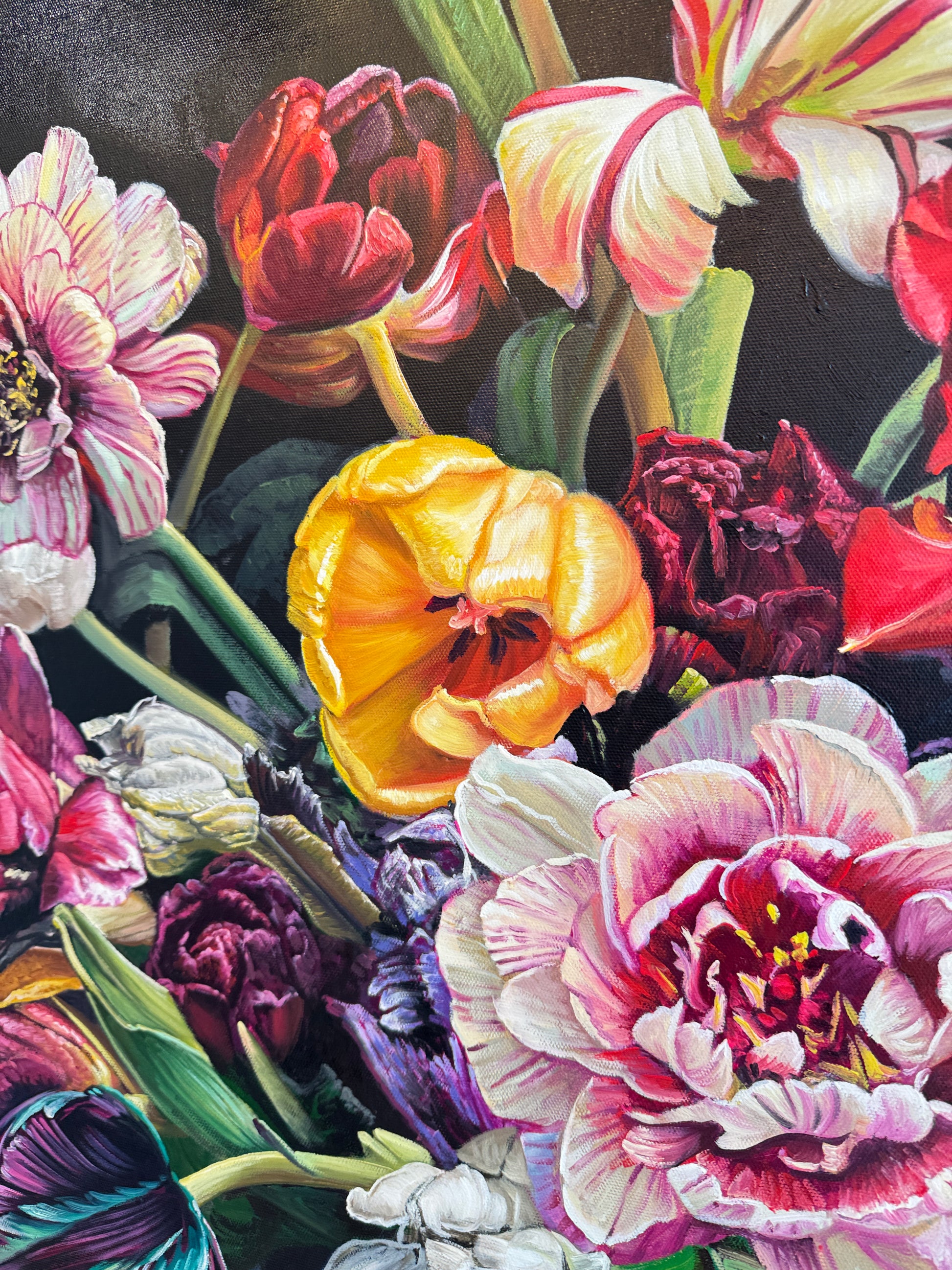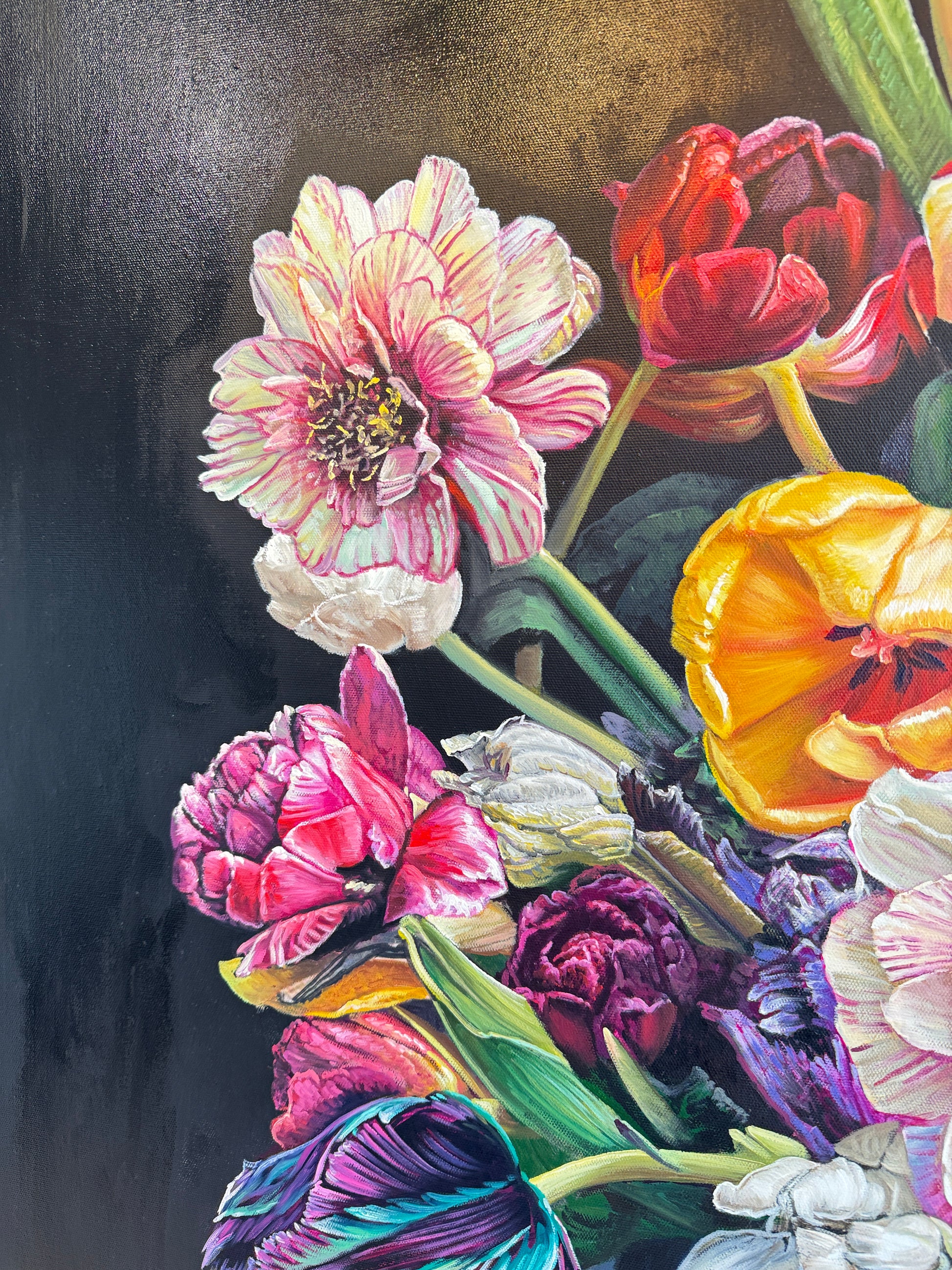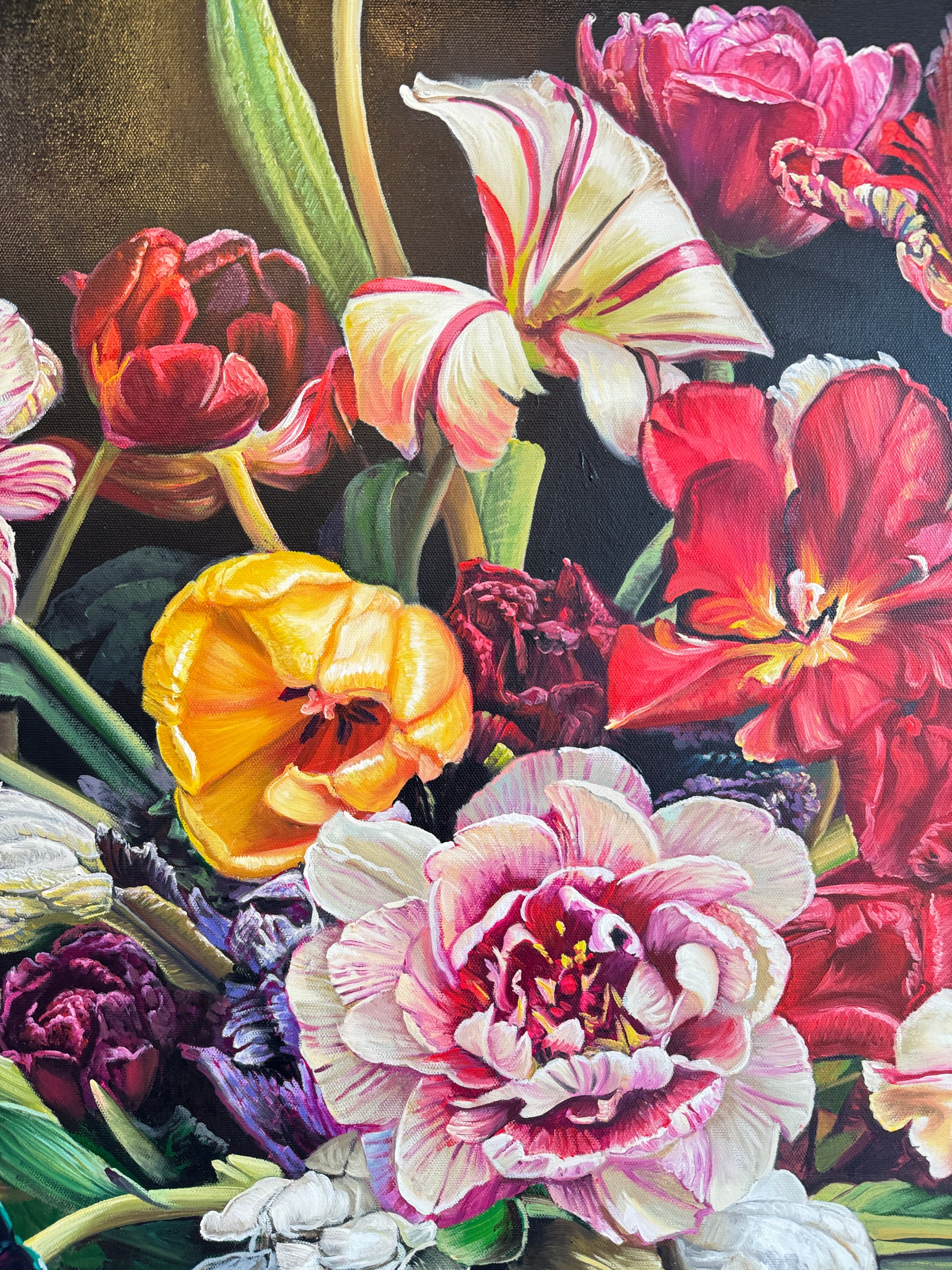 This is a beautiful oil painting of an array of flowers in a vase. Contemporary painting full of details and colors, vibrant roses , tulips, peonies and an arrangement of other flowers. Reminding us of old master paintings, this is a brand new painting full elegance and timeless elegance.