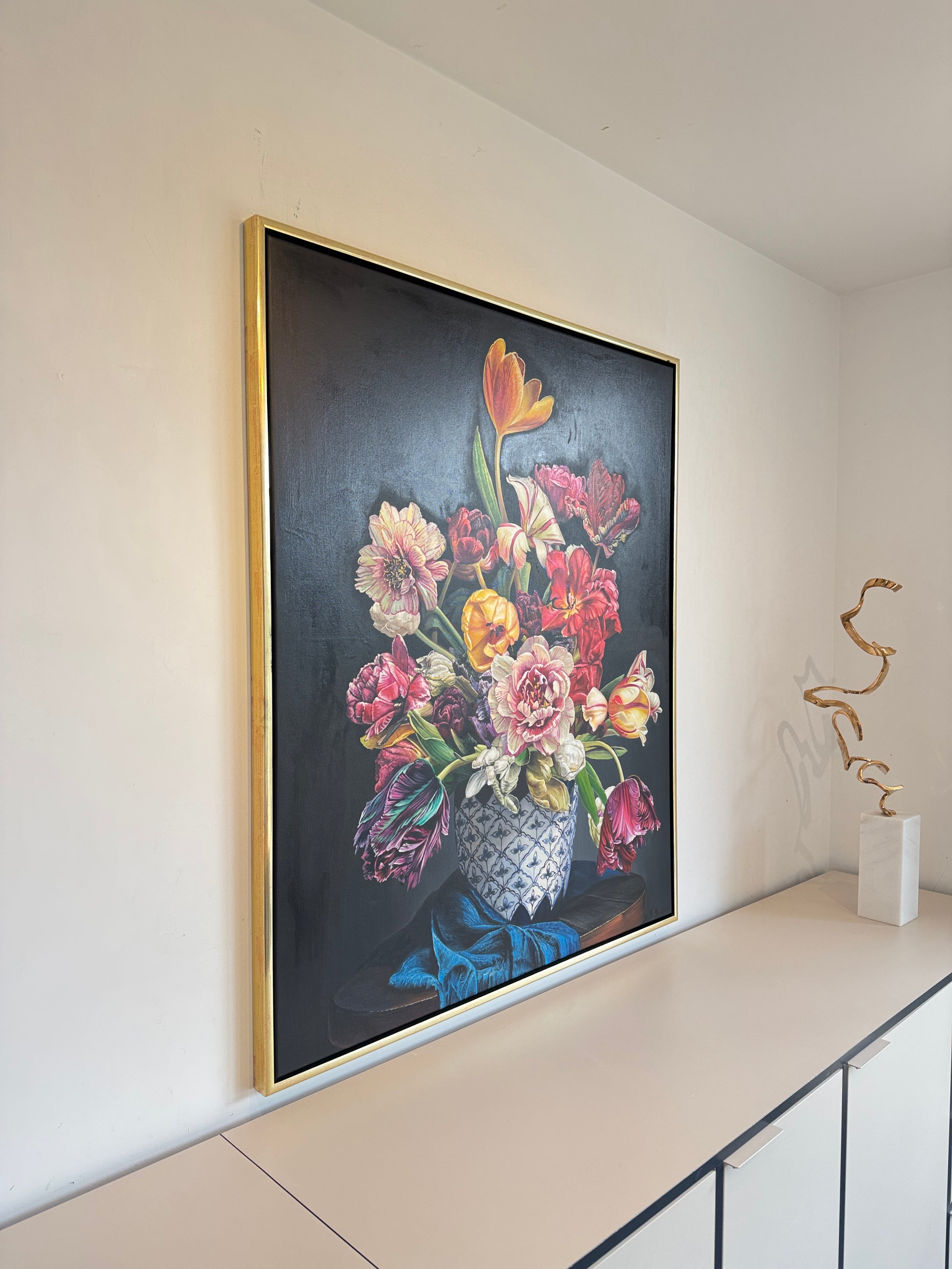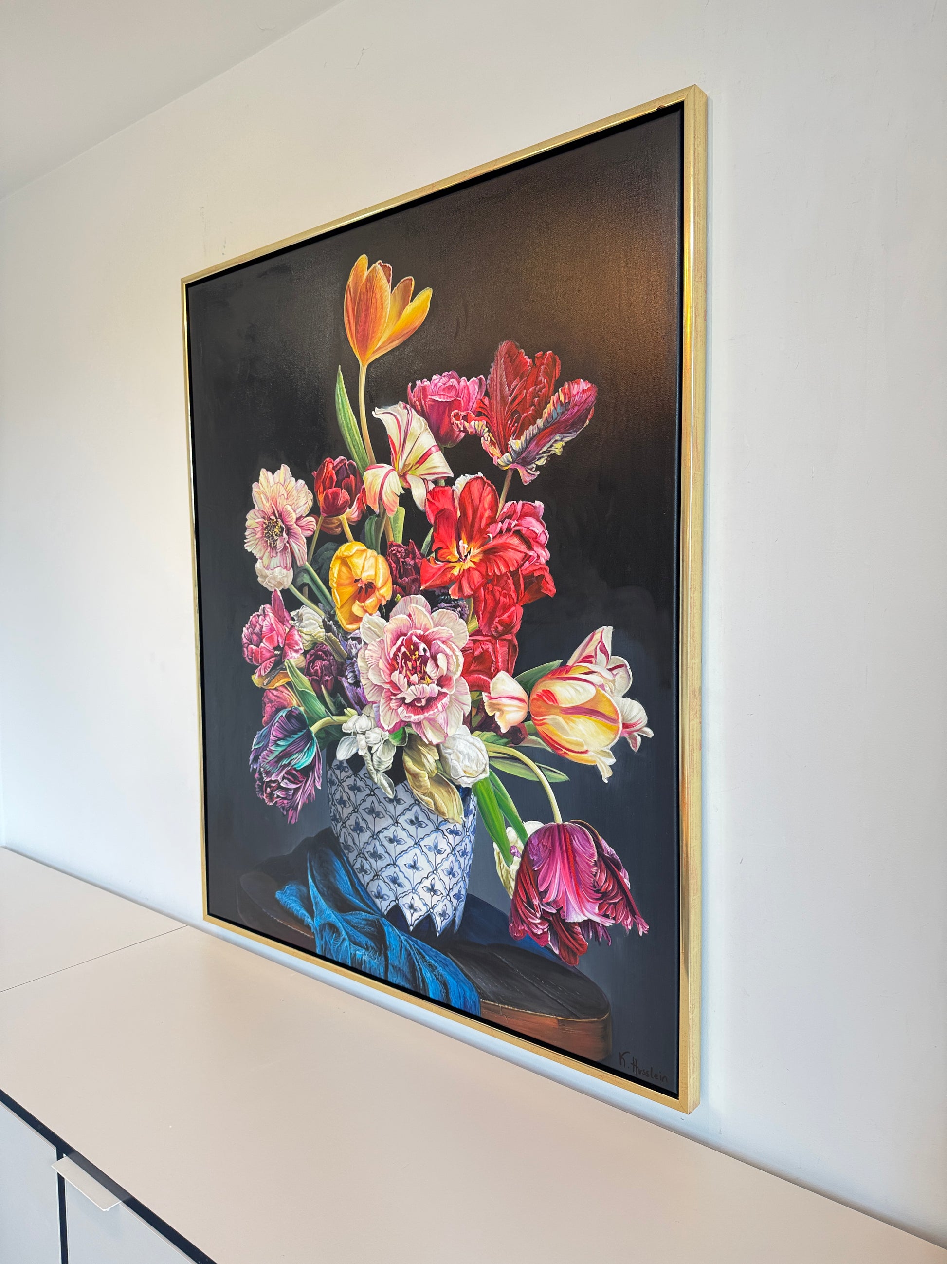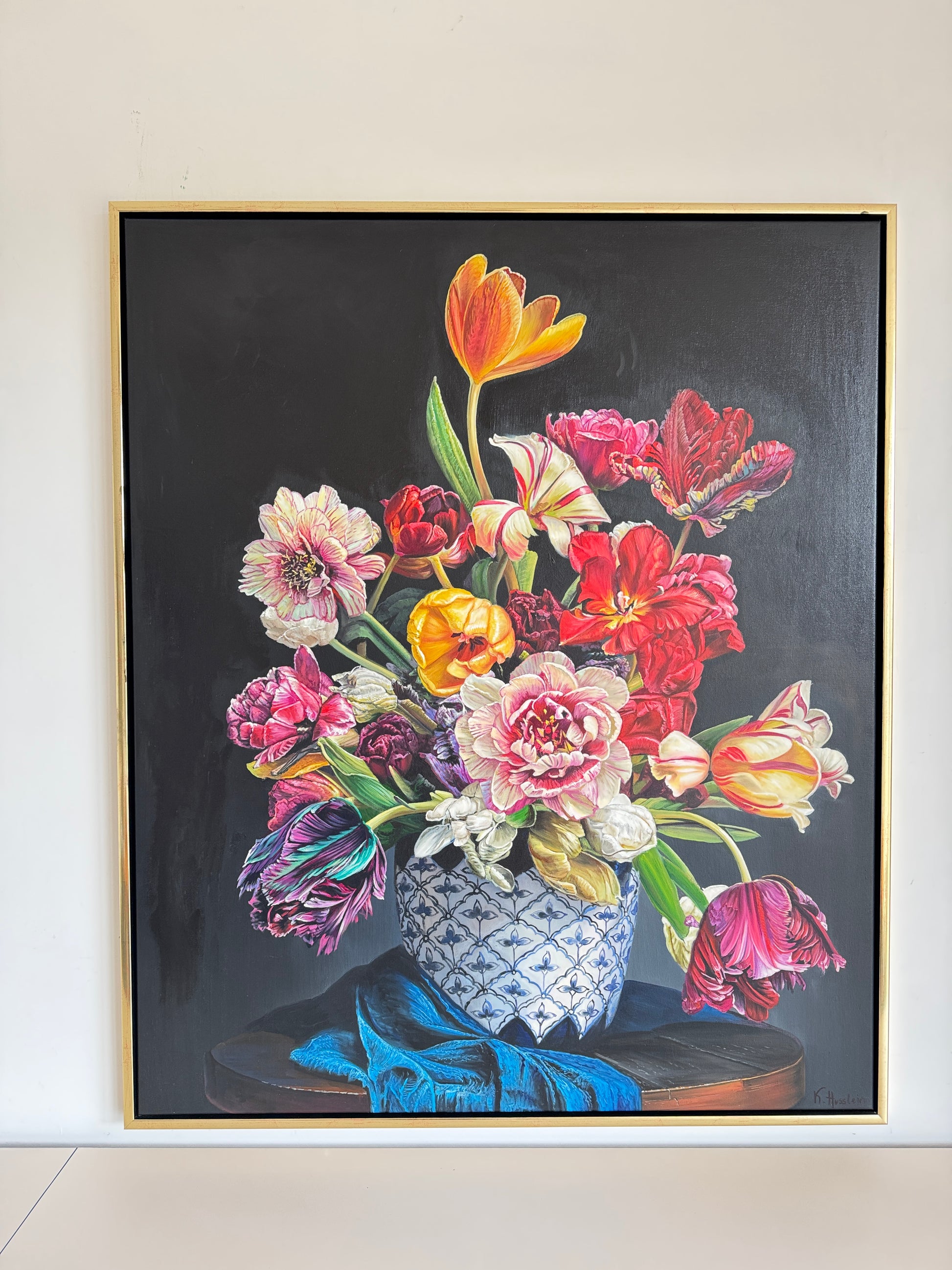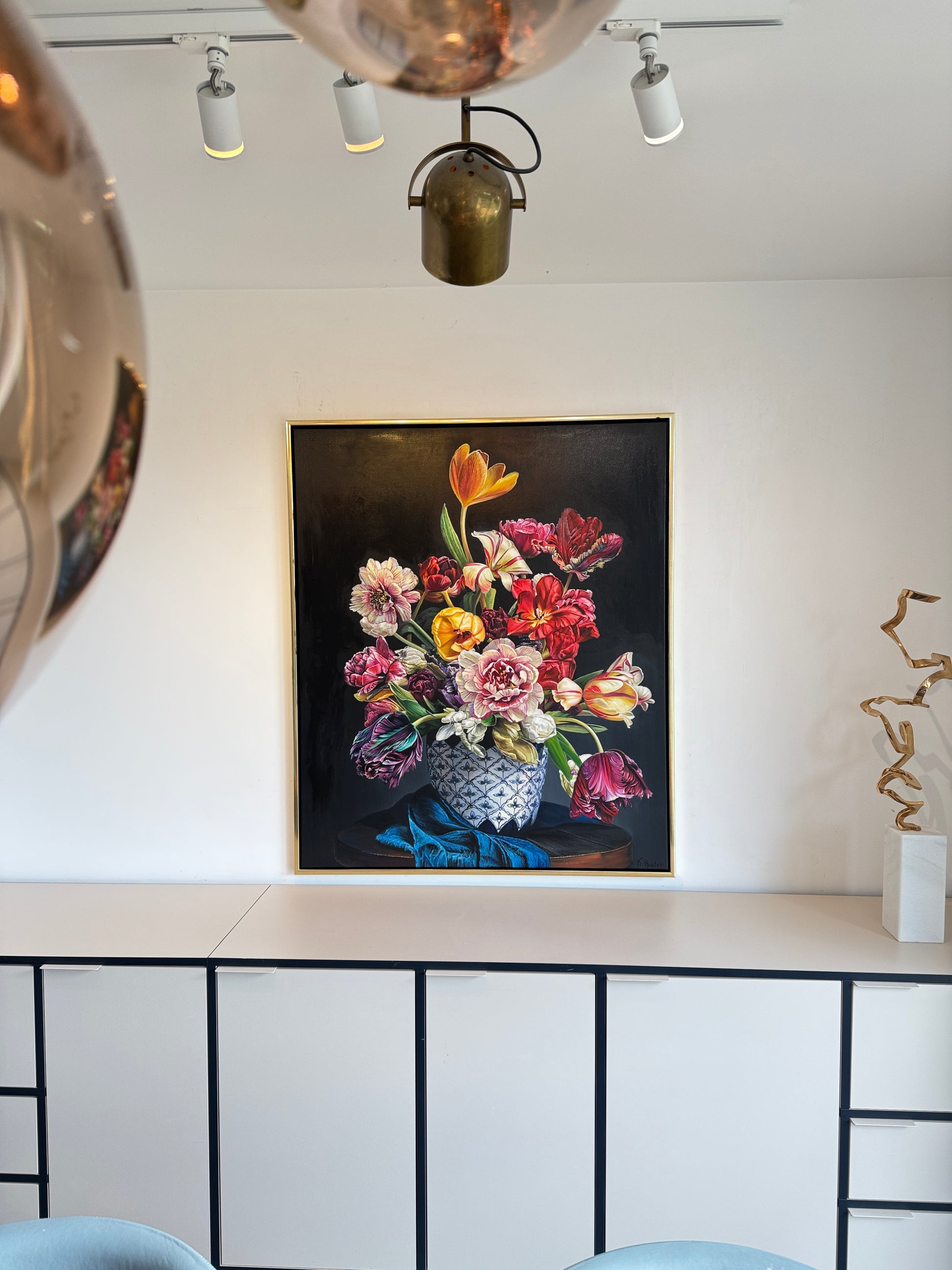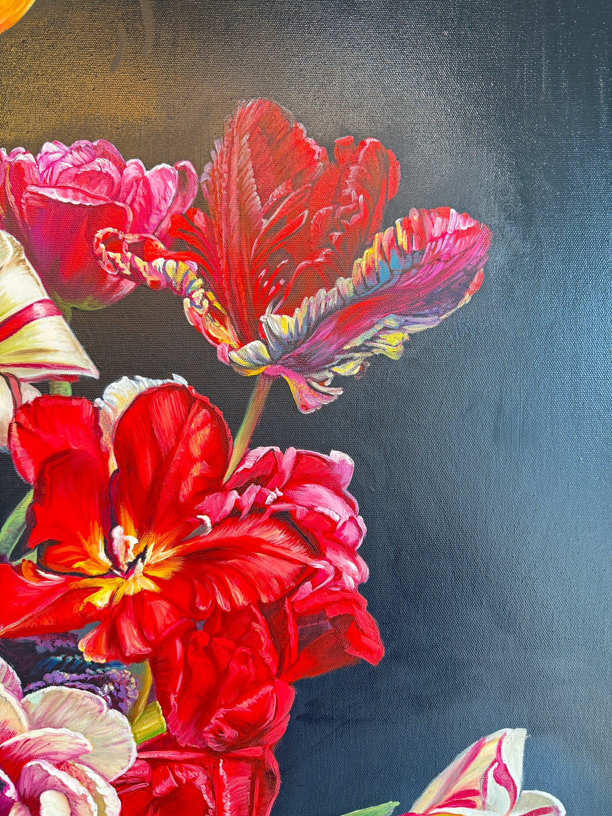 This is a beautiful oil painting of an array of flowers in a vase. Contemporary painting full of details and colors, vibrant roses , tulips, peonies and an arrangement of other flowers. Reminding us of old master paintings, this is a brand new painting full elegance and timeless elegance.