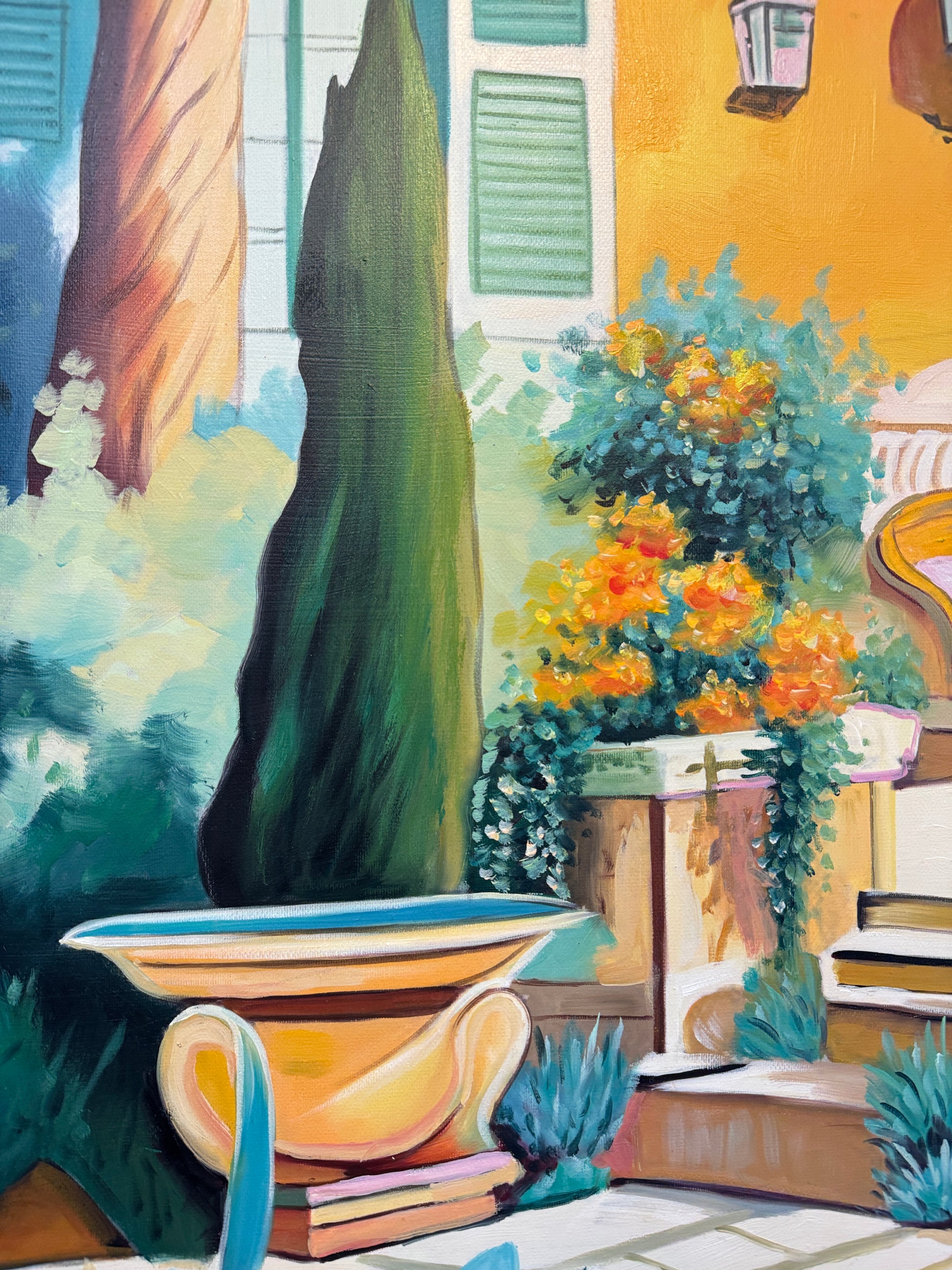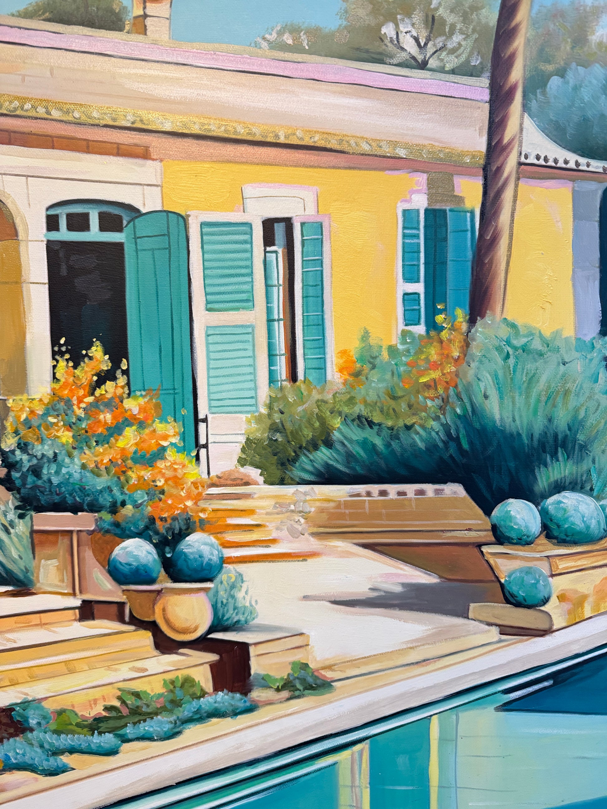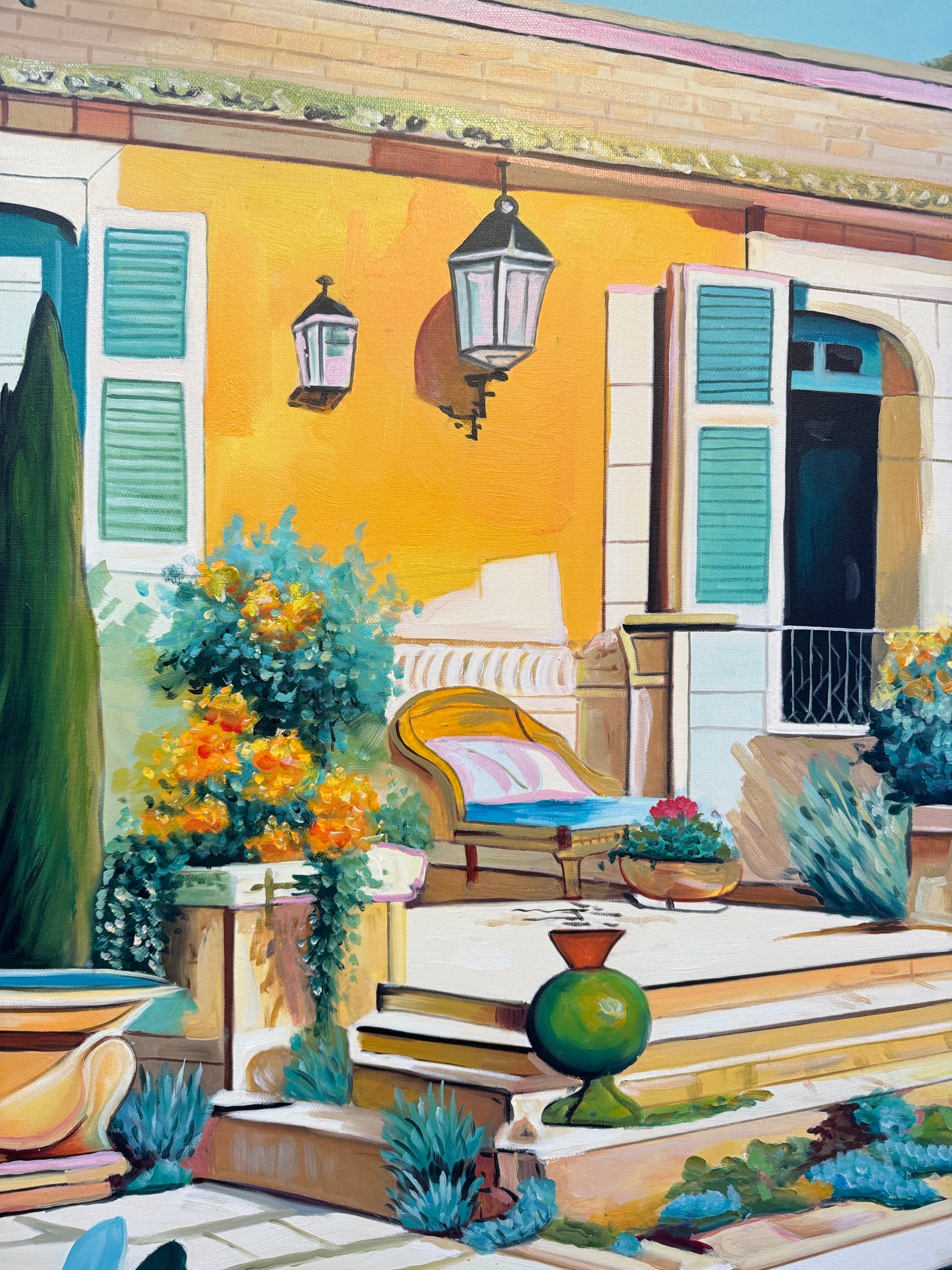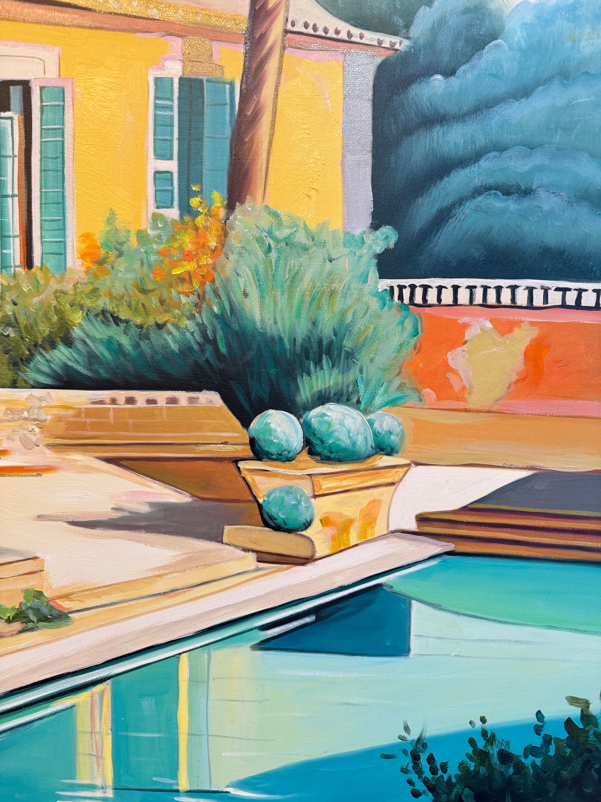 In essence, Lilly Muth's paintings beckon us to venture into a different world—one where architecture, pools, geometry, nature, and a kaleidoscope of colors converge to create a captivating dreamscape that transcends the ordinary and invites us to explore the boundless realms of artistic fantasy.