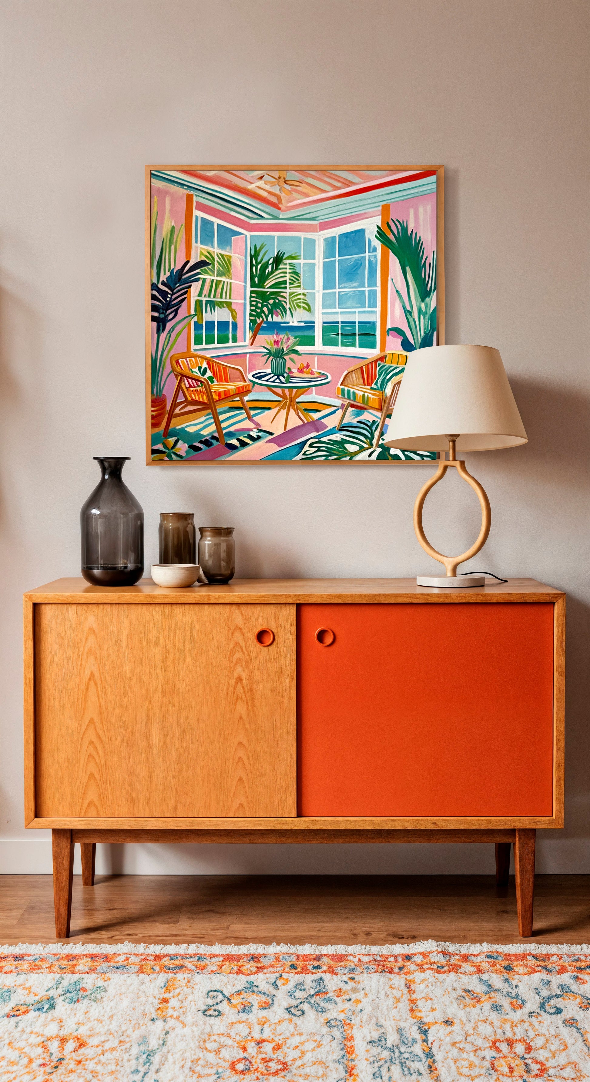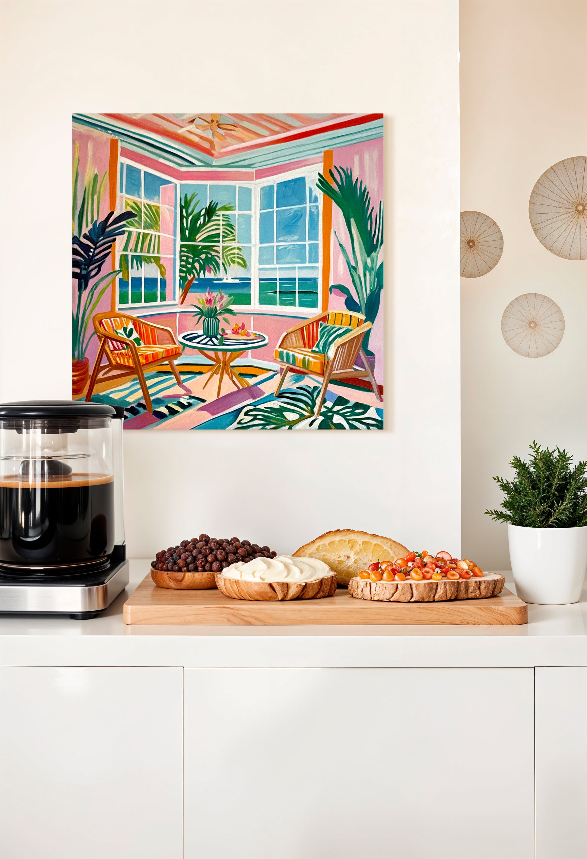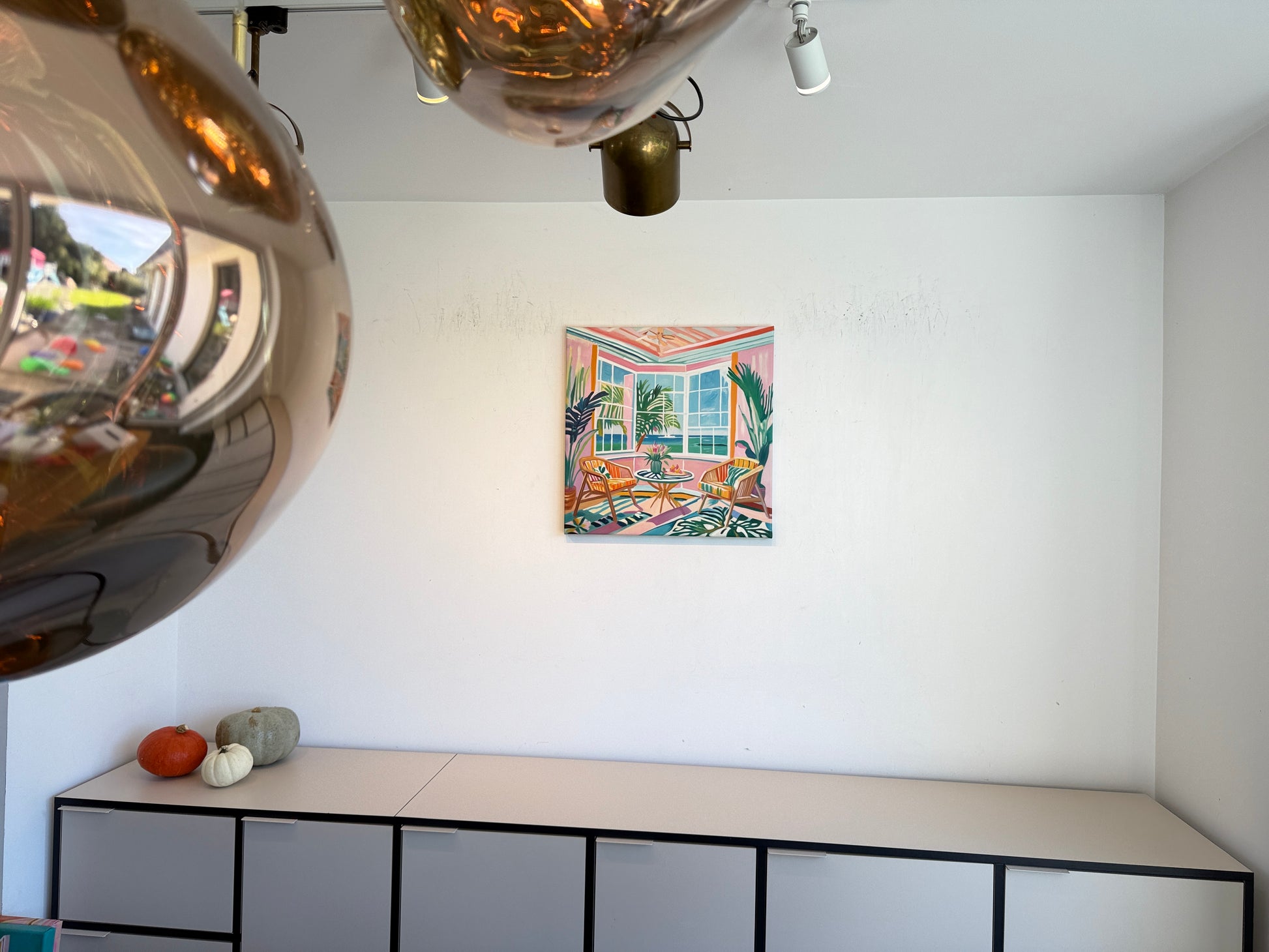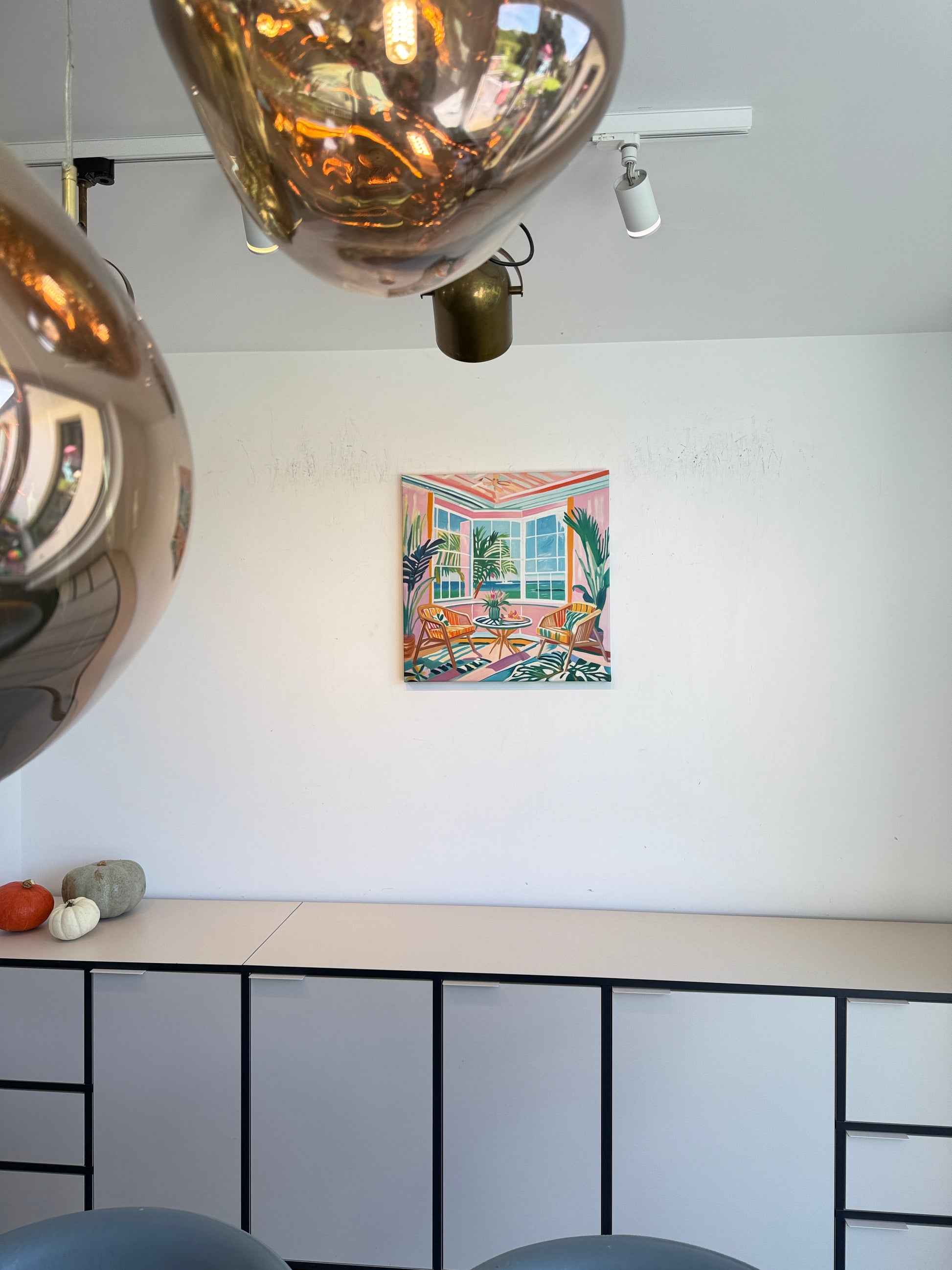 With bold colours, soft light, and breezy compositions, the paintings capture the laid-back rhythm of holiday life. Added thread details, carefully stitched into the canvas, highlight small elements and bring a subtle, tactile layer to the work — adding intimacy and depth without overpowering the calm, open feel of each piece.