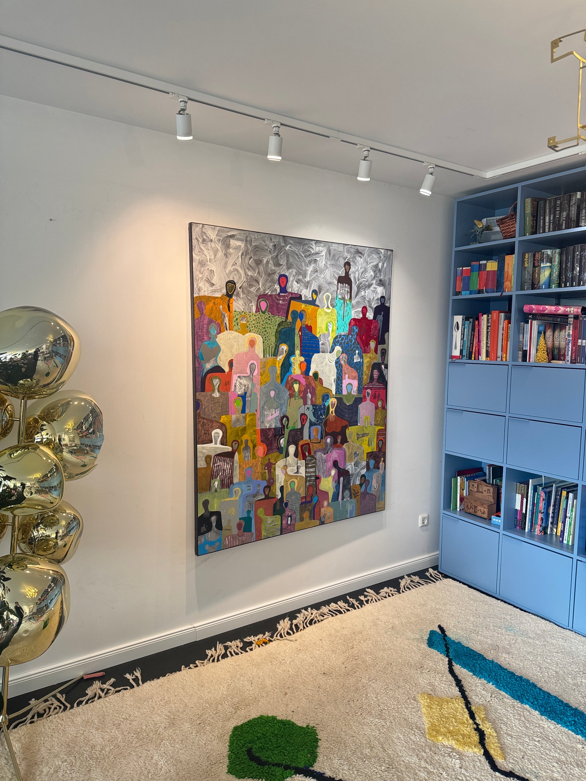 His 'crowd' paintings also showcase that we are stronger together in love and friendship and a common way of life, in the fight agains racism and terrorism. But also in the every day- by working together hand in hand, we are more successful in business as well as within our families if we can stick together and happier for it. This contemporary figurative painting shows lots of details and movement. Beautiful statement piece for any art collection.