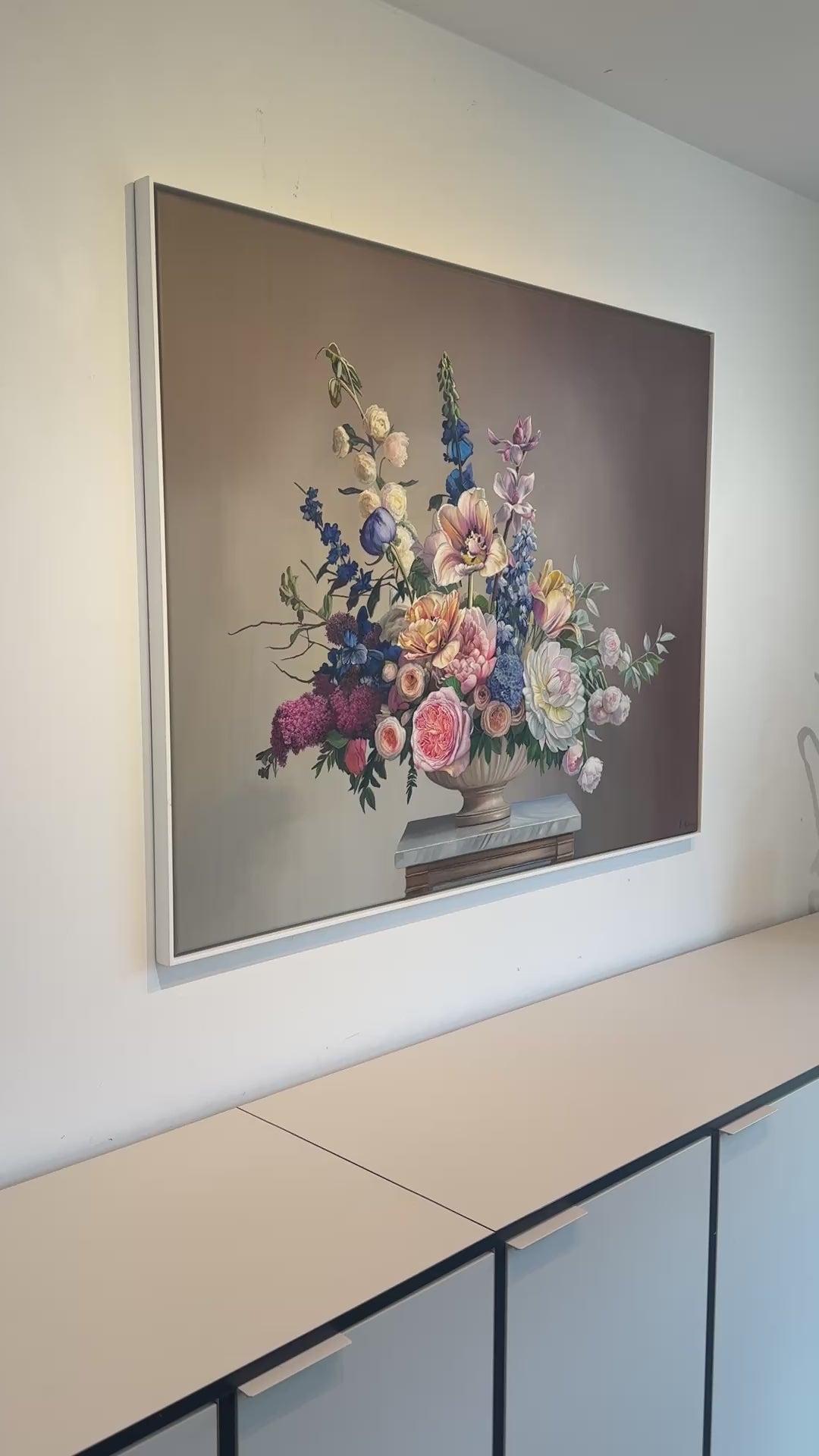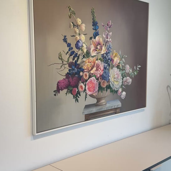 This is a beautiful oil painting of an array of flowers in a vase. Contemporary painting full of details and colors, vibrant roses , tulips, peonies and an arrangement of other flowers. Reminding us of old master paintings, this is a brand new painting full elegance and timeless elegance.