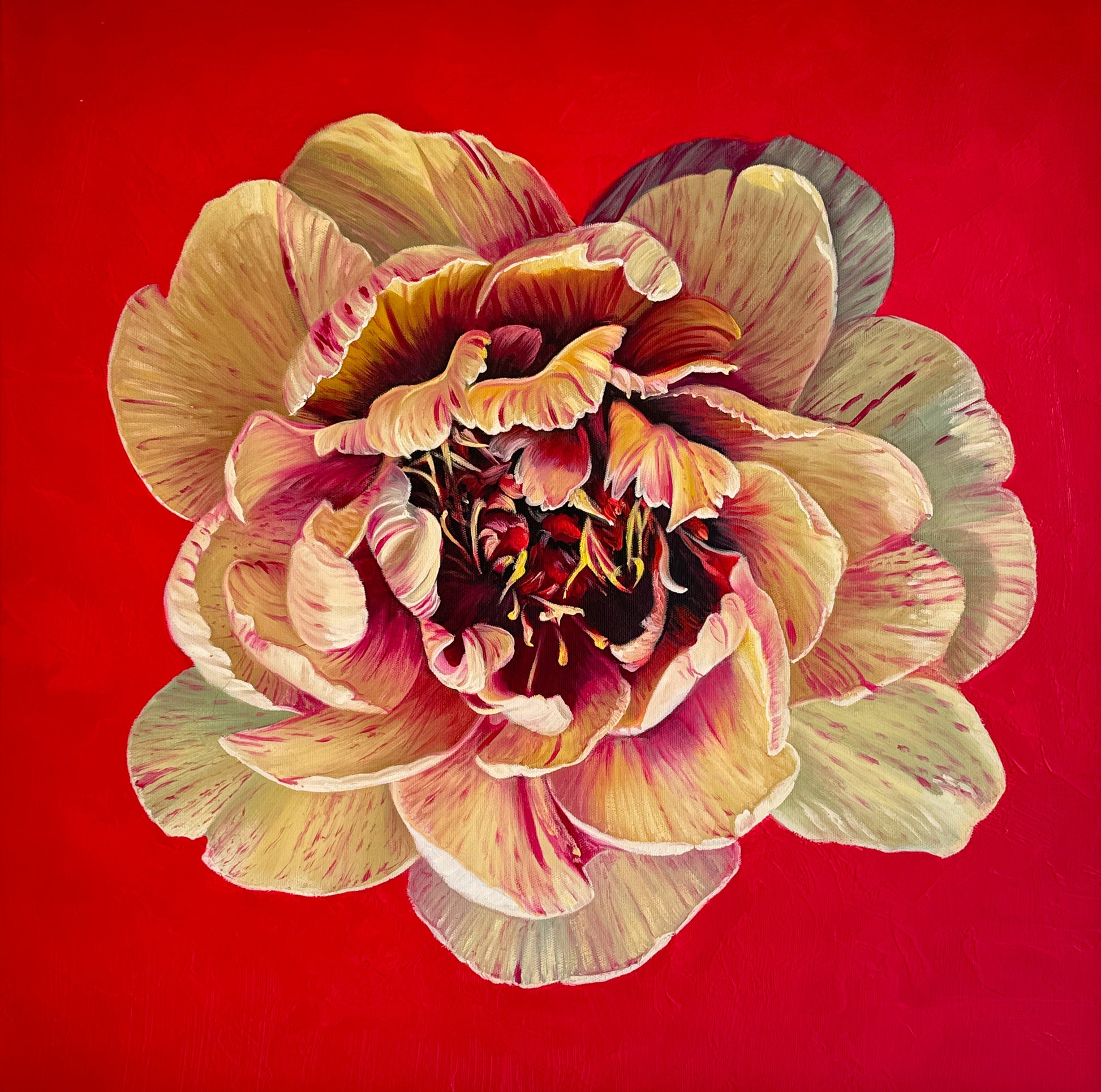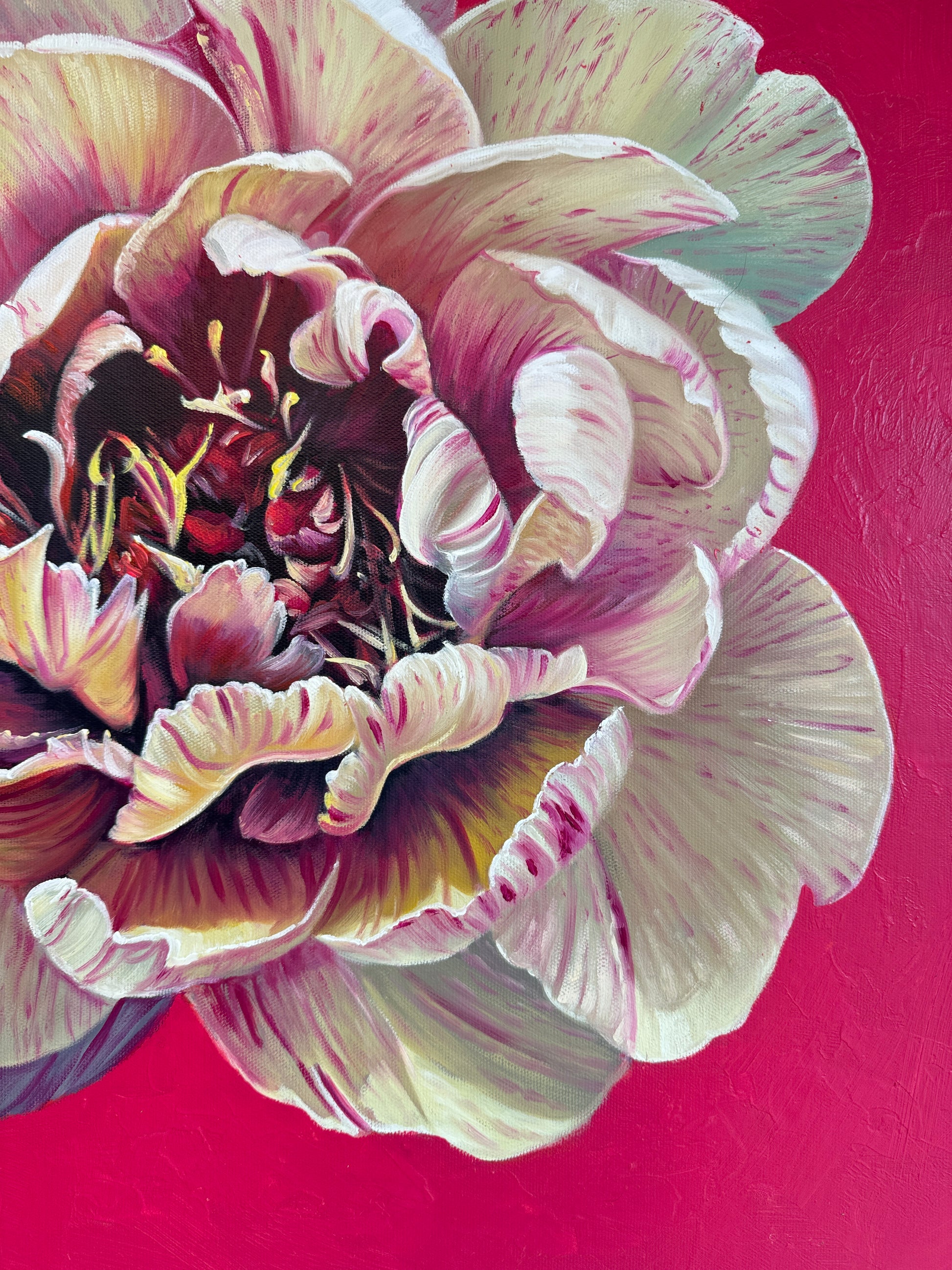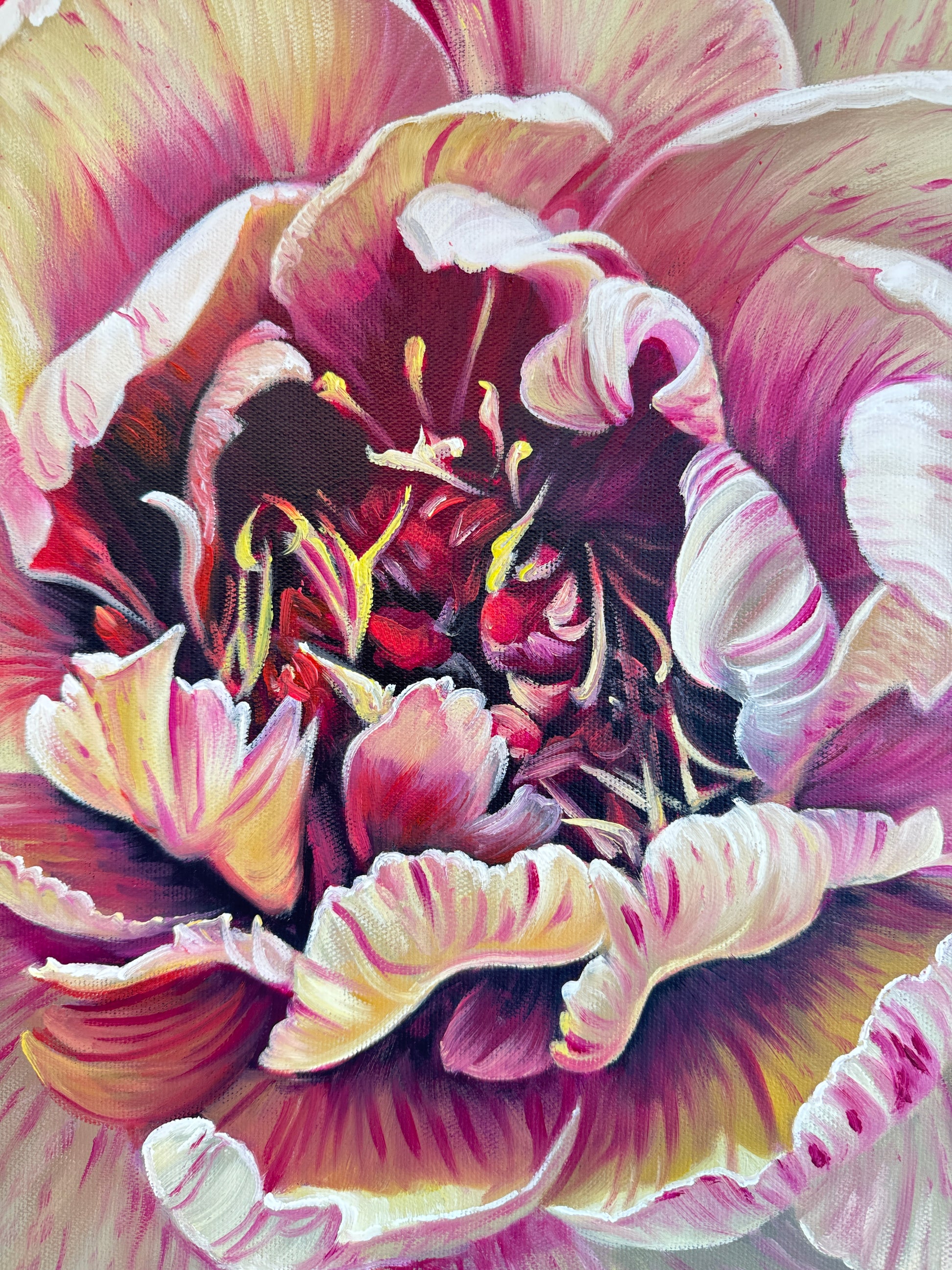 This is a beautiful oil painting of an array of flowers in a vase. Contemporary painting full of details and colors, vibrant roses , tulips, peonies and an arrangement of other flowers. Reminding us of old master paintings, this is a brand new painting full elegance and timeless elegance.
