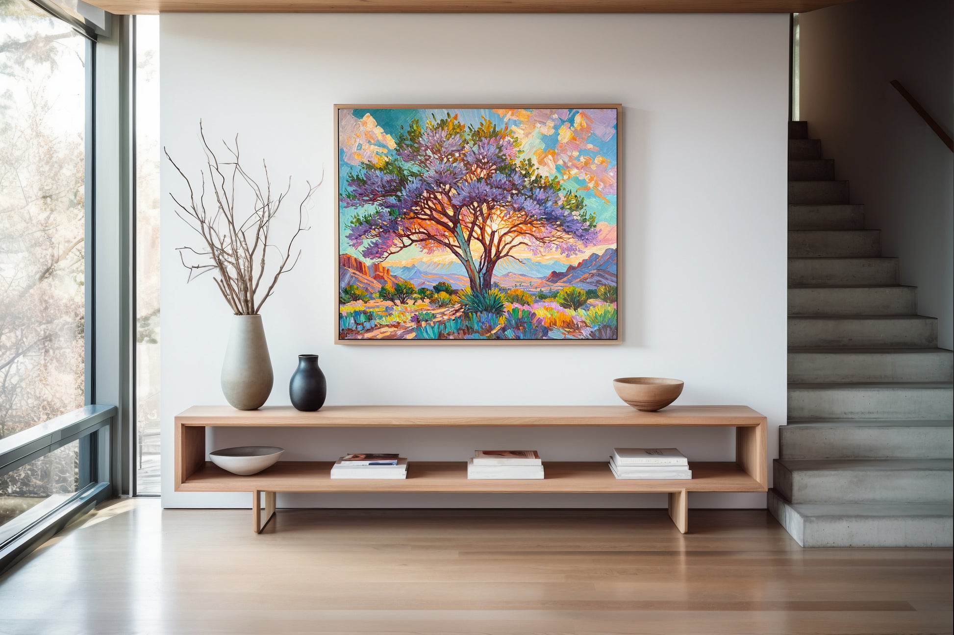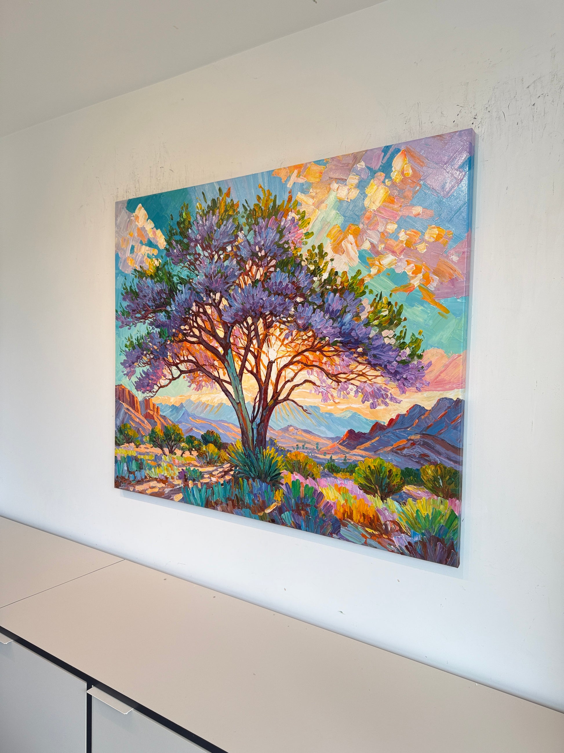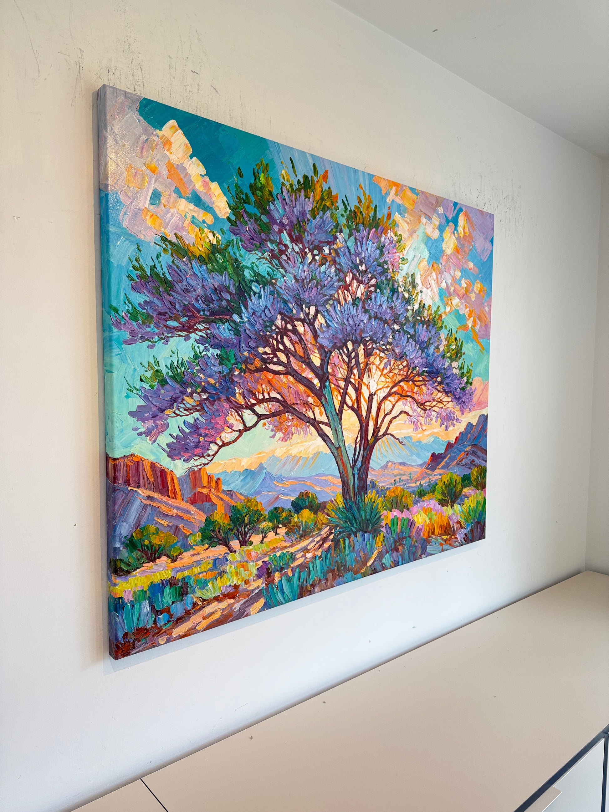 This one-of-a-kind oil painting is signed by Husslein on the back. The painting is ready to hang and includes professional wiring for easy installation. The sides are painted as a continuation of the front and it does not require framing.