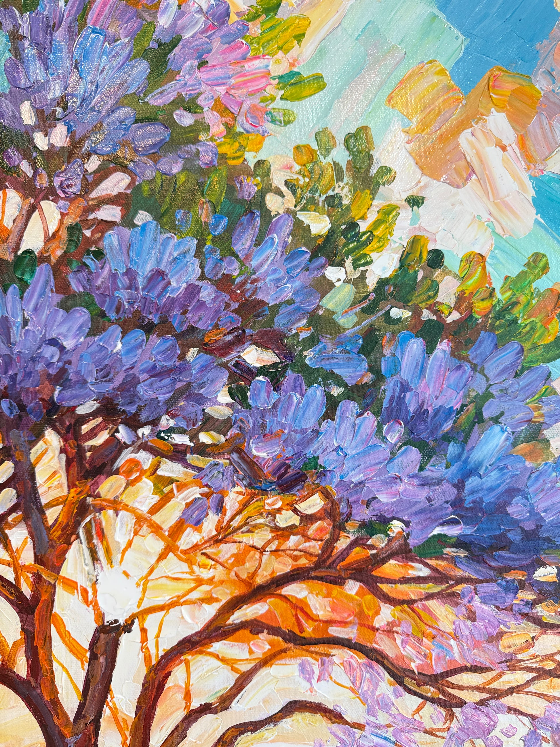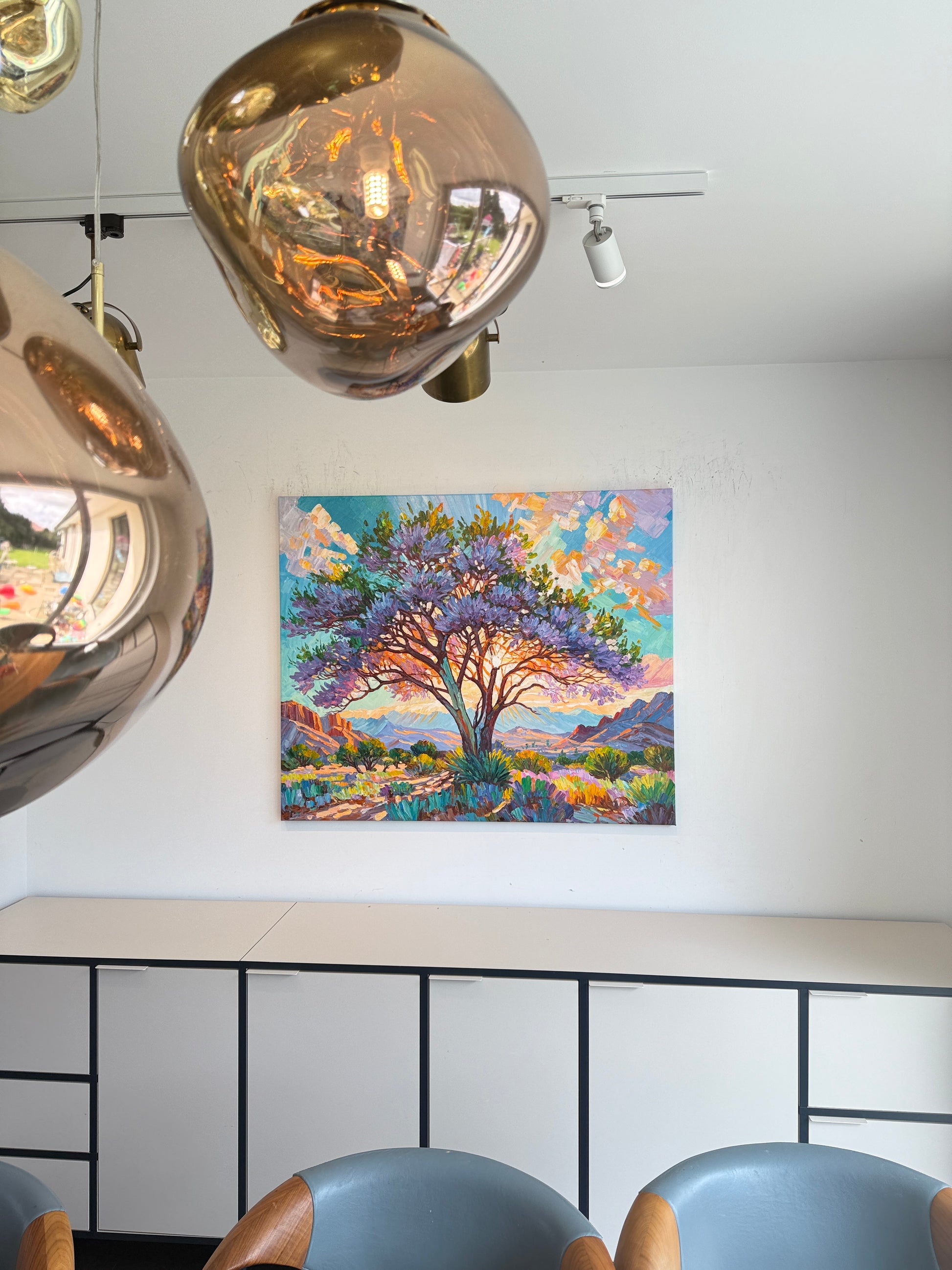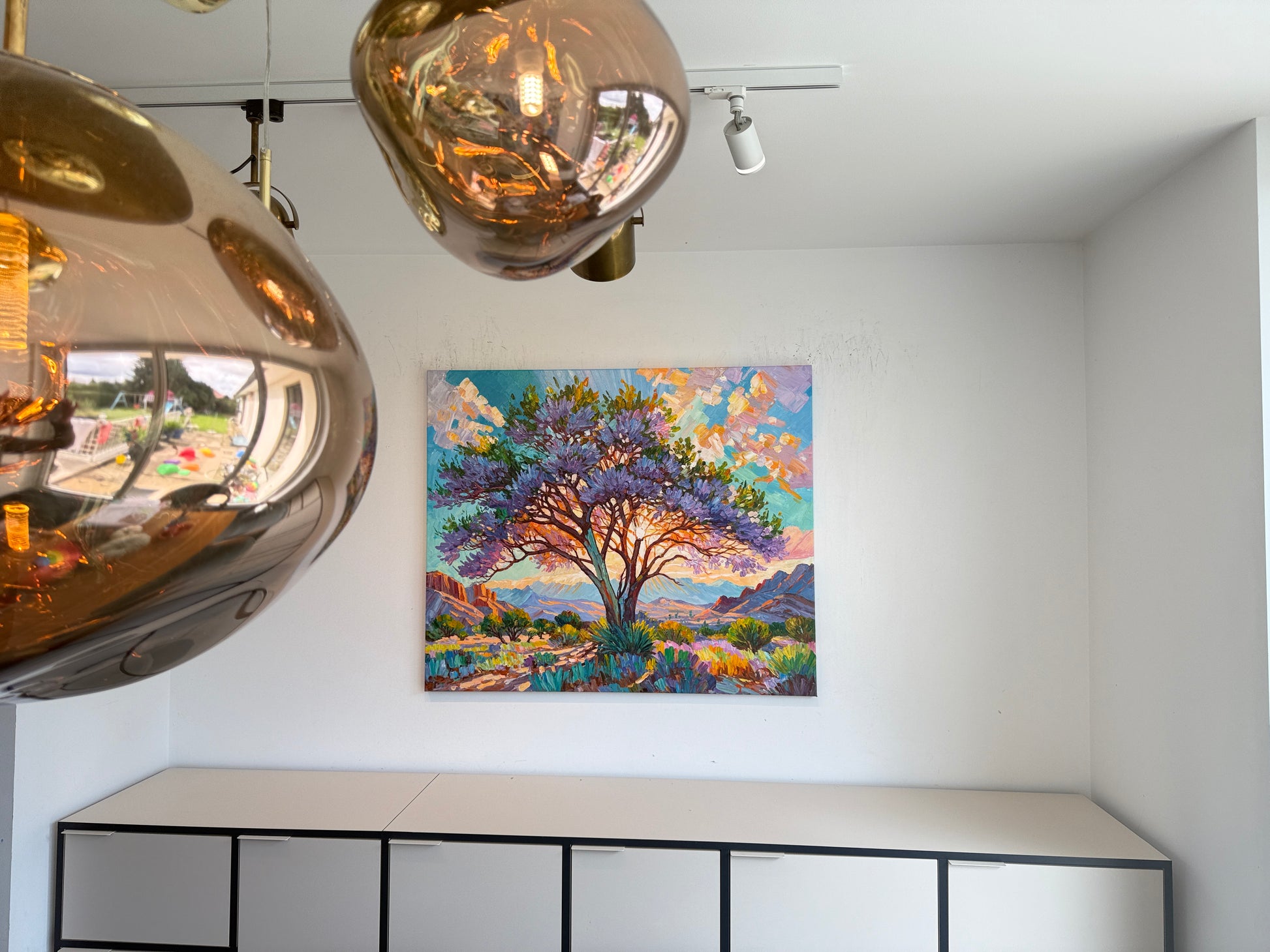 Within her impressionist landscape paintings, Katharina Husslein's experiences abroad truly come to light. These textural and abstract paintings perfectly capture the vibrancy and movement included in a coastal sunset. This series differs from Husslein’s more controlled and smoother still life floral series which derives a more direct inspiration from art history and flower photography.